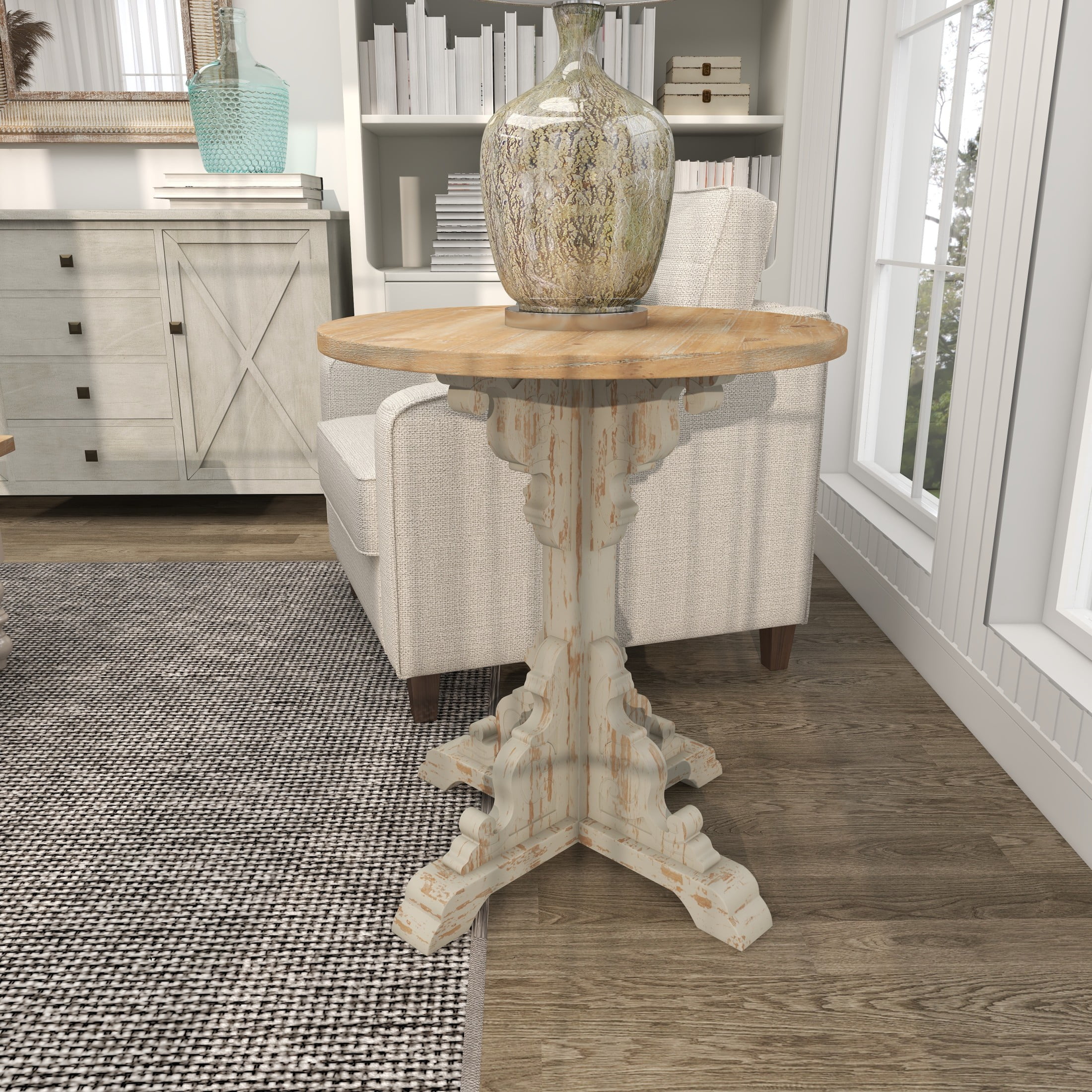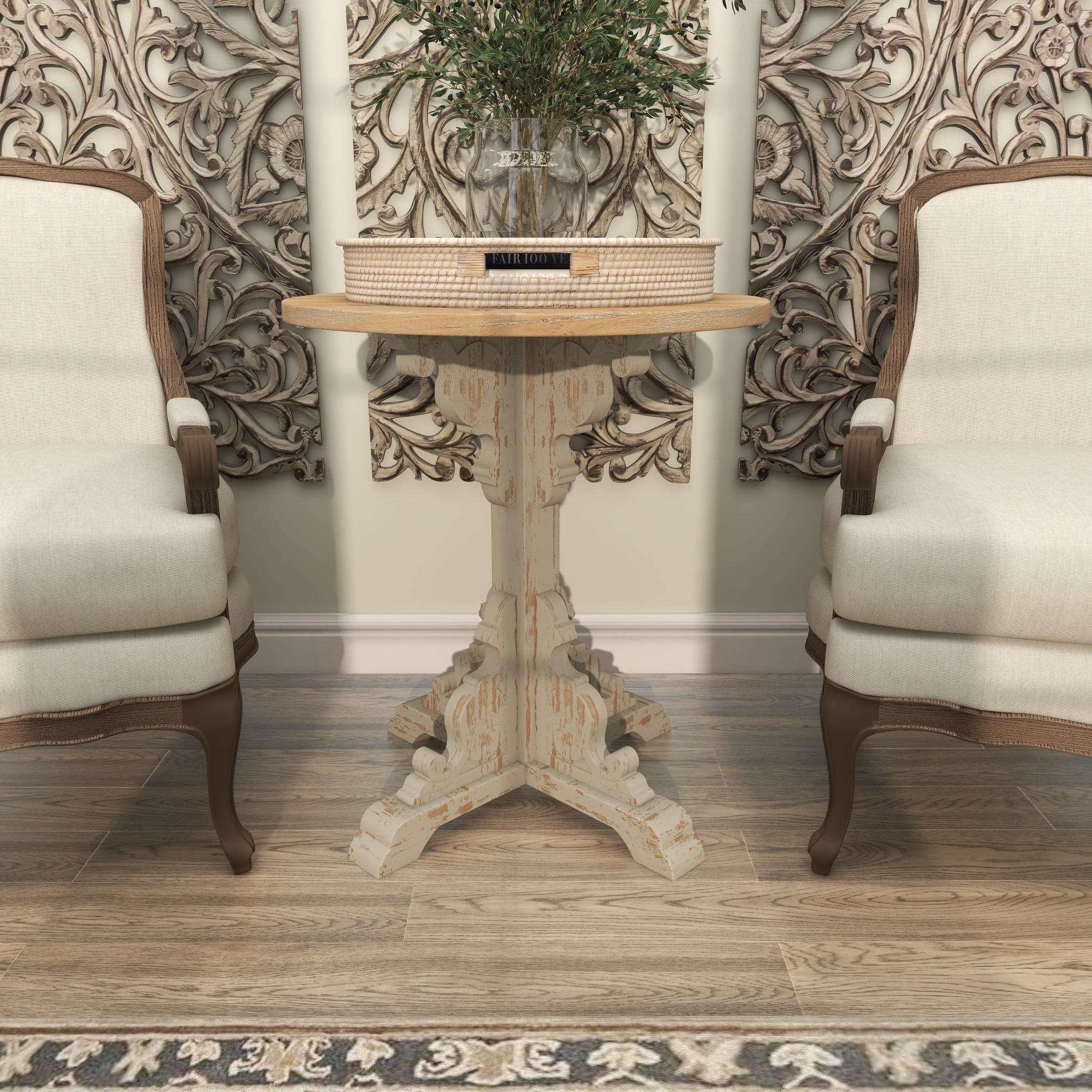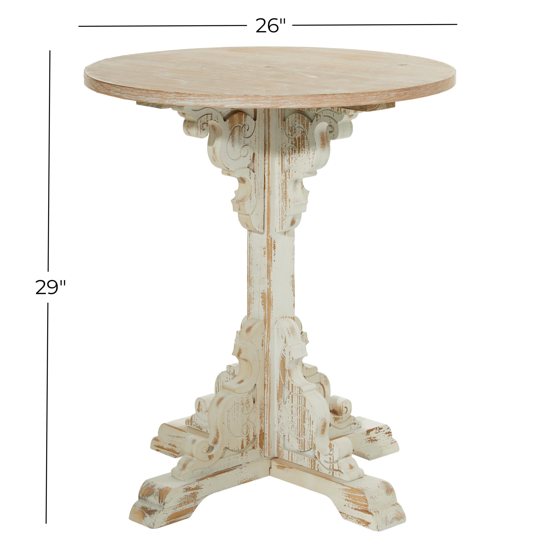 Infuse your home with cozy charm, where weathered textures, rustic finishes, and warm earthy tones create a wholesome atmosphere This cream side end accent table is made from durable wood materials, ensuring its longevity and durability, making it a worthwhile investment for any home The round table is elegantly presented in a distressed cream finish, beautifully contrasting a dark brown top and cream base, giving it a rustic yet sophisticated appeal The wood accent table boasts intricate carvings on the floral leg stand, structured in an X-shape with a slightly elevated base and a simple solid top, demonstrating attention to detail and quality The cream wood accent table measures 26L x 26W x 29H inches, and weighs 10 lbs The distressed cream living room table features a striking round wooden tabletop and pedestal base adding to its overall aesthetic appeal while maintaining its practical shape for everyday use Wipe clean with a dry cloth The farmhouse small table showcases meticulous craftsmanship with its ornate carved wooden leg stand supporting a round wood tabletop, reflecting the artisan’s skill and dedication Farmhouse style DecMode 26″ x 29″ Cream Wood Distressed Carved Scroll Accent Table with Brown Wood Top, 1-Piece makes a perfect addition to any home