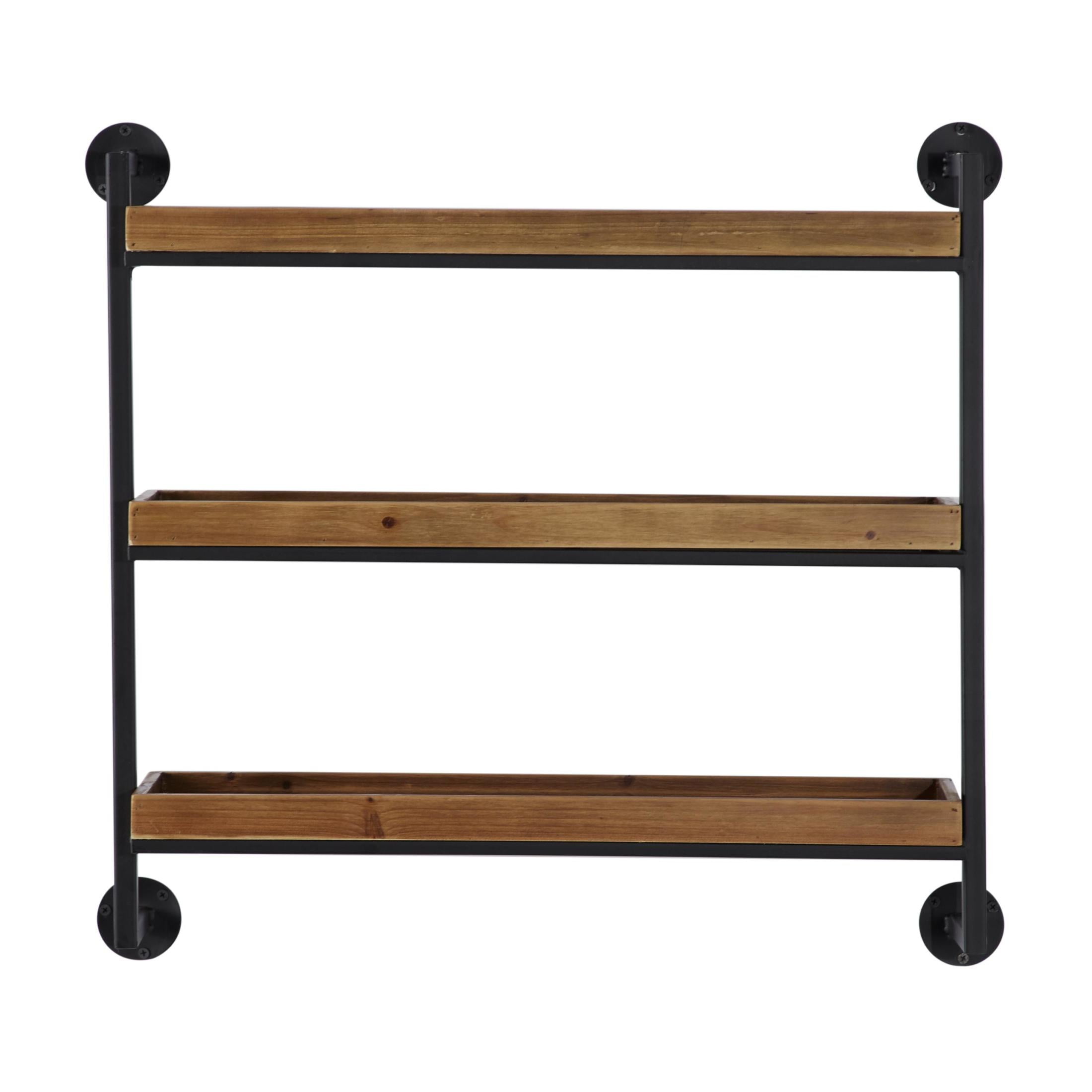 Designed with rugged charm and edgy allure, where metal finishes and raw materials unite to create an urban aesthetic that showcases your artistic expression The brown room wall shelf is crafted from fir wood, MDF, and iron, providing a blend of rustic charm and industrial durability Rectangular shelf for wall boasts an oiled brown wood finish and sleek black metal frame, offering a stylish and modern look Three industrial black metal brackets with rectangular cutouts allow the metal wall shelf to create a floating effect The brown metal wall shelf measures 25.50L x 6.65W x 23.40H inches, and weighs 8.40 lbs Oiled brown room floating shelf showcases rectangular shapes secured within a vertical metal frame with circular details that enhance its elegant design Wipe clean with a dry cloth Industrial mounted wall shelf is crafted with wooden slats that are securely fastened to bent and welded metal frames Industrial style DecMode 26″ x 7″ 3-Tier Brown Wall Shelf makes a perfect addition to any home