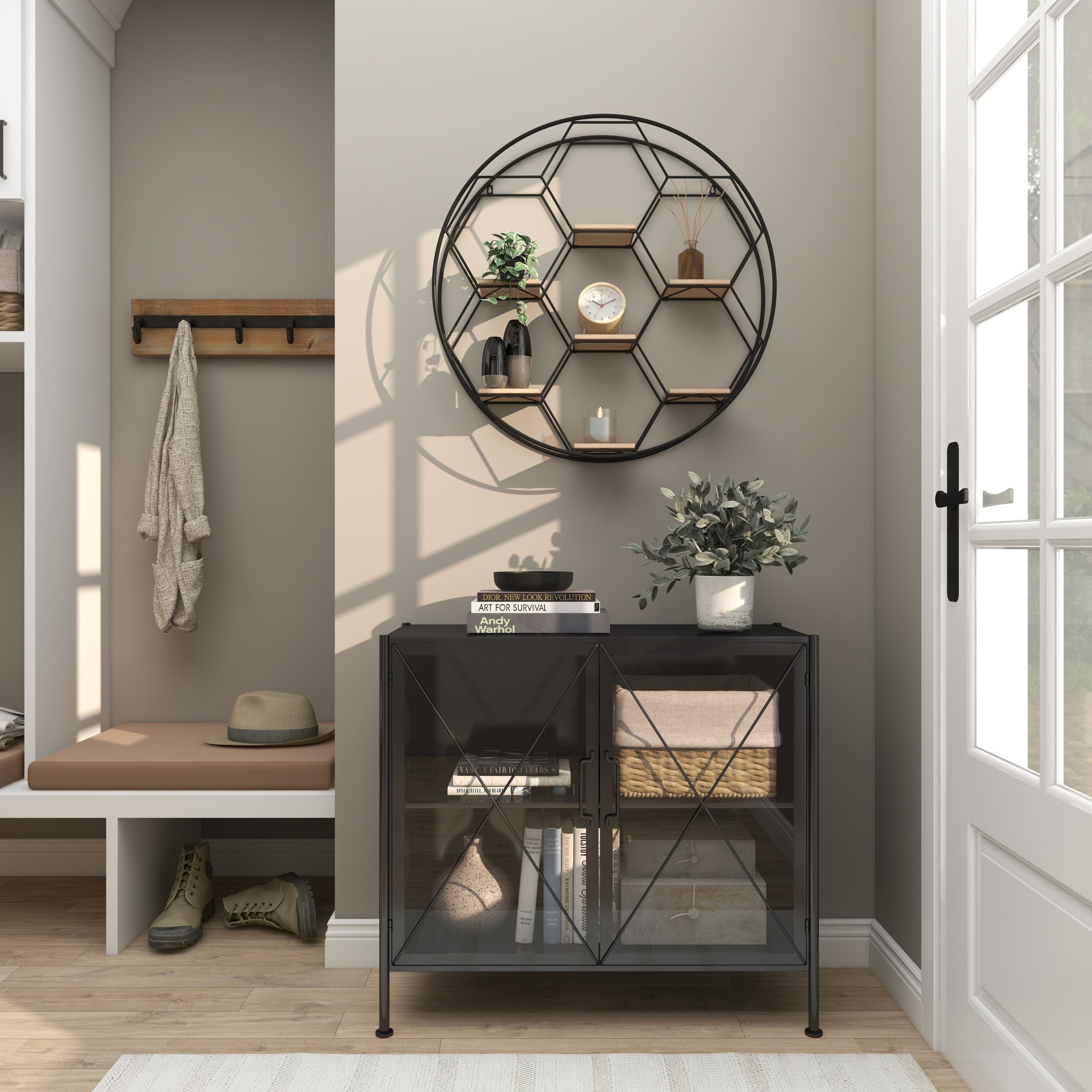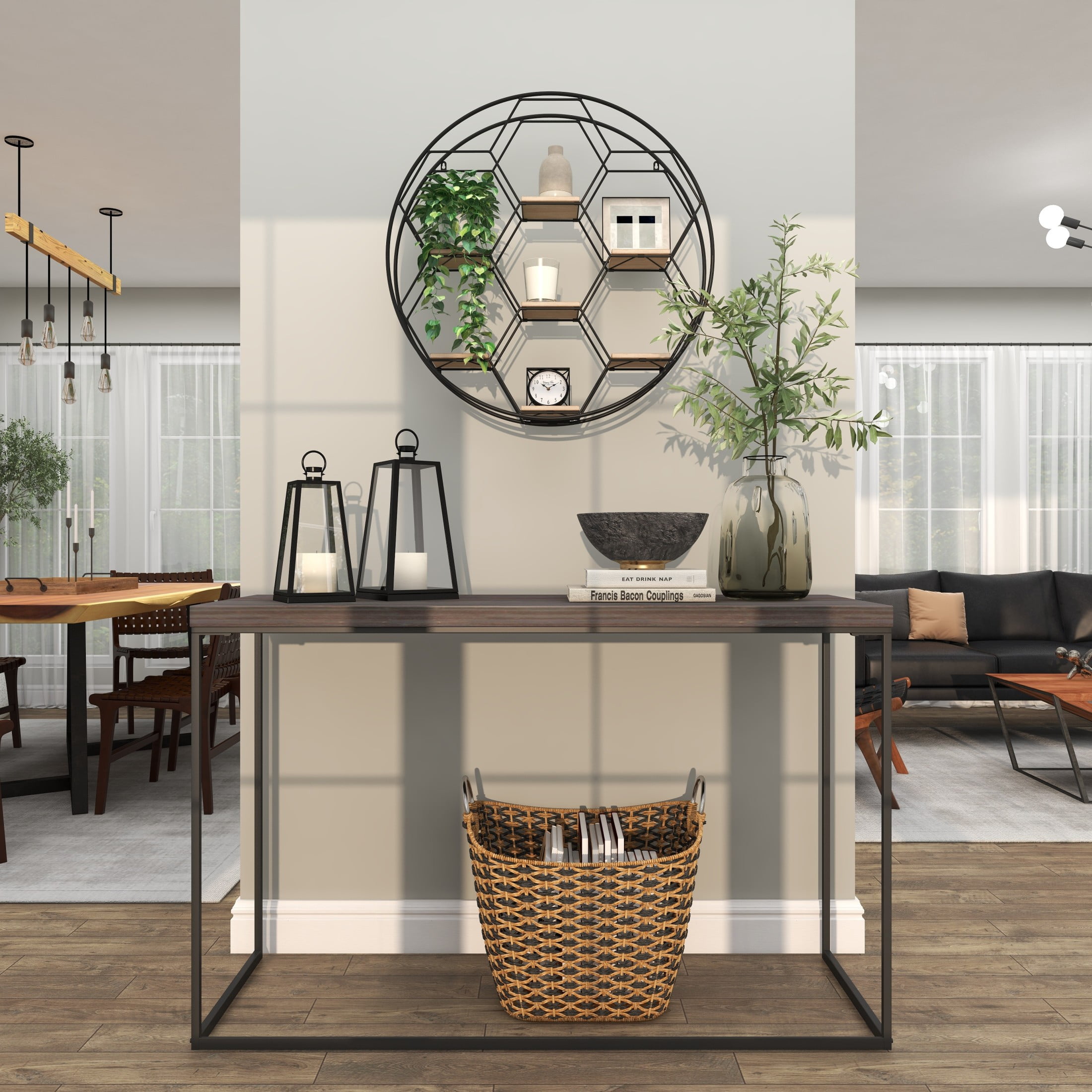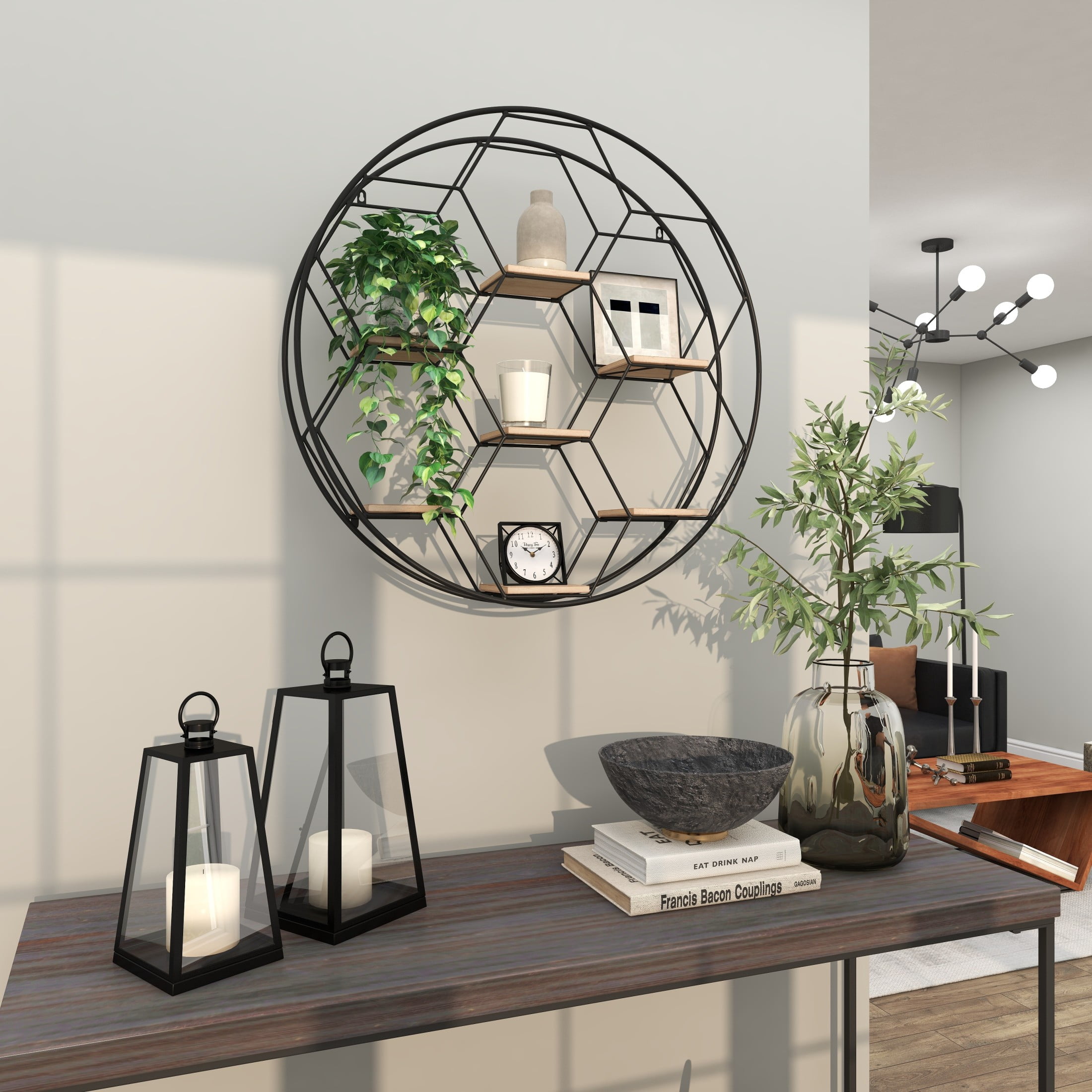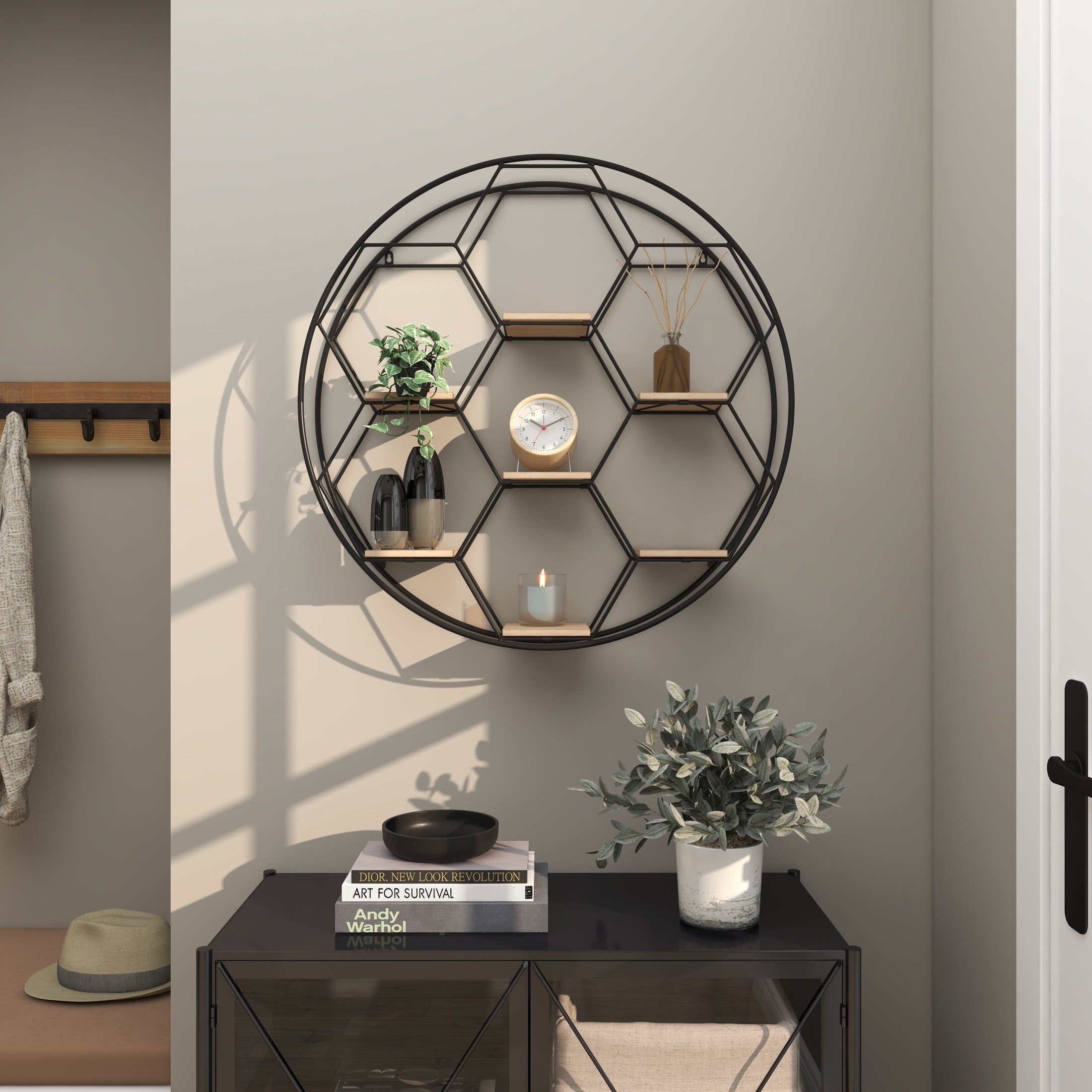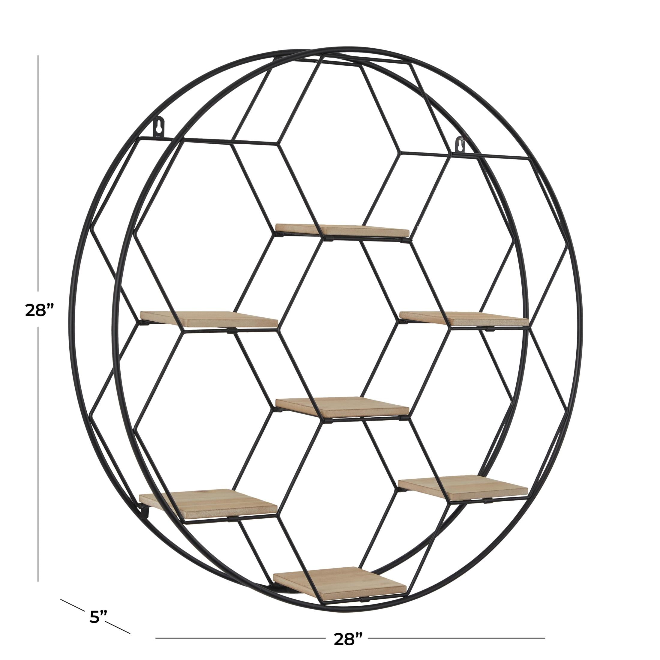 Designed with rugged charm and edgy allure, where metal finishes and raw materials unite to create an urban aesthetic that showcases your artistic expression The black room wall shelf is crafted from iron and MDF, blending durability with modern elegance Geometric shelf for wall boasts a matte black finish with brown wooden shelves, creating a striking contrast The honeycomb frame pattern offers a captivating 2D look for this metal wall shelf The black metal wall shelf measures 28L x 5W x 28H inches, and weighs 6.30 lbs Matte black room floating shelf accentuates a double hexagonal frame with square-shaped shelves, adding intricate geometric details Wipe clean with a dry cloth Industrial mounted wall shelf is crafted from welded metal and mounted wood shelves with hardware metal backing attached Industrial style DecMode 28″ x 5″ Round 7-Tier Black Geometric Wall Shelf makes a perfect addition to any home