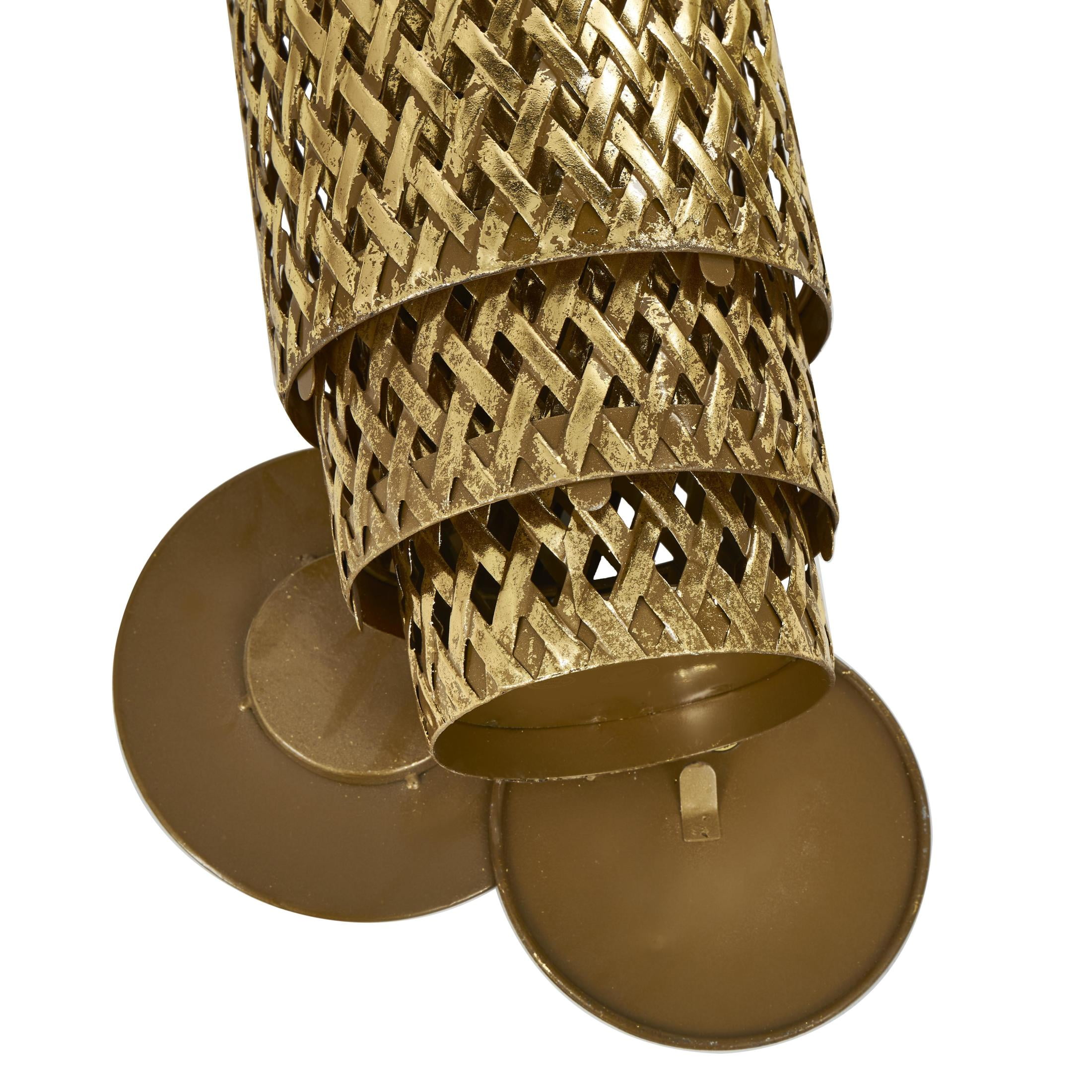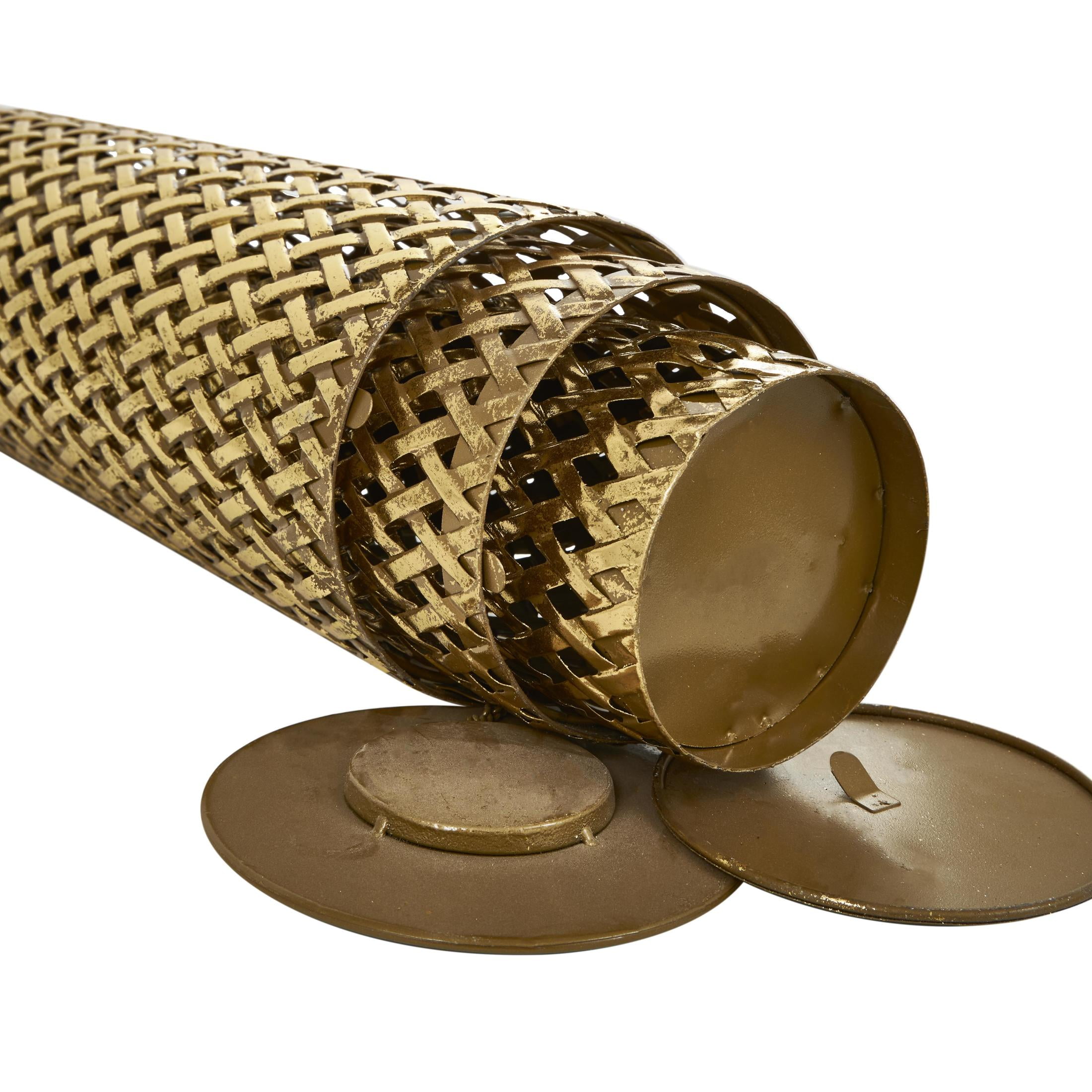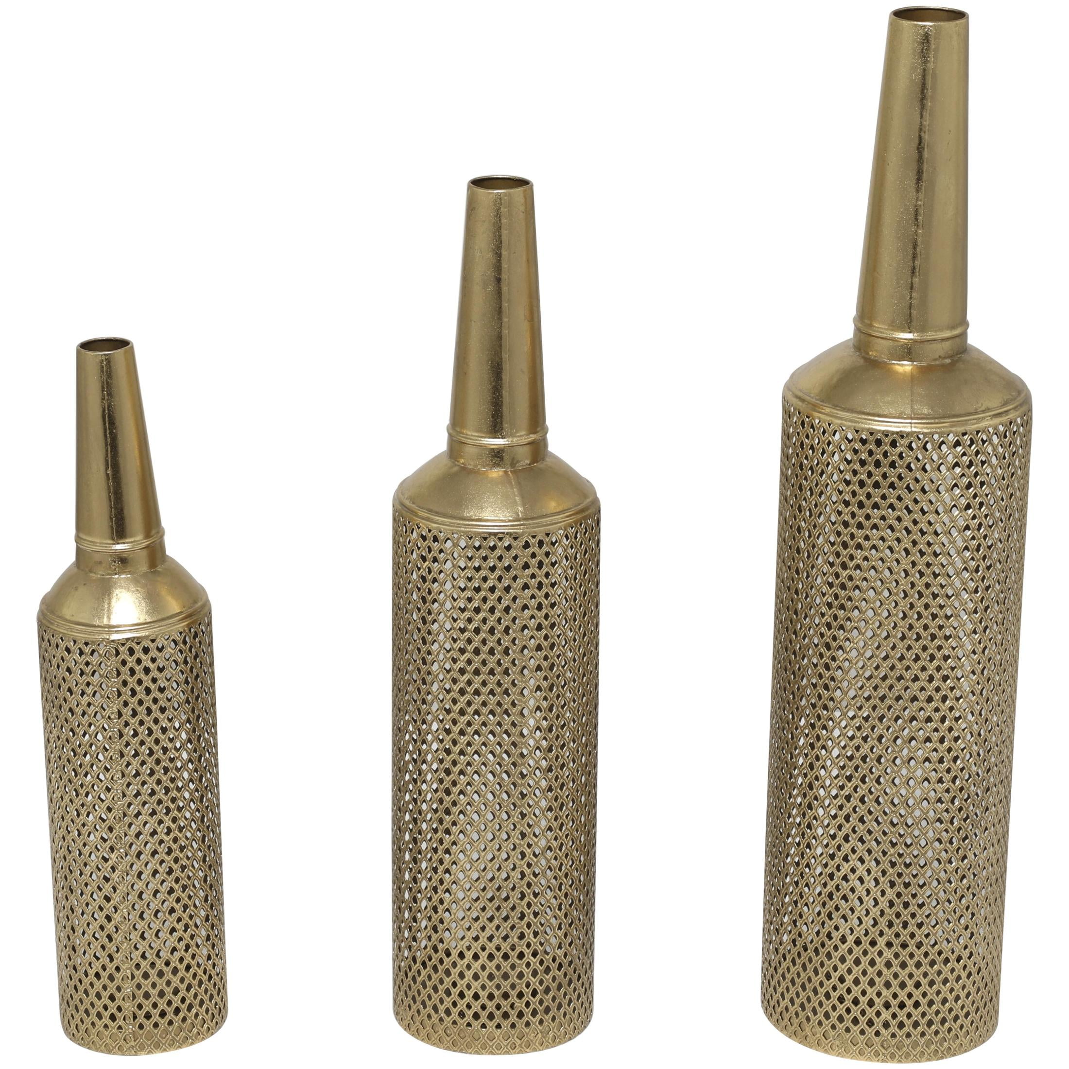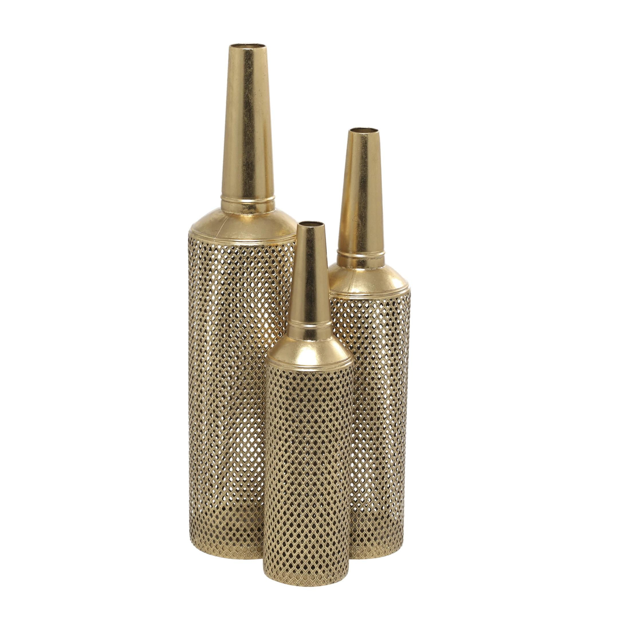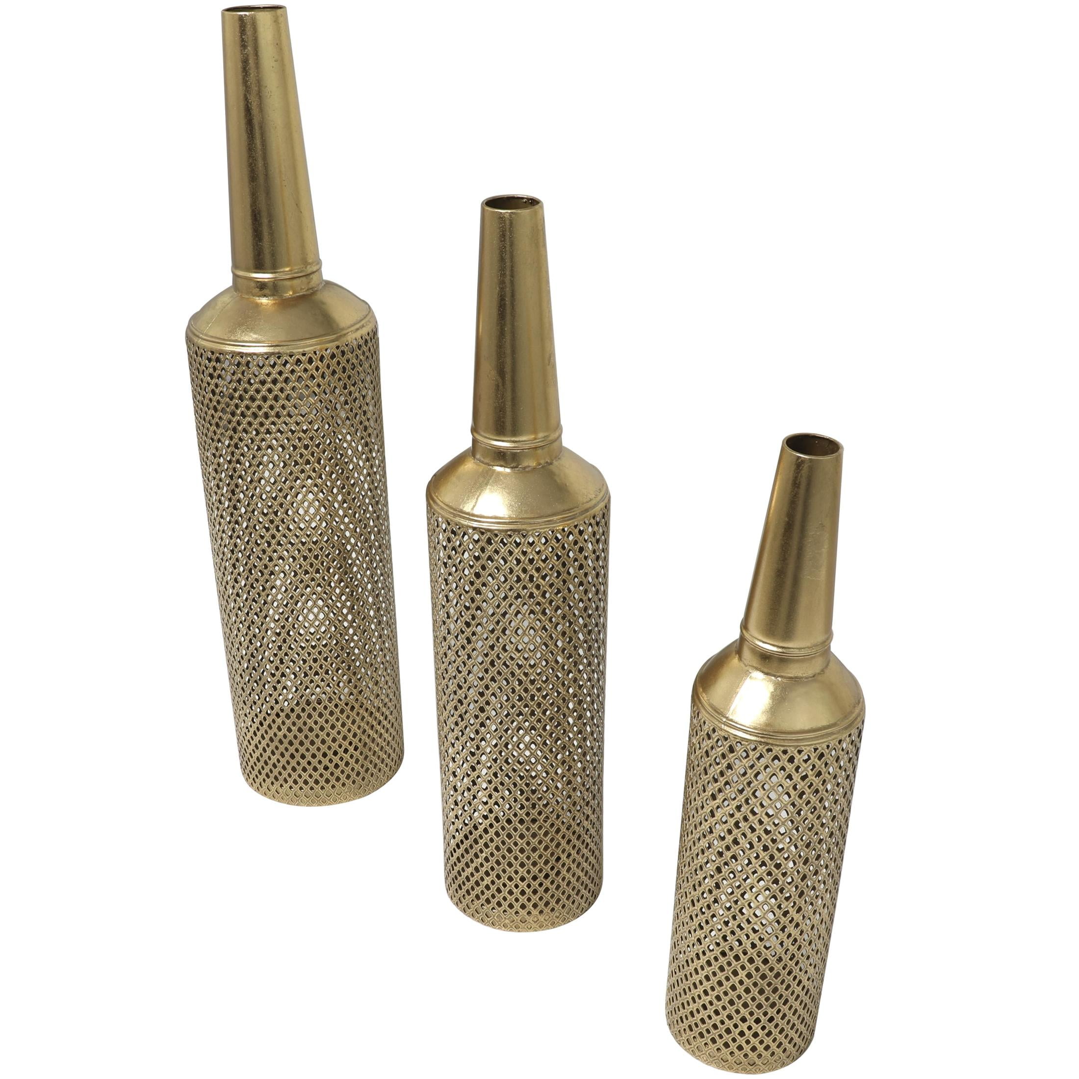Indulge in the glamorous luxury of plush textures, dazzling details, and sleek finishes to elevate your home and add a sophisticated flair Gold decorative vase set is made entirely from iron, ensuring its durability and longevity Round home decor vases set features a satin gold finish that exudes elegance Metal set of 3 vases showcase tall, slender figures with funnel-shaped necks and mouth openings Each gold metal vase measures 7.20L x 7.10W x 30.30H , 5.95L x 6W x 25H, 5.05L x 5.05W x 21H inches, and collectively weighs 6.5 lbs These satin gold vases for decoration have a round-shaped bottle style with an intricate textured pattern, offering a sophisticated look Wipe clean with a dry cloth This glam set of 3 vases for home decor is welded with metal and applied with a satin gold finish for added sophistication Glam style DecMode 30, 25, 21″H Tall Slim Floor Gold Metal Vase with Open Frame Design, Set of 3 makes a perfect addition to any home