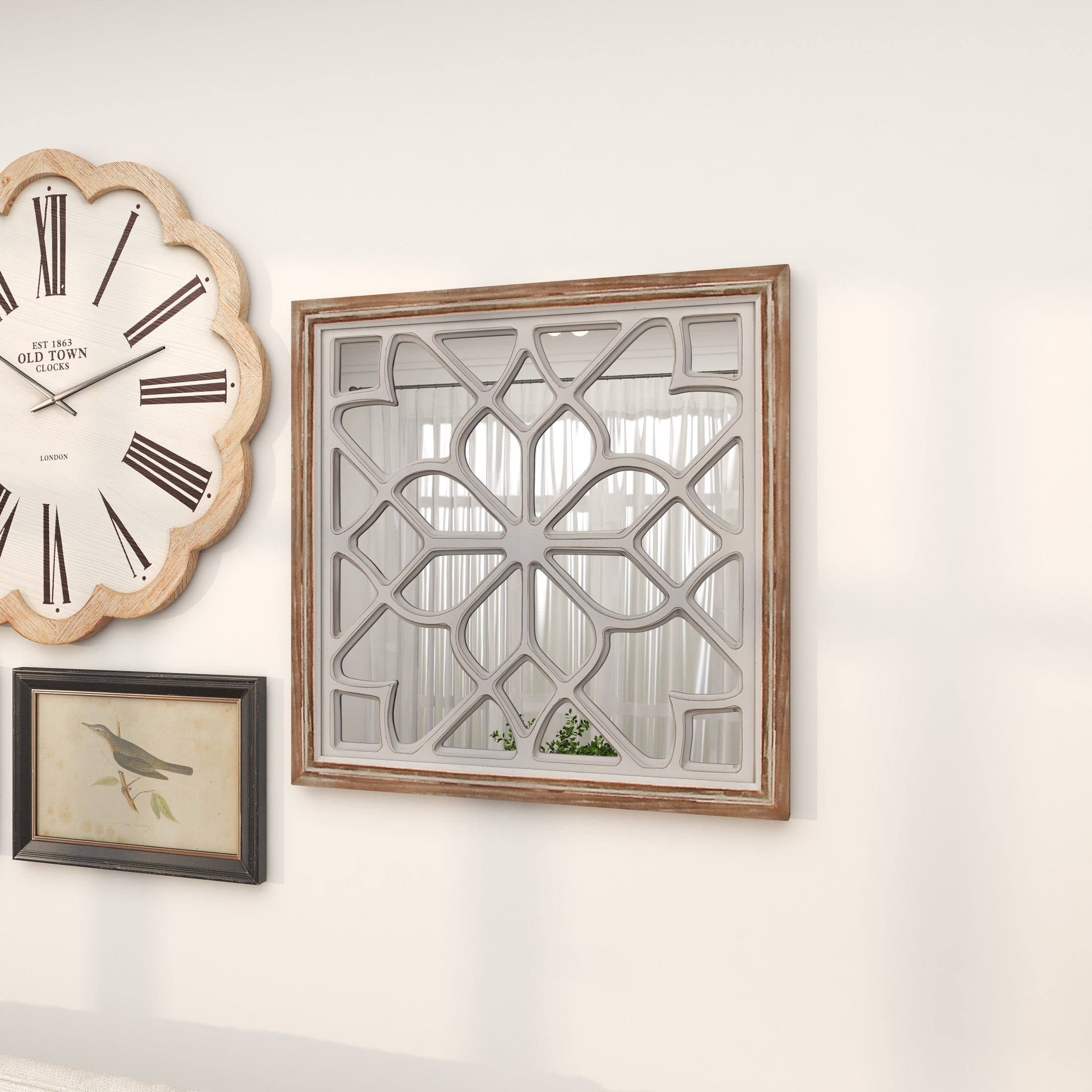DecMode White Wood Floral Room Wall Mirror with Carved Overlay and Brown Frame, 30″ x 1″ x 30″