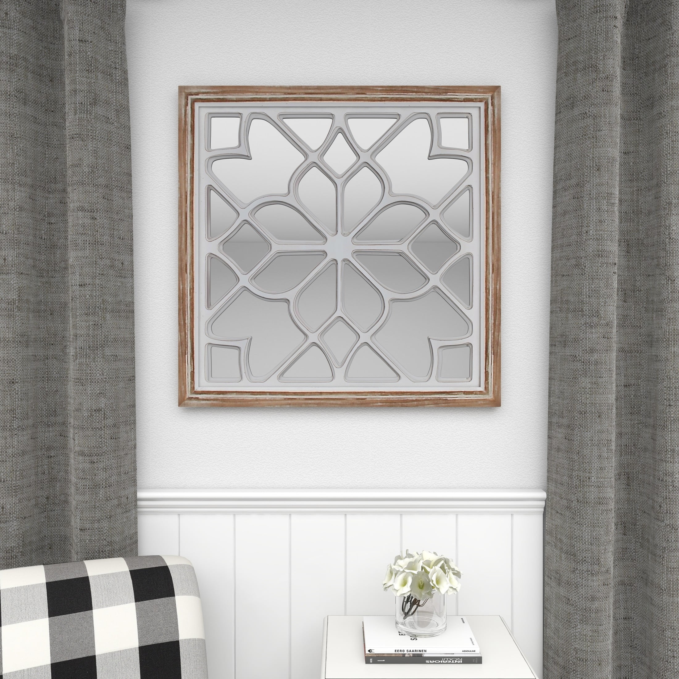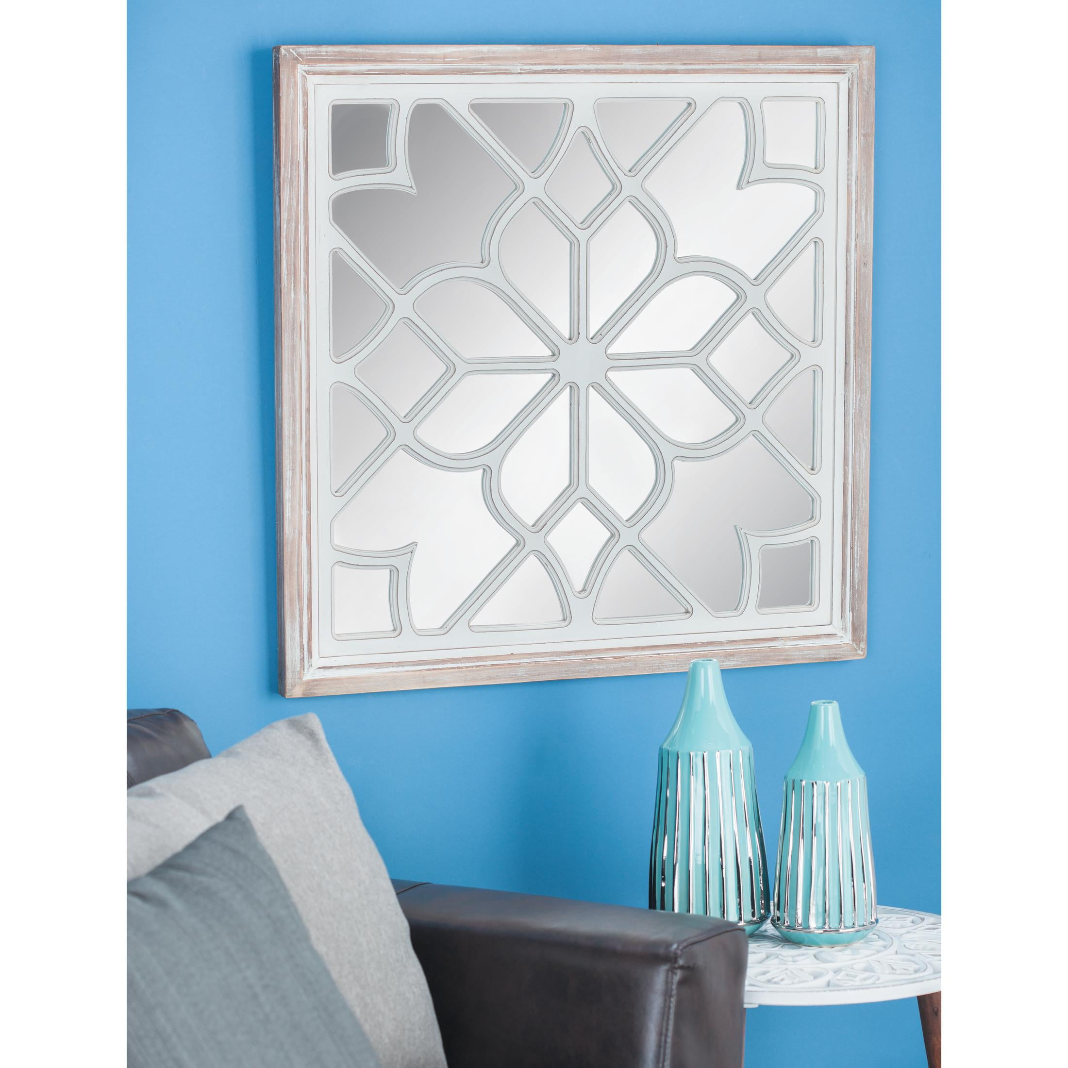 Infuse your home with romantic nostalgia and timeless grace, where ornate and antique details create a sanctuary of charm and warmth in the home Crafted from natural fir wood, glass, and MDF, the white room wall mirror offers durability and longevity The square hanging wall mirror boasts a whitewashed natural wood trim, complemented by a white wood floral design and brown frame The wood wall mirror features a stylish carved wooden lattice overlay, adding an extra element of design to its appearance The white wood wall mirror measures 30.13L x 1.13W x 30H inches, and weighs 17.94 lbs The washed white mirror for wall stands out with its extra-large square panel featuring a stunning floral-carved overlay design Wipe clean with a dry cloth The vintage accent wall mirror is created with carved wood used to frame the mirror and MDF for the backing Vintage style DecMode 30″ x 30″ White Floral Wall Mirror with Carved Overlay and Brown Frame makes a perfect addition to any home