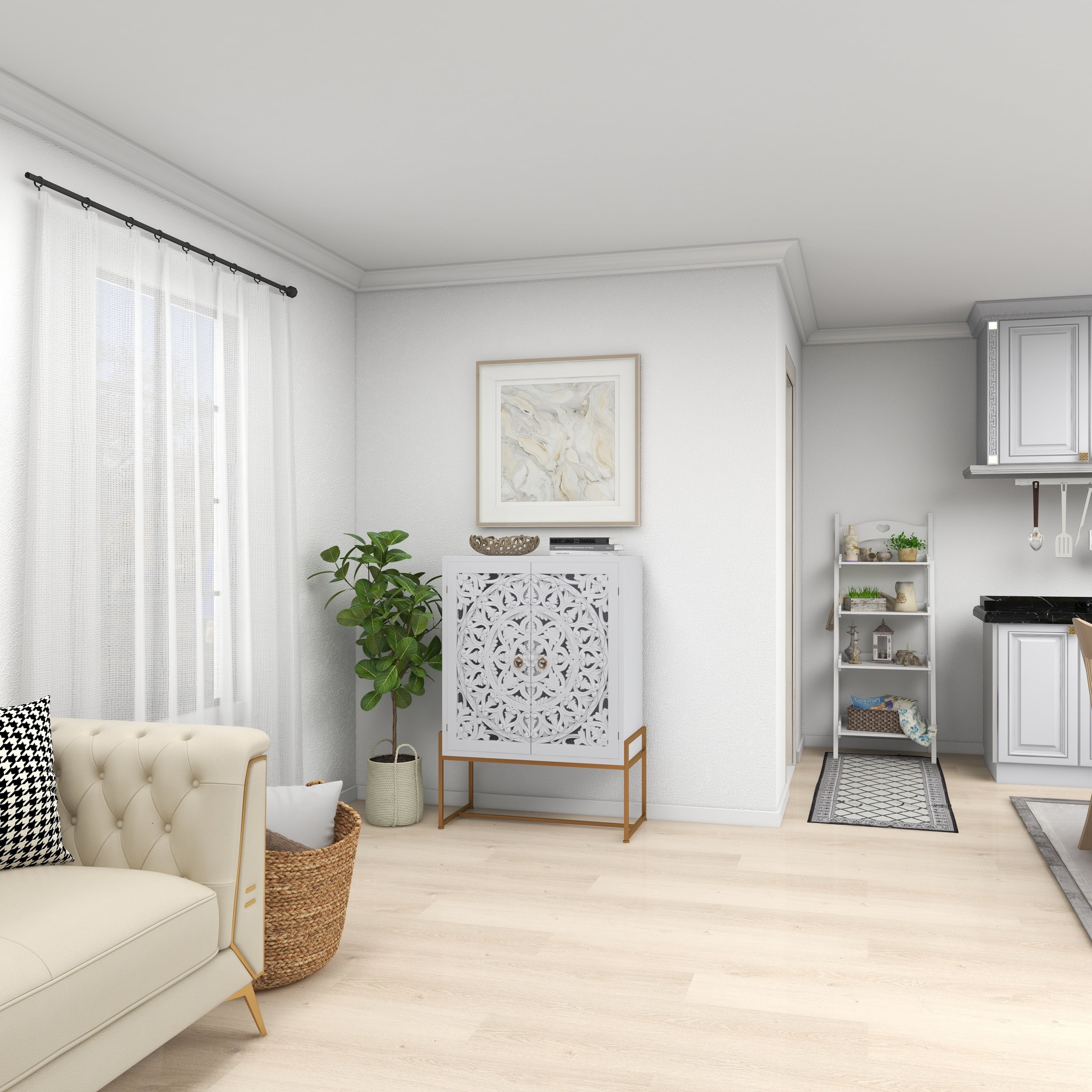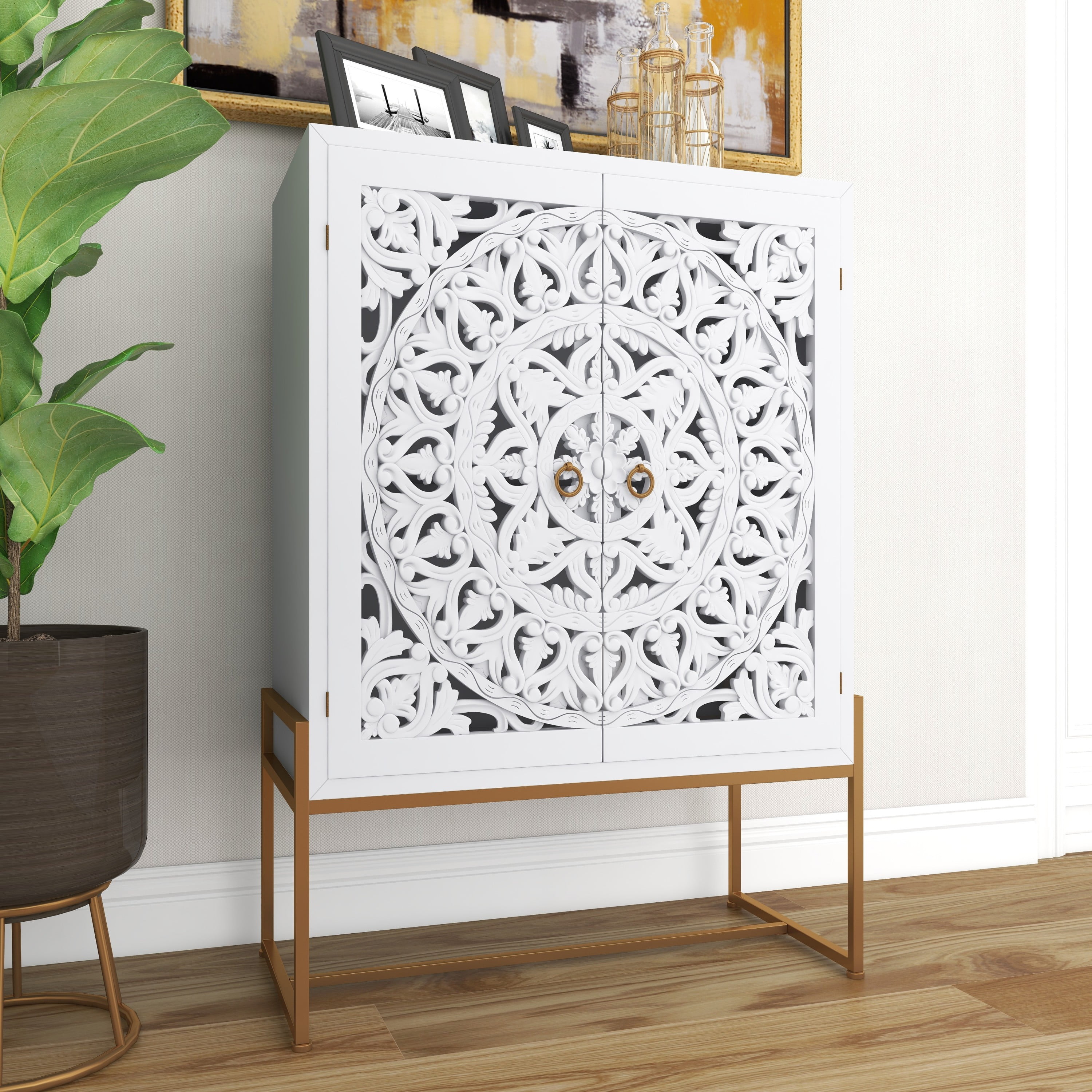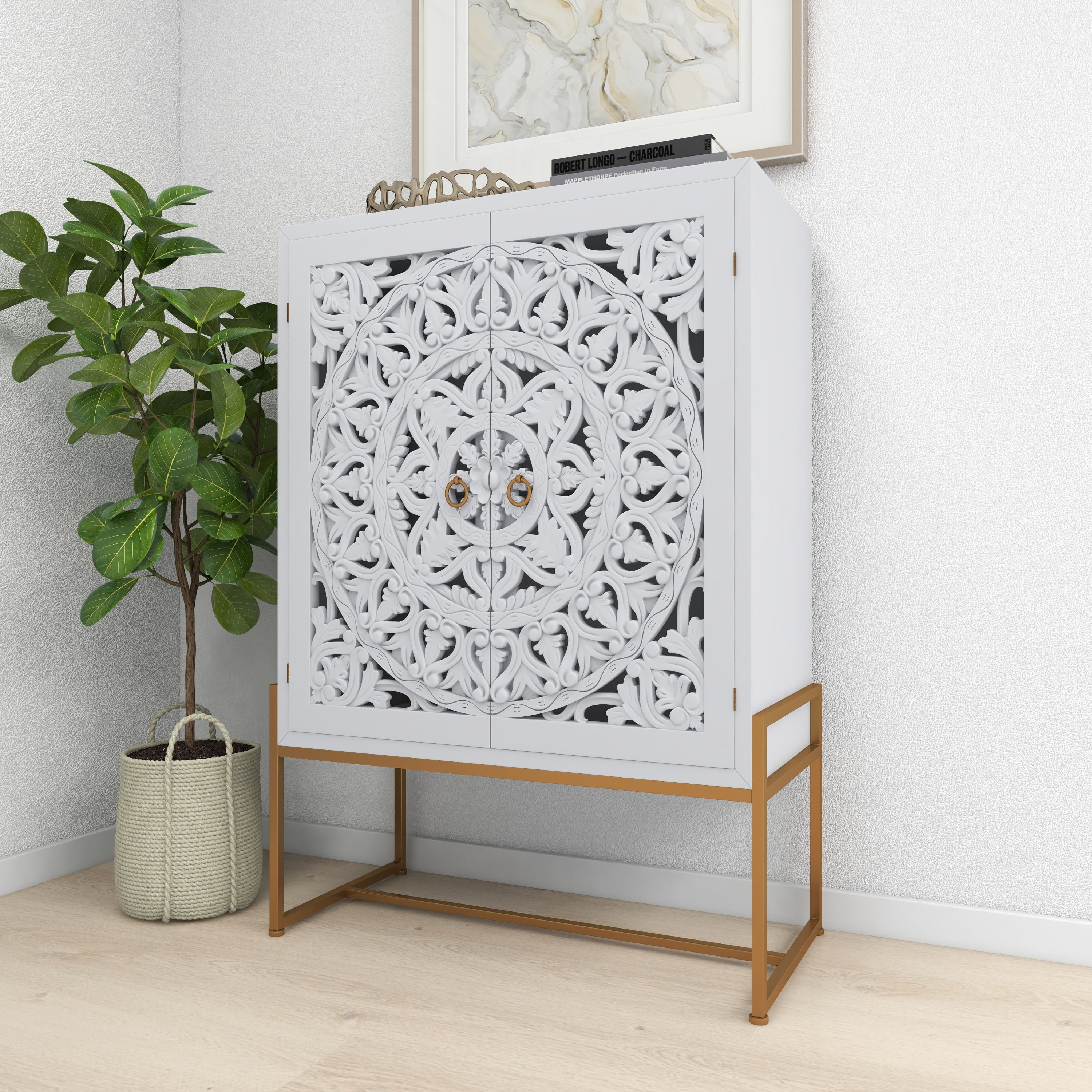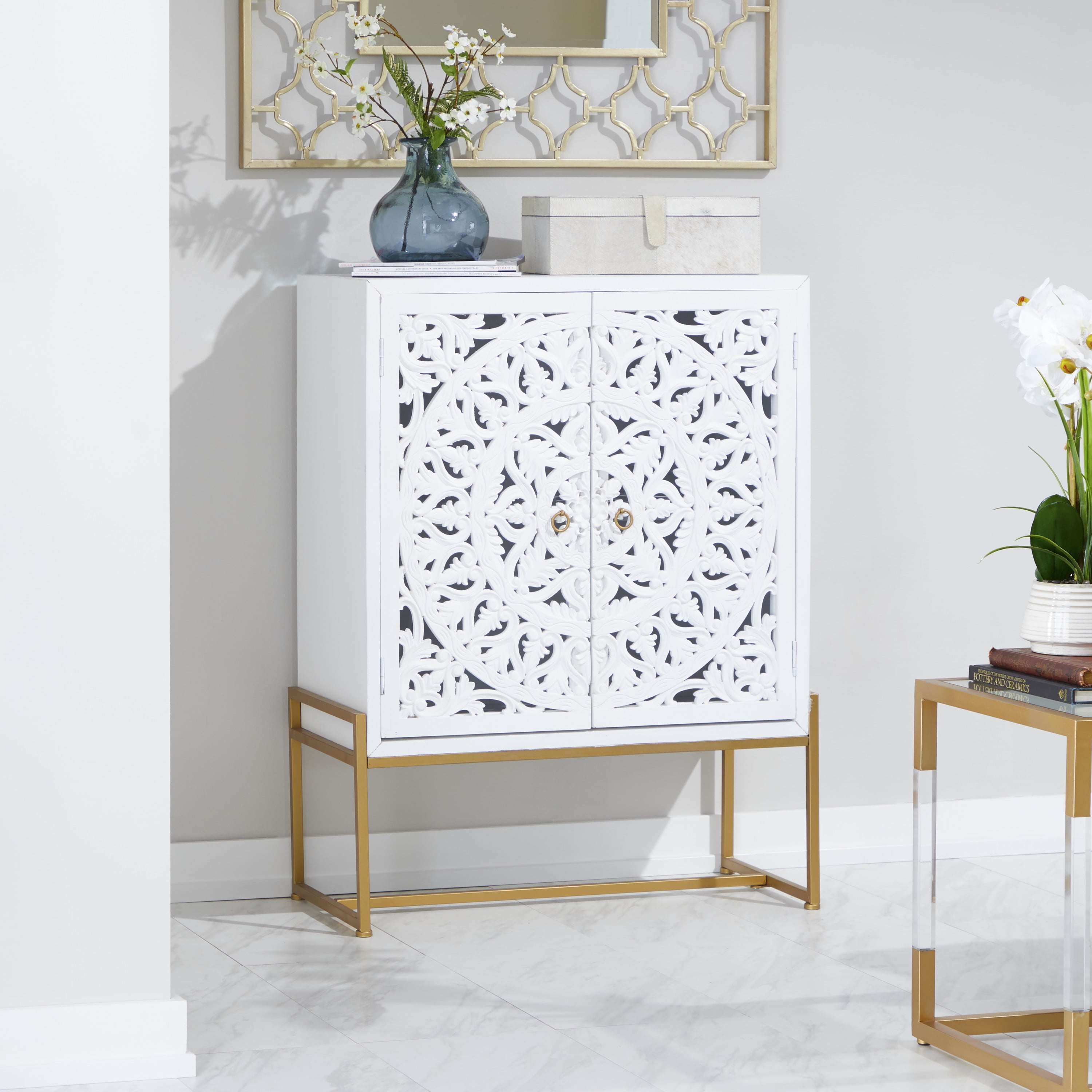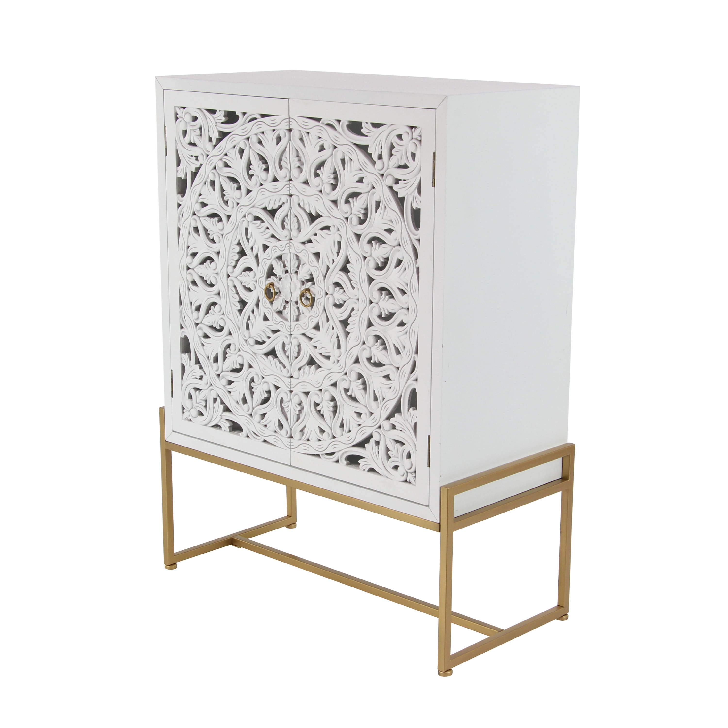 Designed with the essence of timeless sophistication, where rich old-world textures and warm hues come together for a refined classic taste of understated luxury White cabinet is made of a solid wood and a rectangular iron stand Carved wood cabinet carries bright white finish with gold hardware Tall storage unit features an extraordinary mandala carvings on each cabinet doors with magnets closure for secure display, and supported by rectangular base frame This item measures 30.19L x 15.38W x 41.75H inches, and weighs 40.50 lbs This wooden cabinet with doors carries a rectangle frame and a gold metal base Wipe clean with a dry cloth This wooden storage cabinet has doors carved with ornate traditional details and fixed with magnet locks Traditional style DecMode 30″ x 42″ White Wood Intricately Carved 1 Shelf and 2 Doors Floral Cabinet, 1-Piece makes a perfect addition to any home