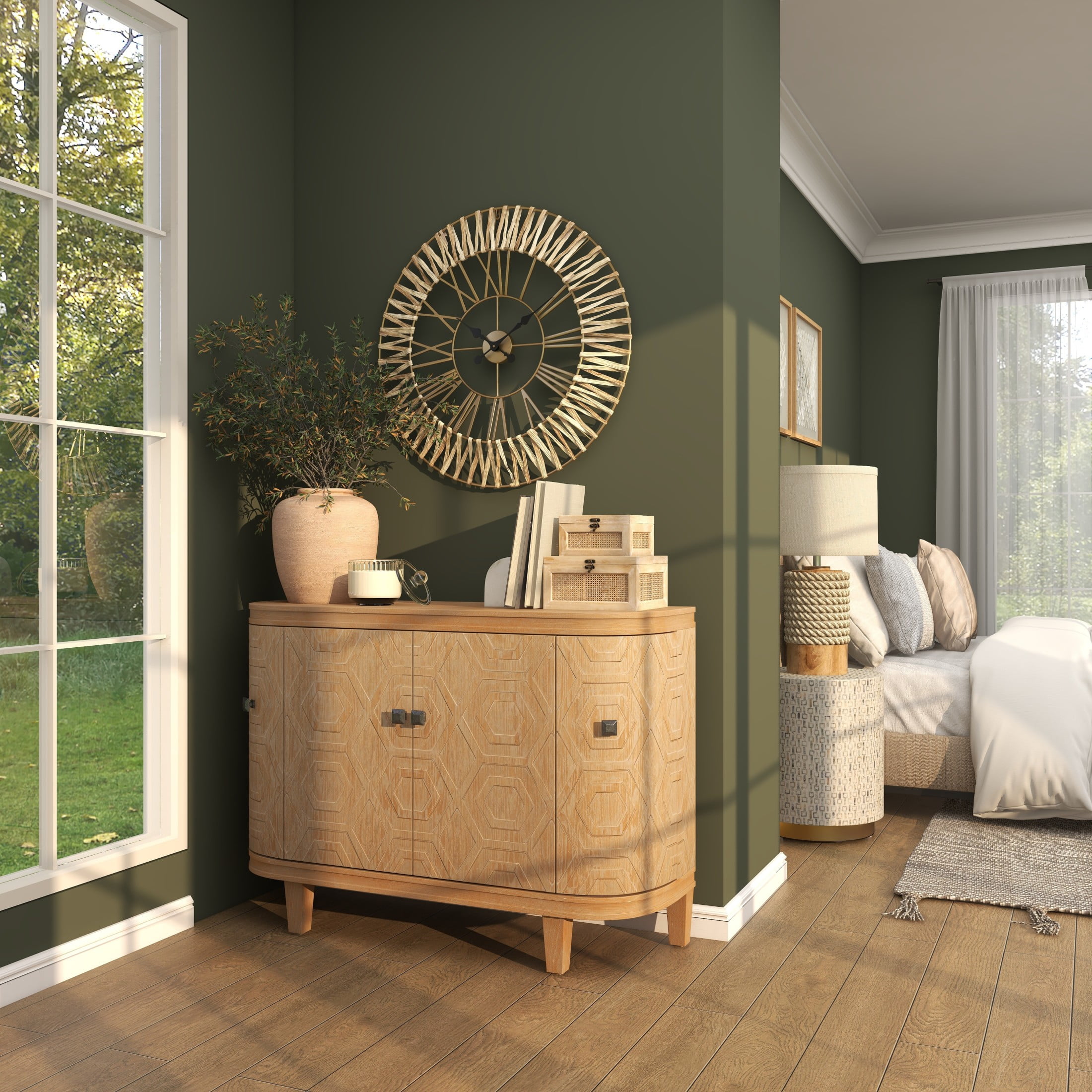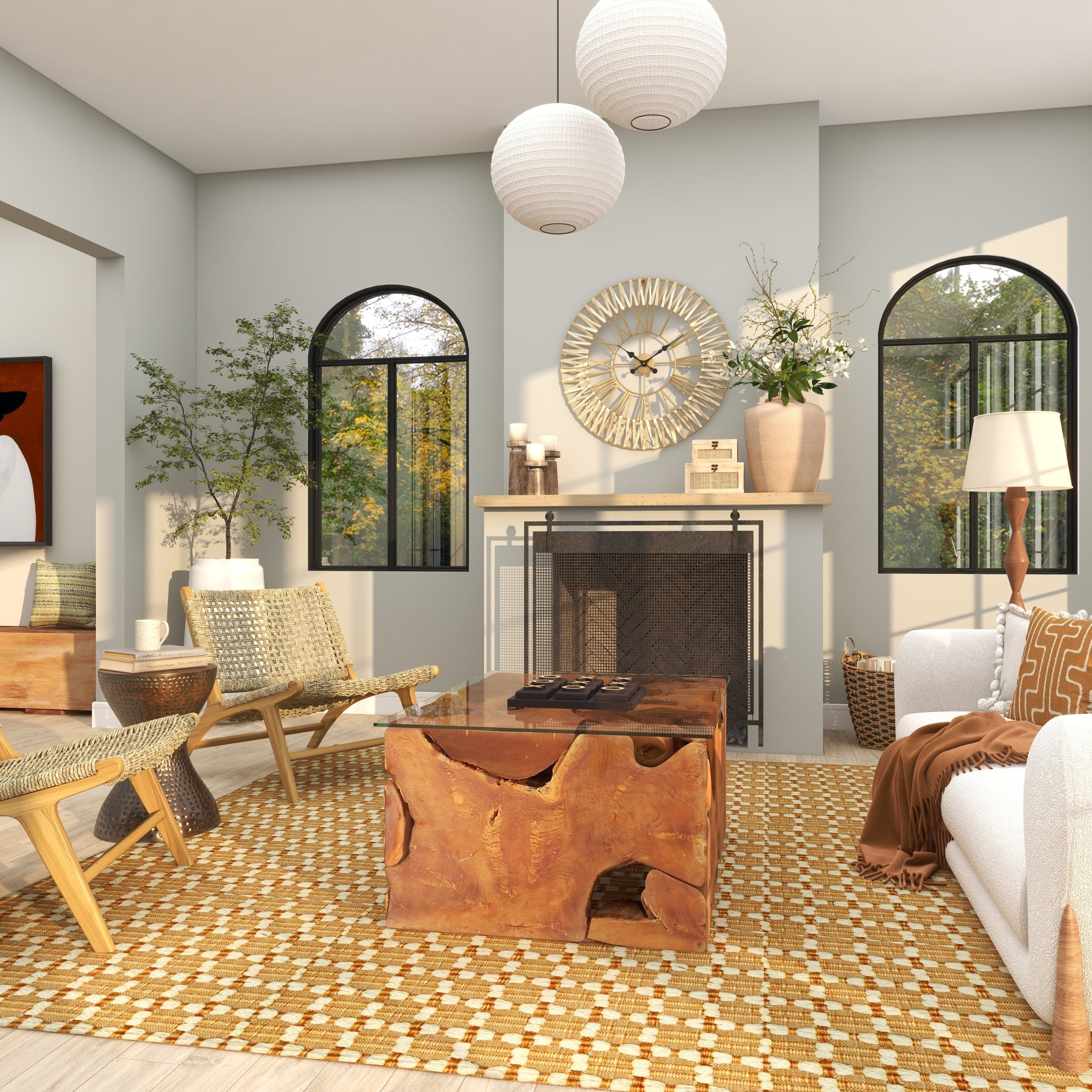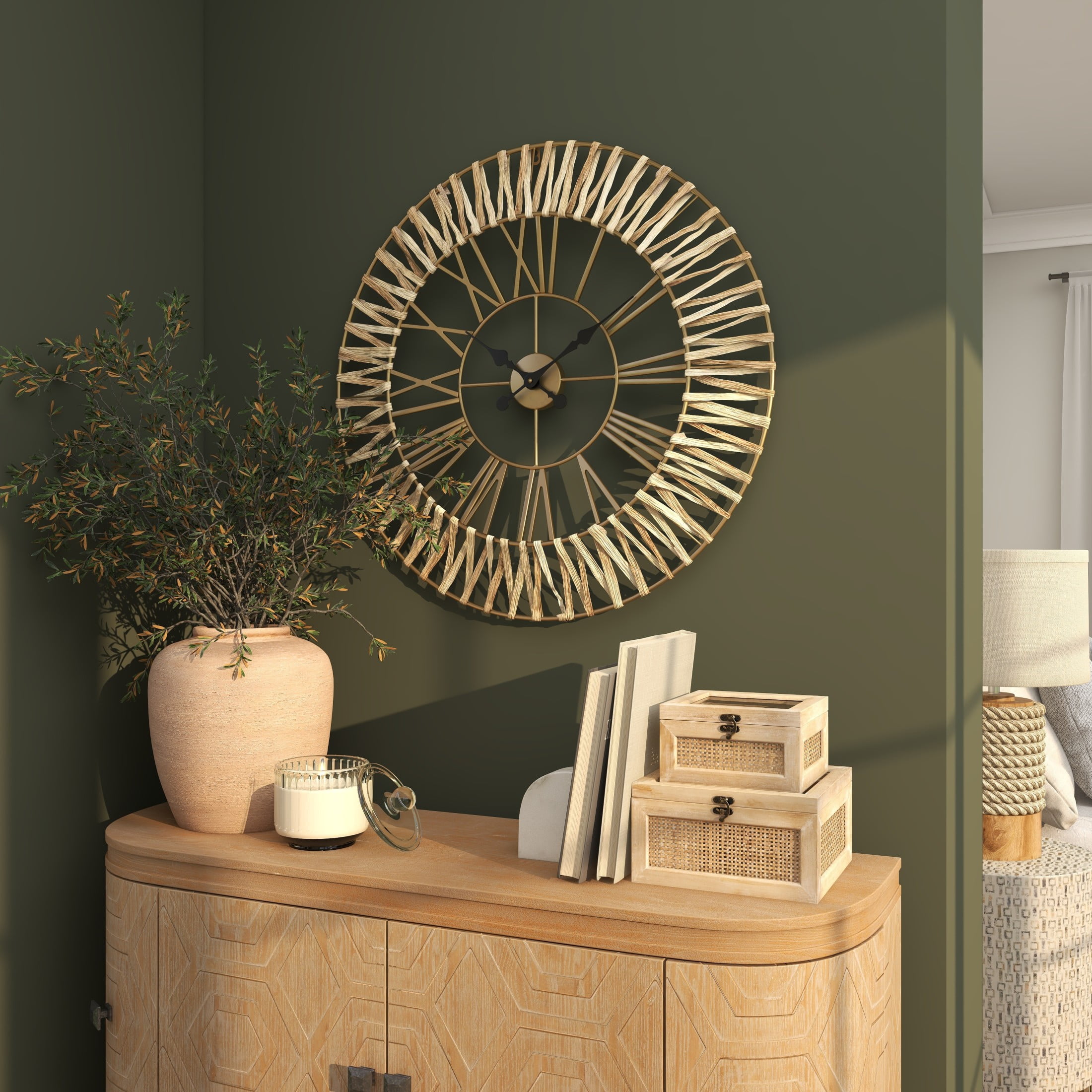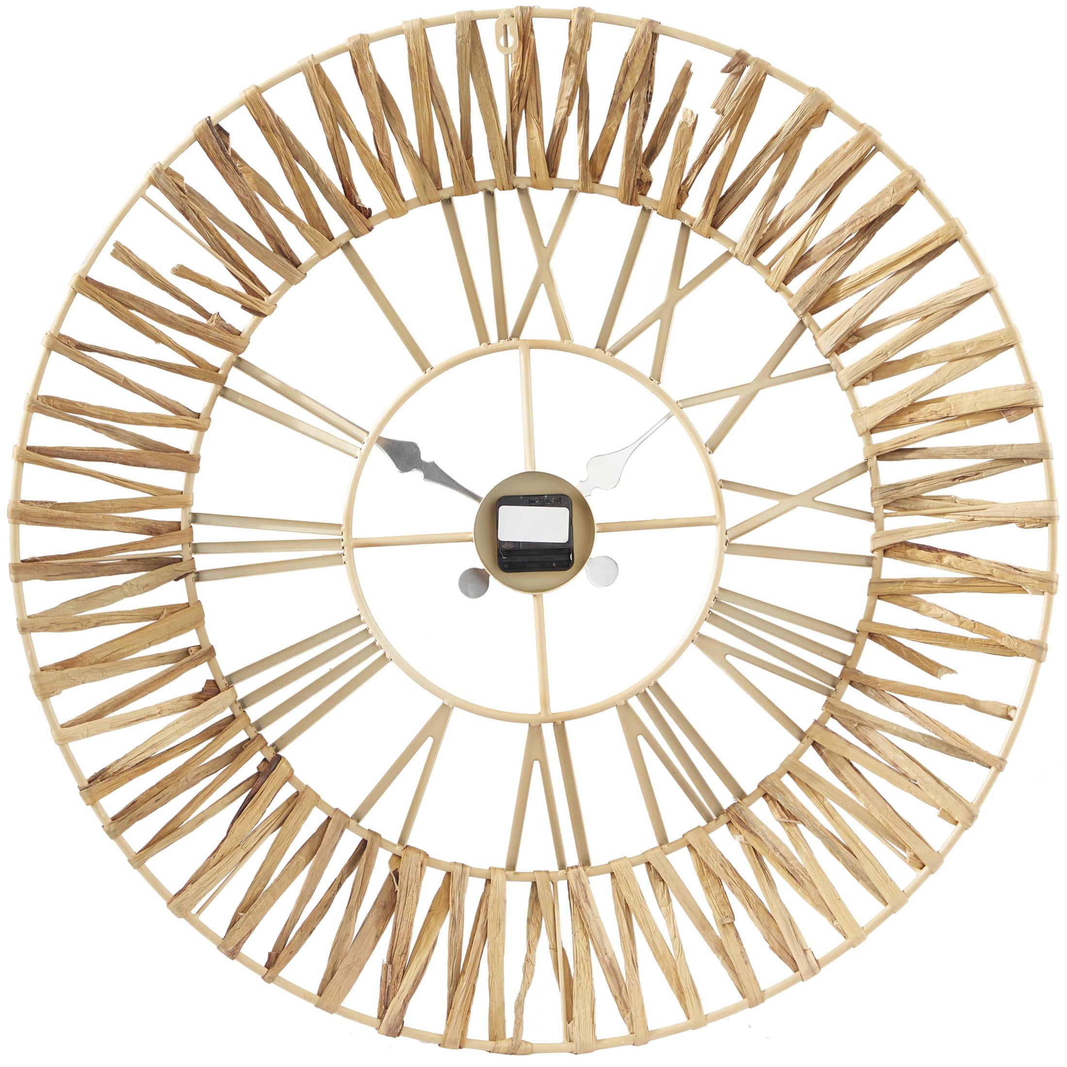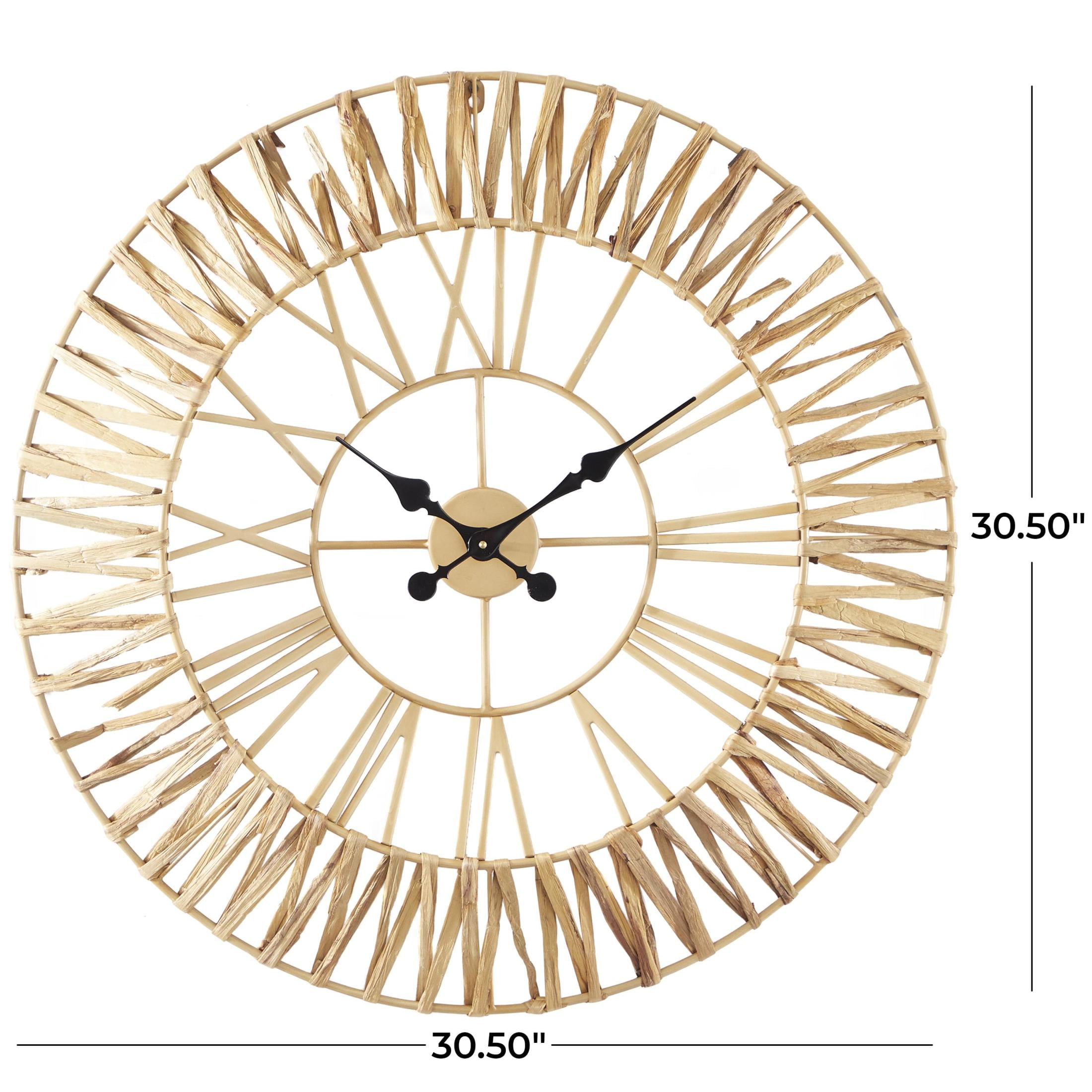 Infuse your home with cozy charm, where organic materials and warm earthy tones create a timeless, nature inspired atmosphere The brown decorative wall clock is crafted with iron and dried water hyacinth, ensuring a stylish and stable structure The round wall clock for decoration carries a matte gold finish with textured light brown seagrass accents This seagrass wall clock features a woven water hyacinth around the double border frame that adds texture and character The brown seagrass wall clock measures 30.50L x 2W x 30.50H inches, and weighs 2.60 lbs This textured brown oversized wall clock accentuates a large round frame with a zigzag pattern, Roman numerals, and spade-shaped hands Wipe clean with a dry cloth The natural wall clock for kitchen features a double-frame structure from welded iron and dried seagrass woven through it Natural style DecMode 31″ Brown Seagrass Woven Wall Clock with Gold Metal Frame makes a perfect addition to any home