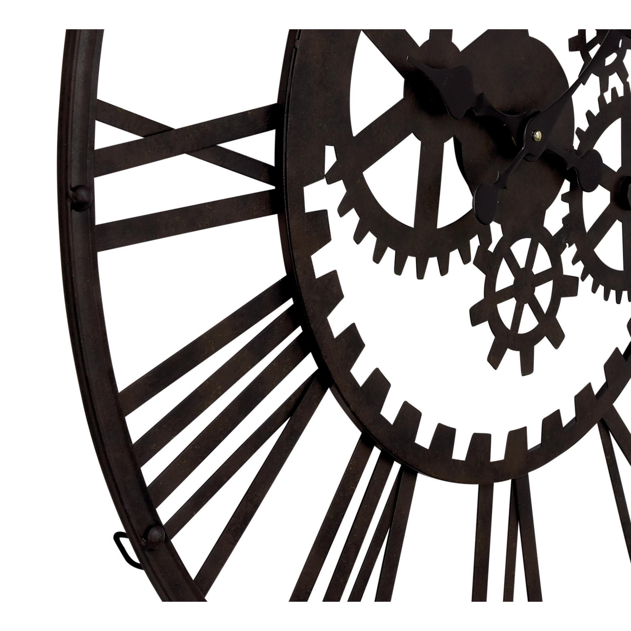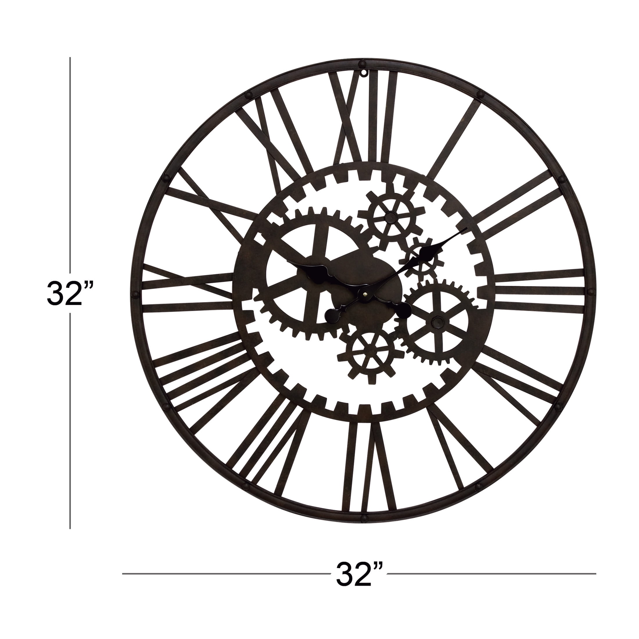 Designed with rugged charm and edgy allure, where metal finishes and raw materials unite to create an urban aesthetic that showcases your artistic expression Made entirely of solid iron, this black decorative wall clock offers durability with style Industrial round wall clock for decoration highlights a matte black finish over the frame, numbers, gear details and hands Iron wall clock features exposed gear silhouettes inside, wrapped with easy-to-read Roman numerals, a metallic black finish, and sleek black clock hands The black metal wall clock measures 32L x 2W x 32H inches, and weighs 8.80 lbs Matte black oversized wall clock boasts a round shape with spade clock hands, Roman numerals, and intricate gear-shaped elements within it Wipe clean with a dry cloth Industrial wall clock for kitchen is expertly welded with iron, creating a unique and cohesive hanging décor Industrial style DecMode 32″ Black Metal Gear Wall Clock makes a perfect addition to any home
