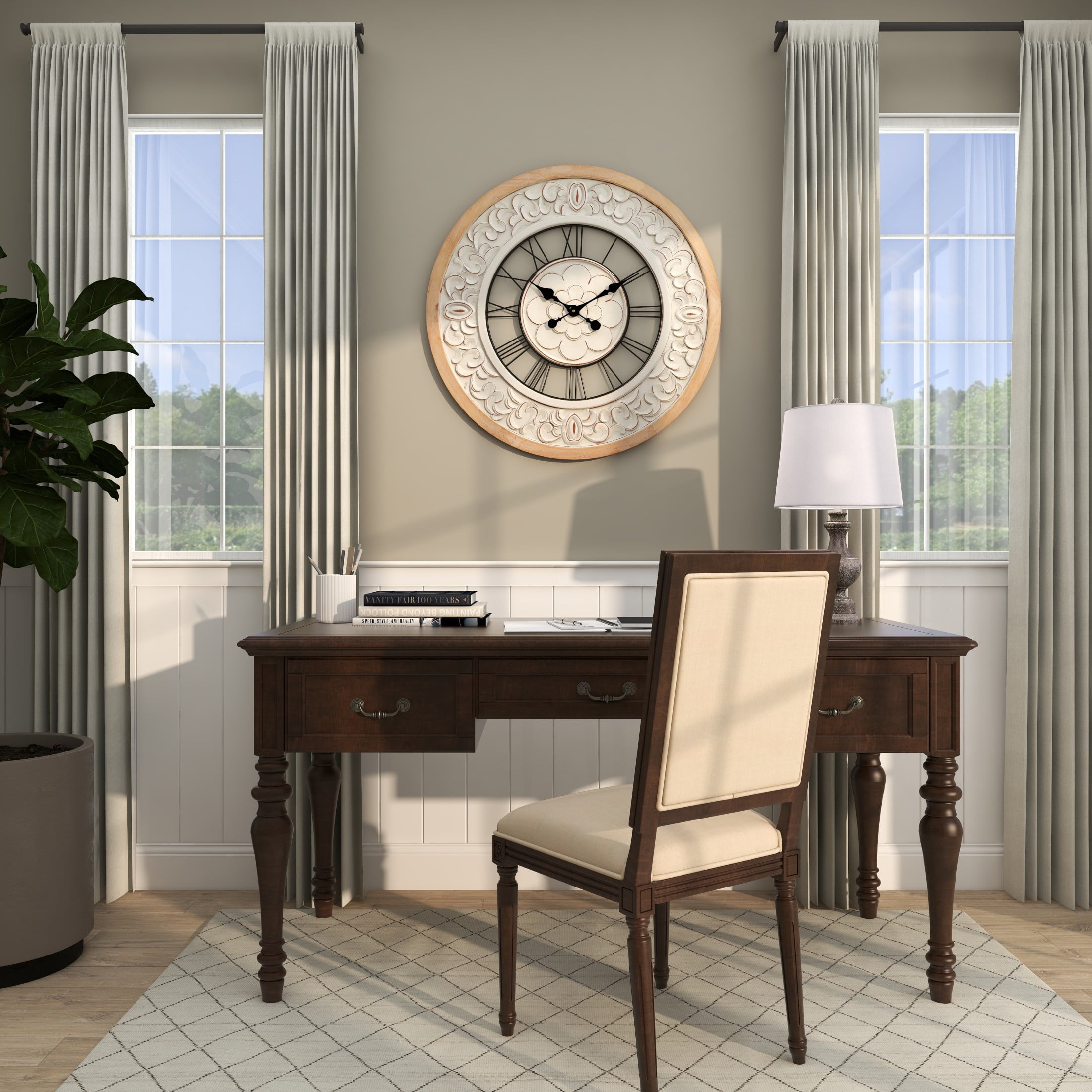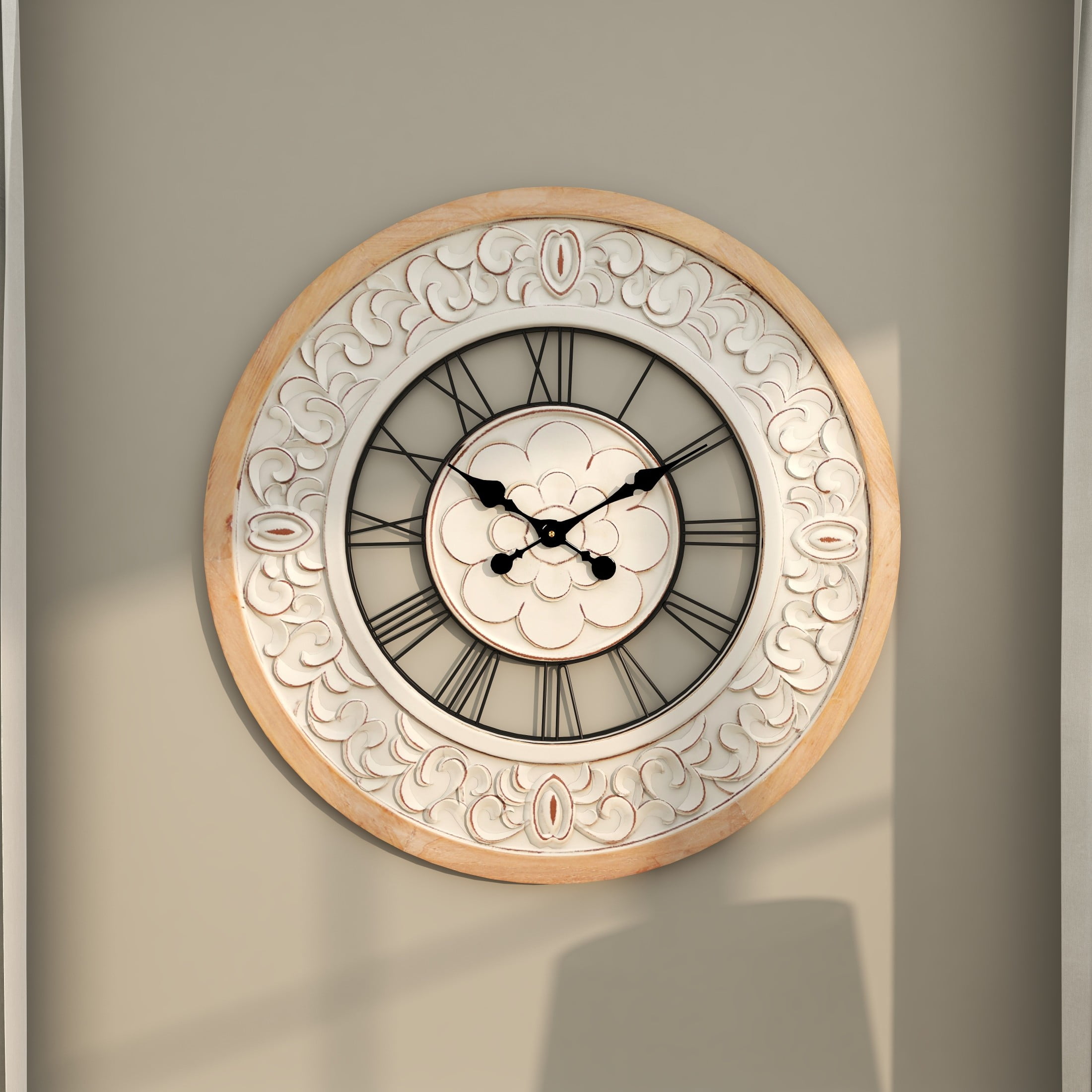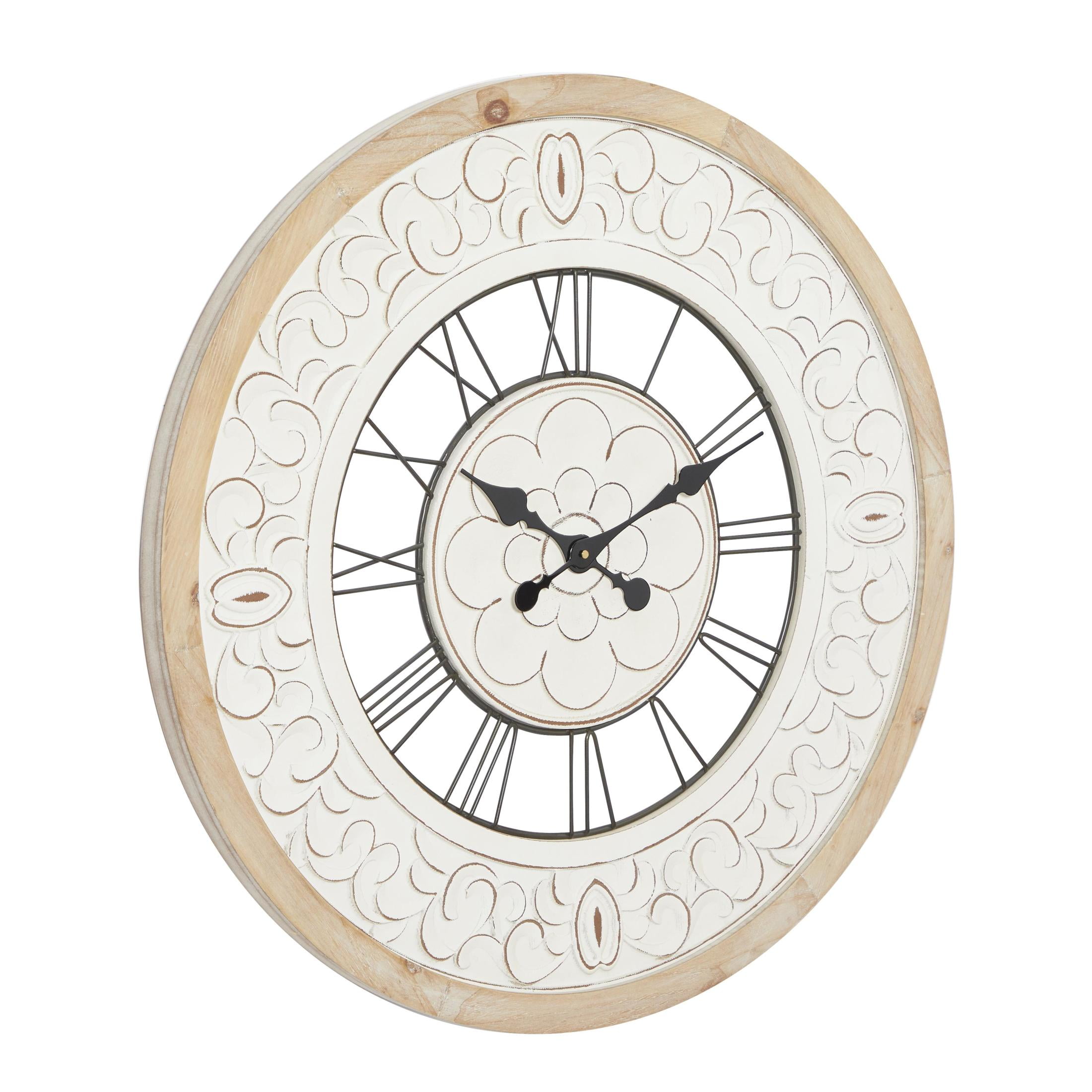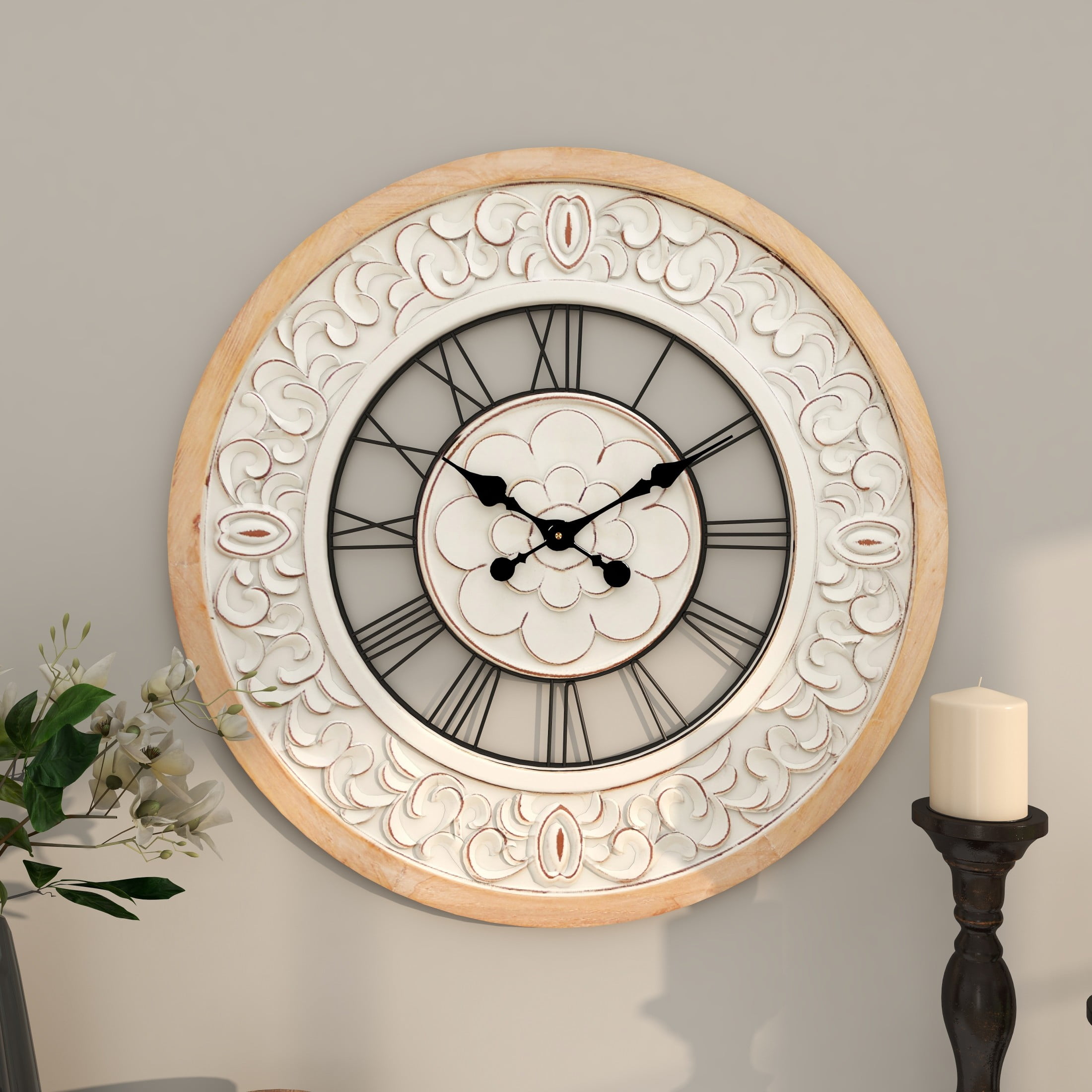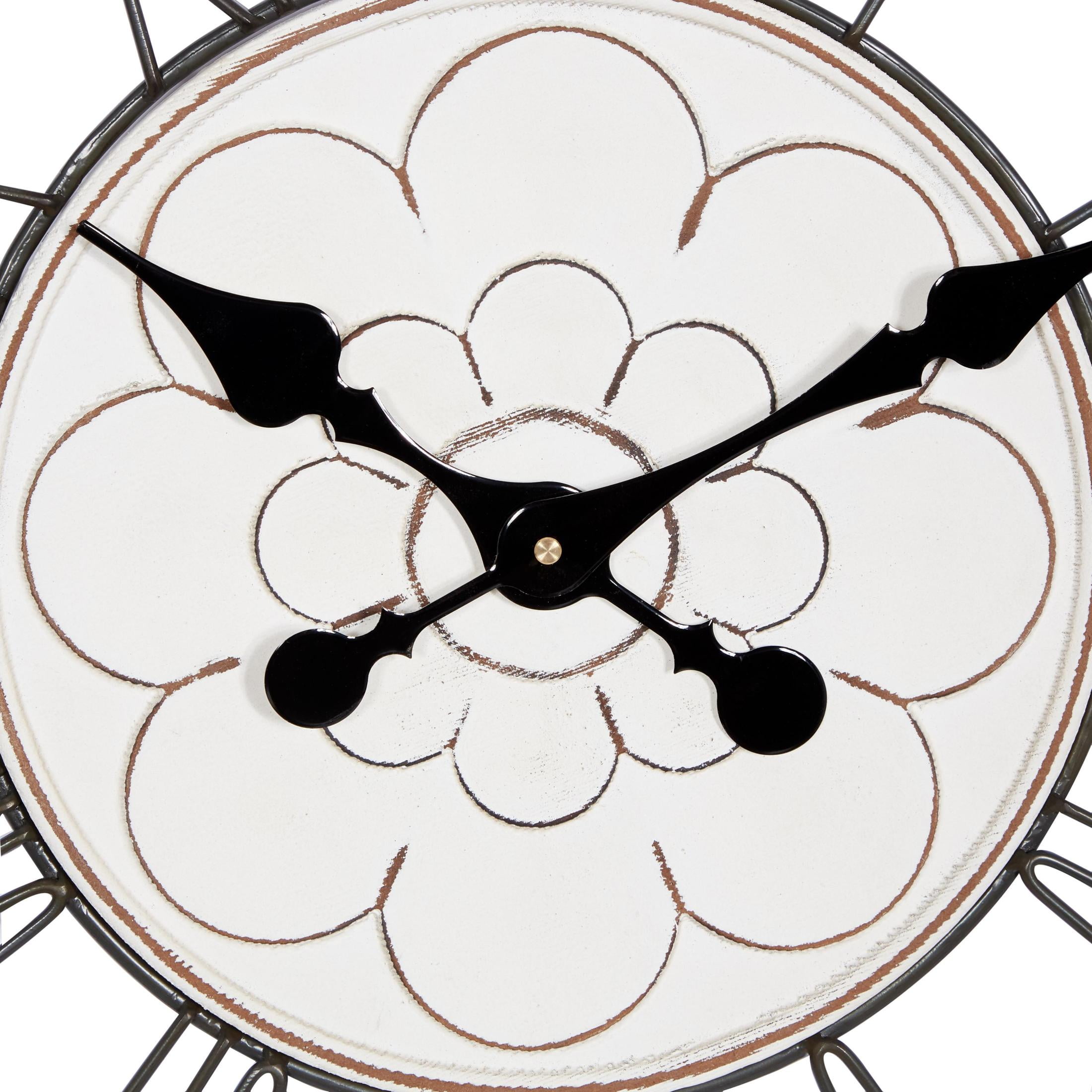 DecMode 32″ White Wooden Floral Carved Wall Clock with Black Metal Accents