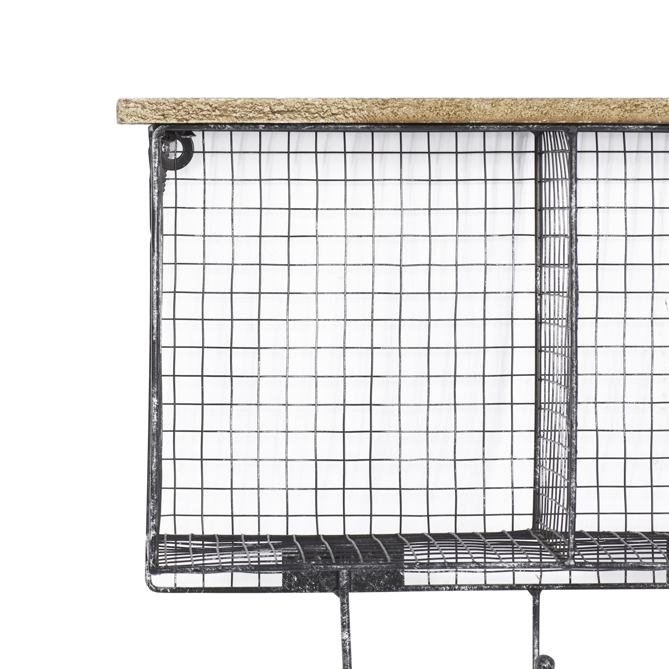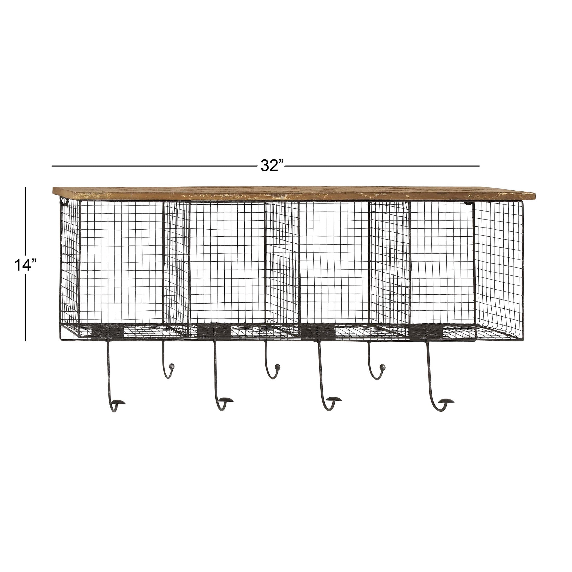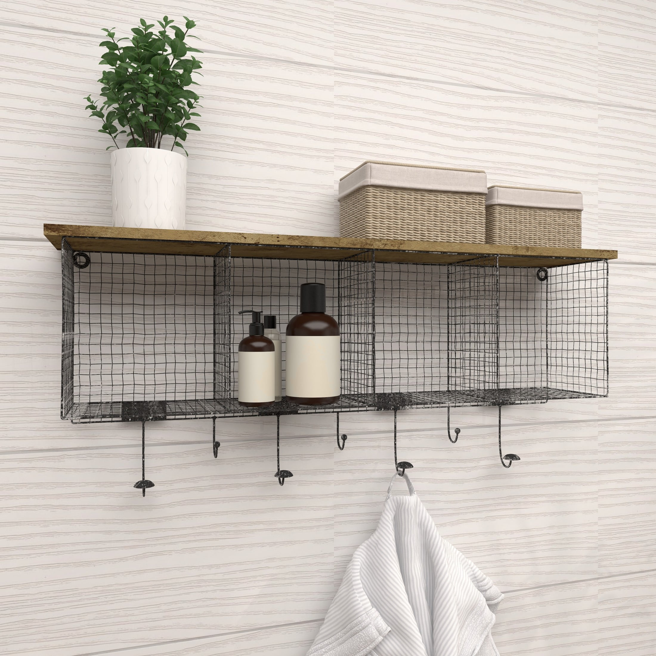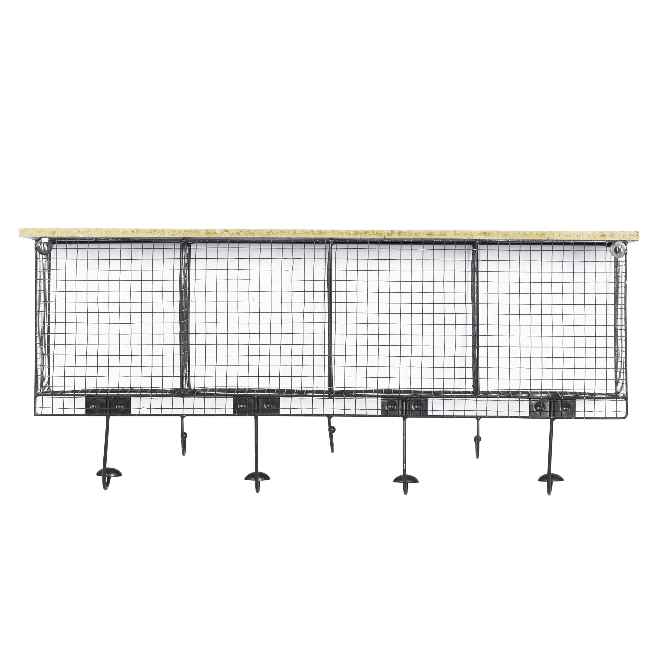 DecMode 32″ x 14″ Black Metal Caged 4 Cubby and 7 Hanger Wall Hook with Wood Shelf, 1-Piece