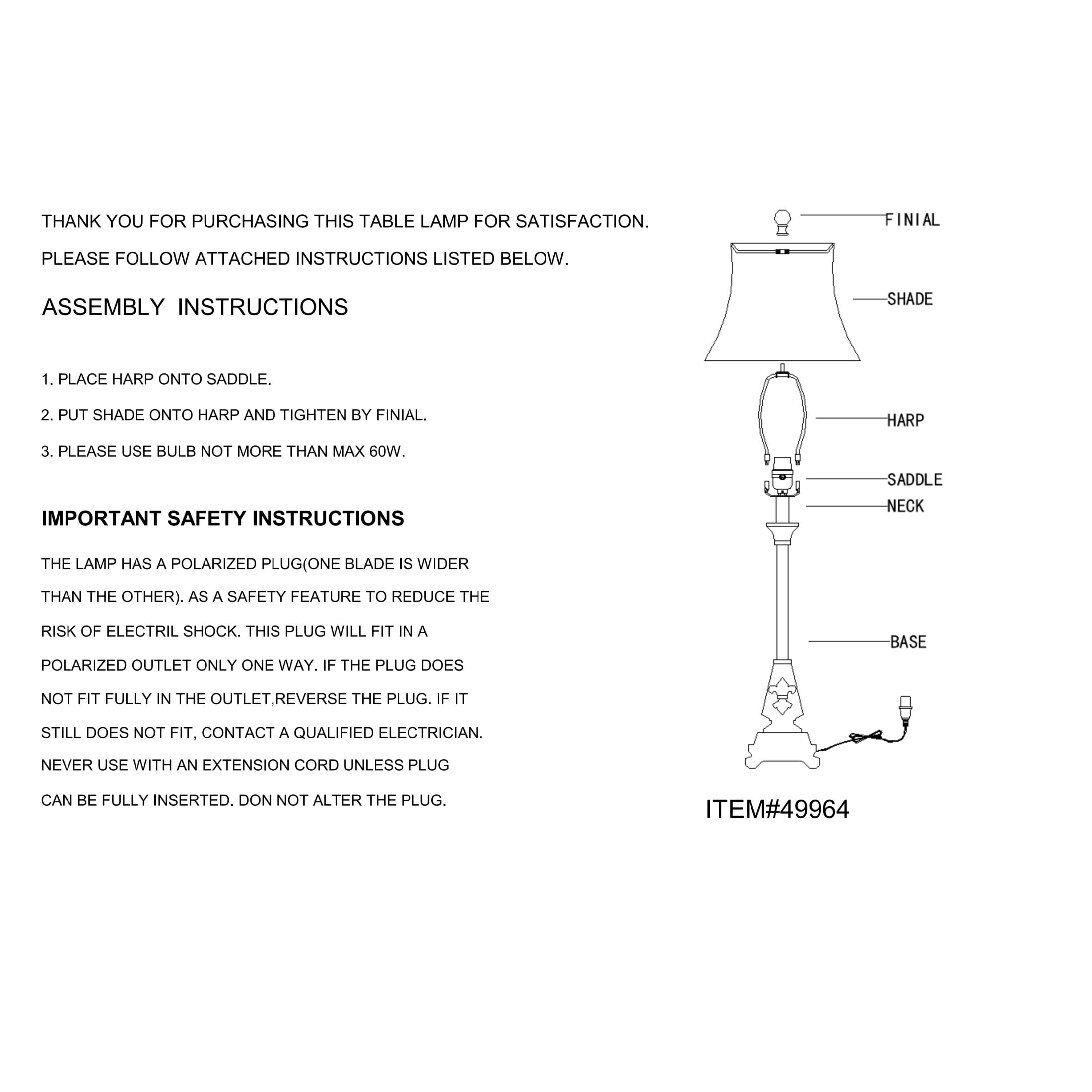 DecMode 35″ Antique Style Fleur De Lis Black Buffet Lamp with Brown Fabric Shade is a unique addition to your stylish home. A practical yet stylish upgrade that instantly elevate the look of your room. This eye catching lamp makes a playful addition to your surface space and beautifully illuminate its surrounding area. This fleur de lis table lamp can enhance any space, be it your lobby, living room, kitchen or bedroom with its antique style. Designed with felt or rubber stoppers at the base that prevent scratching furniture and table tops, as well as sliding around. Requires 1 60W Type A E26/Medium (Standard) bulb. This item ships in 1 carton. Comes with a 64″ cord length. Due to the handmade nature of this item, no two will be alike, there will be slight differences in shape, size, and color. Suitable for indoor use only. Some assembly required. Buffet lamp comes with a brown bell shaped shade that measures 11 x 11 x 11 inches. Includes a rotary switch. This is a single black colored table lamp. Tuscan style.