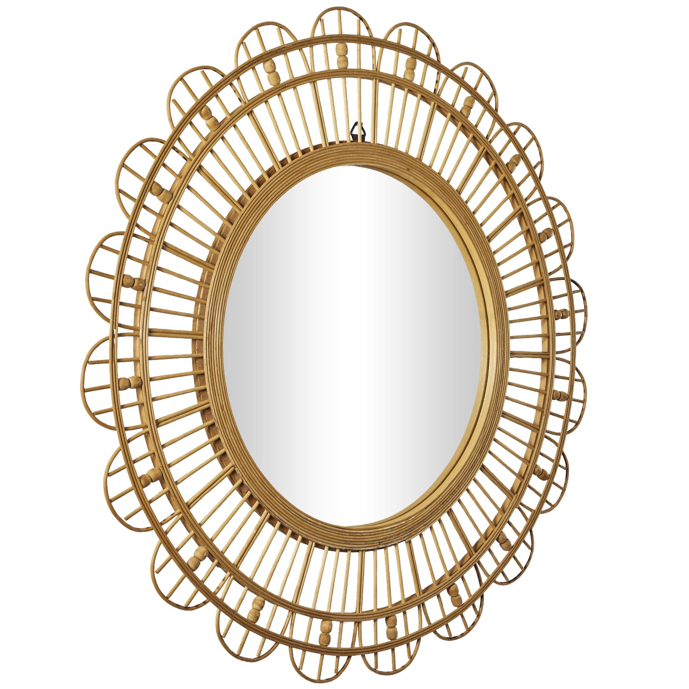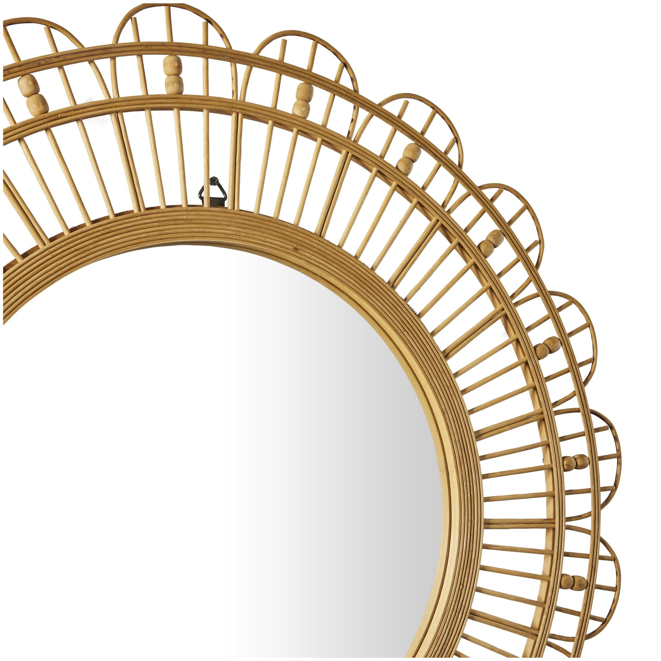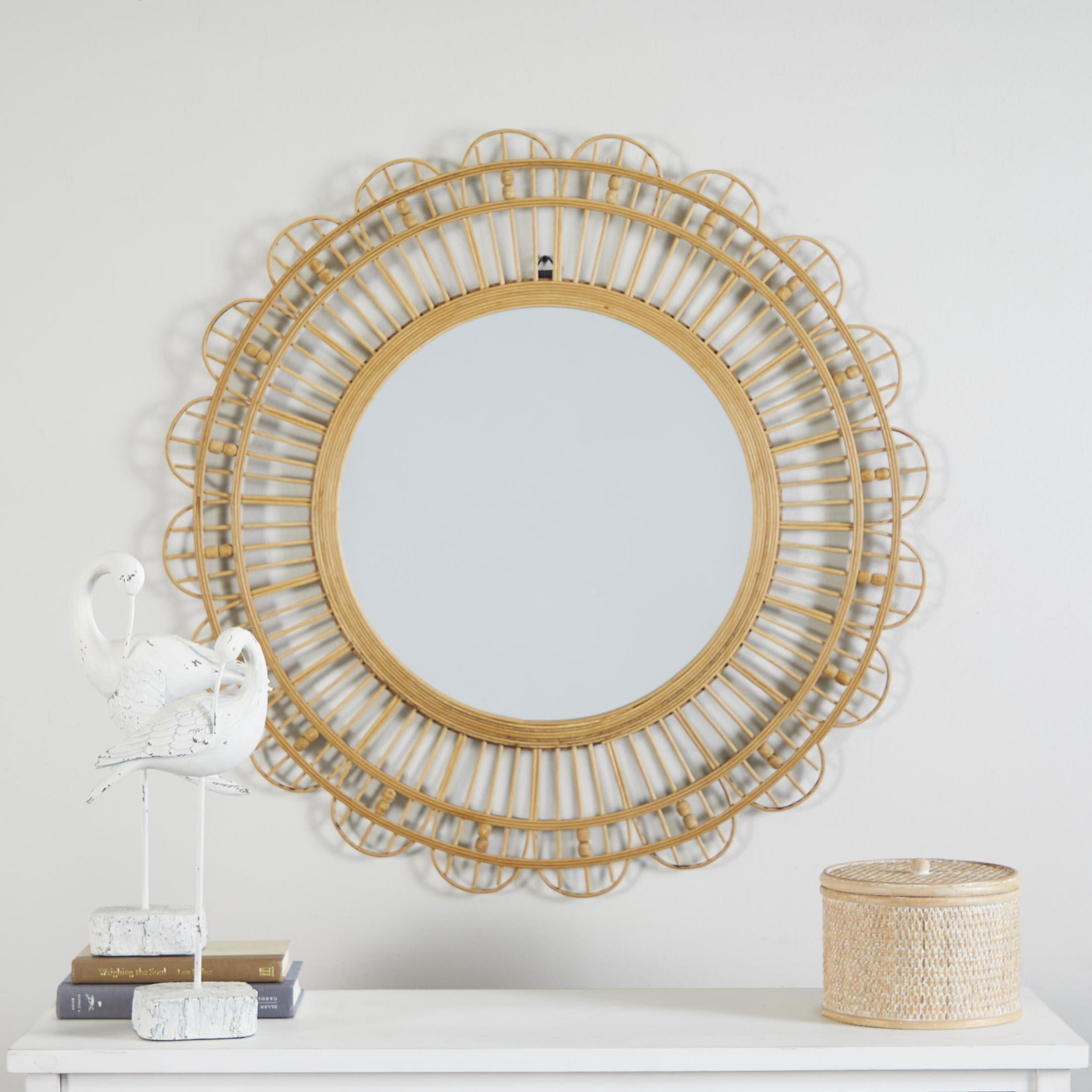 Designed with a free-spirited charm where vibrant hues, eye-catching patterns, and whimsical accents transform your space and showcase your personality The brown room wall mirror is crafted of natural bamboo and quality glass mirror materials with an MDF backing This round hanging wall mirror is furnished with a reflective glass panel and a textured brown bamboo frame This bamboo wall mirror features a unique geometric pattern on its frame, enhancing its distinctive look The brown bamboo wood wall mirror measures 35L x 1W x 35H inches, and weighs 8 lbs The textured brown mirror for wall presents a round shape with woven bamboo and beaded accents on its frame Wipe clean with a dry cloth The bohemian accent wall mirror securely encases the round reflective glass panel within a solid bamboo frame Bohemian style DecMode 35″ x 35″ Brown Handmade Woven Floral Wall Mirror with Beaded Accents makes a perfect addition to any home