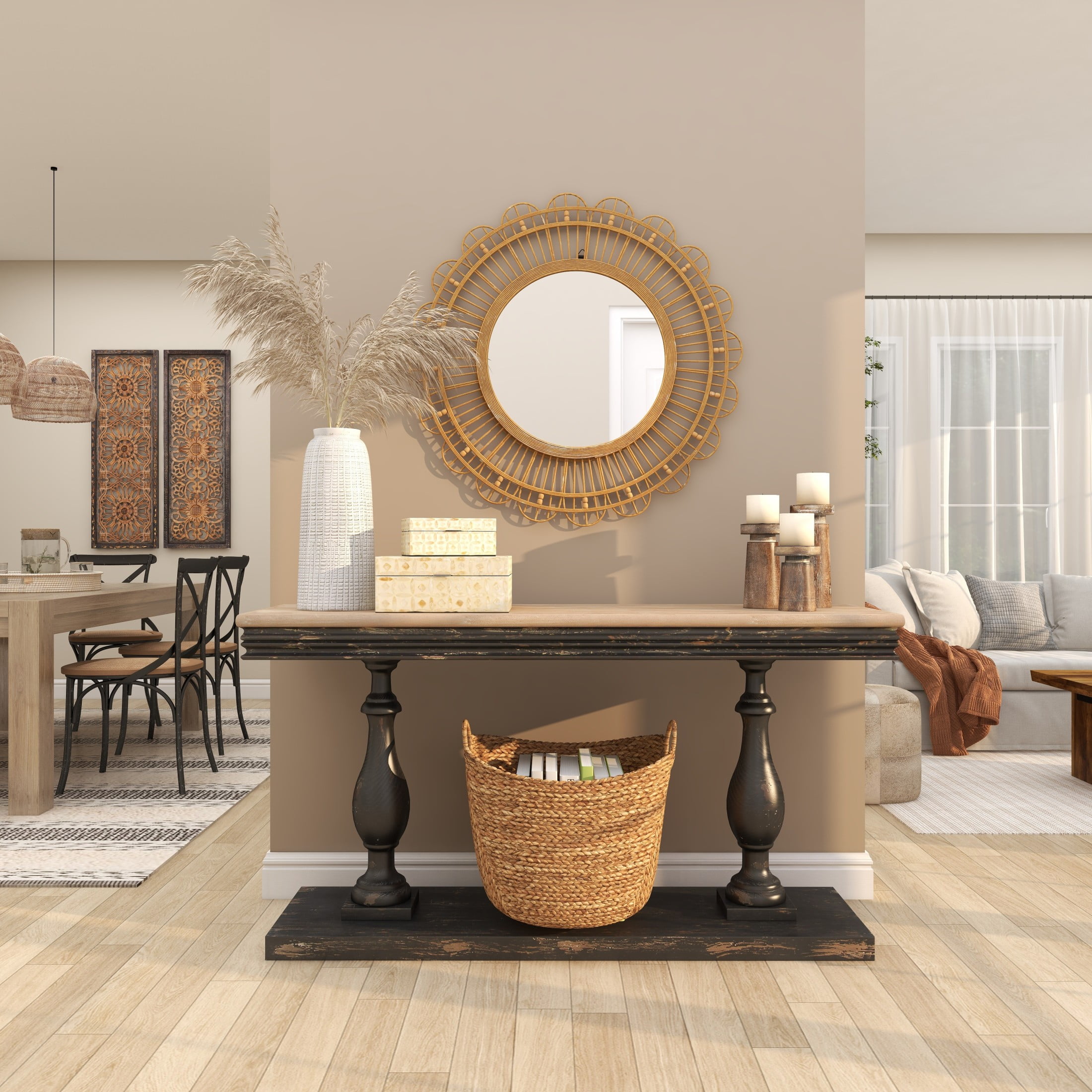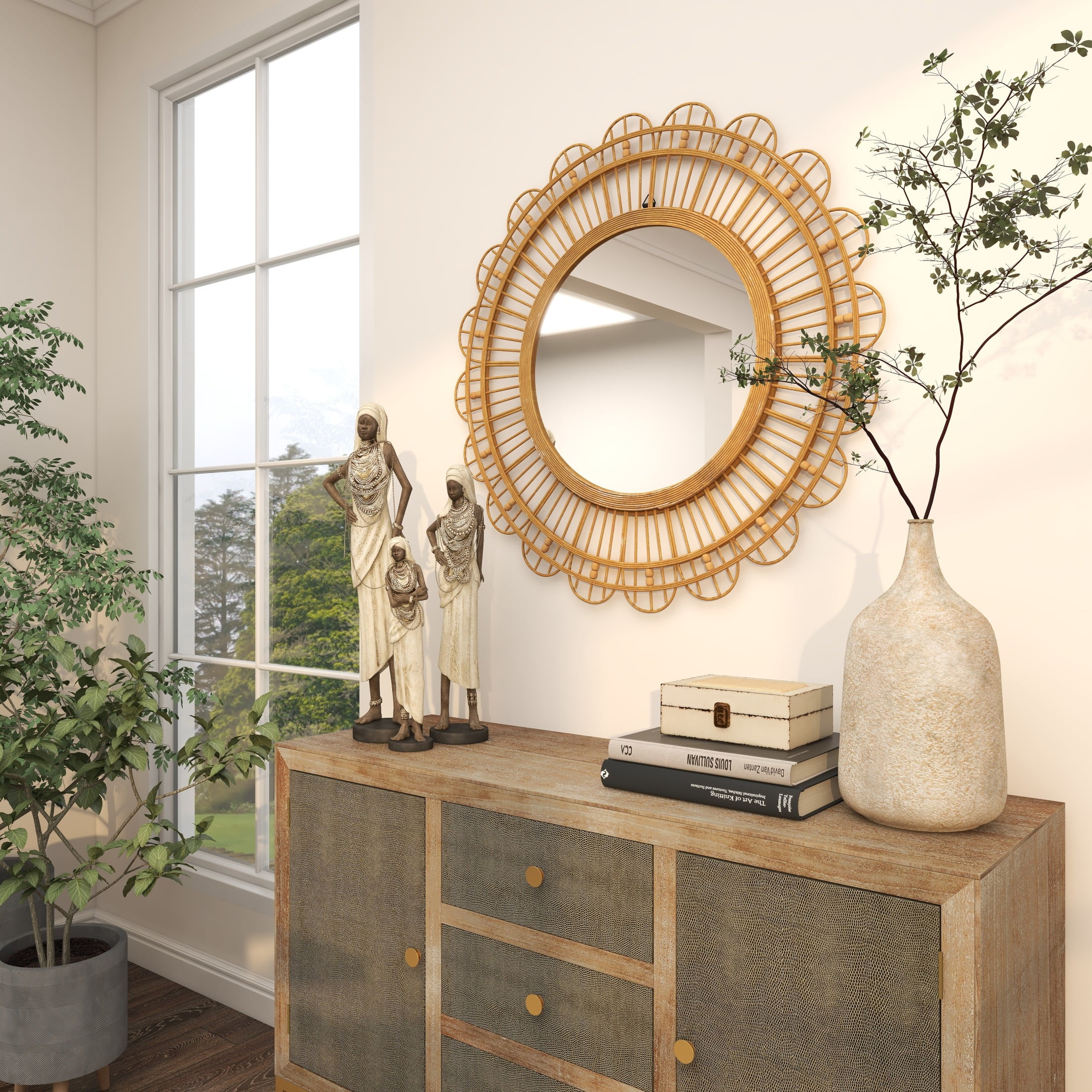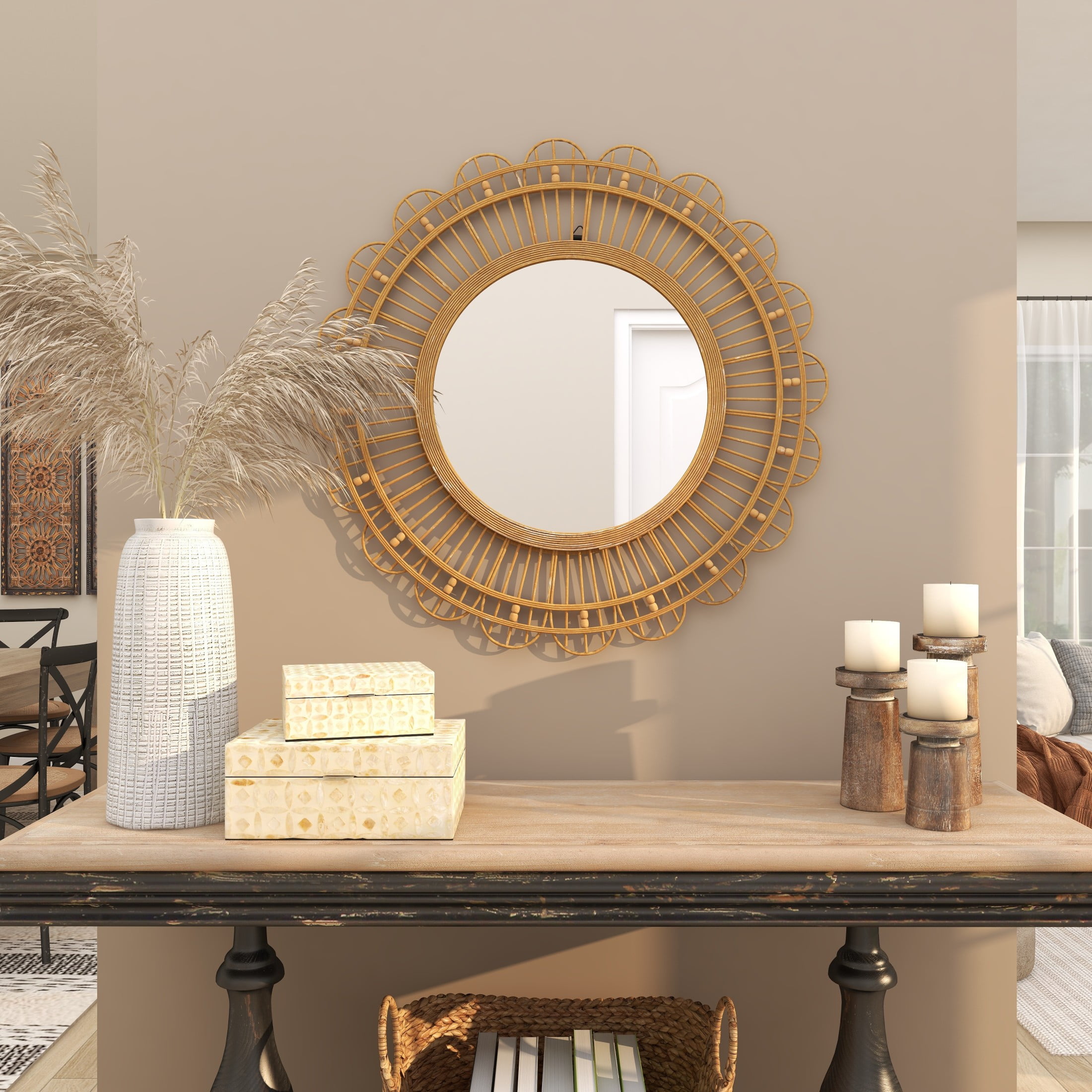 Designed with a free-spirited charm where vibrant hues, eye-catching patterns, and whimsical accents transform your space and showcase your personality The brown room wall mirror is crafted of natural bamboo and quality glass mirror materials with an MDF backing This round hanging wall mirror is furnished with a reflective glass panel and a textured brown bamboo frame This bamboo wall mirror features a unique geometric pattern on its frame, enhancing its distinctive look The brown bamboo wood wall mirror measures 35L x 1W x 35H inches, and weighs 8 lbs The textured brown mirror for wall presents a round shape with woven bamboo and beaded accents on its frame Wipe clean with a dry cloth The bohemian accent wall mirror securely encases the round reflective glass panel within a solid bamboo frame Bohemian style DecMode 35″ x 35″ Brown Handmade Woven Floral Wall Mirror with Beaded Accents makes a perfect addition to any home