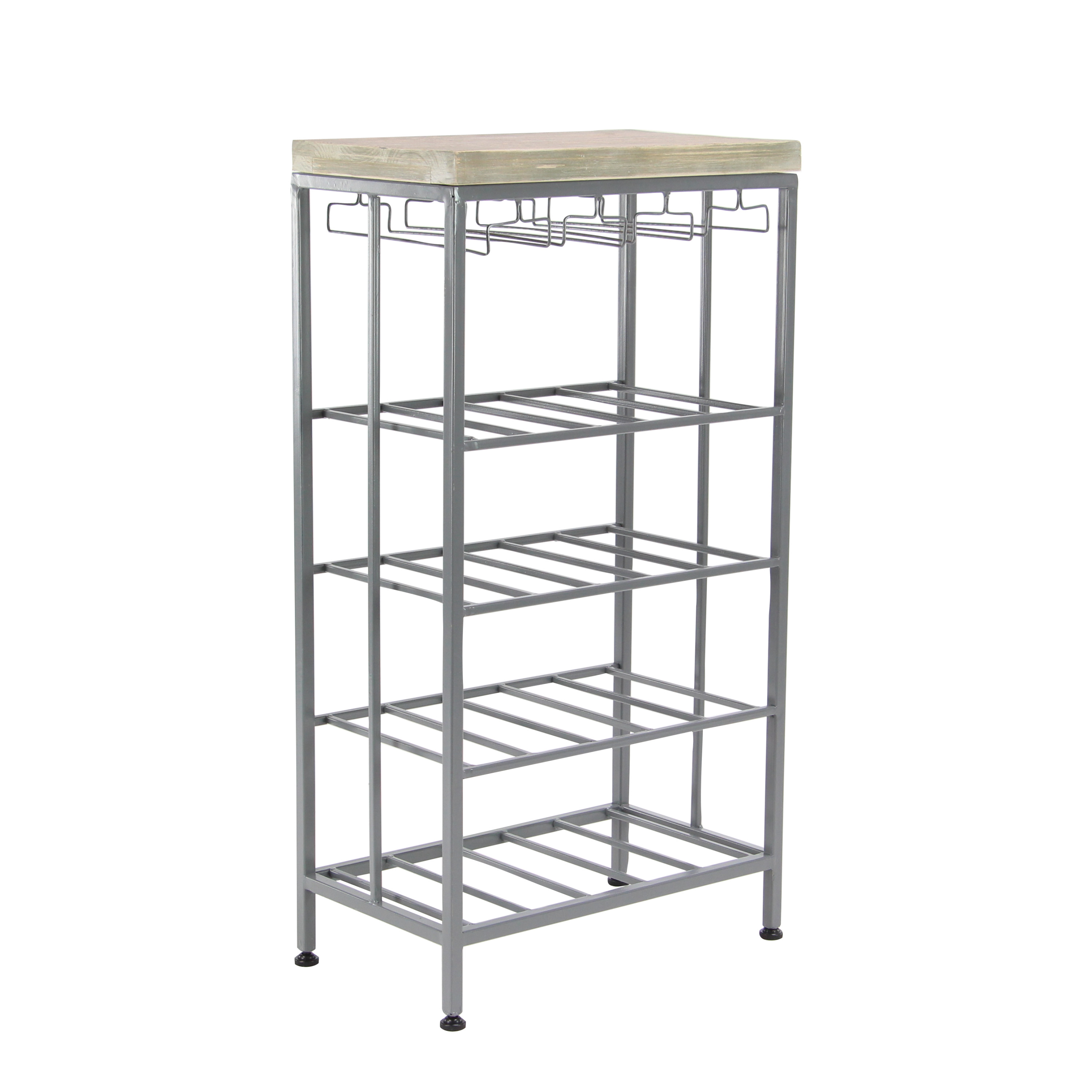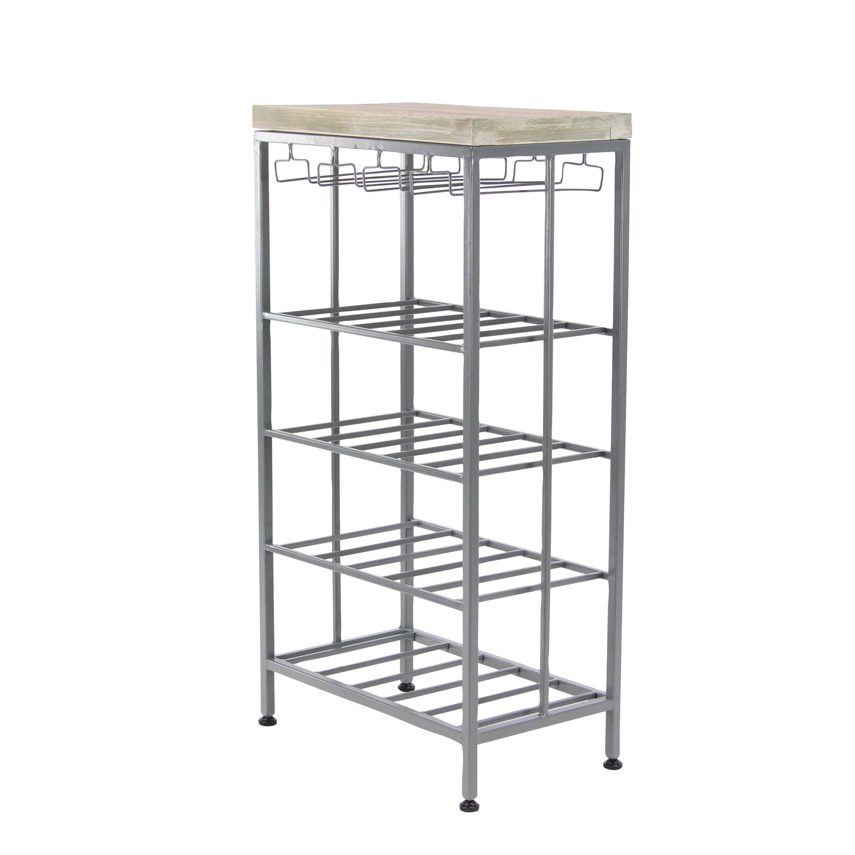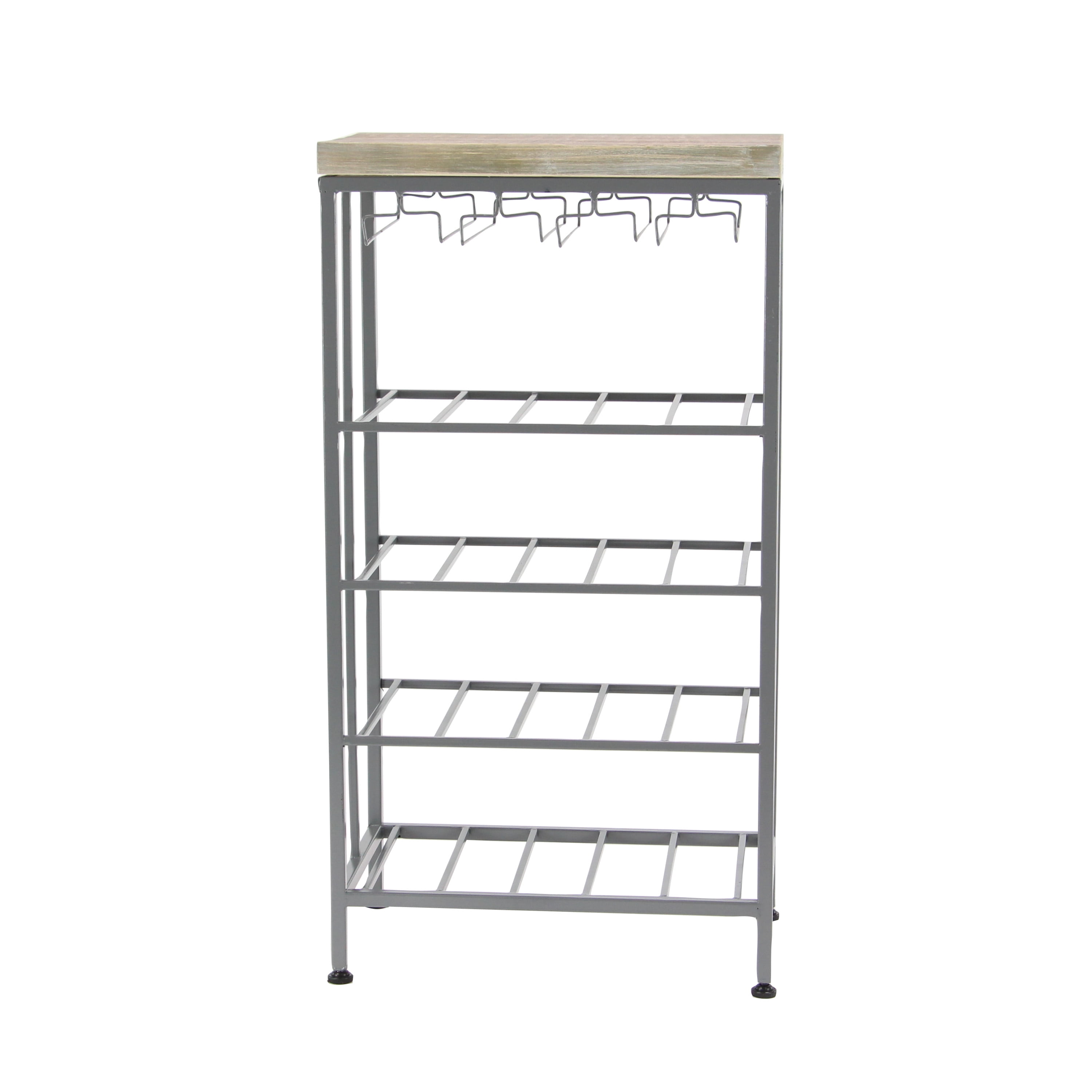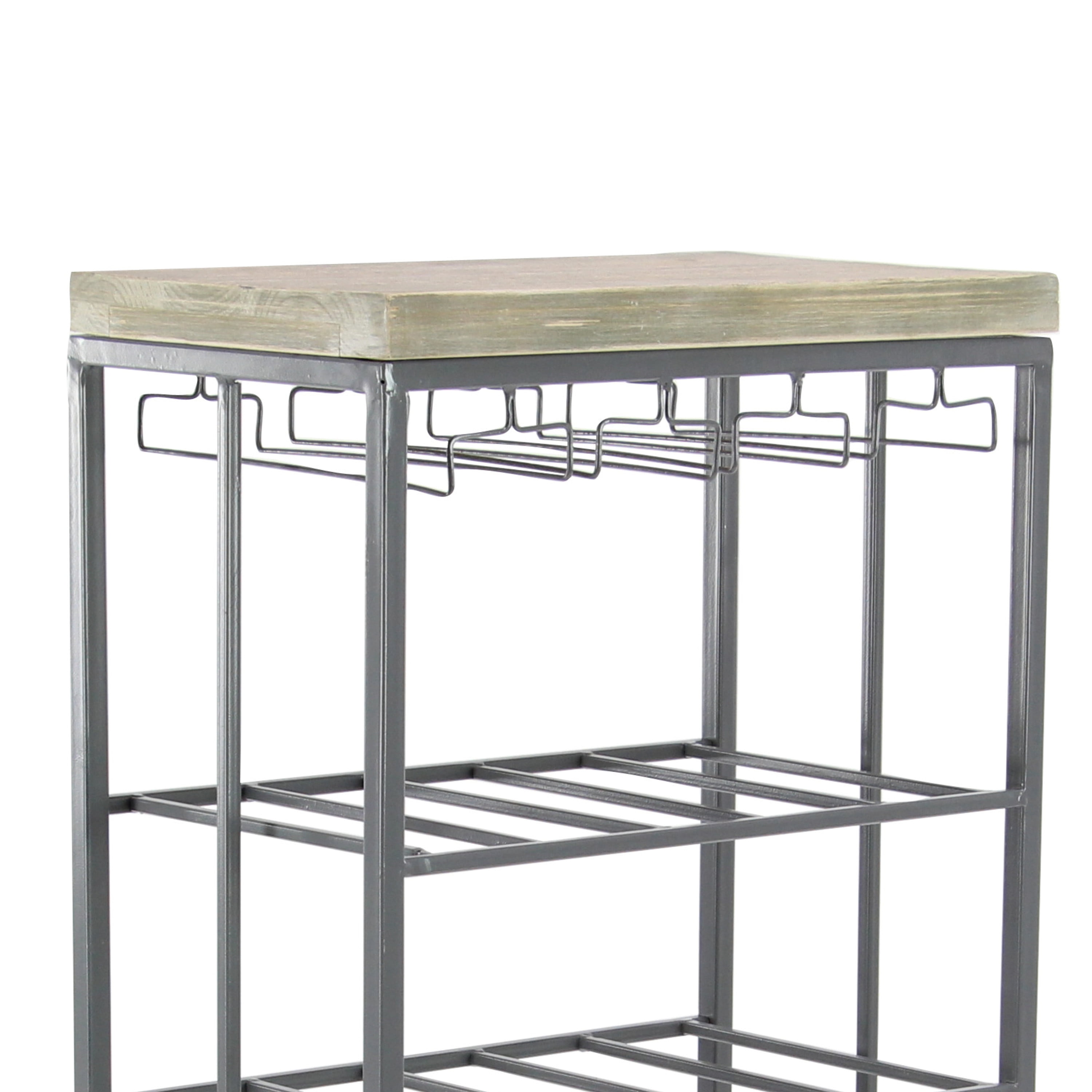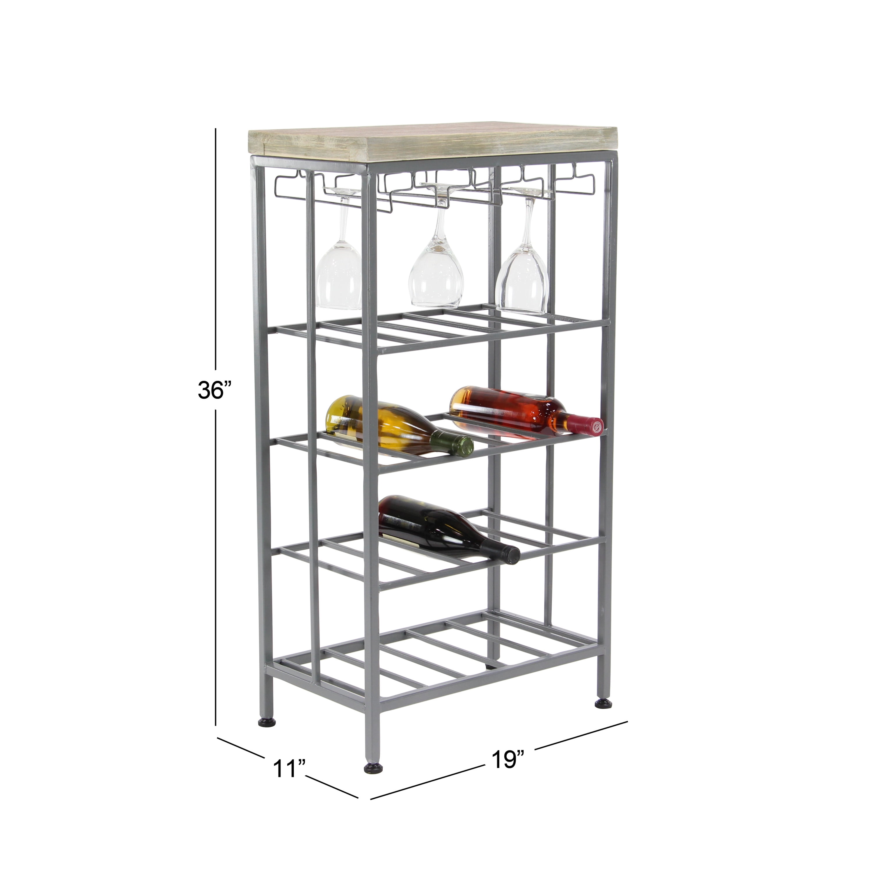 Ideal decor that works best in contemporary themed homes This corner wine rack is crafted from wood and metal, lending it a durable design This metal wine rack has a gray and soft brown color palette that’s perfect for contemporary spaces This wine rack features dangling wine glass holders and four shelves that will hold up to 15 bottles This item measures 19”L x 11”W x 36”H; weight: 13.26 lbs An accent furniture featuring a wine storage with rectangular shelves for wine bottles and hanger-shaped rack for glassware Wipe clean with a dry cloth Black rectangular wine storage is crafted with welded metal frames and mounted wooden top Contemporary style DecMode 36″ x 19″ Grey Metal Contemporary Wine Rack makes a perfect addition to any home
