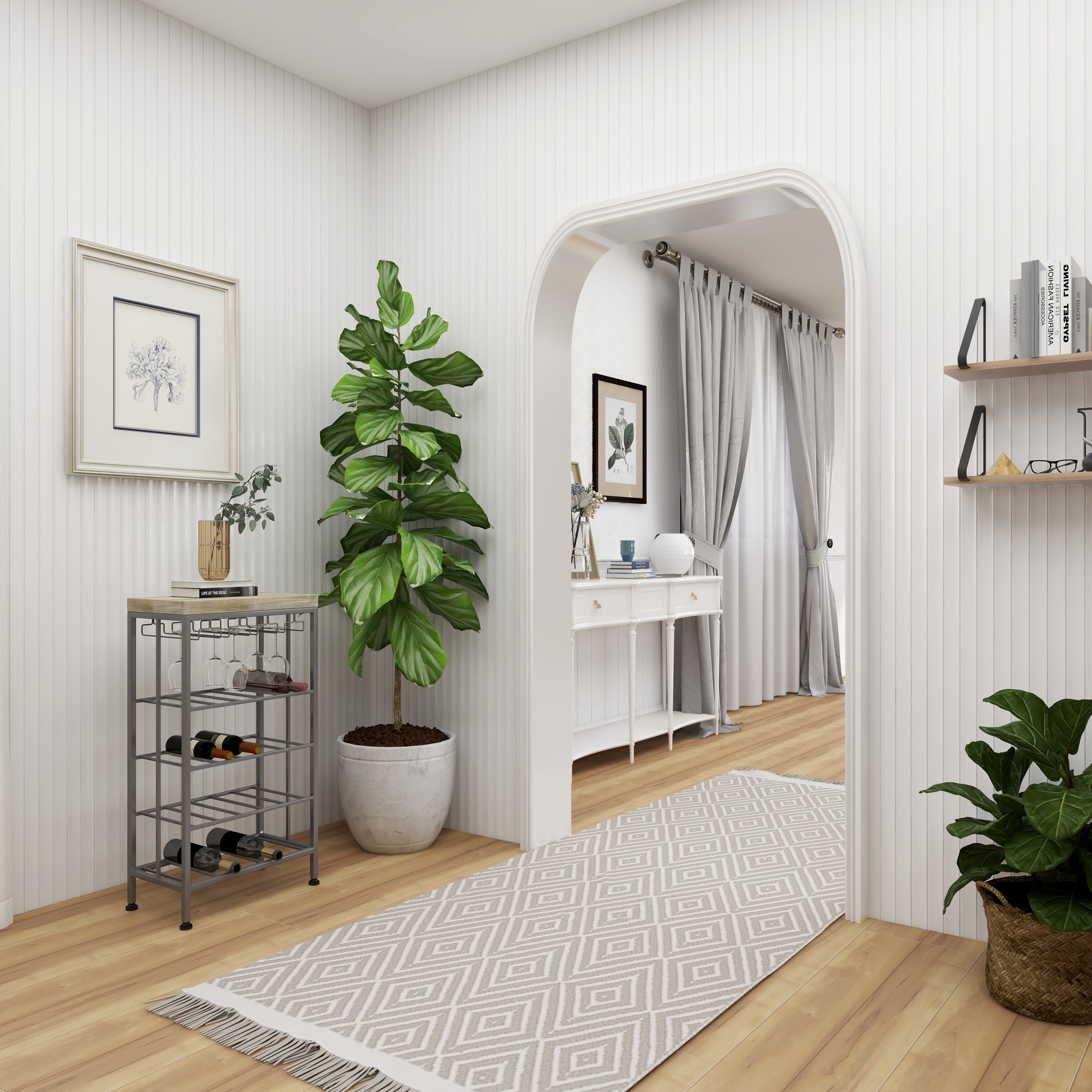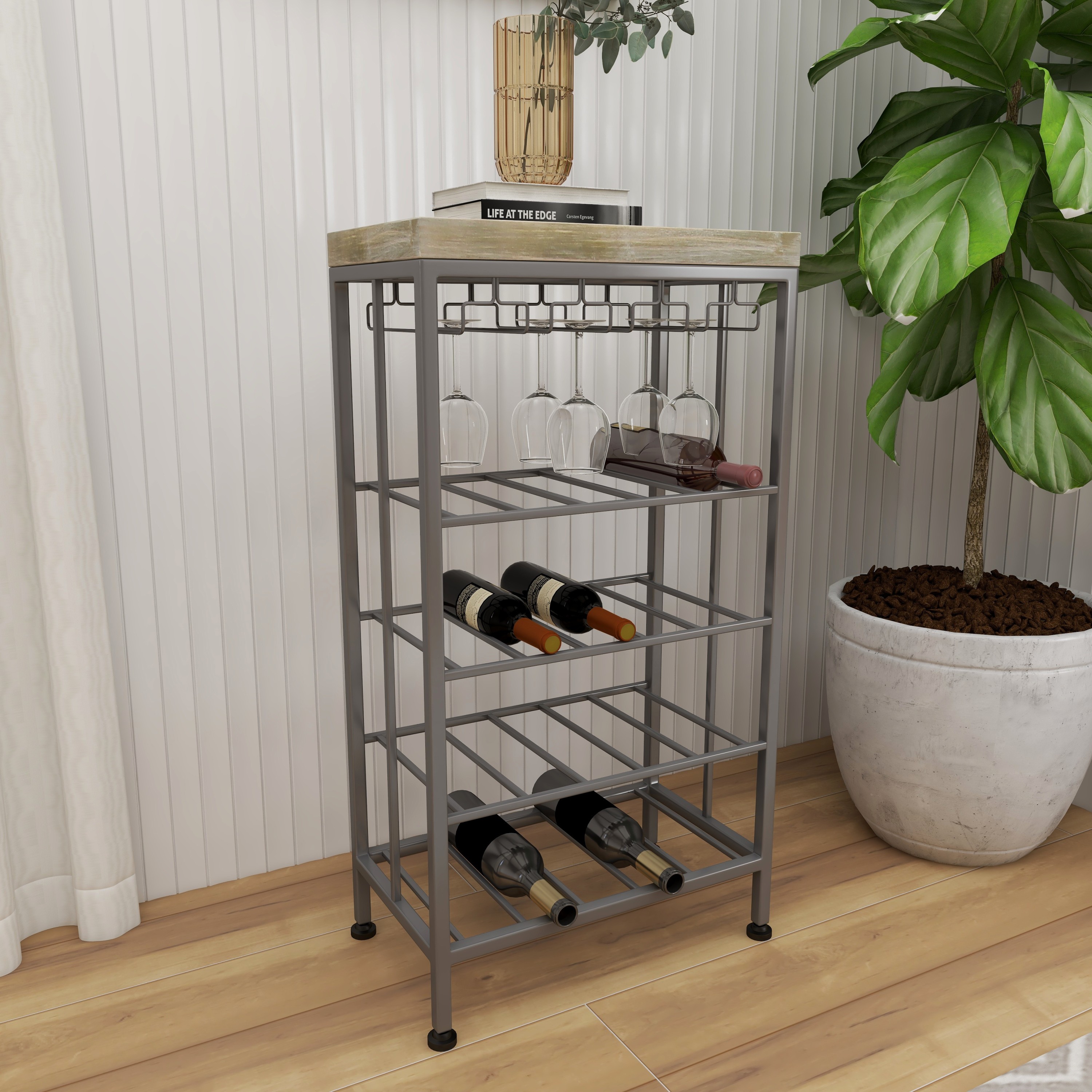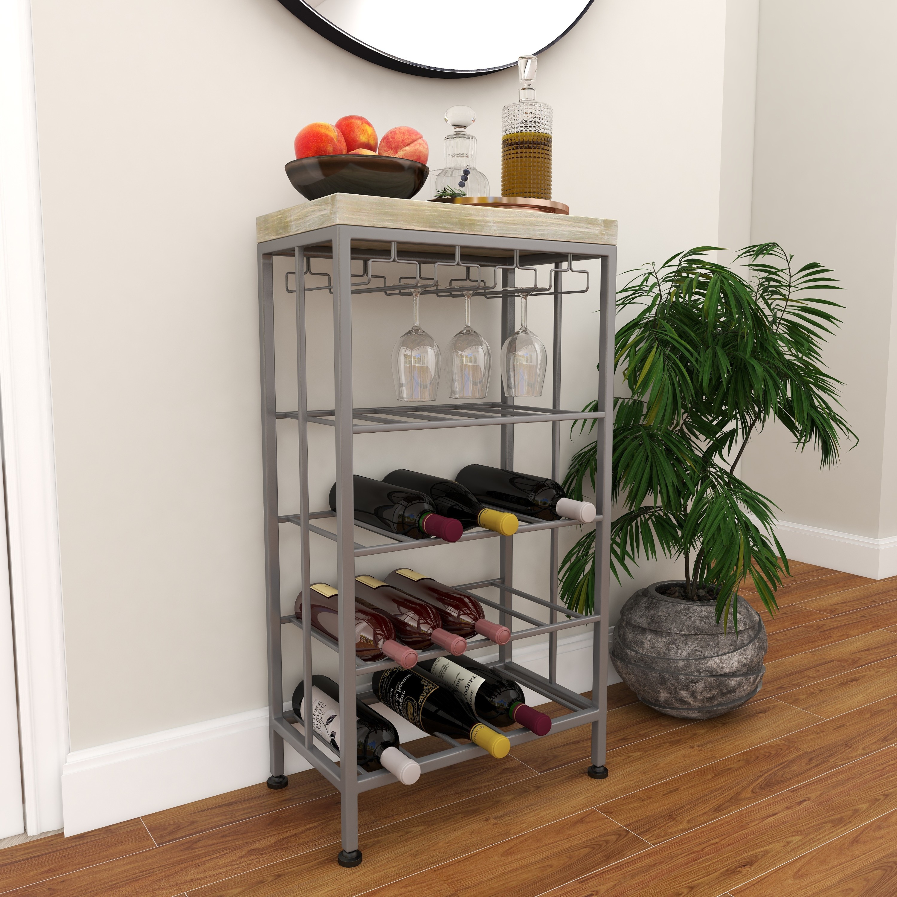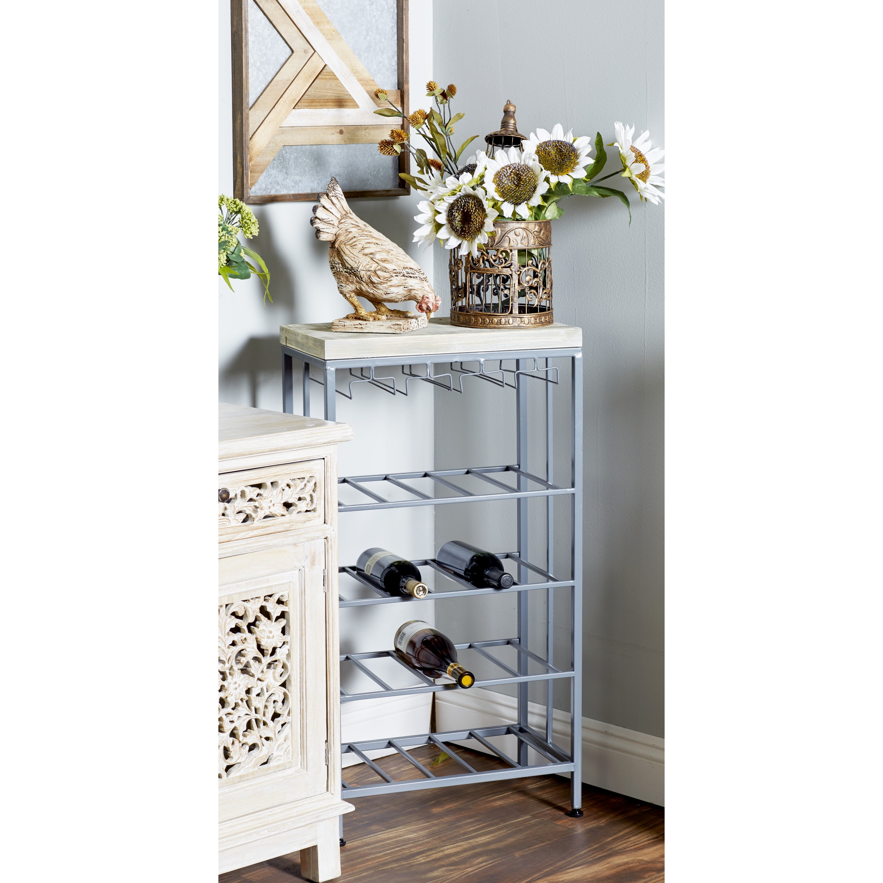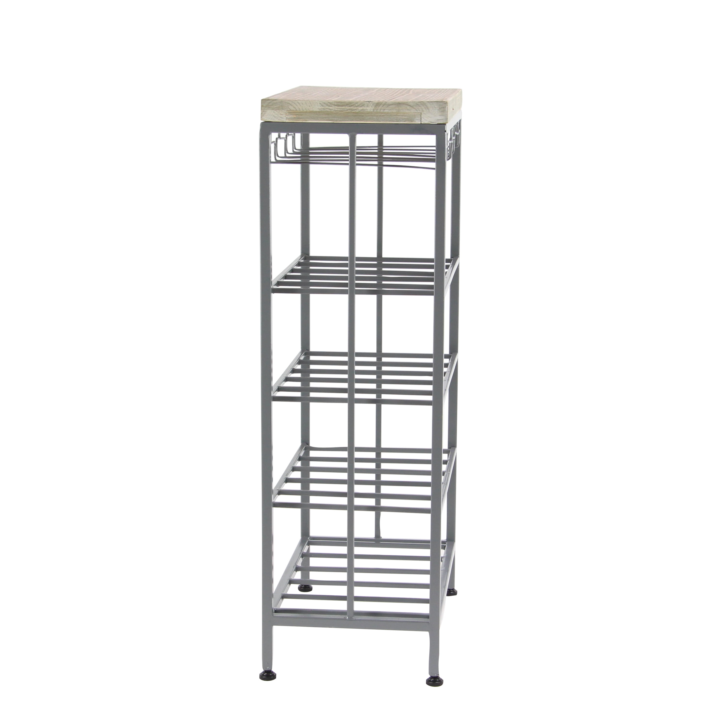 Ideal decor that works best in contemporary themed homes This corner wine rack is crafted from wood and metal, lending it a durable design This metal wine rack has a gray and soft brown color palette that’s perfect for contemporary spaces This wine rack features dangling wine glass holders and four shelves that will hold up to 15 bottles This item measures 19”L x 11”W x 36”H; weight: 13.26 lbs An accent furniture featuring a wine storage with rectangular shelves for wine bottles and hanger-shaped rack for glassware Wipe clean with a dry cloth Black rectangular wine storage is crafted with welded metal frames and mounted wooden top Contemporary style DecMode 36″ x 19″ Grey Metal Contemporary Wine Rack makes a perfect addition to any home