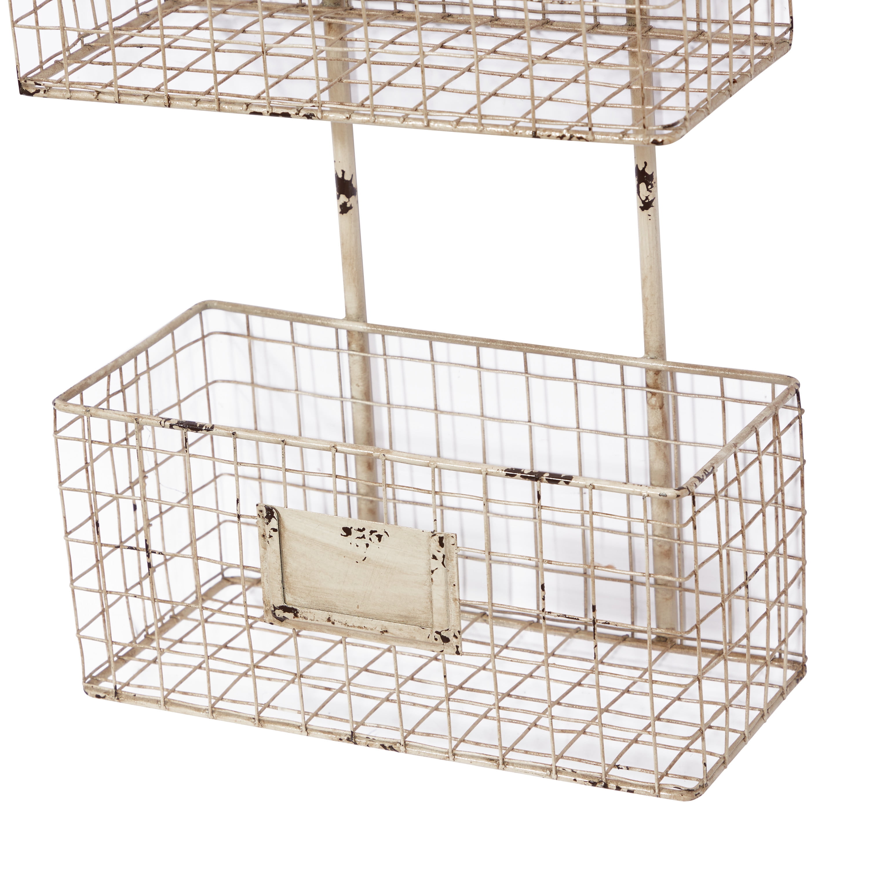 Infuse your home with cozy charm, where weathered textures, rustic finishes, and warm earthy tones create a wholesome atmosphere Wall mounted shelf is crafted with iron material Farmhouse basket shelf highlights a distressed white overall finish Features a 3-tier basket system design for more storage space This item measures 12.5L x 6.5W x 36.5H inches, and weighs 4.84 lbs This farmhouse wall organizer accentuates a rectangular figure with baskets as shelves Wipe clean with a dry cloth Iron is bent and welded to form this wire basket shelf Farmhouse style DecMode 37″ White Metal 3 Hanging Baskets Magazine Rack Holder makes a perfect addition to any home