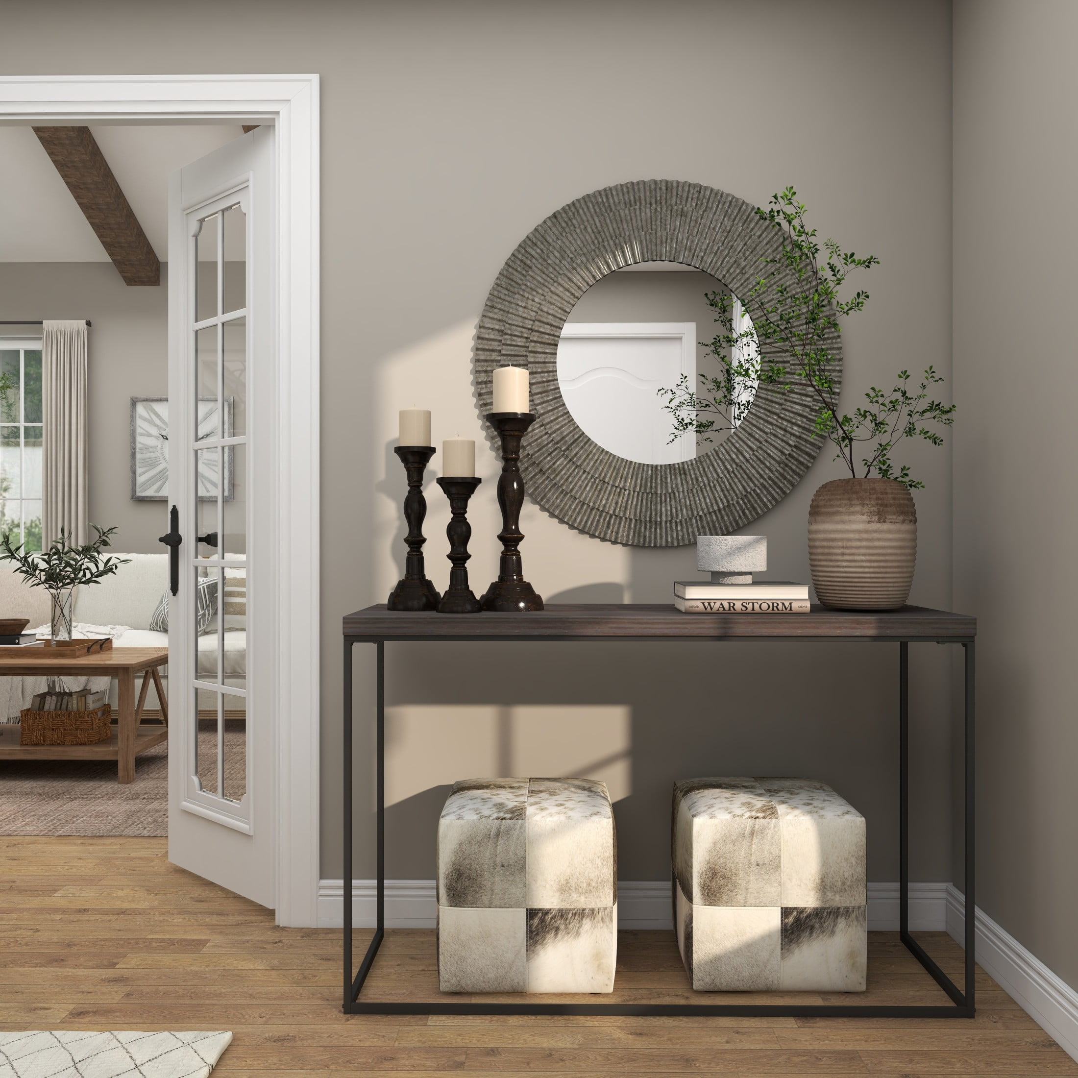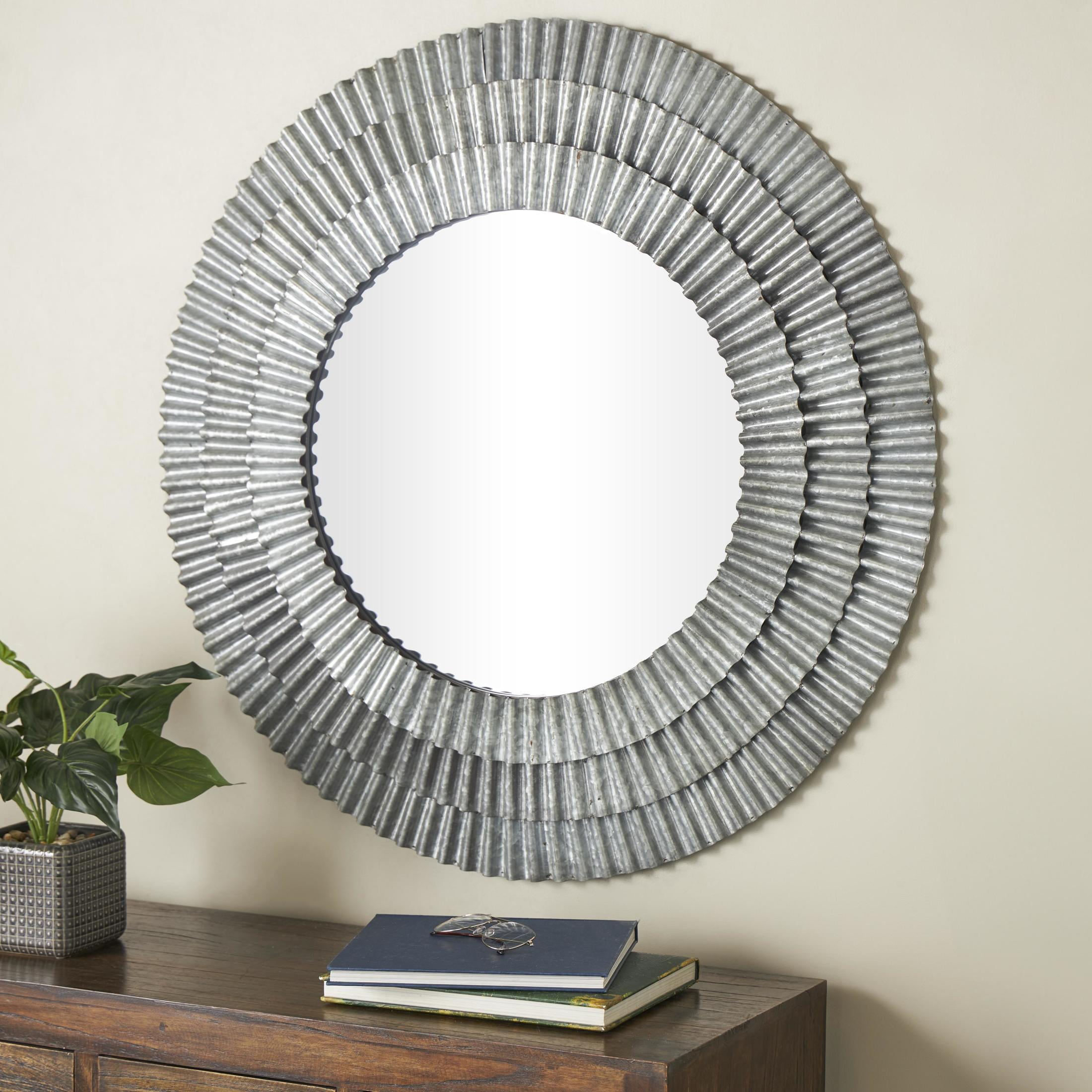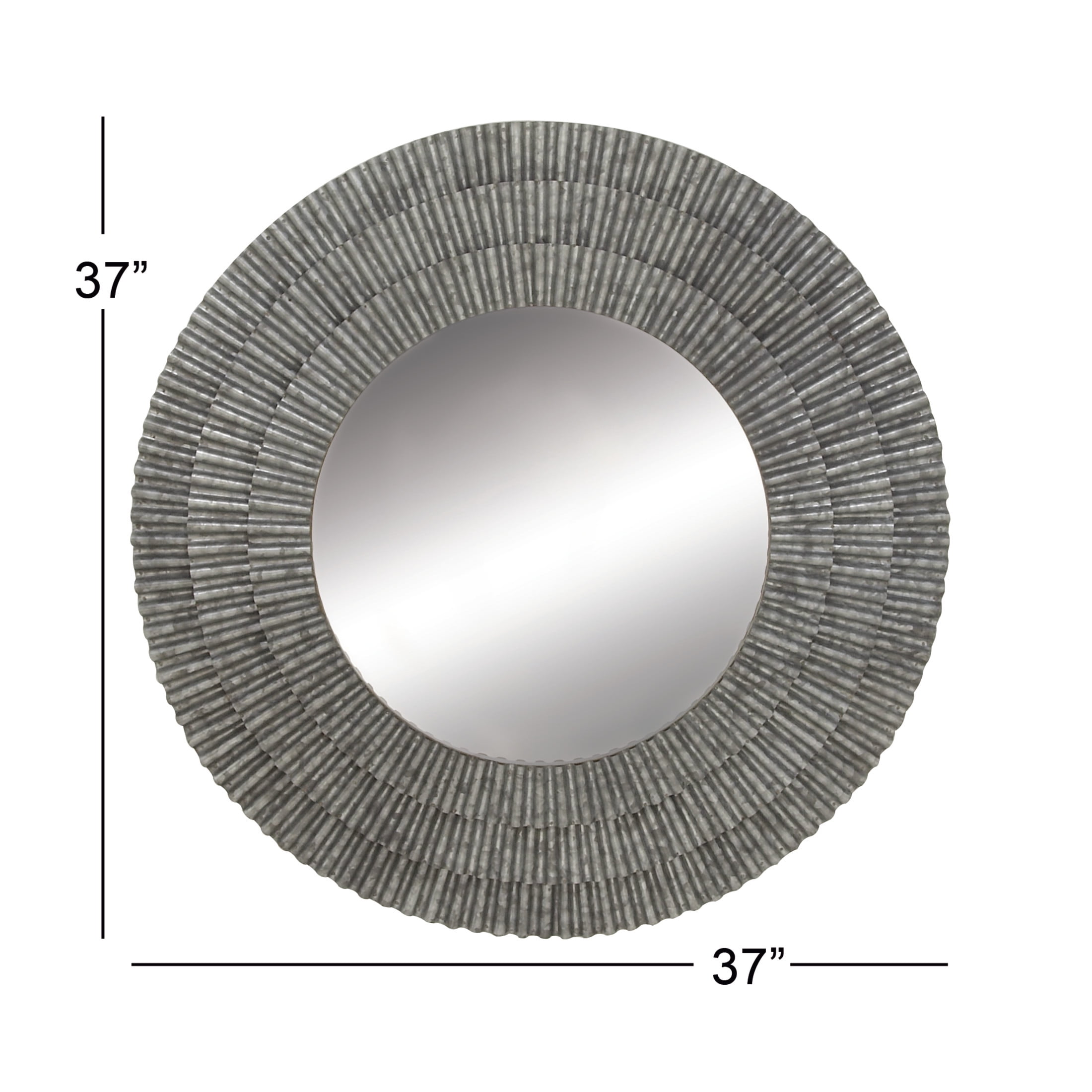 Infuse your home with cozy charm, where weathered textures, rustic finishes, and warm earthy tones create a wholesome atmosphere This gray room wall mirror is crafted with a galvanized iron frame and mirror center with an MDF backing This round hanging wall mirror decor highlights a gray galvanized overall finish with subtle variations Designed with a three-layered corrugated metal frame, the iron wall mirror features a large round reflective glass panel The gray metal wall mirror measures 36.70L x 1.70W x 36.70H inches, and weighs 11 lbs This galvanized gray mirror for wall accentuates a round shape with a ribbing pattern for added visual interest Wipe clean with a dry cloth The welded iron frame of this farmhouse accent wall mirror encloses the glass, with an MDF backing for durability Farmhouse style DecMode 37″ x 37″ Gray Wall Mirror makes a perfect addition to any home