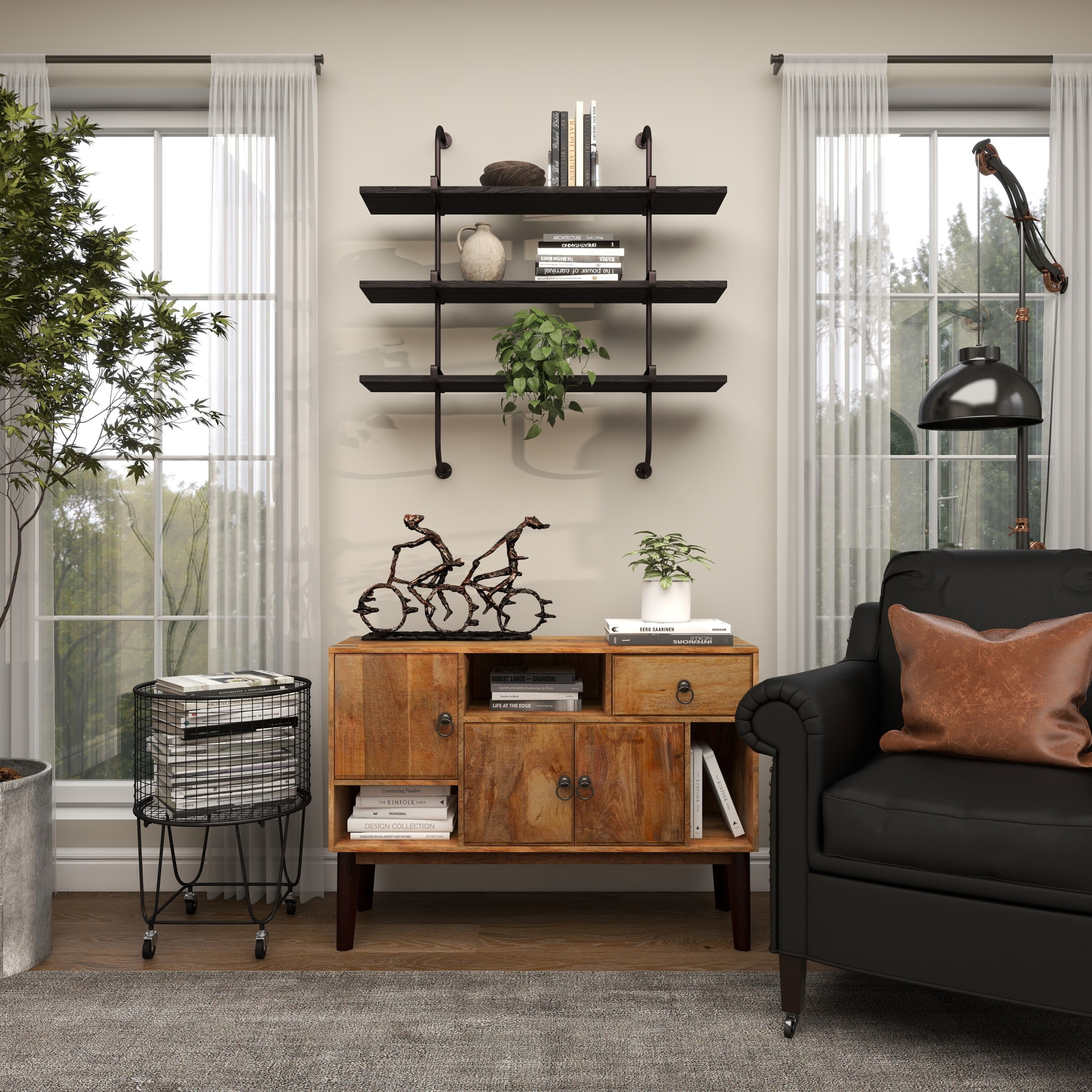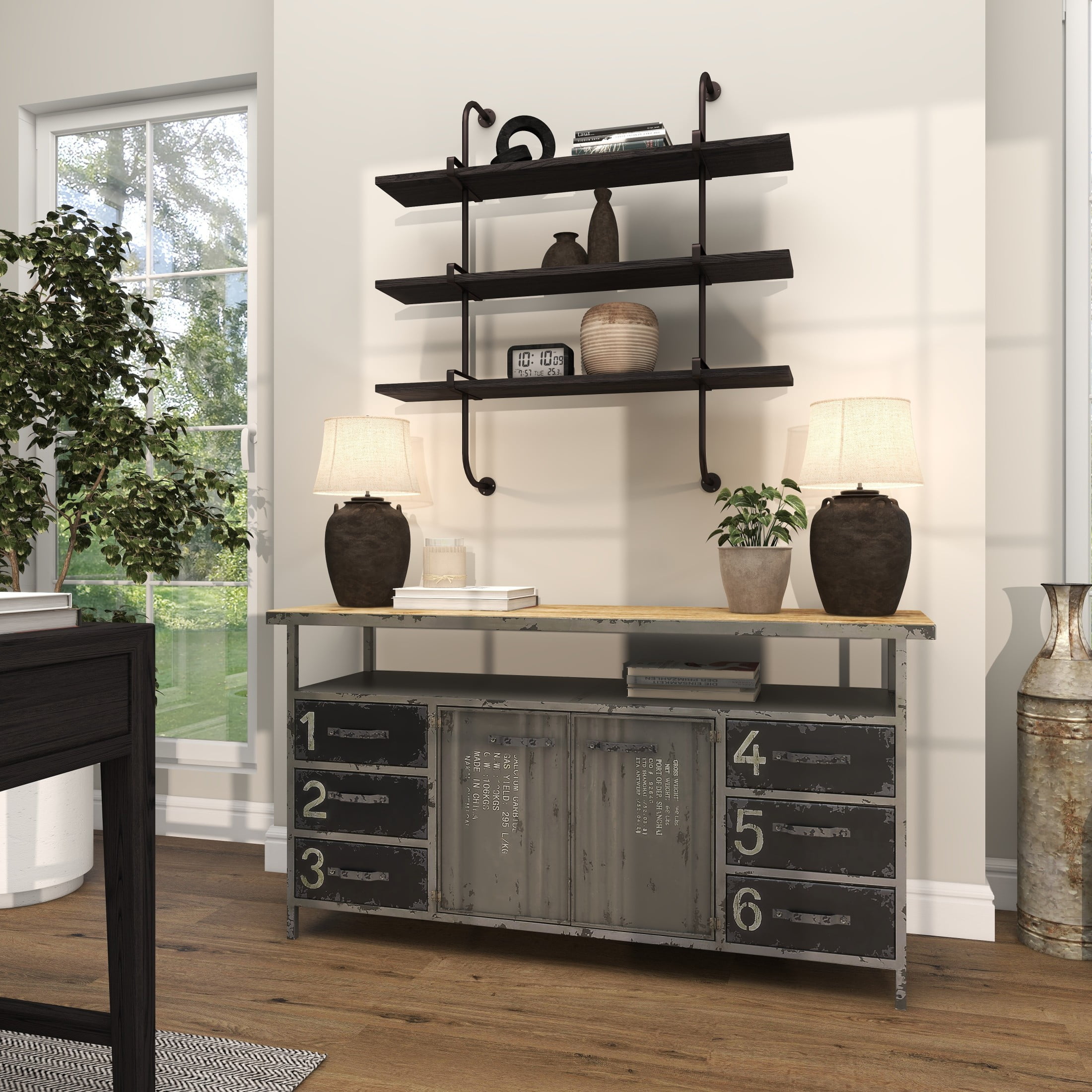 DecMode 38″ x 10″ 3-Tier Gray Wall Shelf with Black Metal Brackets is a unique addition to your stylish home. Enhance your industrial-themed living room or bedroom by organizing and decorating with this gray floating shelf, adding both style and function to your home. This item ships in 1 carton. Can be hung vertically using the holes; nails and screws not included. Suitable for indoor use only. Some assembly required. Maximum weight limit is 20 lbs. This is a single gray colored floating shelf. Wood wall shelf features 3 fixed shelves. Industrial style.