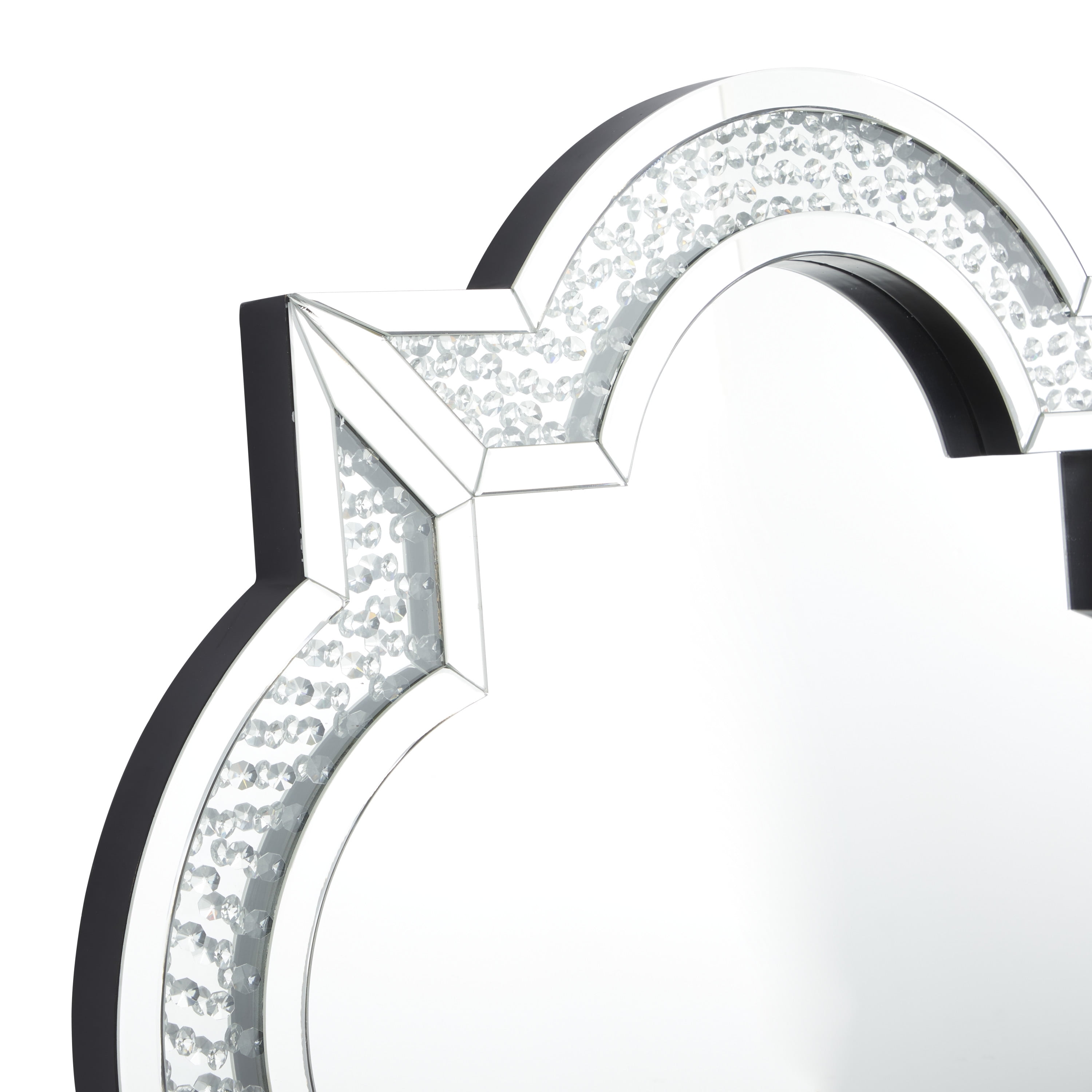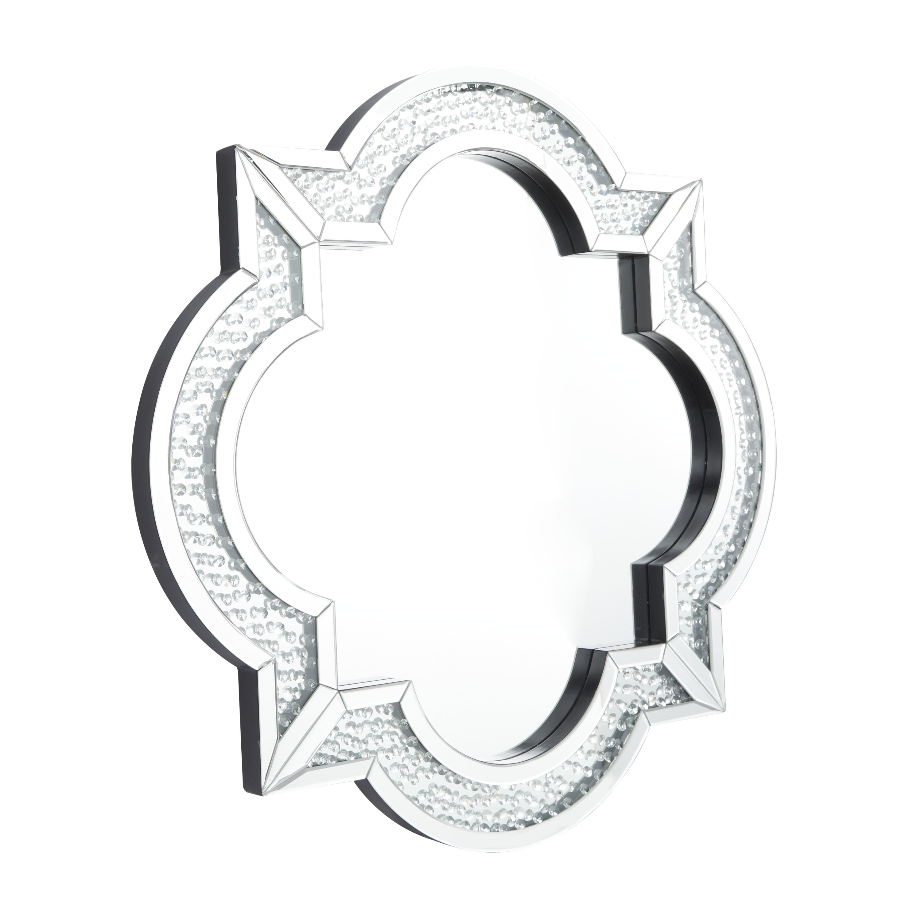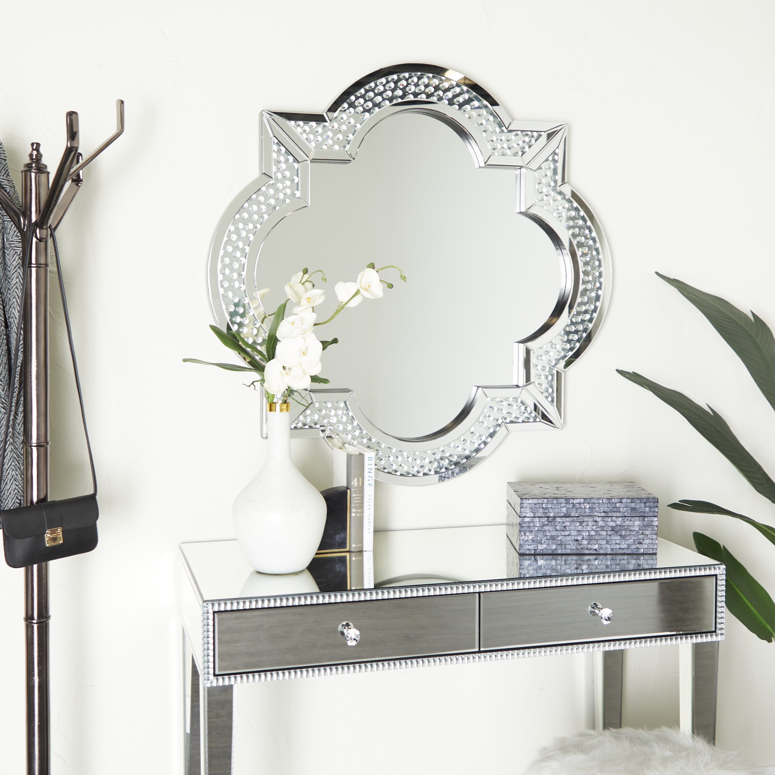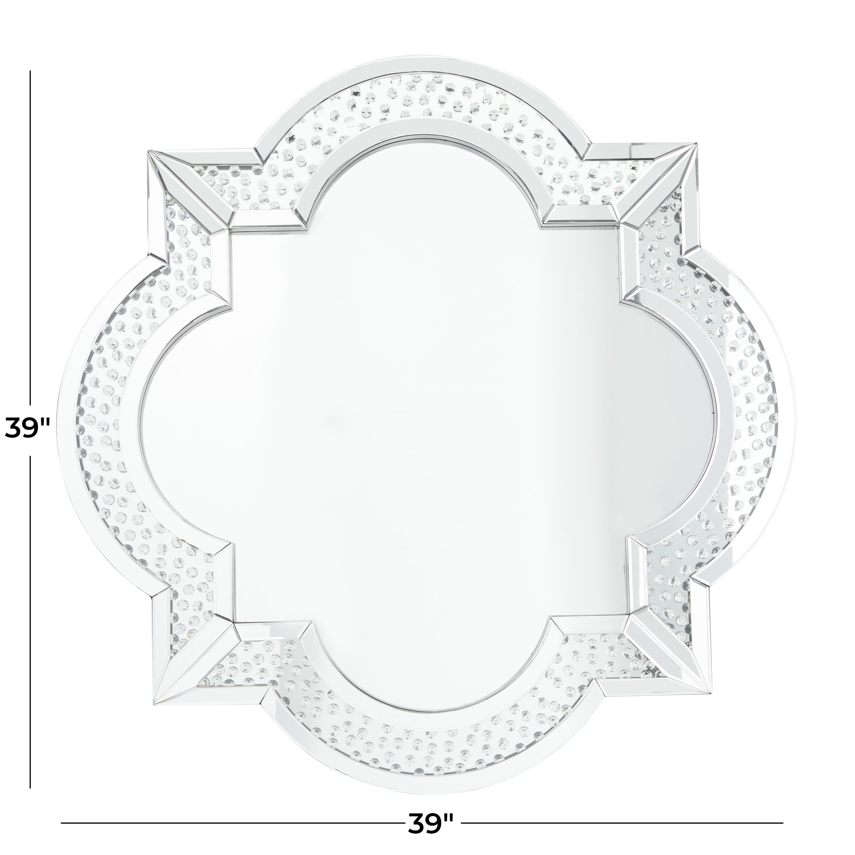Indulge in the glamorous luxury of plush textures, dazzling details, and sleek finishes to elevate your home and add a sophisticated flair This silver quatrefoil wall mirror is made of robust wood and mdf and glass that can stand the test of time Our glass and wood decorative mirror highlights a silver frame and a reflective glass mirror A glam style accent piece featuring a quatrefoil frame with crystal embellishments and a reflective glass mirror The wall mirror measures 39.25L x 1.88W x 39.25H inches, and weighs 44 lbs This silver decorative mirror accentuates a quatrefoil shape and round crystal accents Wipe clean with a dry cloth The reflective mirror is securely encased in the wooden frame embellished with crystal details Glam style DecMode 39″ x 39″ Silver Quatrefoil Wall Mirror makes a perfect addition to any home