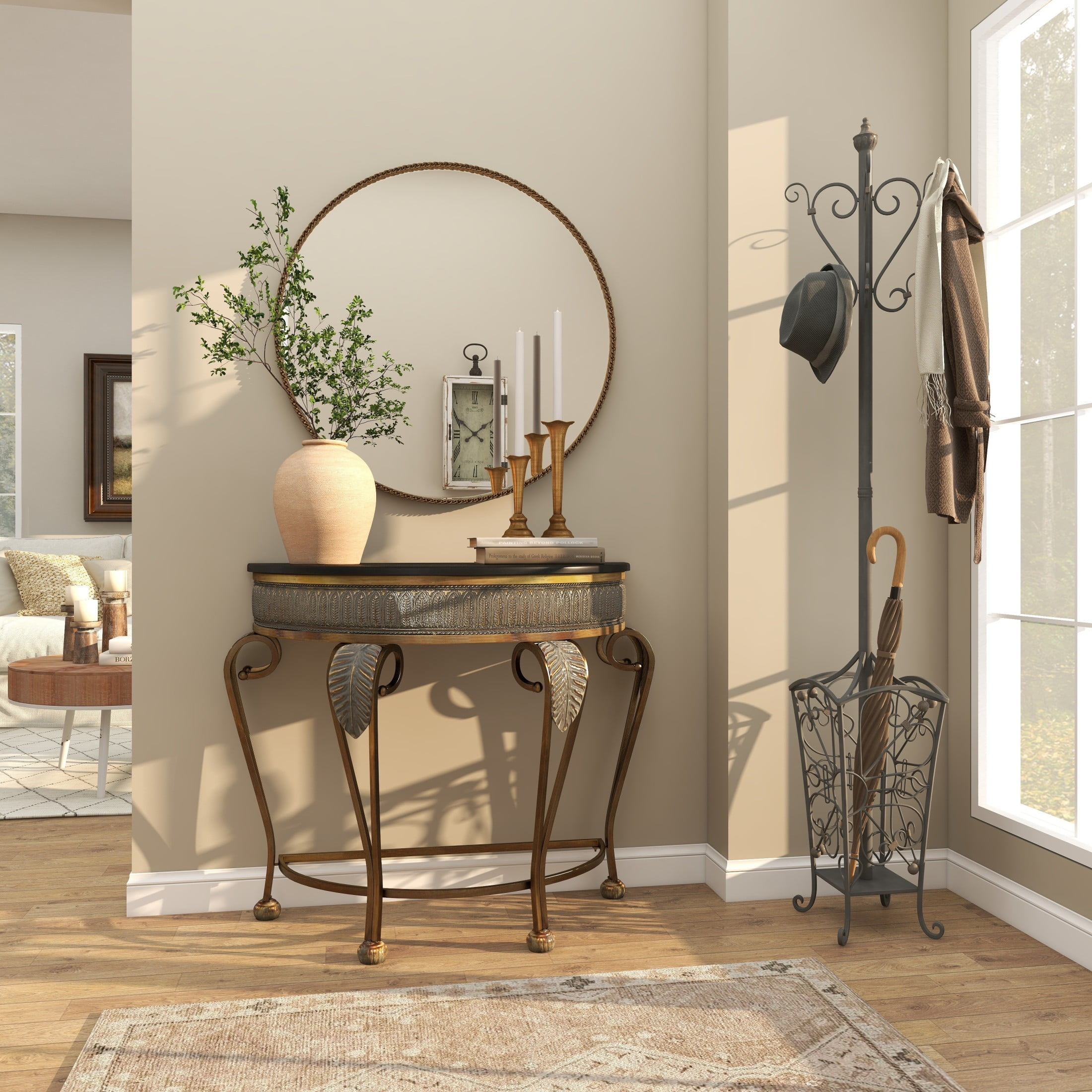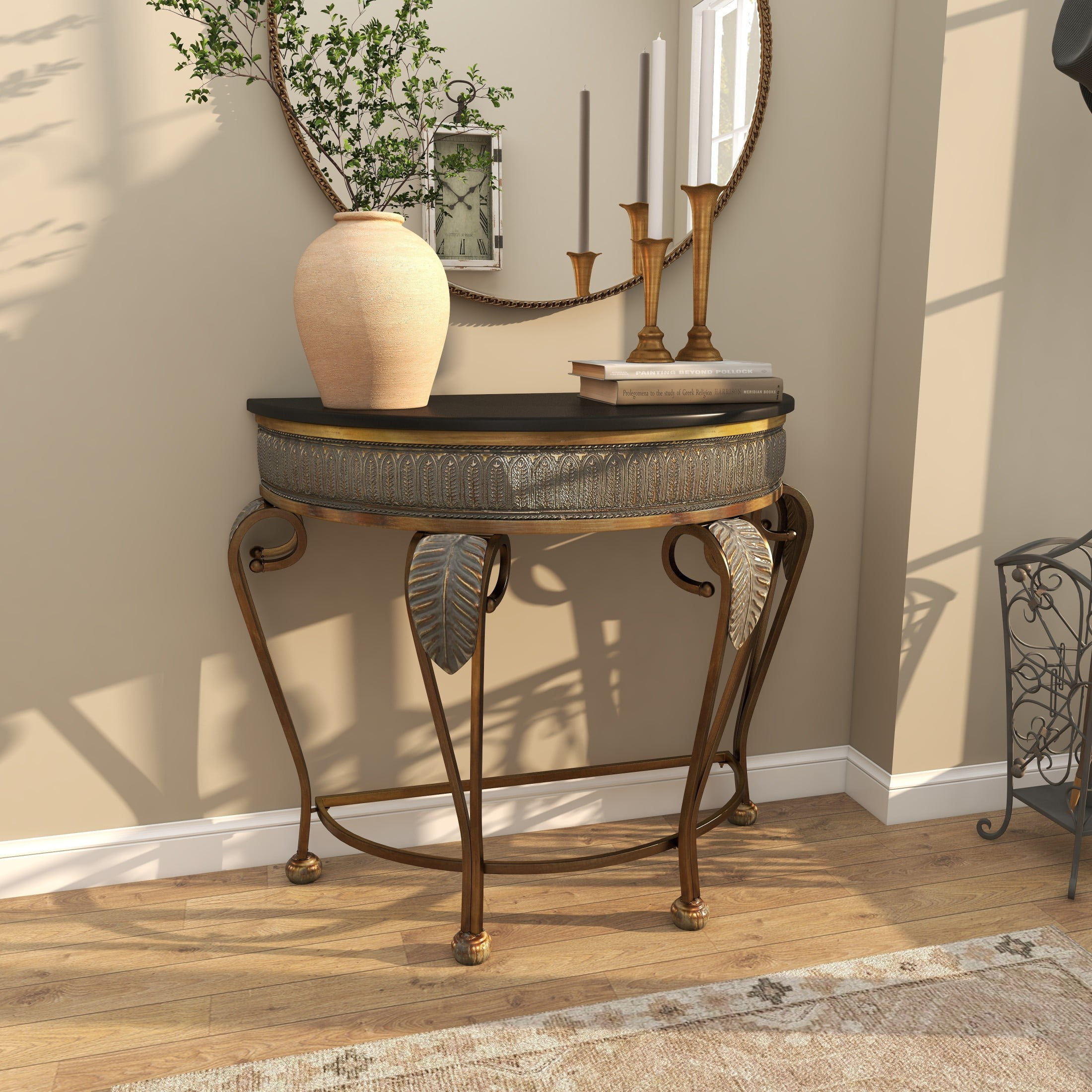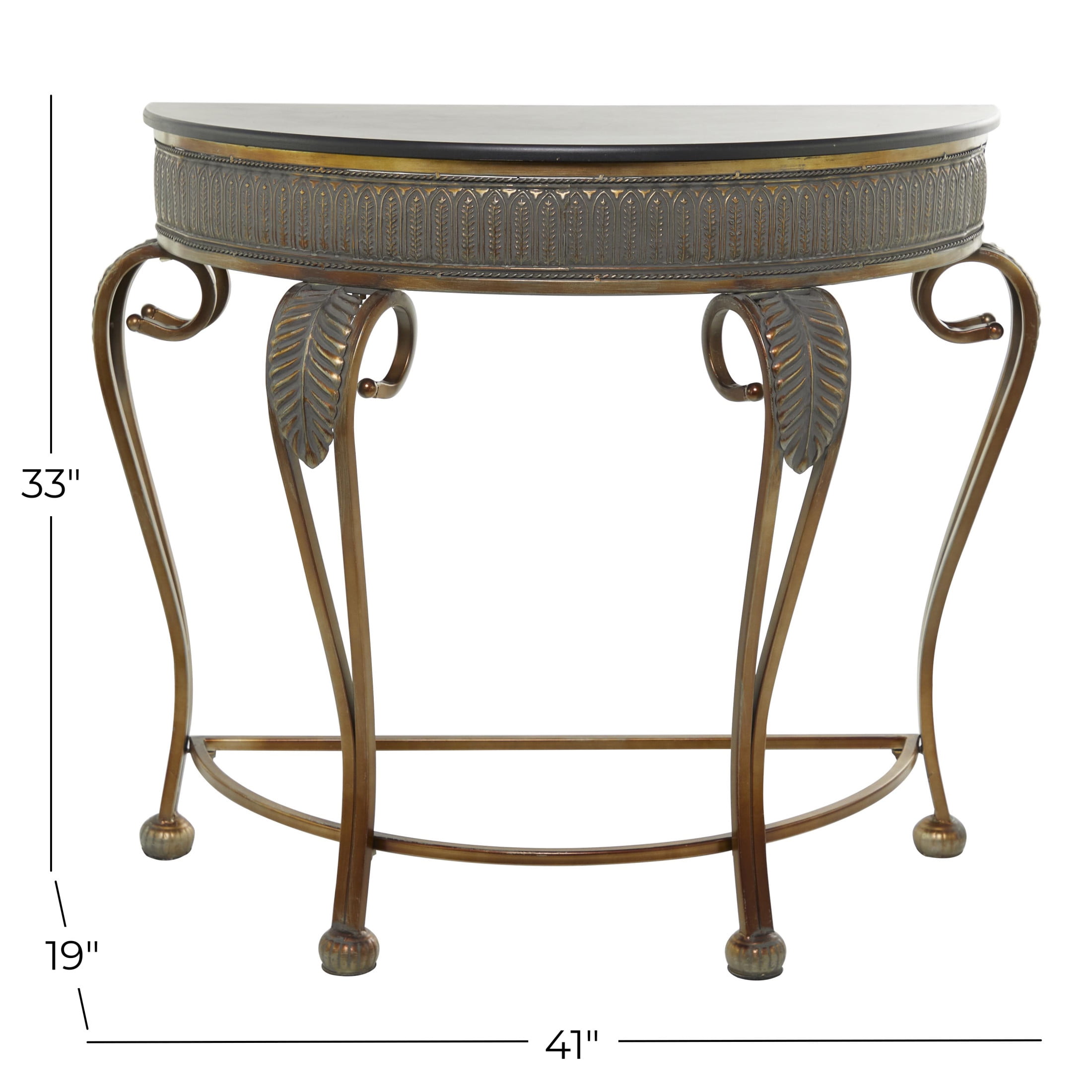 Inspired by sleek elegance and clean lines, a minimalistic design offers effortless luxury with monochromatic tones and bold, angular structures The gold living room console table is crafted entirely from iron, ensuring durability and elegance Half-moon living room furniture showcases a polished gold finish with bronze accents, creating a luxurious and striking contrast against the black tabletop This iron console table boasts an hourglass silhouette with scrolled legs adorned with embossed leaf detailing, complemented by a solid black top The gold metal console table measures 41L x 19W x 33H inches, and weighs 22.0 lbs Polished gold home table showcases a half-moon profile with arched side carvings and intricate golden leaf details on its scrolled legs Wipe clean with a dry cloth Modern home console table is constructed using meticulously carved and welded iron materials for a robust yet refined design Modern style DecMode 41″ x 33″ Gold Metal Embossed Leaf Console Table with Ornate Scroll Legs, 1-Piece makes a perfect addition to any home