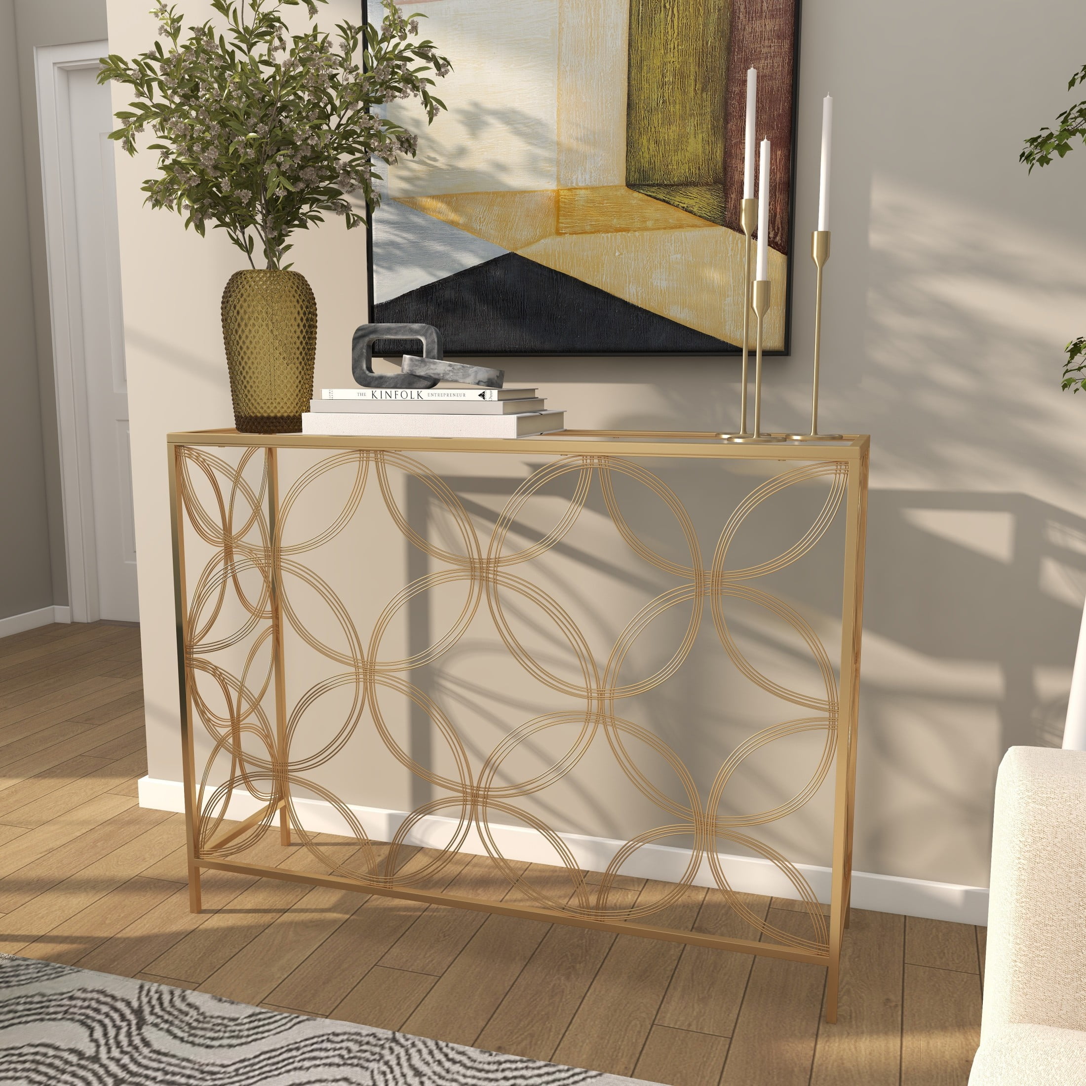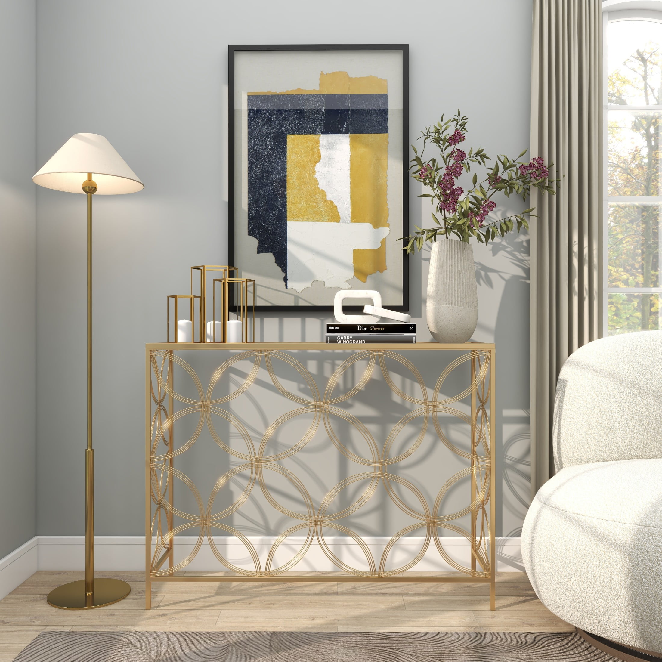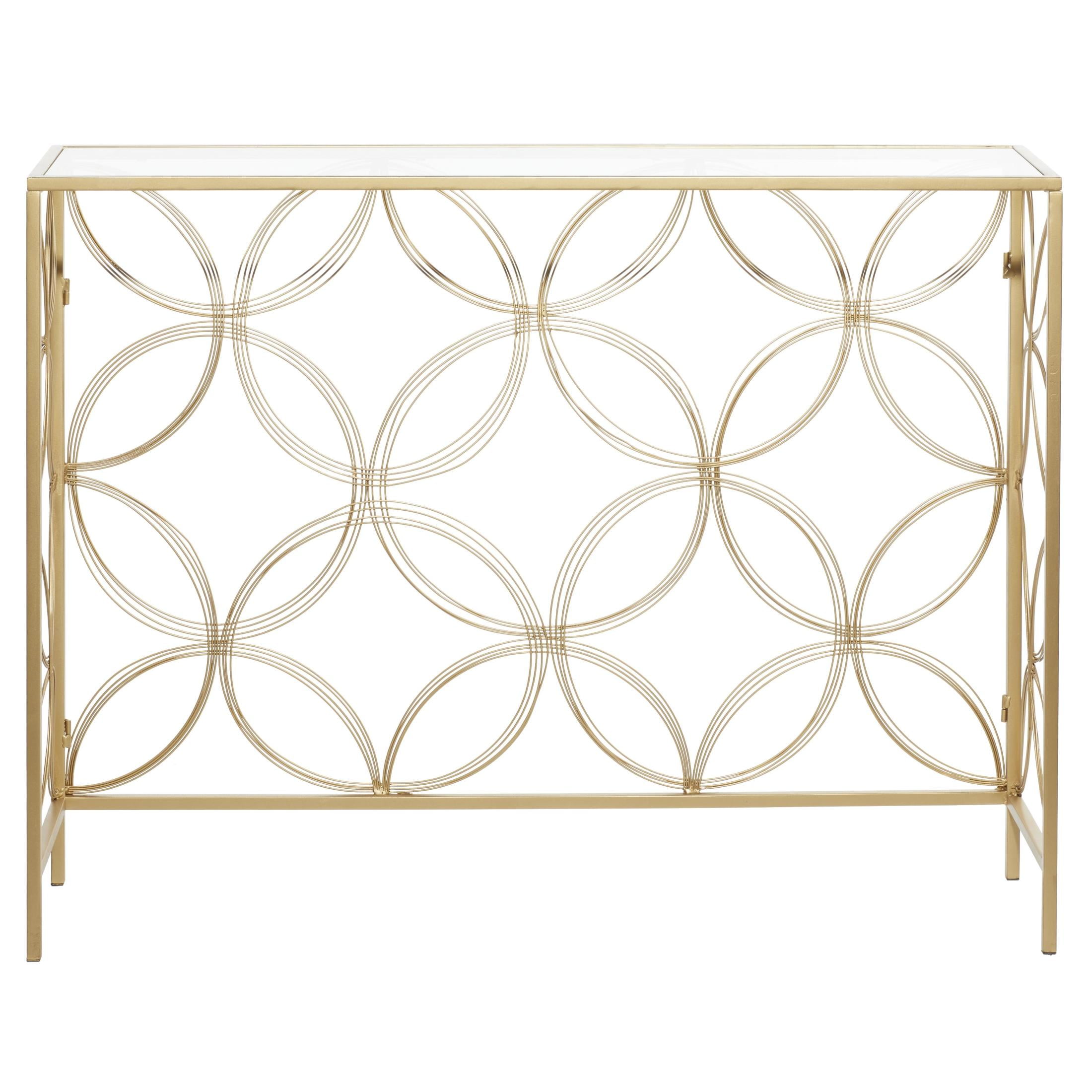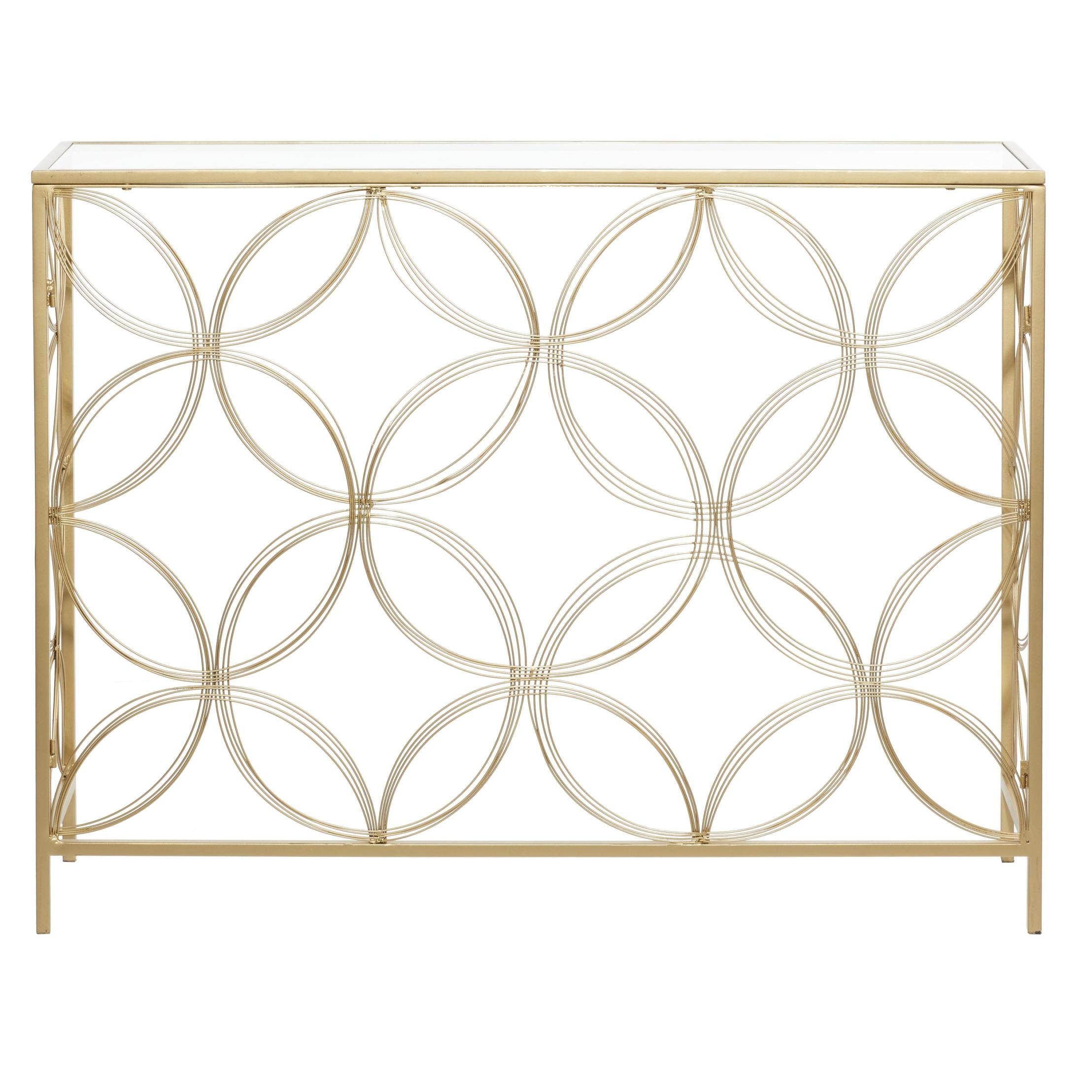 Embrace artistic expression with a style that highlights bold designs with sleek lines, neutral elements, and a minimalist aesthetic Glass surface is supported by an cylindrical iron base with a lattice design Metal and glass console table showcases a metallic gold finish creating a stunning distressed look, which is achieved through the intricate placement of thin foil flakes Metal gold console table has a rectangle glass surface with floral metal structure in an open style frame The console table measures 42L x 12W x 32H inches, and weighs 22.50 lbs Rectangular gold table features clear glass top and floral base structure Wipe clean with a dry cloth Gold glamorous side table has an open construction made of welded metal and securely attached clear glass top Contemporary style DecMode 42″ x 32″ Gold Metal Open Style Quatrefoil Frame Geometric Console Table with Mirrored Top, 1-Piece makes a perfect addition to any home