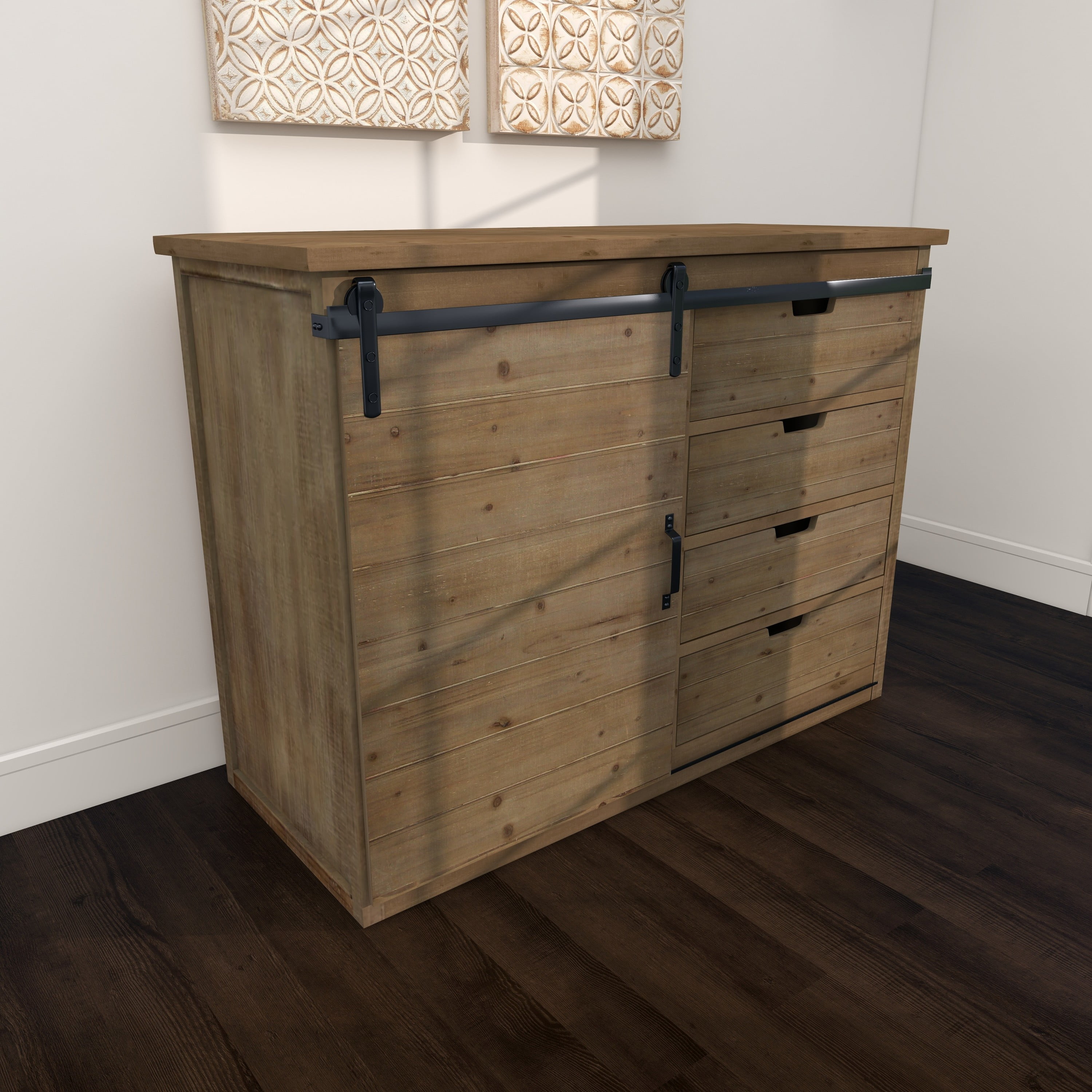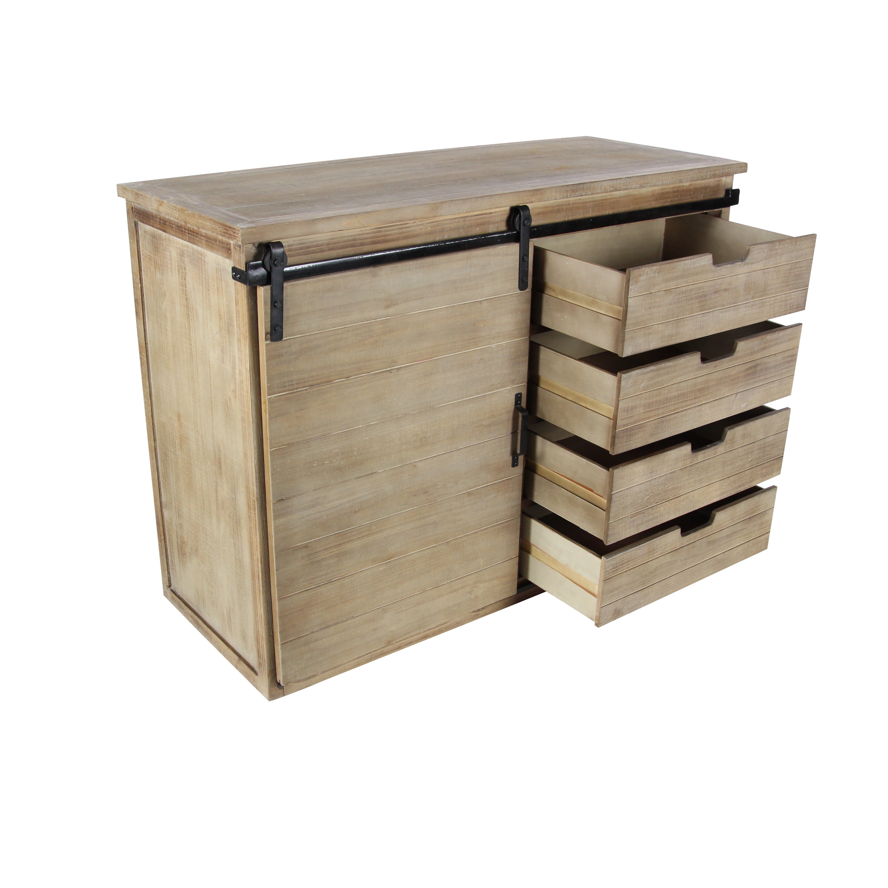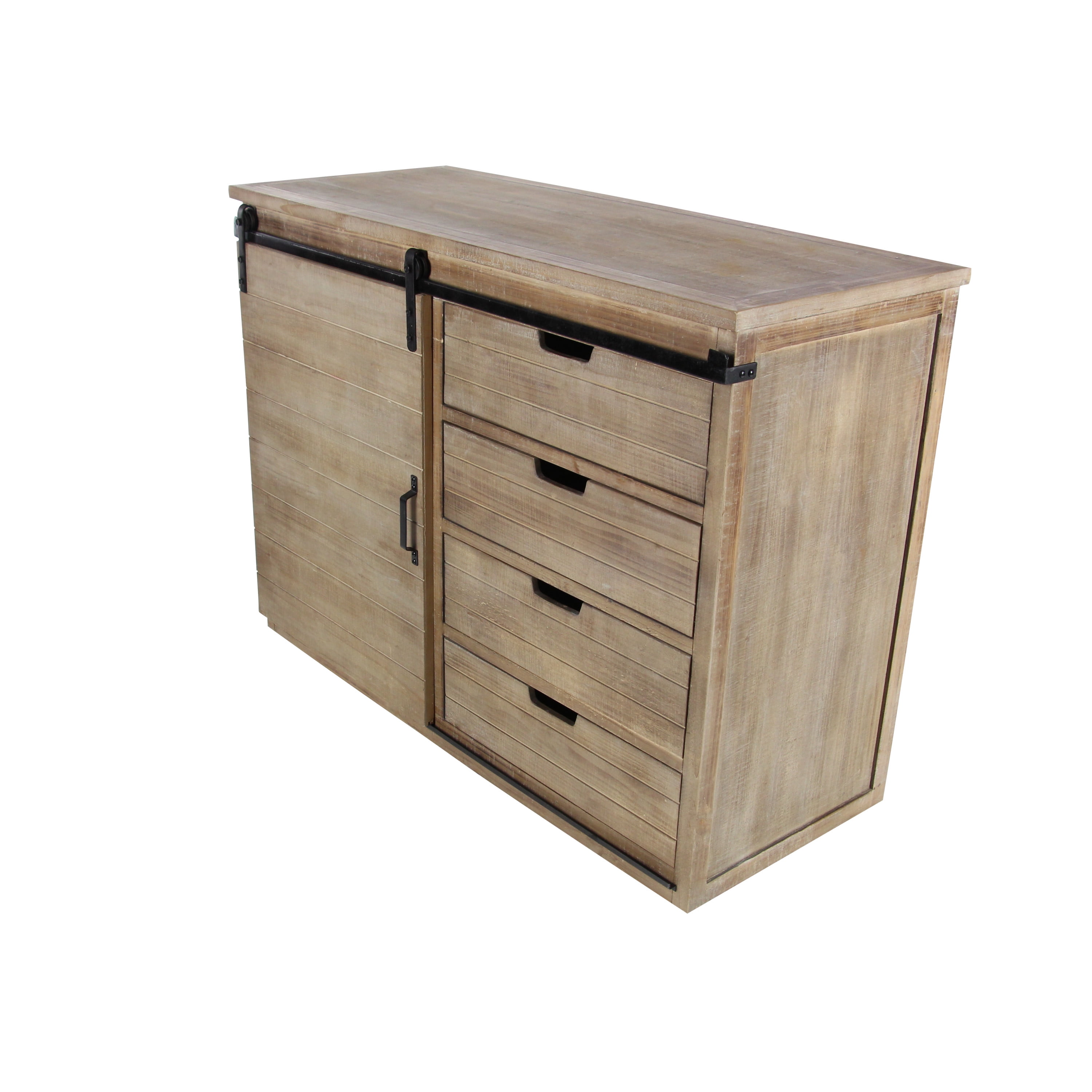 Designed with rugged beauty and an earthy charm, where natural simplicity, warmth, and organic materials create a wholesome atmosphere Large rustic console storage is made from solid iron and wood Farmhouse sideboard cabinet carries a natural light brown finish with whitewash distressing and black metal hardware Brown wooden storage unit features a combinations of pull out drawers and a sliding cabinet door for an efficient yet eye catching design Each item measures 44L x 18.75W x 32.38H inches, and collectively weighs 49 lbs This cabinet features a rectangular profile with visible wood grain patterns from the materials used Wipe clean with a dry cloth This cabinet is attached wood materials via iron hardware Rustic style DecMode 44″ x 32″ Brown Wood 4 Drawers 1 Shelf and 1 Door Cabinet, 1-Piece makes a perfect addition to any home
