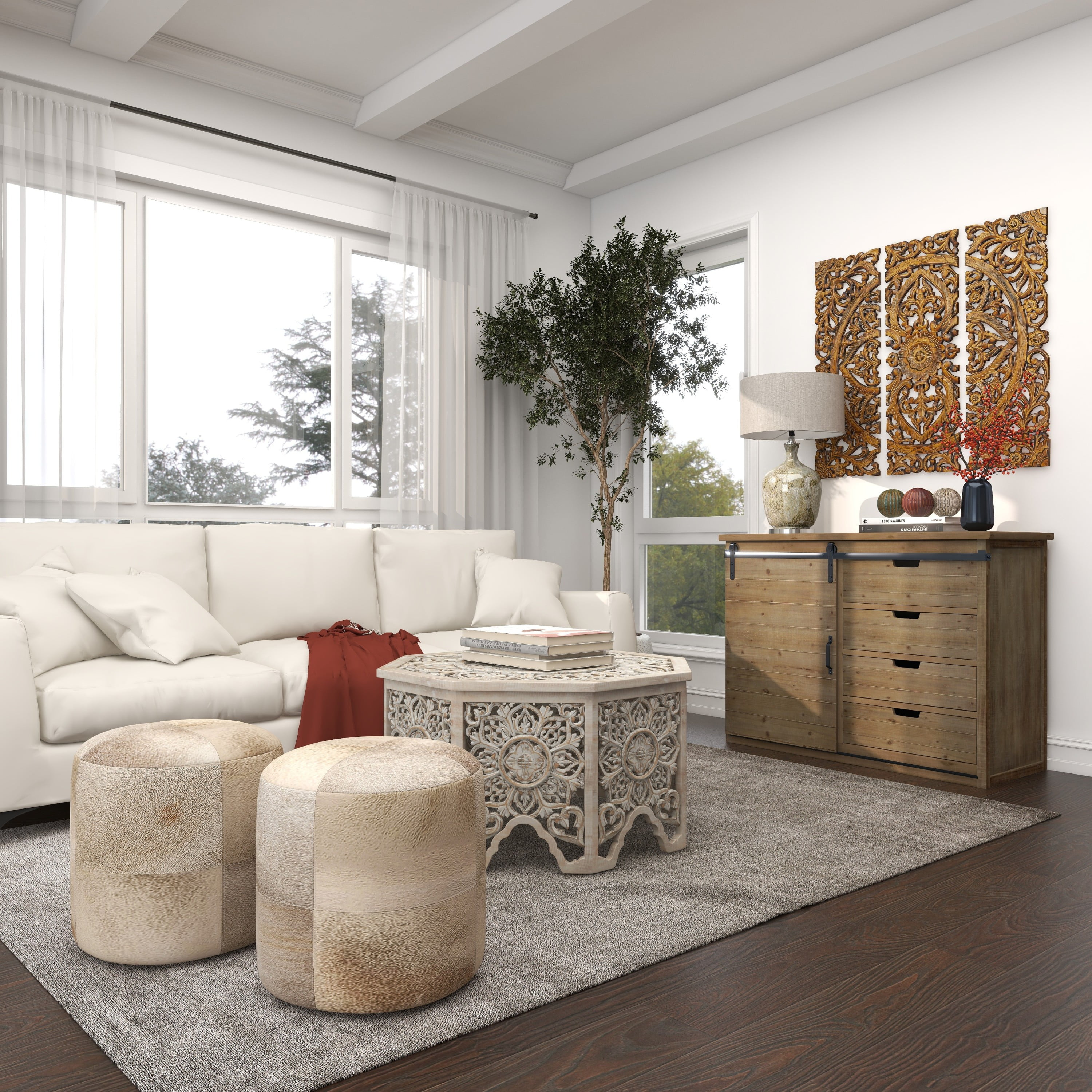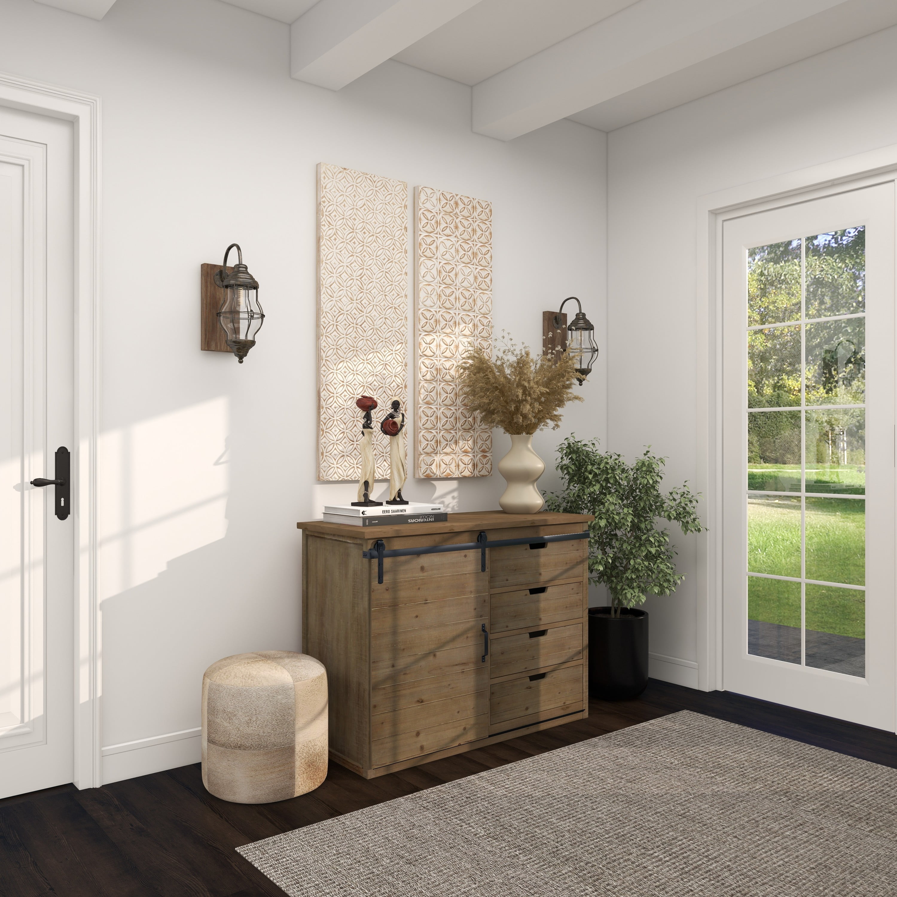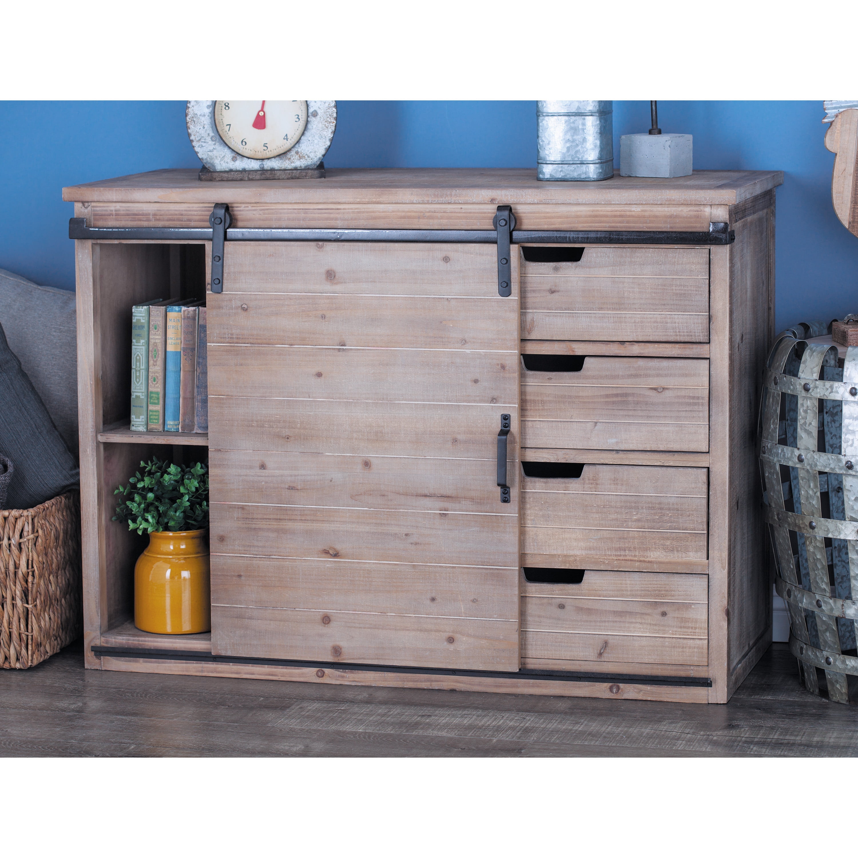 Designed with rugged beauty and an earthy charm, where natural simplicity, warmth, and organic materials create a wholesome atmosphere Large rustic console storage is made from solid iron and wood Farmhouse sideboard cabinet carries a natural light brown finish with whitewash distressing and black metal hardware Brown wooden storage unit features a combinations of pull out drawers and a sliding cabinet door for an efficient yet eye catching design Each item measures 44L x 18.75W x 32.38H inches, and collectively weighs 49 lbs This cabinet features a rectangular profile with visible wood grain patterns from the materials used Wipe clean with a dry cloth This cabinet is attached wood materials via iron hardware Rustic style DecMode 44″ x 32″ Brown Wood 4 Drawers 1 Shelf and 1 Door Cabinet, 1-Piece makes a perfect addition to any home