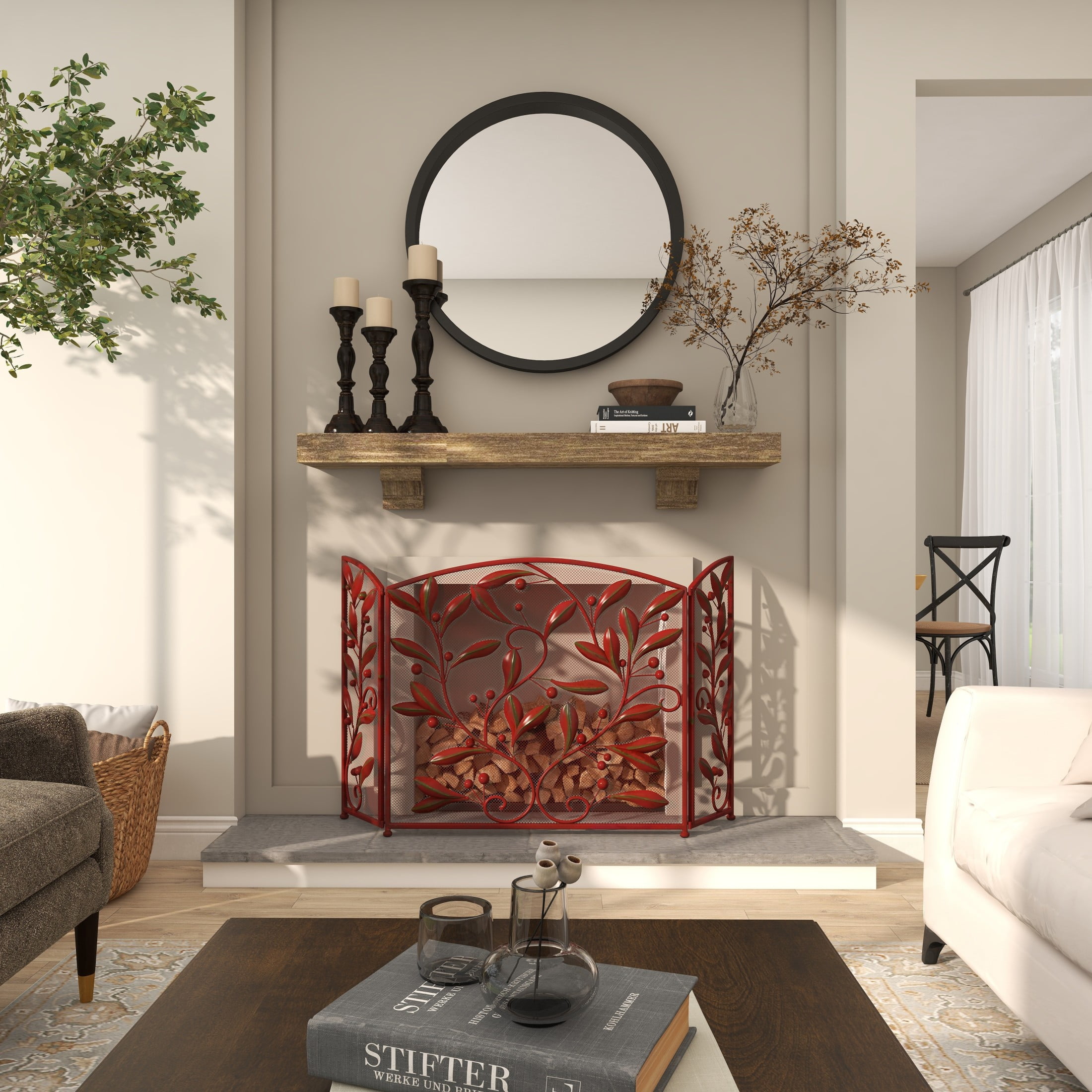 Designed with timeless sophistication, rich old-world textures and warm hues come together for a refined classic taste of luxury This red living room fireplace screen is crafted from durable iron, ensuring longevity, and adding sophistication to any space Arched mesh fireguard boasts a weathered red finish with touches of black on the frame and green hues on the leaves, creating a striking and elegant appearance The iron fireplace screen features sculpted floral designs on a micro mesh backing and is supported by a hinged mechanism for optimal configuration The red metal fireplace screen measures 45L x 1W x 30H inches, and weighs 11.25 lbs Weathered red spark guard cover showcases an arched shape with elaborate leaves, vines, and round fruit figures in its detailed patterning Wipe clean with a dry cloth This traditional fireplace screen protector is expertly welded from iron into an arched shape with detailed leaves attached across the mesh Traditional style DecMode 45″ x 30″ Red Metal Foldable Mesh Netting 3 Panel Leaf Fireplace Screen with Leaf and Vine Relief, 1-Piece makes a perfect addition to any home