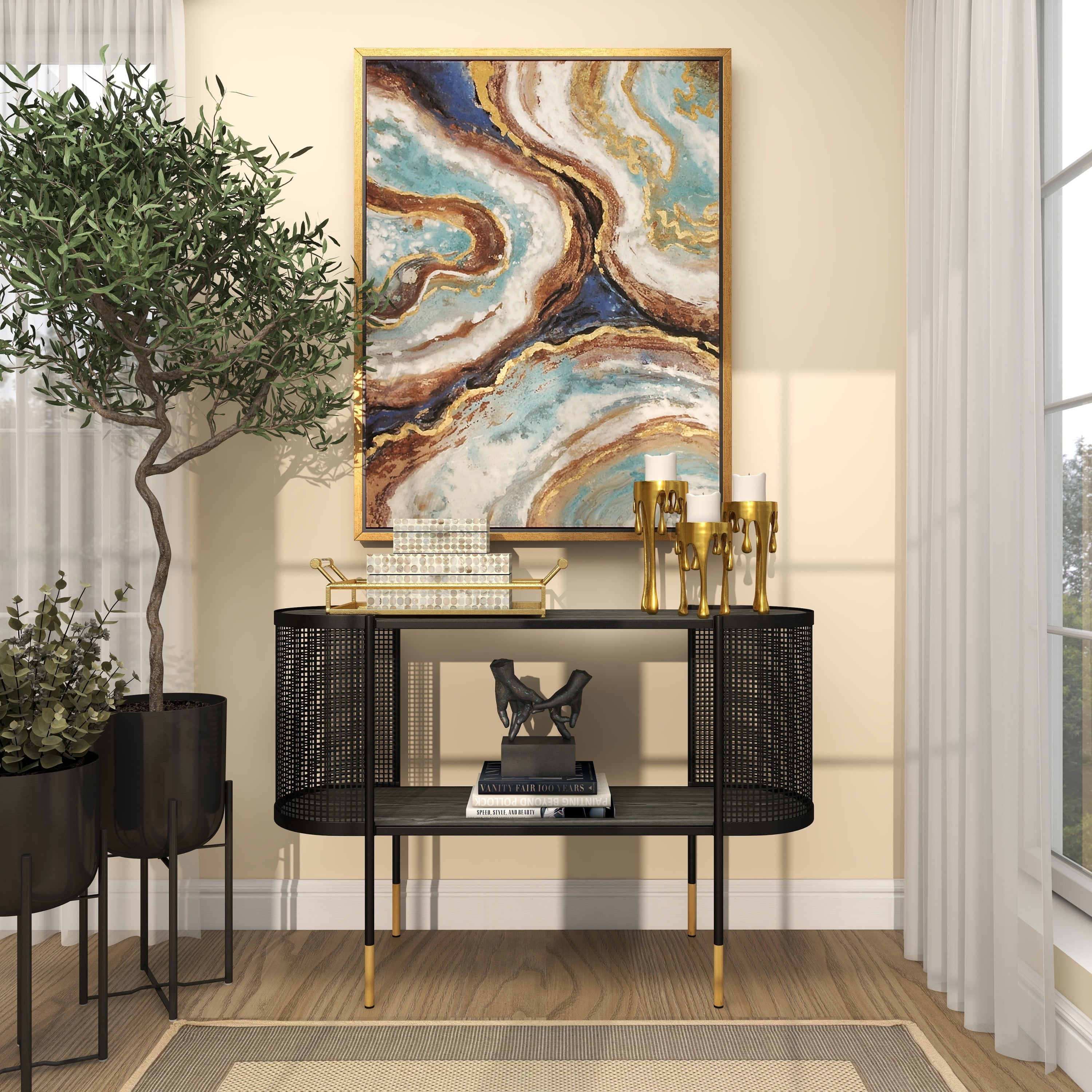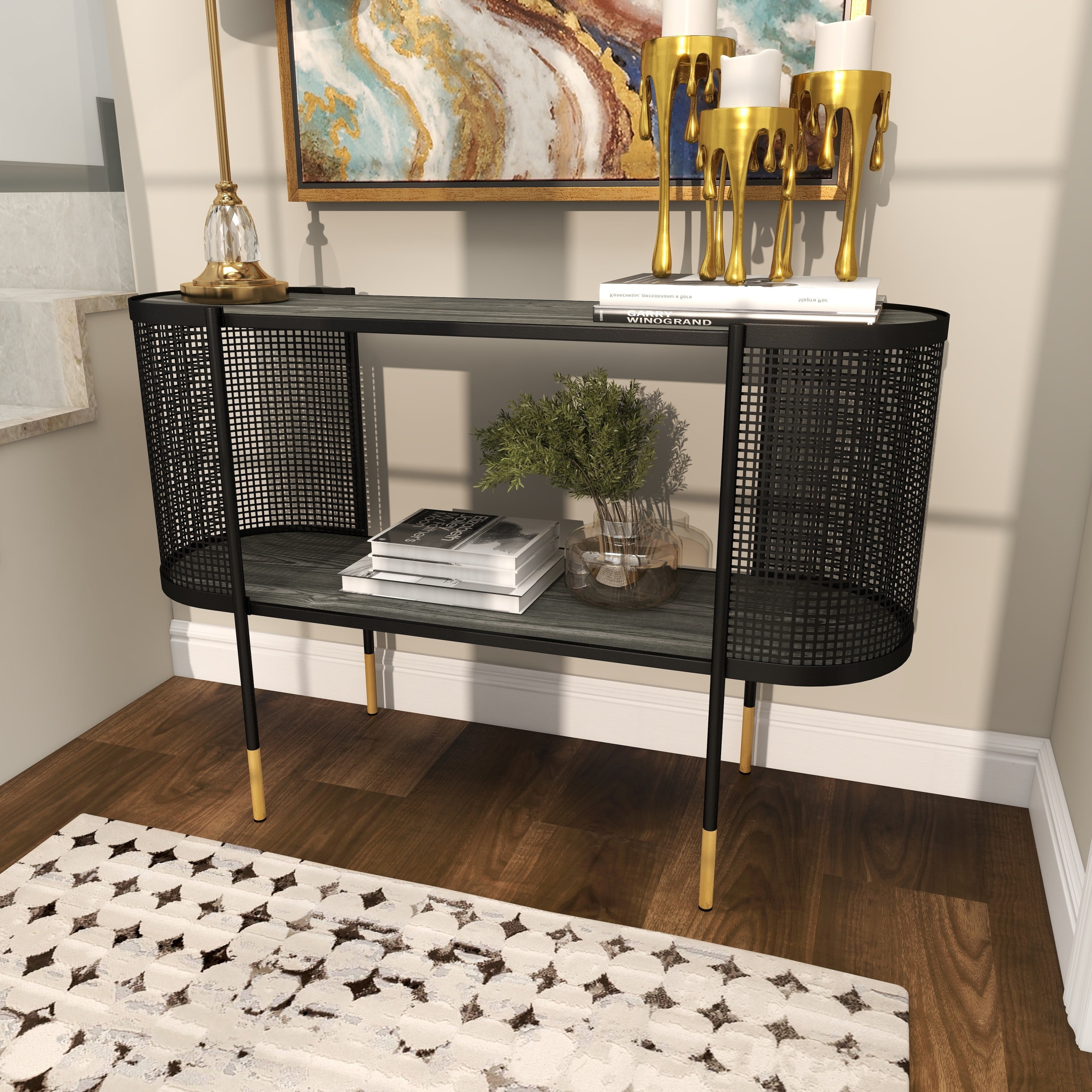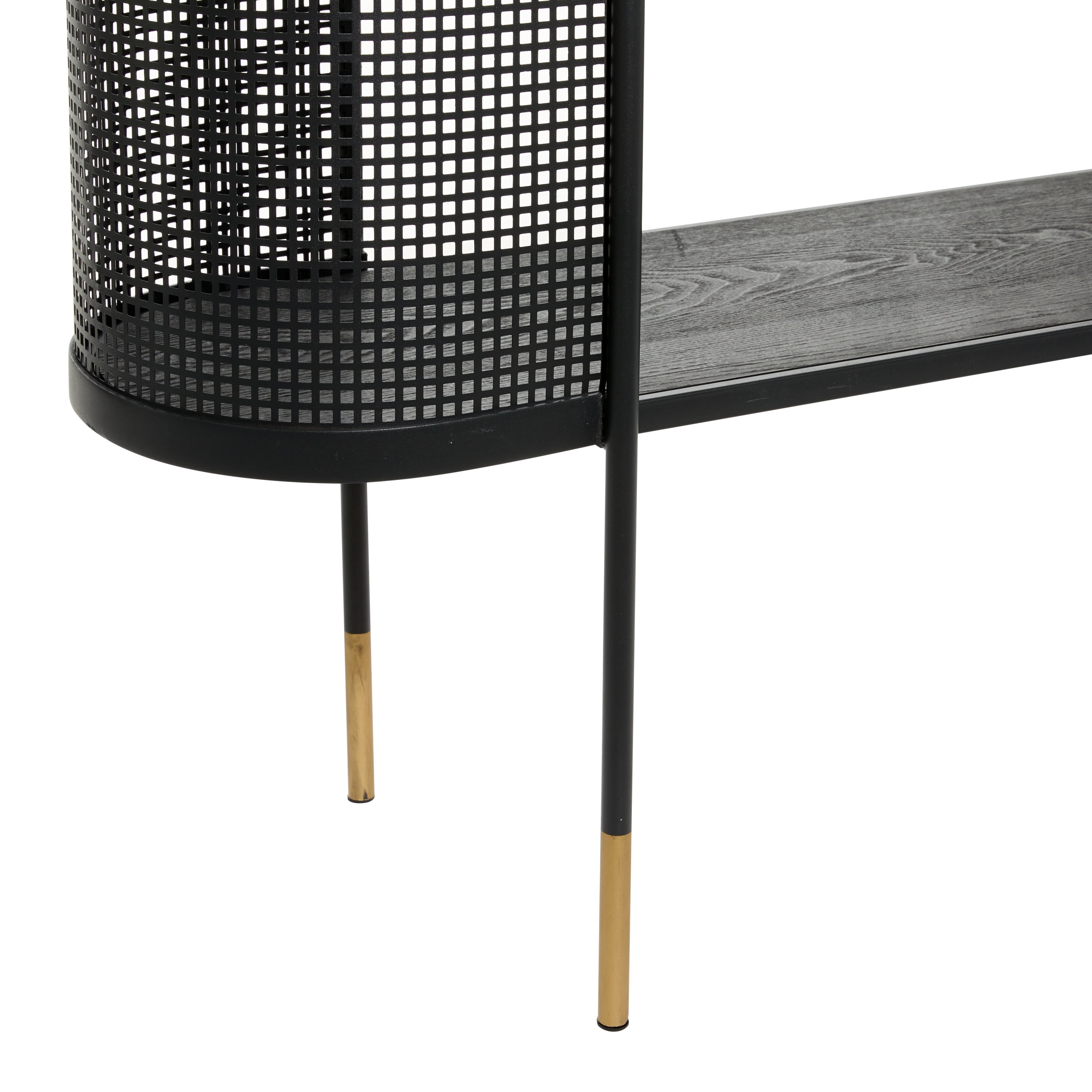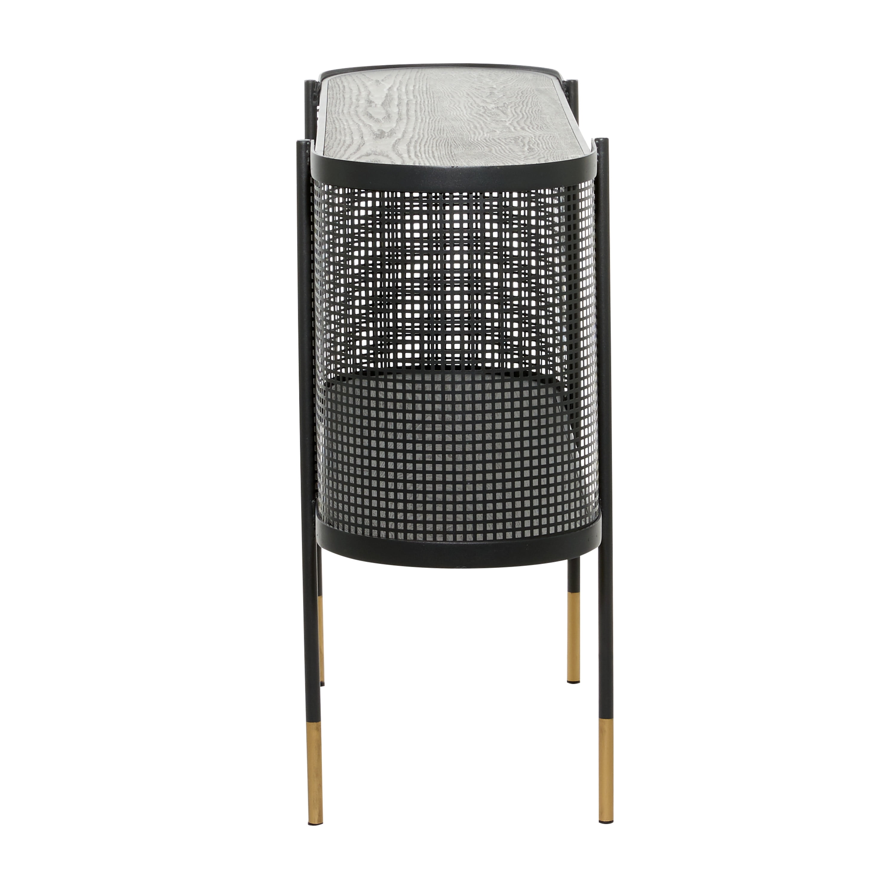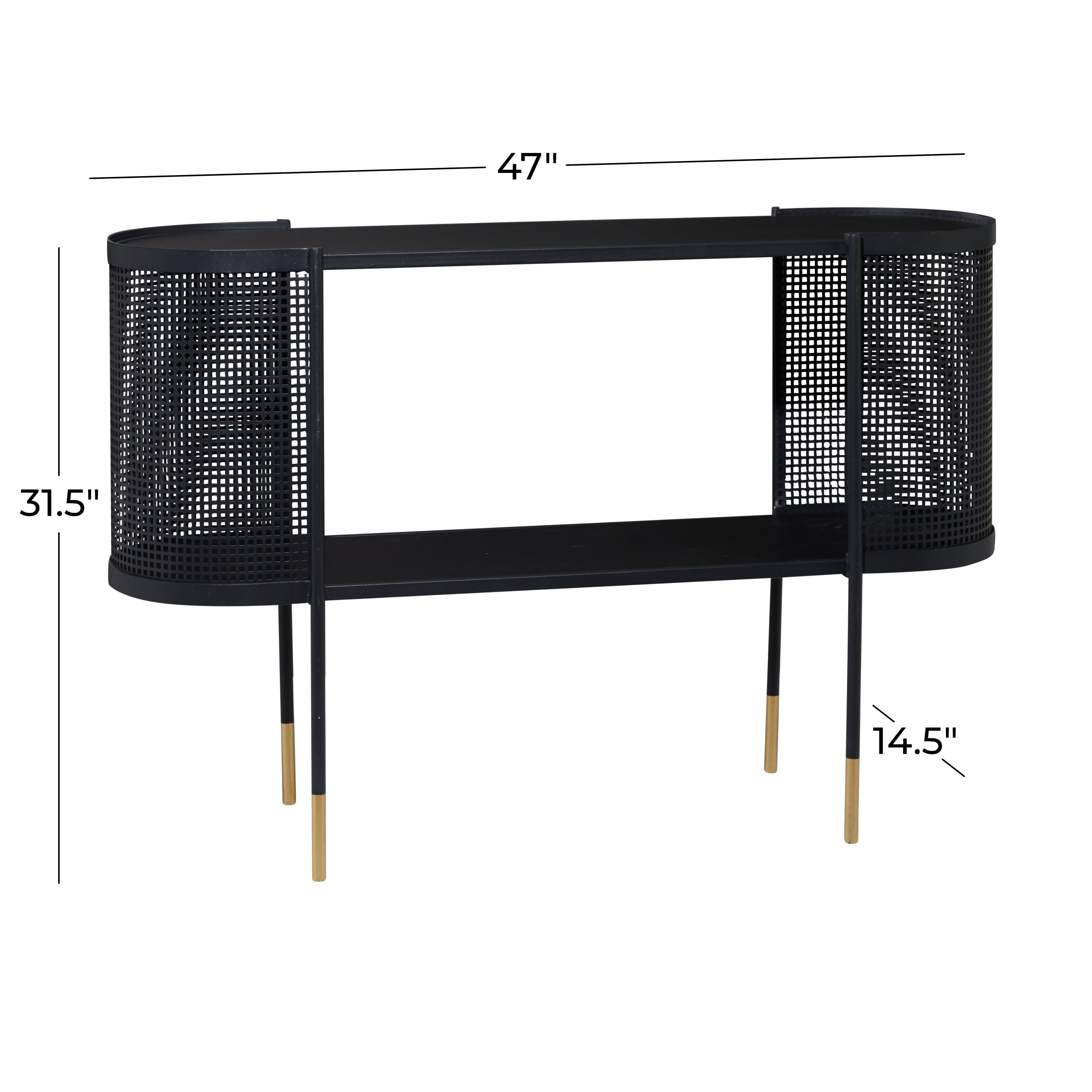 Embrace artistic expression with a style that highlights bold designs with sleek lines, neutral elements, and a minimalist aesthetic Black long console table is made from solid iron materials Uniquely modern console table has a matte black finish with metallic gold dipped legs Rectangular console table features an open front and back structure protected with curved metal mesh on each side and high under clearance space for optimal storage The console table measures 47.0L x 14.5W x 31.5H inches, and weighs 28.0 lbs This console table features a narrow oval surface detailed with a perforated metal sheet wrapped around both ends of the table fixed to 4 round legs Wipe clean with a dry cloth This console table is shaped and welded solid iron materials Contemporary style DecMode 47″ x 32″ Black Metal Mesh Side Panel 1 Shelf Console Table with Open Center Storage, 1-Piece makes a perfect addition to any home