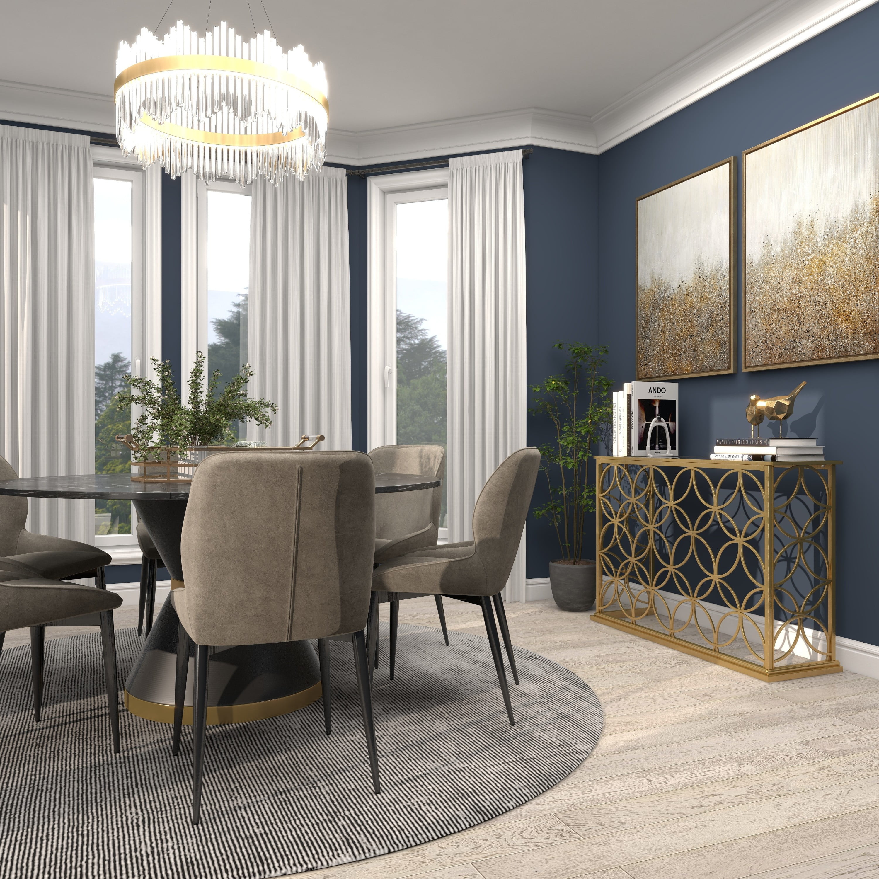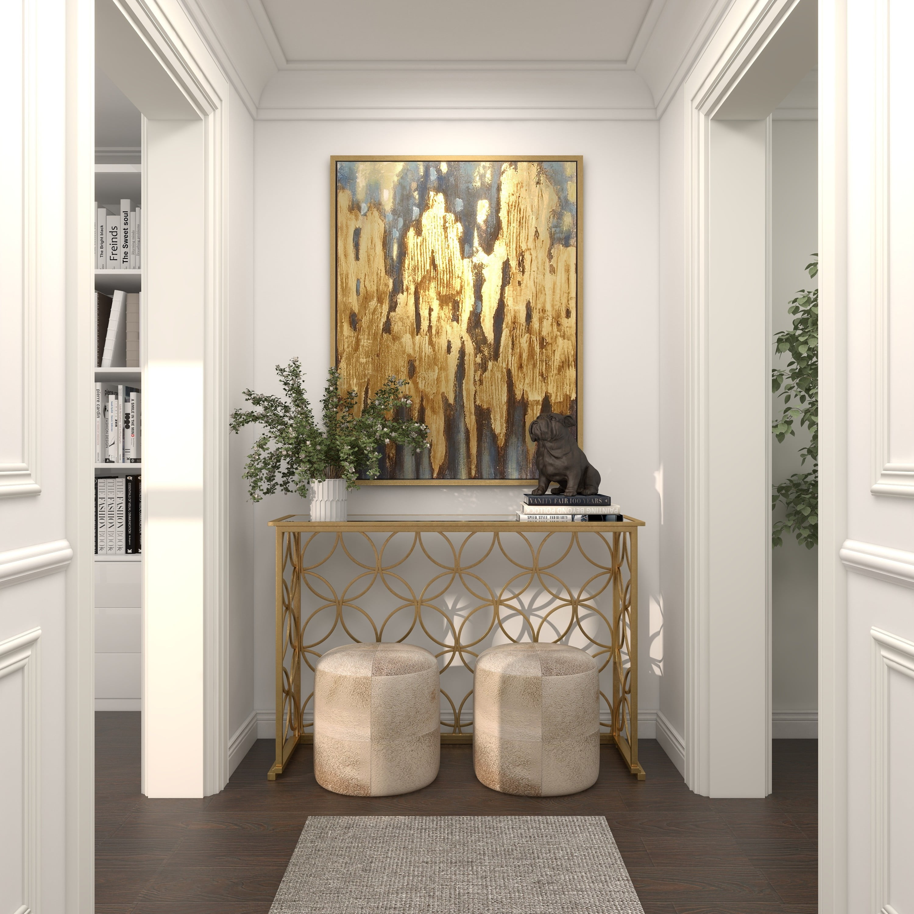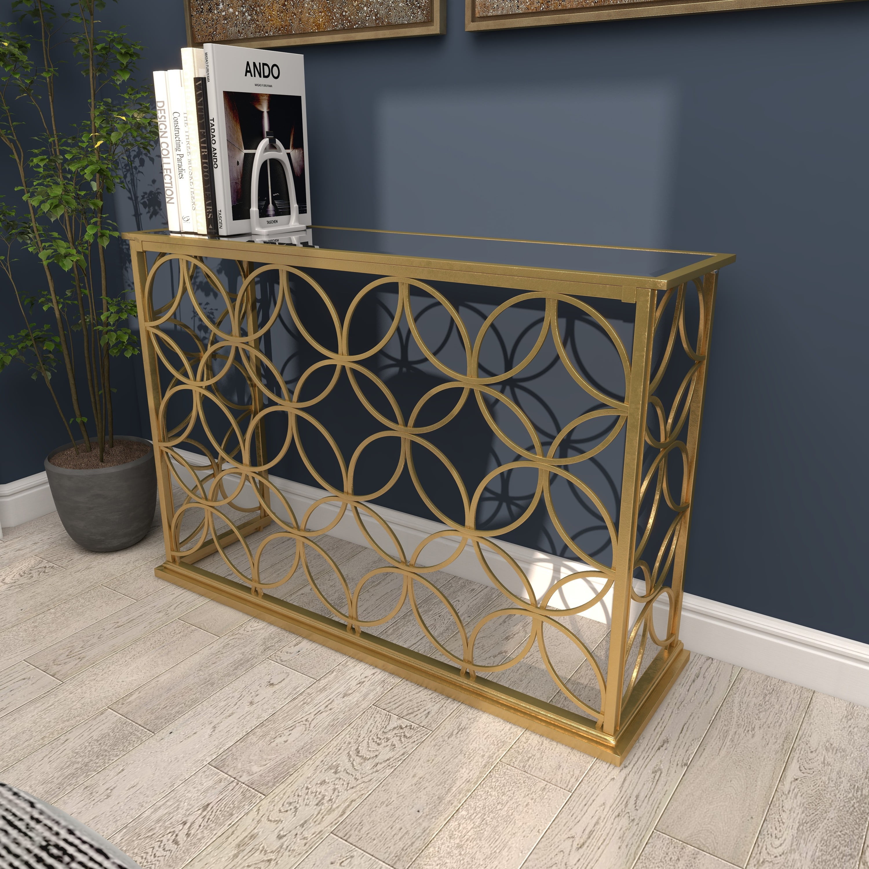 Designed with the essence of timeless sophistication, where rich old-world textures and warm hues come together for a refined classic taste of understated luxury Long gold console tables is made of iron frame with reflective mirror top Metal console table has a metallic gold frame and a reflective mirror surface Rectangular gold console table highlights a spacious mirrored top and features an overlapping circular structure with an open back side for optimal storage The console table measures 47L x 14.75W x 32H inches, and weighs 40.04 lbs This romantic gold console table with mirror features an extra large rectangular design with a captivating 4-petal flower pattern Wipe clean with a dry cloth Iron is intricately sculpted to form an abstract-inspired intersecting circle design Traditional style DecMode 47″ x 32″ Gold Metal Geometric Console Table with Mirrored Glass Top, 1-Piece makes a perfect addition to any home