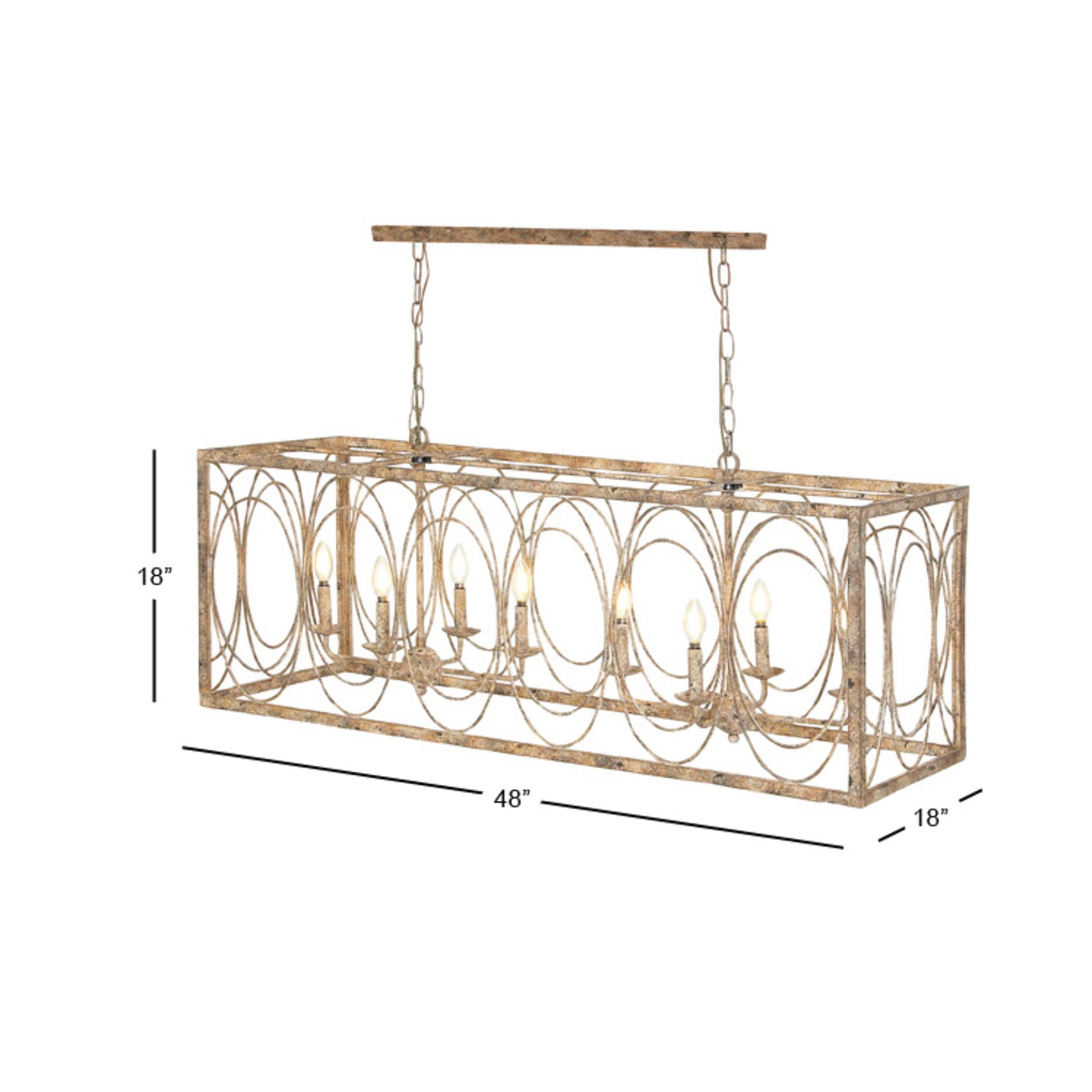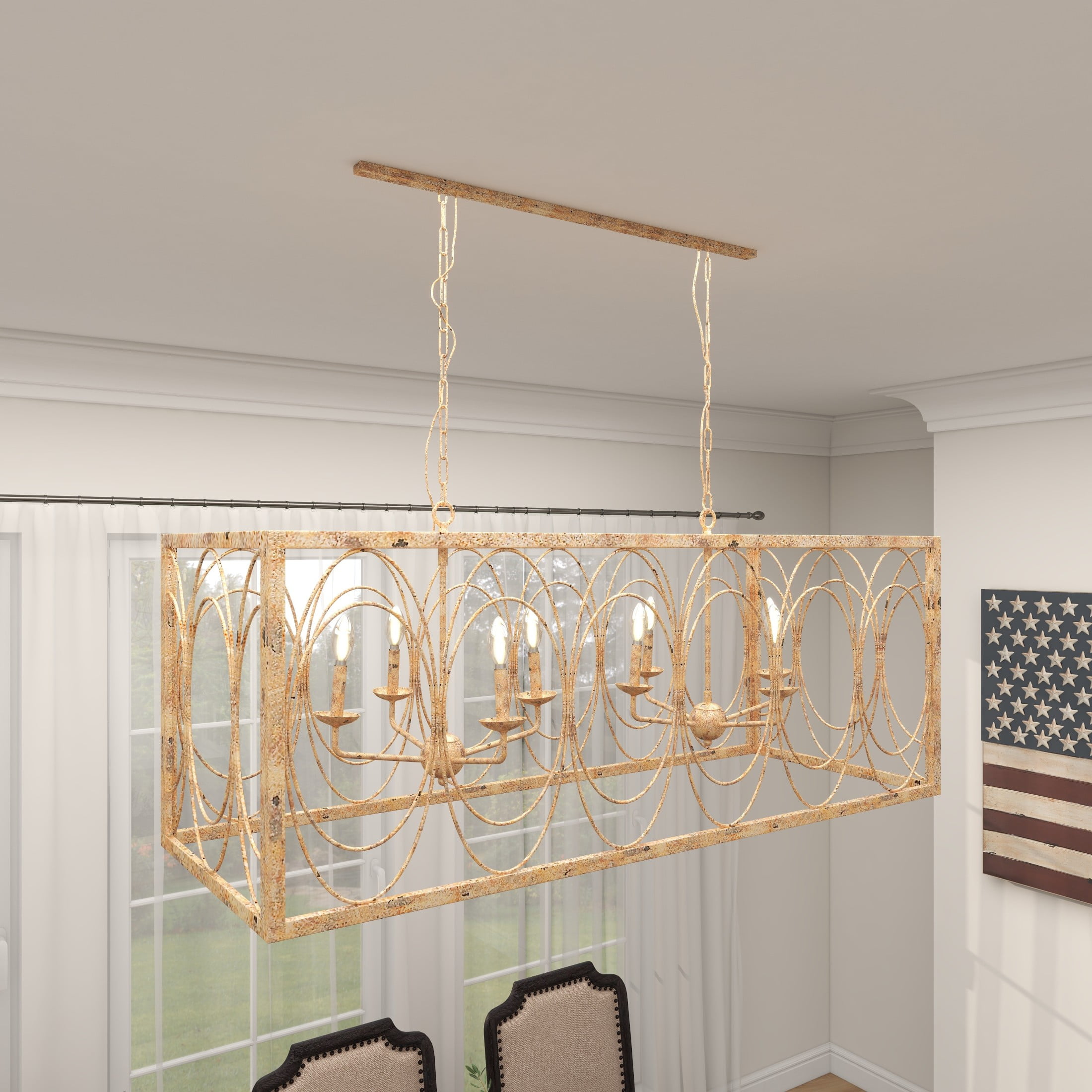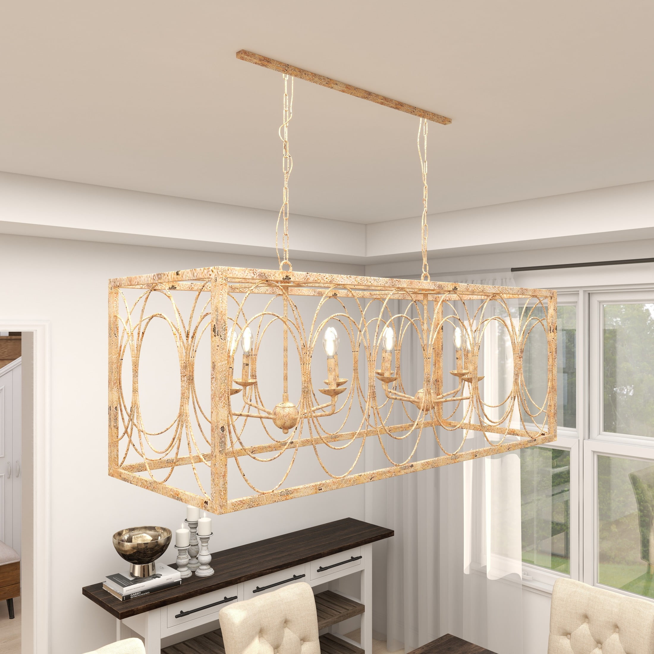 Infuse your home with romantic nostalgia and timeless grace, where ornate and antique details create a sanctuary of charm and warmth in the home Crafted from sturdy metal, this gold room chandelier exudes durability and elegance The rectangle ceiling pendant light presents a vintage charm with its weathered gold metal finish, adding an antique touch to any room This iron chandelier features a caged style design with eight lights for a vintage lighting display The gold metal chandelier measures 48L x 16W x 17.50H inches, and weighs 27 lbs With its rectangular open body adorned with stylish oval patterns and a suspension chain, the weathered gold ceiling light fixture adds sophistication to any space Wipe clean with a dry cloth The vintage ceiling hanging light is expertly assembled with welded metal and suspended by two sets of bolted chains for stability Vintage style DecMode 48″ x 18″ Gold Metal Distressed Caged 8 Light Chandelier with Link Style Chain, 1-Piece makes a perfect addition to any home