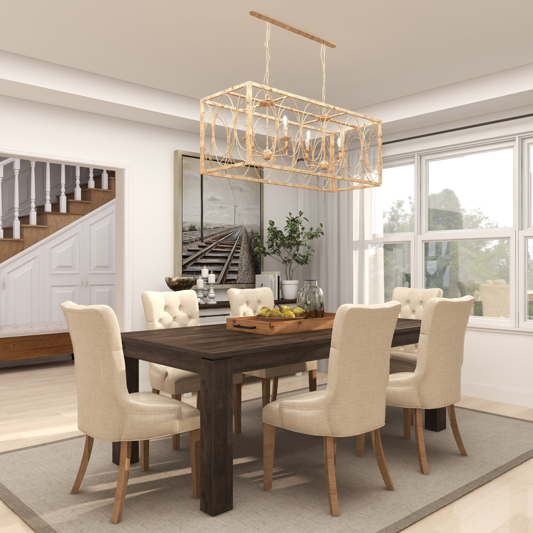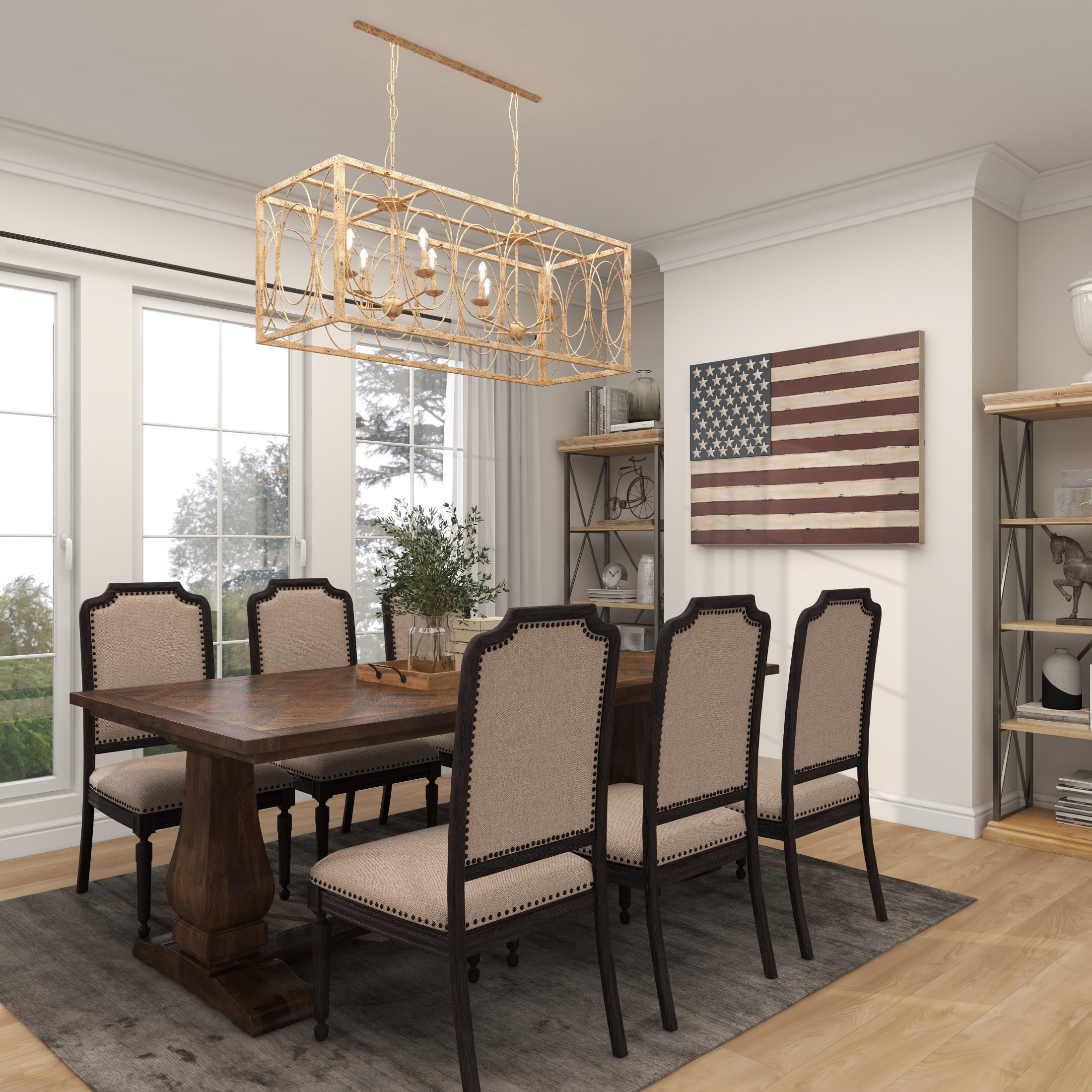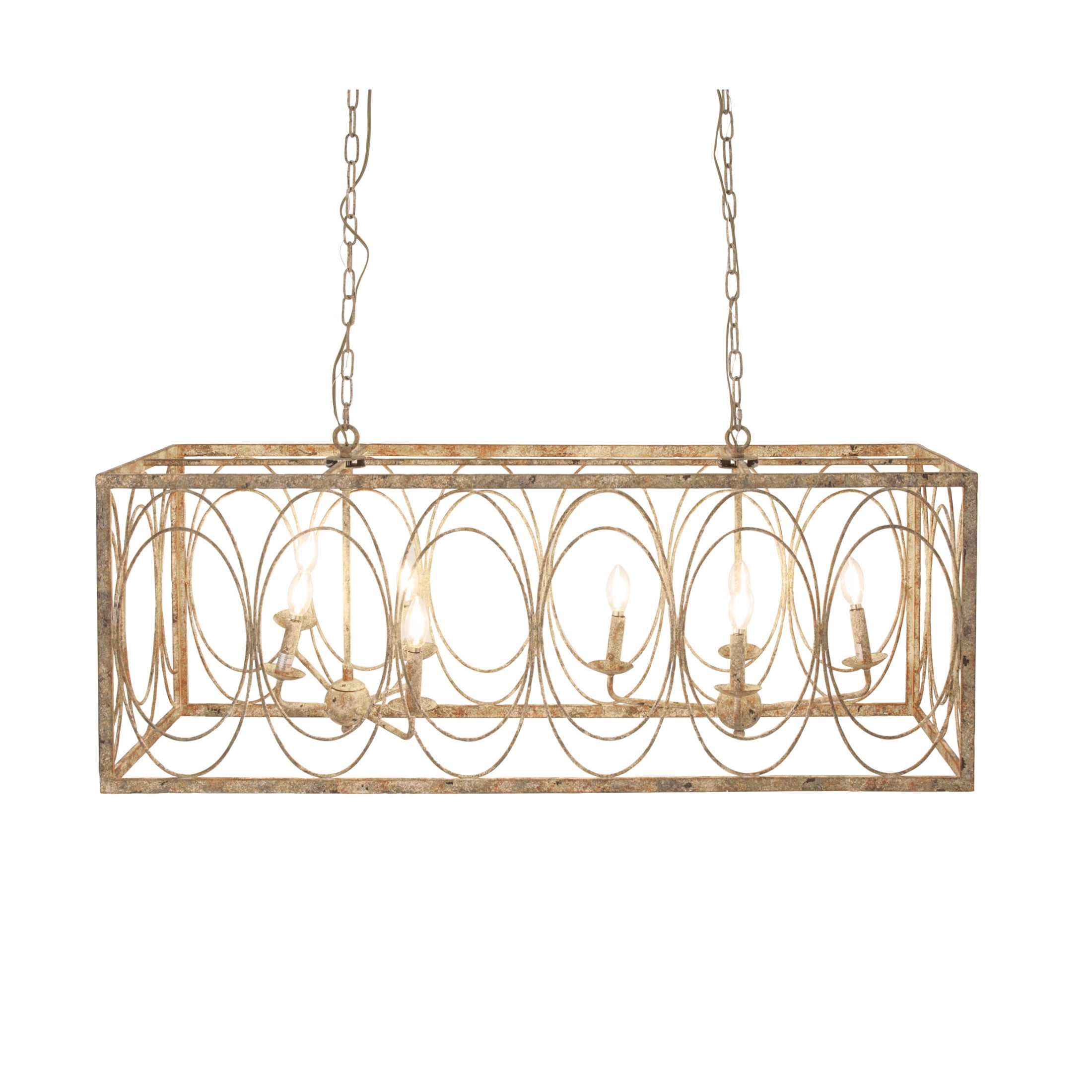 Infuse your home with romantic nostalgia and timeless grace, where ornate and antique details create a sanctuary of charm and warmth in the home Crafted from sturdy metal, this gold room chandelier exudes durability and elegance The rectangle ceiling pendant light presents a vintage charm with its weathered gold metal finish, adding an antique touch to any room This iron chandelier features a caged style design with eight lights for a vintage lighting display The gold metal chandelier measures 48L x 16W x 17.50H inches, and weighs 27 lbs With its rectangular open body adorned with stylish oval patterns and a suspension chain, the weathered gold ceiling light fixture adds sophistication to any space Wipe clean with a dry cloth The vintage ceiling hanging light is expertly assembled with welded metal and suspended by two sets of bolted chains for stability Vintage style DecMode 48″ x 18″ Gold Metal Distressed Caged 8 Light Chandelier with Link Style Chain, 1-Piece makes a perfect addition to any home