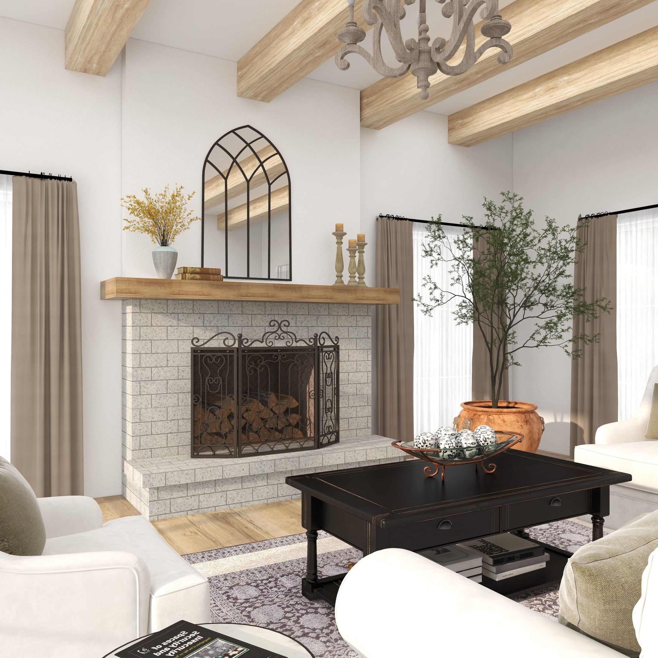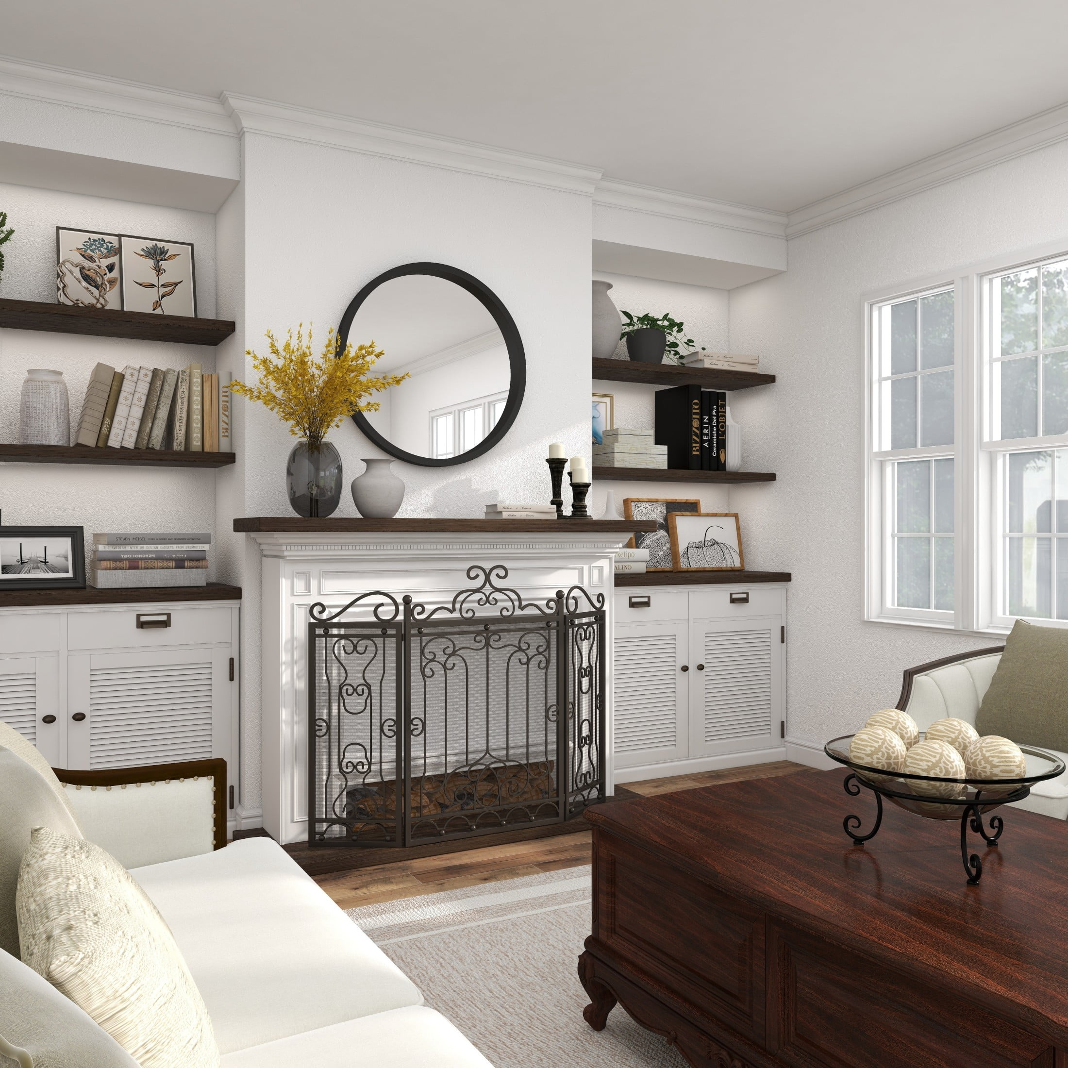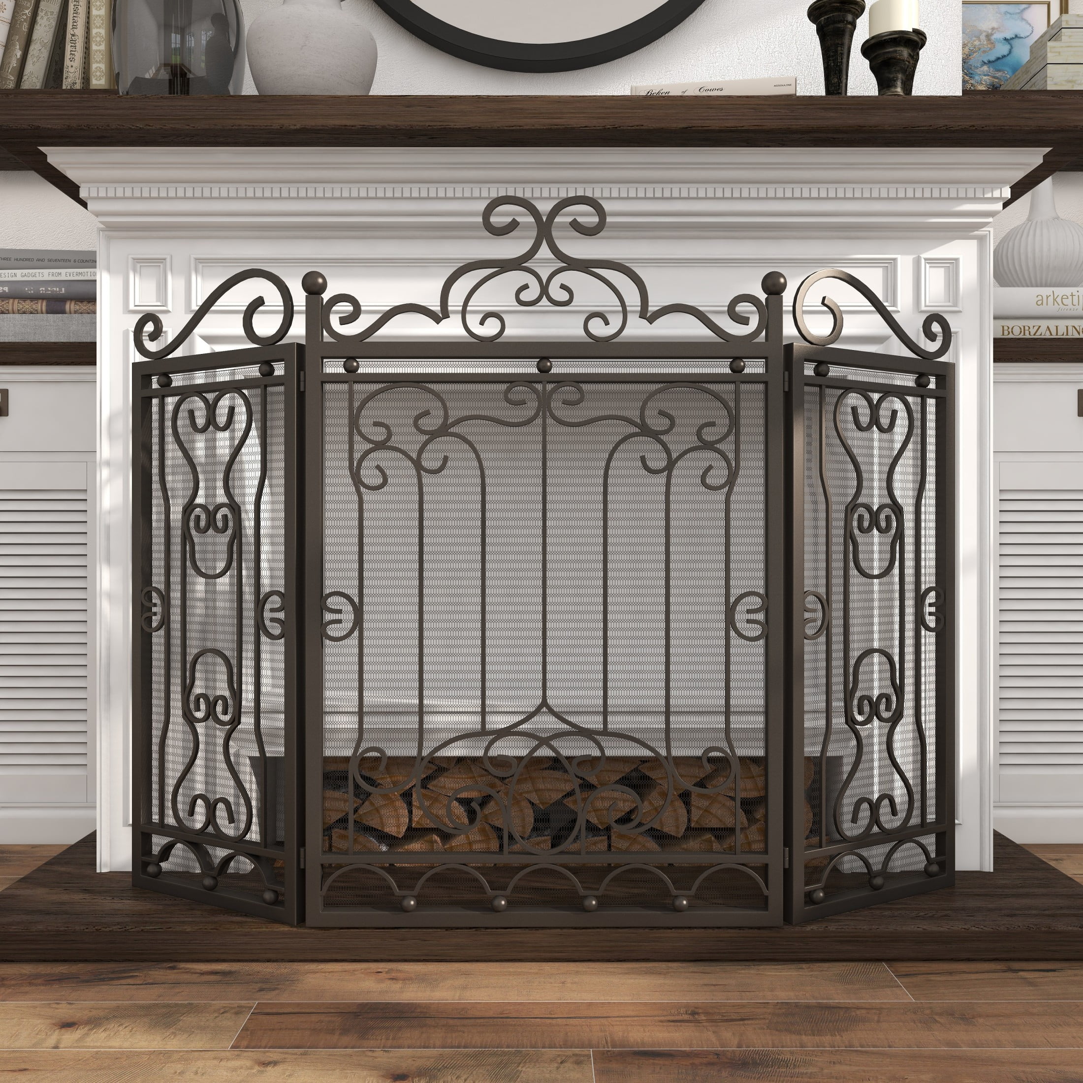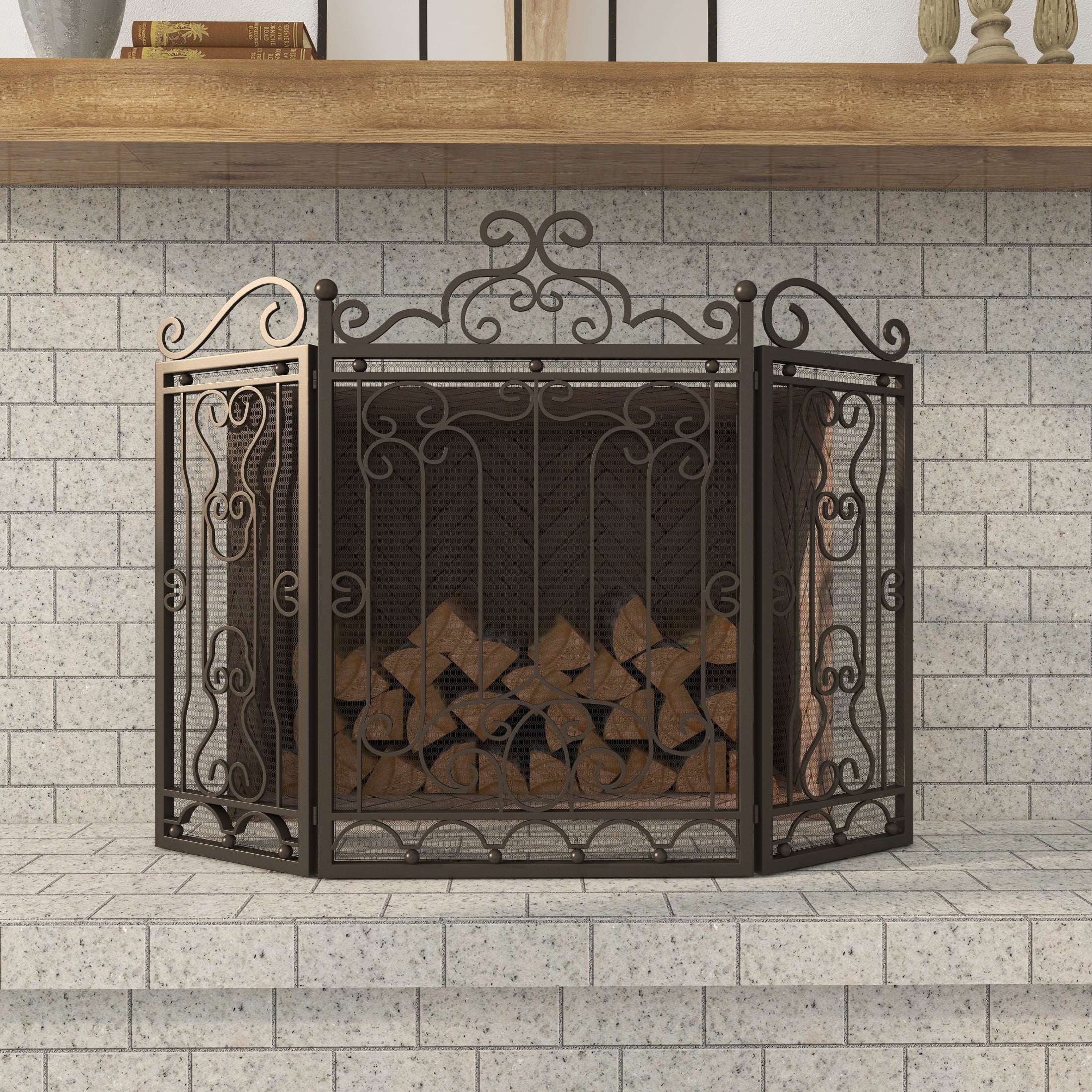 Designed with timeless sophistication, rich old-world textures and warm hues come together for a refined classic taste of luxury This dark brown living room fireplace screen is constructed from durable iron, resulting in a robust and stylish piece that combines both form and function Rectangular mesh fireguard boasts a matte dark brown finish that complements a variety of interior styles This iron fireplace screen features hinged panels and sculpted scrollwork, offering both elegance and protection The dark brown metal fireplace screen measures 48L x 1W x 38H inches, and weighs 29.85 lbs Matte dark brown spark guard cover showcases rectangular panels adorned with intricate floral iron scrollwork designs Wipe clean with a dry cloth This traditional fireplace screen protector’s hinged metal frame is expertly welded for stability and function Traditional style DecMode 48″ x 38″ Dark Brown Metal Foldable Mesh Netting 3 Panel Scroll Fireplace Screen, 1-Piece makes a perfect addition to any home