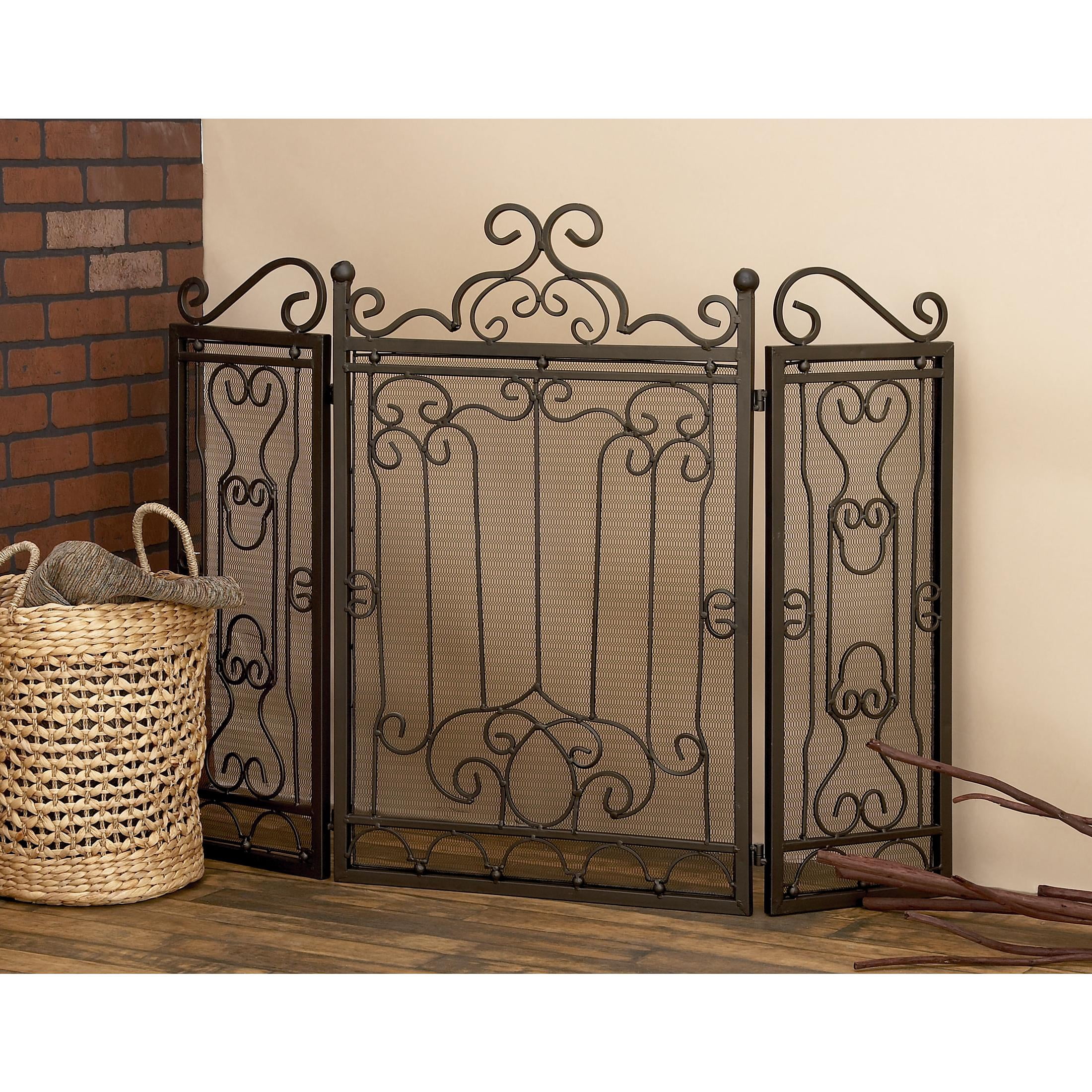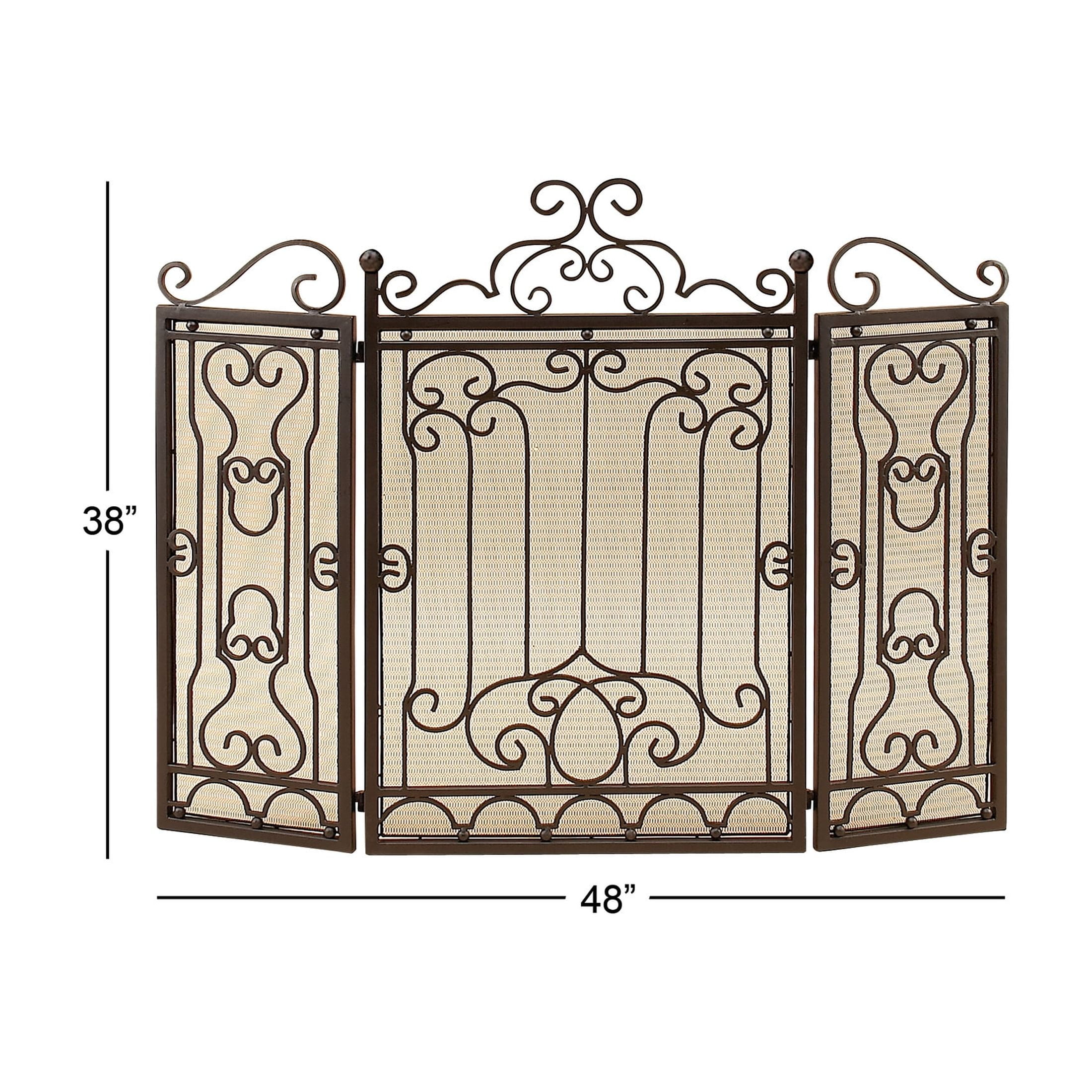 DecMode 48″ x 38″ Dark Brown Metal Foldable Mesh Netting 3 Panel Scroll Fireplace Screen, 1-Piece