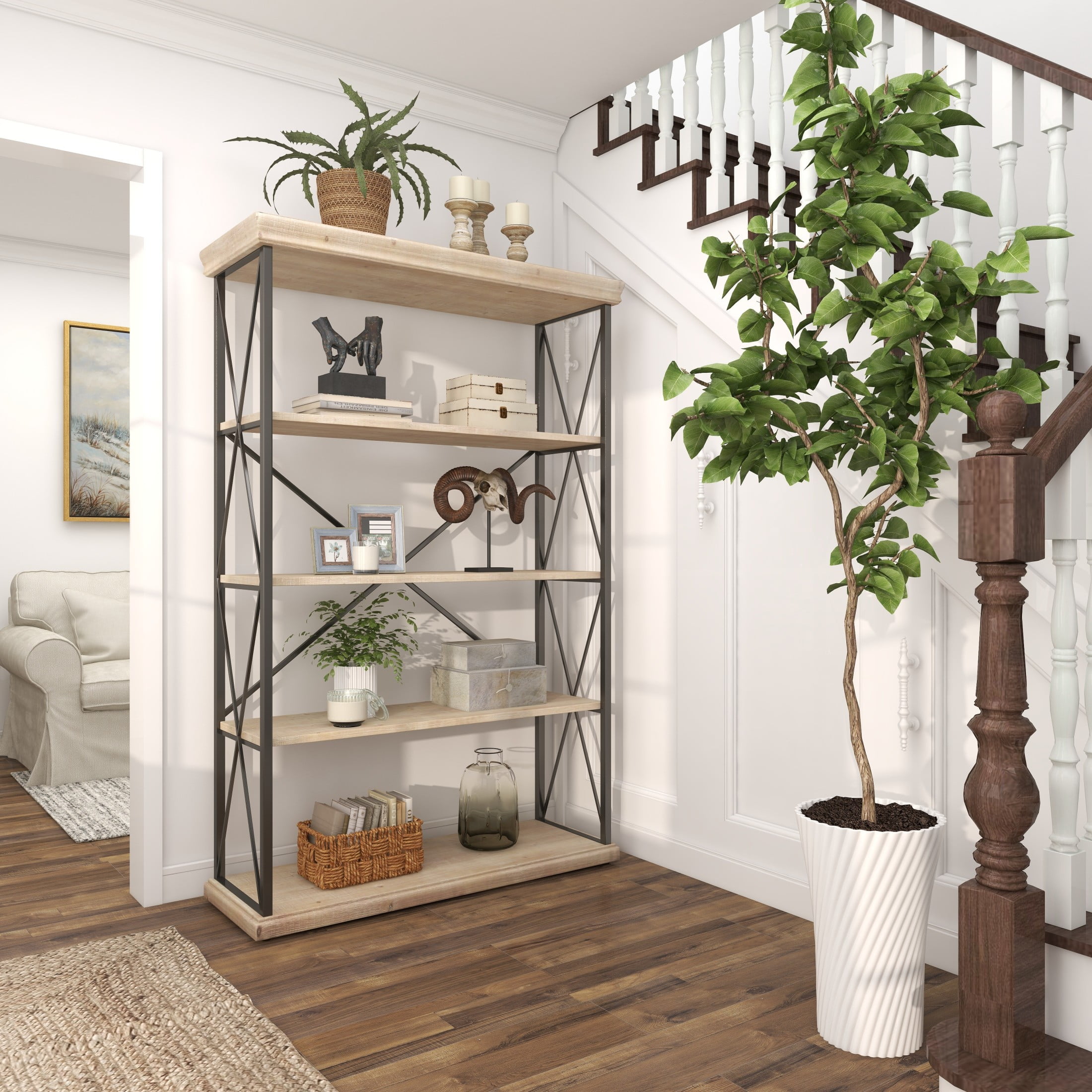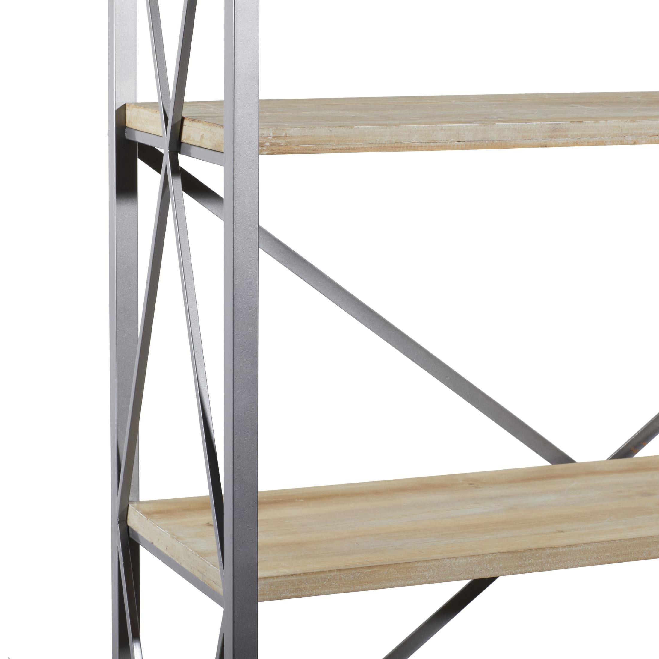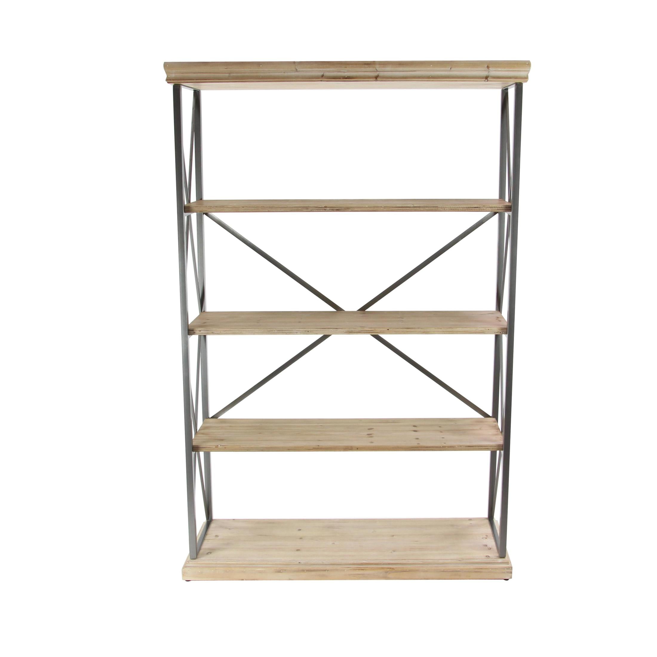 DecMode 48″ x 72″ Brown Wood 5-Tier Shelving Unit with Gray Metal X-Frame, 1-Piece is a unique addition to your stylish home. Style the brown shelving unit in your living room with hardcover books, organic vases, beaded garlands, and potted plants for a rustic touch. This shelving unit has a completely finished back. This item ships in 1 carton. Suitable for indoor use only. Some assembly required. Maximum weight limit is 30 lbs. This is a single brown colored display shelf. Fir shelving unit features 5 fixed shelves. Industrial style.