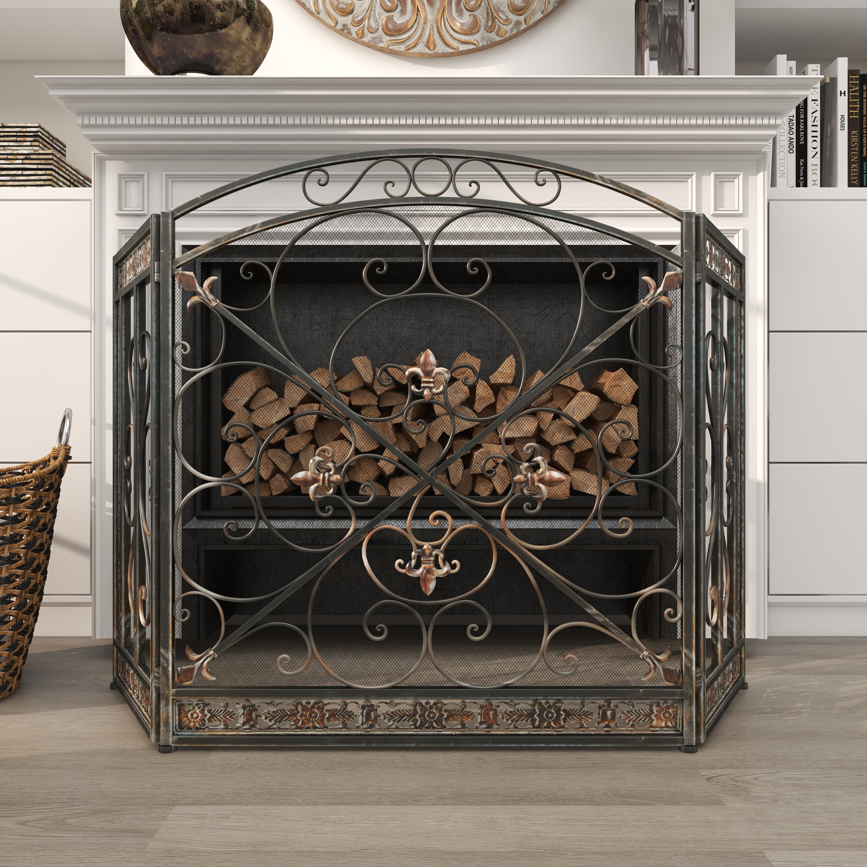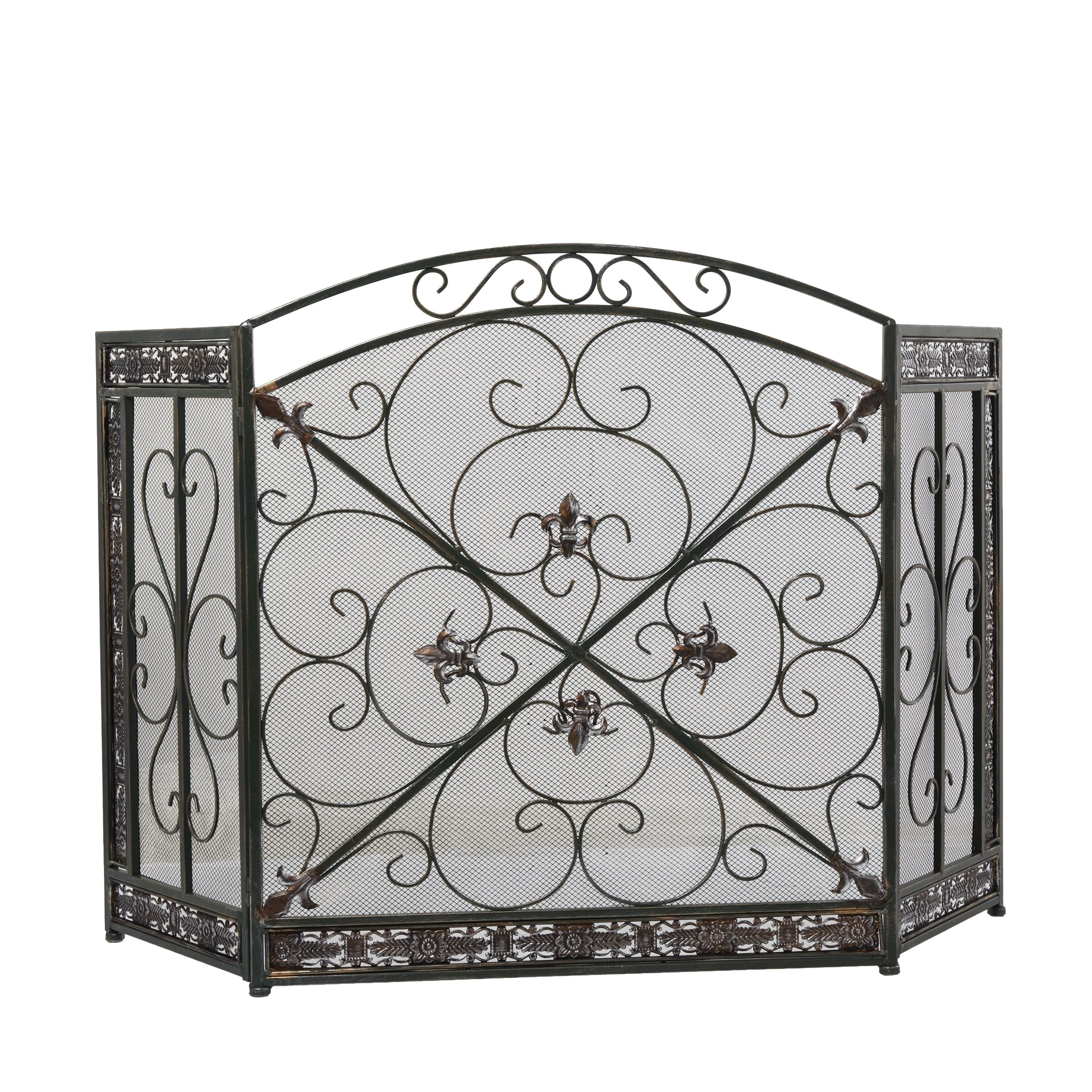 DecMode 52″ x 31″ Black Metal Foldable Mesh Netting 3 Panel Fireplace Screen with Fleur De Lis and Scrollwork Designs, 1-Piece is a unique addition to your stylish home. Keep those straw ambers at bay with this fire place screen. Adding style even when the fire isn’t lit, this fireplace screen adds style as well as function. Add a hint of charm with this traditional mesh screen covering your fireplace or an empty wall to eliminate negative space. Designed with felt or rubber stoppers at the base that prevent scratching furniture and table tops, as well as sliding around. This item ships in 1 carton. Please note that this item is for decorative use only. Features fleur de lis and floral sculptures. This fireplace screen features paint that can resist heat up to 600 degrees.. Suitable for indoor use only. This item ships fully assembled in one piece. Item features 3 panel screens. This is a single black colored fire spark guard. Traditional style.