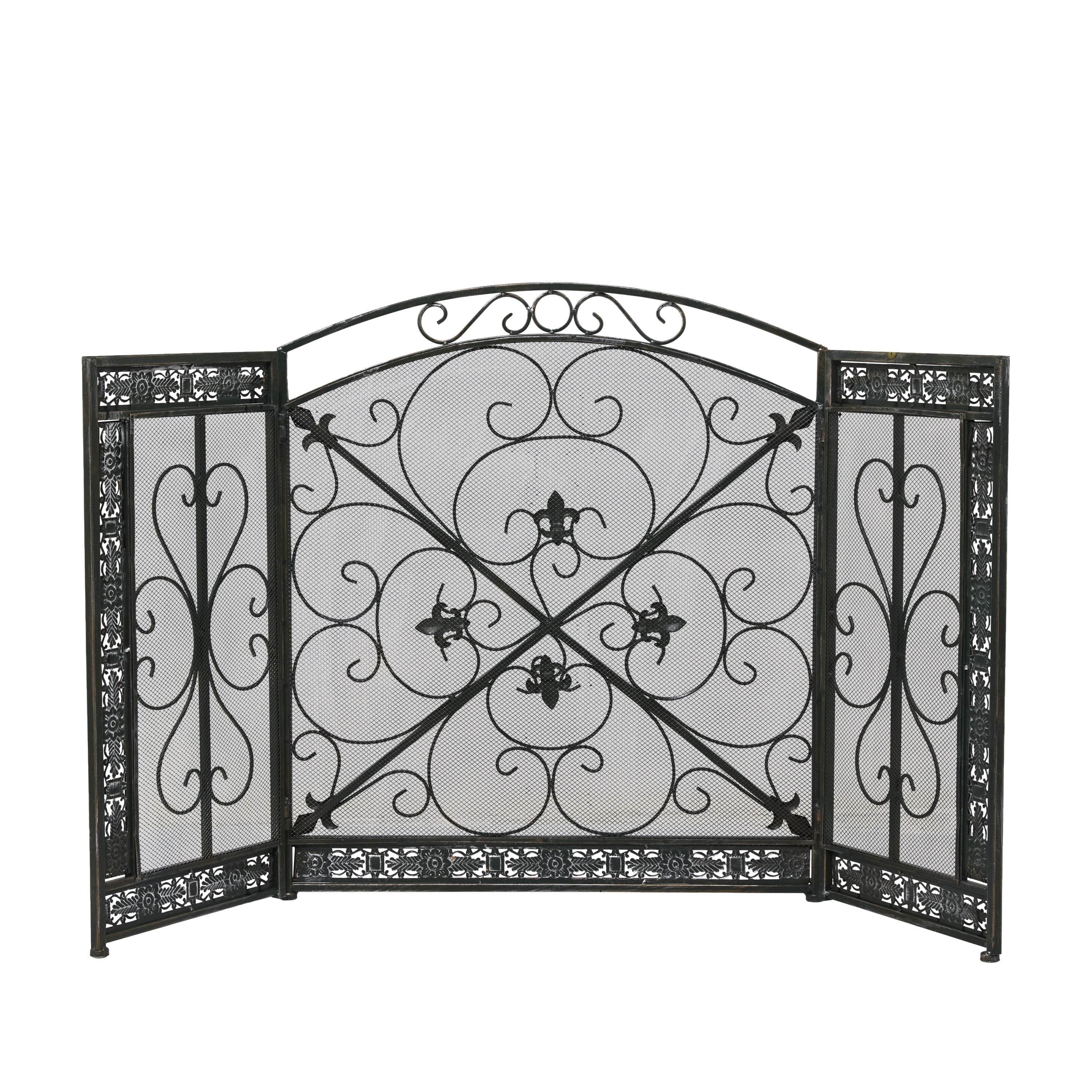 DecMode 52″ x 31″ Black Metal Foldable Mesh Netting 3 Panel Fireplace Screen with Fleur De Lis and Scrollwork Designs, 1-Piece