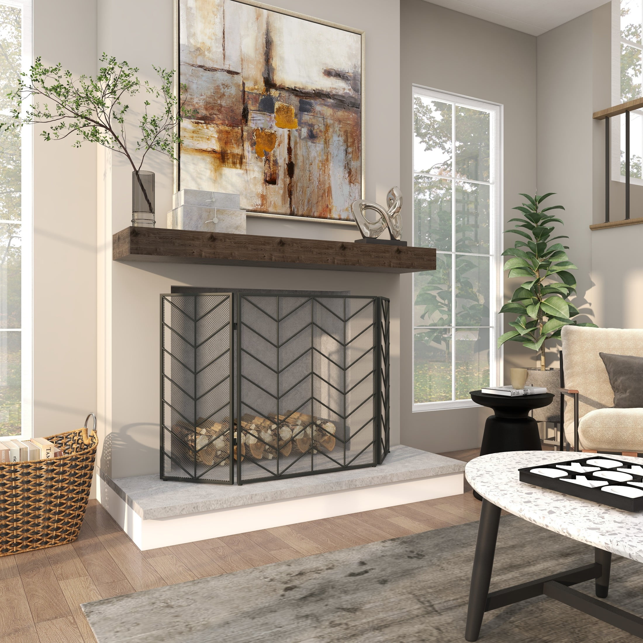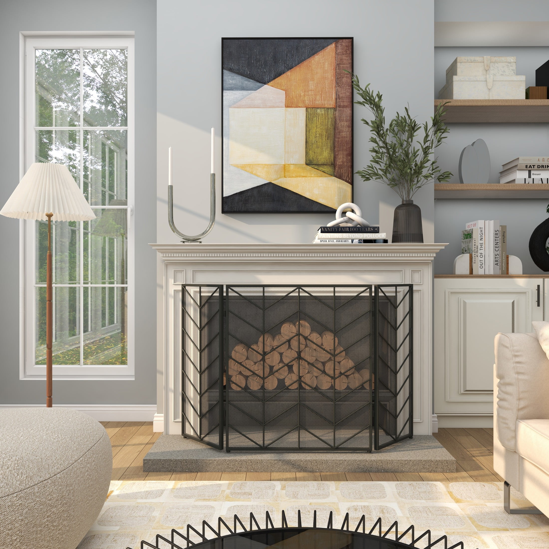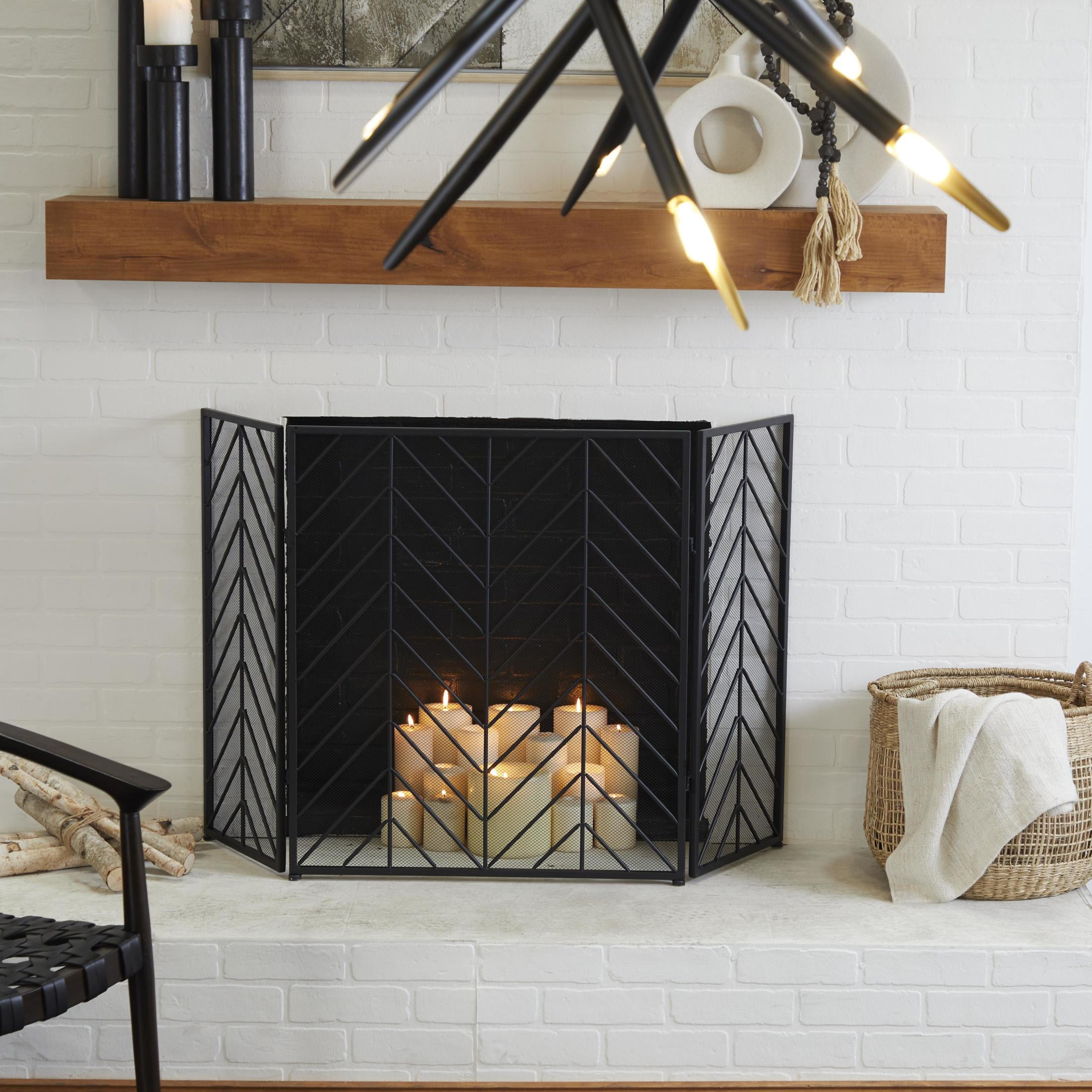 Inspired by sleek elegance and clean lines, a minimalistic design offers effortless luxury with monochromatic tones and bold, angular structures This black living room fireplace screen is crafted from durable iron, ensuring longevity, and adding sophistication to any space Rectangular mesh fireguard will bring elegance to your modern living space with its matte black finish Iron fireplace screen features a large 3-panel metal structure to easily cover any fireplace, and 4 round feet for added stability The black metal fireplace screen measures 52L x 0.50W x 31H inches, and weighs 11.55 lbs Matte black spark guard cover showcases 3 rectangular metal panels with a continuous zigzag pattern for a striking visual effect Wipe clean with a dry cloth Modern fireplace screen protector features welded metal bars creating an arrow style pattern on top of a mesh background, with hinges connecting the panels Modern style DecMode 52″ x 31″ Black Metal Zig Zag Foldable Chevron 3 Panel Geometric Fireplace Screen with Mesh Netting, 1-Piece makes a perfect addition to any home