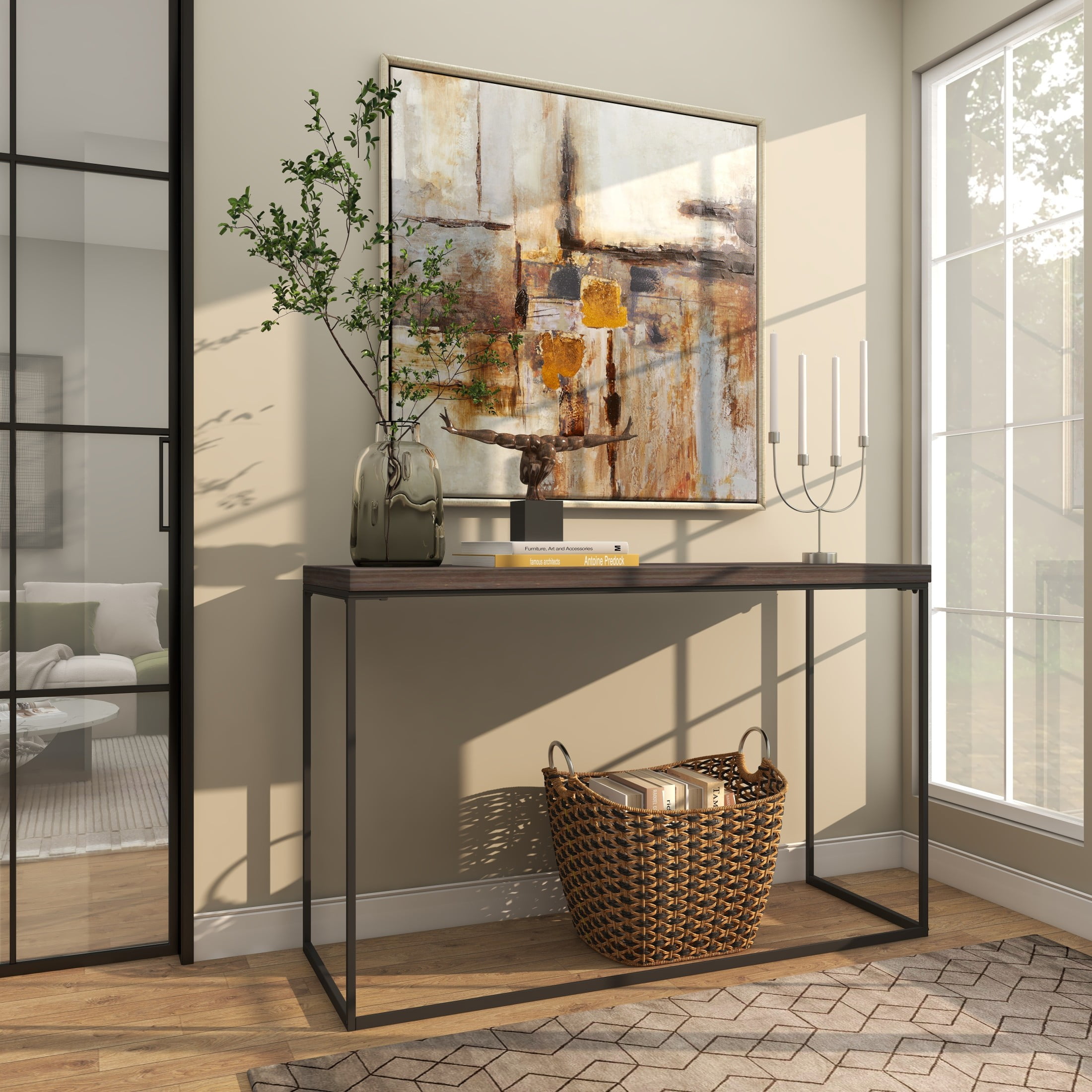 Embrace artistic expression with a style that highlights bold designs with sleek lines, neutral elements, and a minimalist aesthetic This dark brown living room console table is crafted from high-quality pine wood and iron, ensuring longevity and elegance Rectangle living room furniture boasts an oiled dark brown finish and black-colored metal legs, creating a modern and sophisticated look Notable features of this pine console table include its minimalistic design and sleek lines that exude modernity The dark brown wood console table measures 52L x 18W x 33H inches, and weighs 20.31 lbs Oiled dark brown home table’s rectangular shape gives it a clean, geometric aesthetic that fits well with contemporary decor styles Wipe clean with a dry cloth The tabletop of the contemporary home console table is expertly carved from wood and attached to the welded iron legs, creating a unique and stylish piece Contemporary style DecMode 52″ x 33″ Dark Brown Wood Console Table with Black Metal Legs, 1-Piece makes a perfect addition to any home
