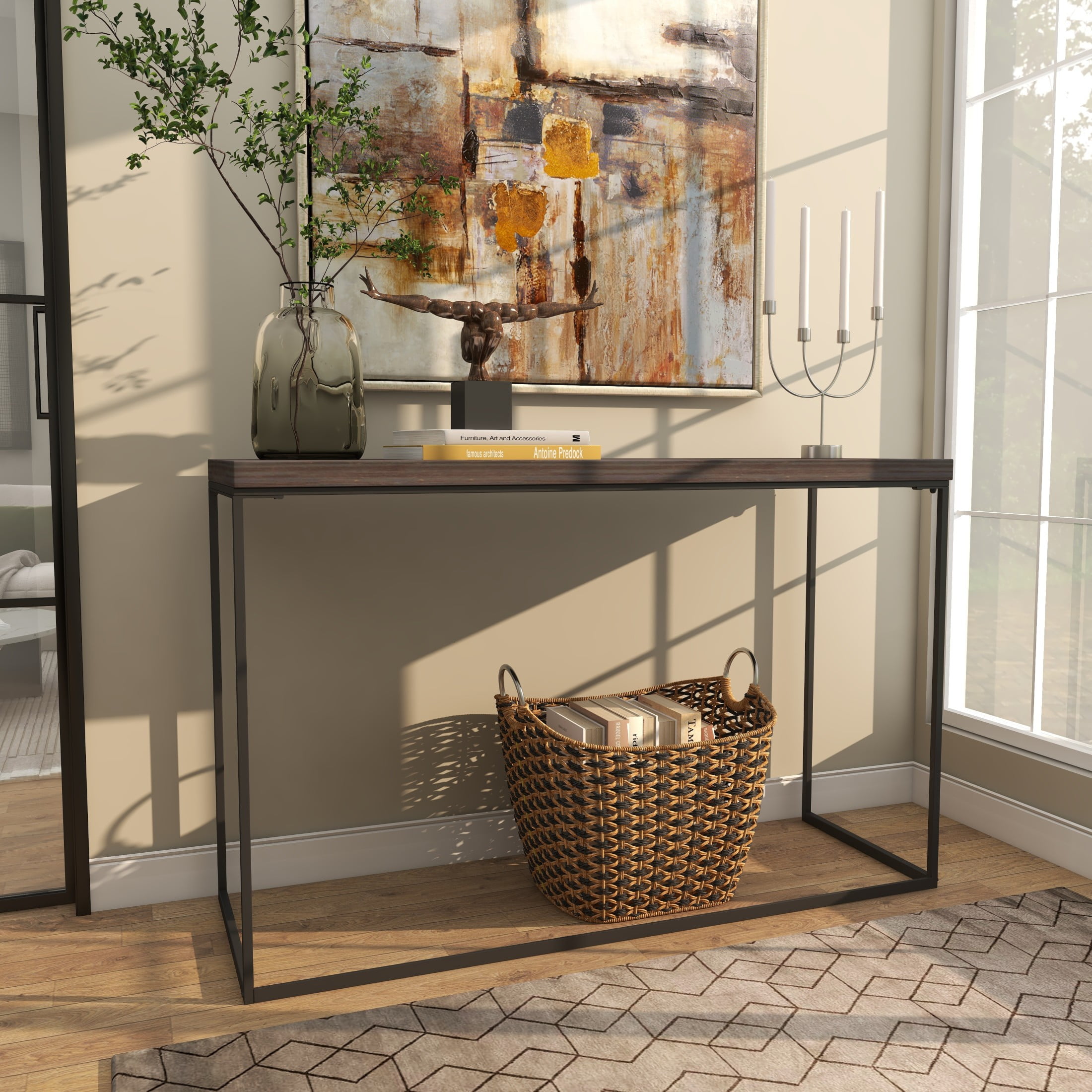 DecMode 52″ x 33″ Dark Brown Wood Console Table with Black Metal Legs, 1-Piece