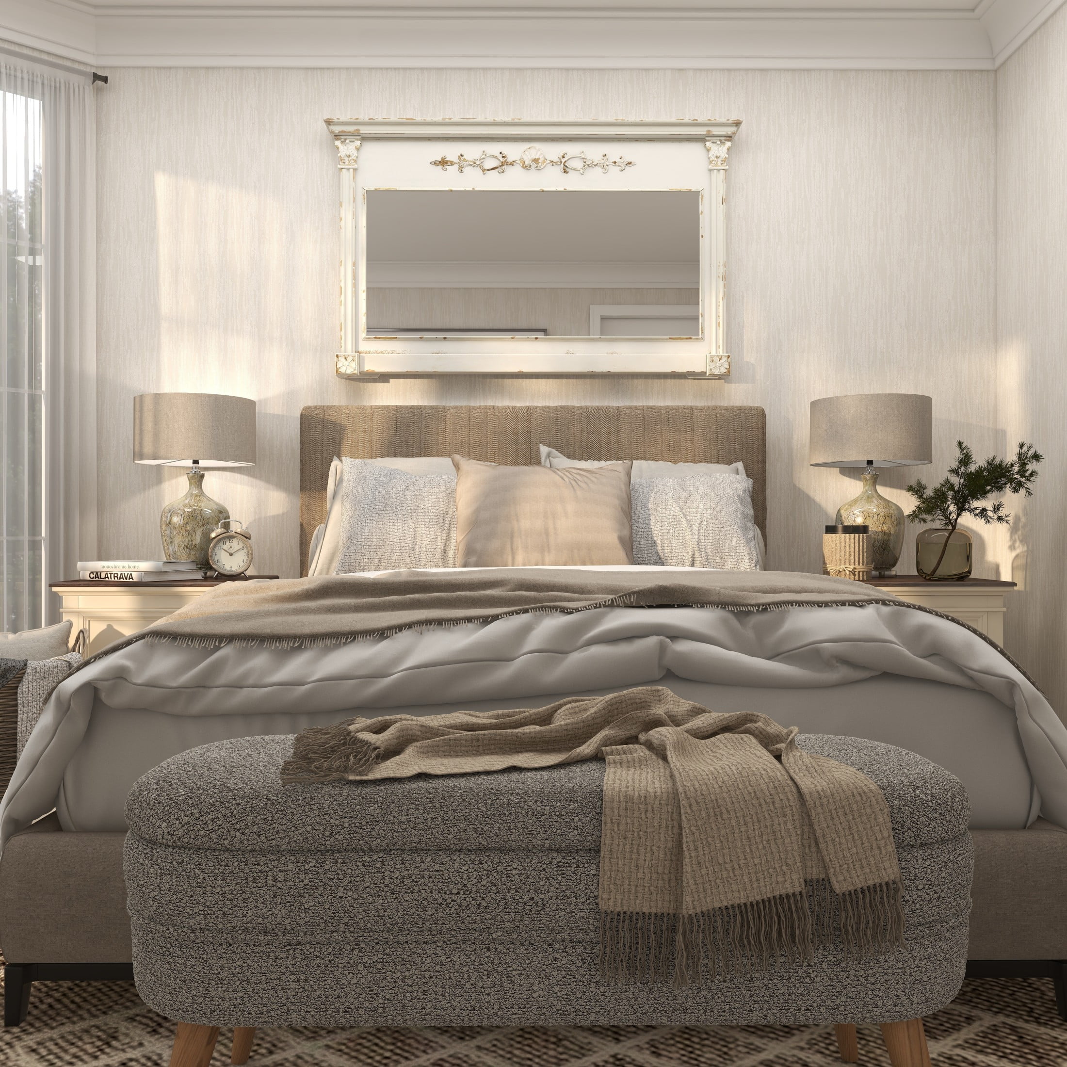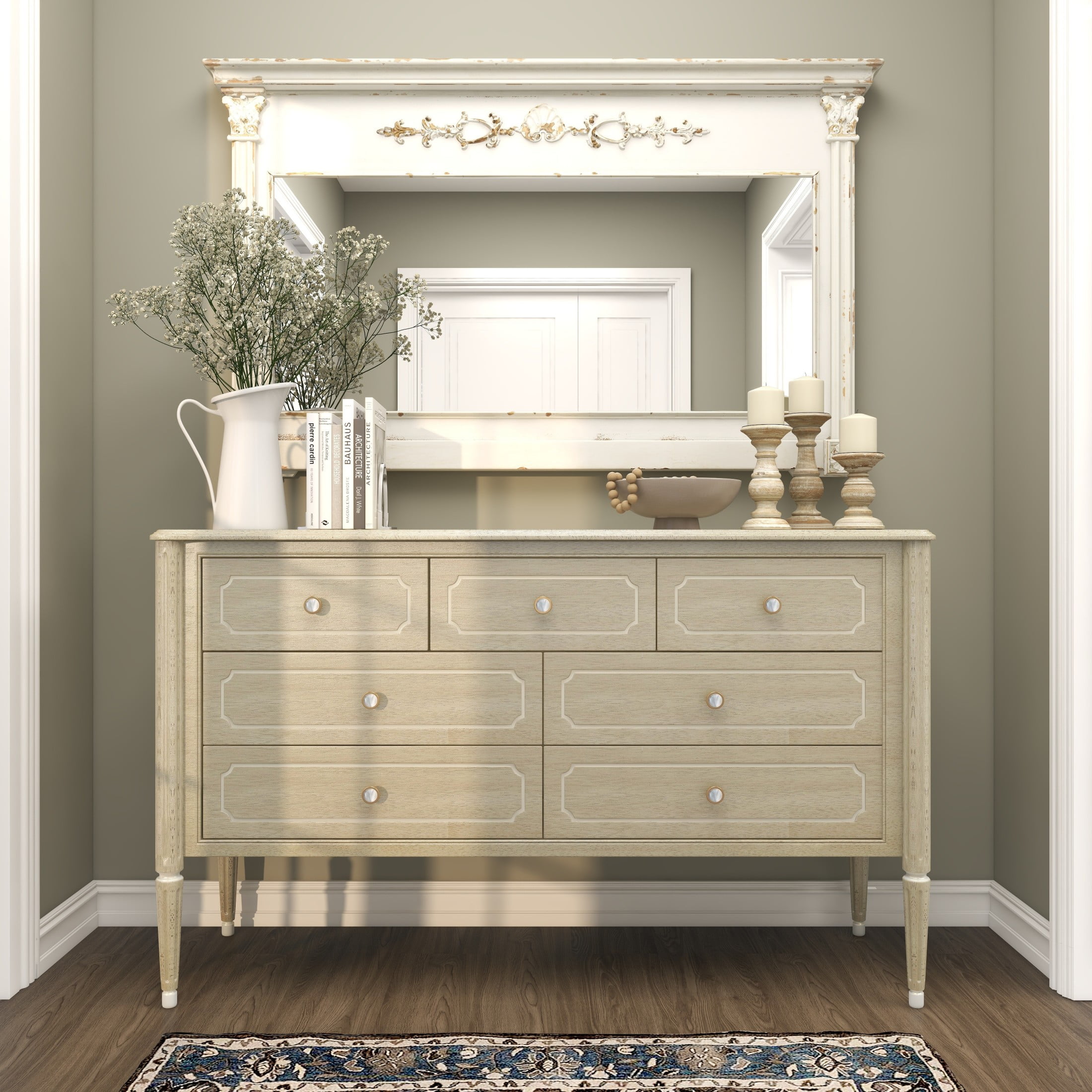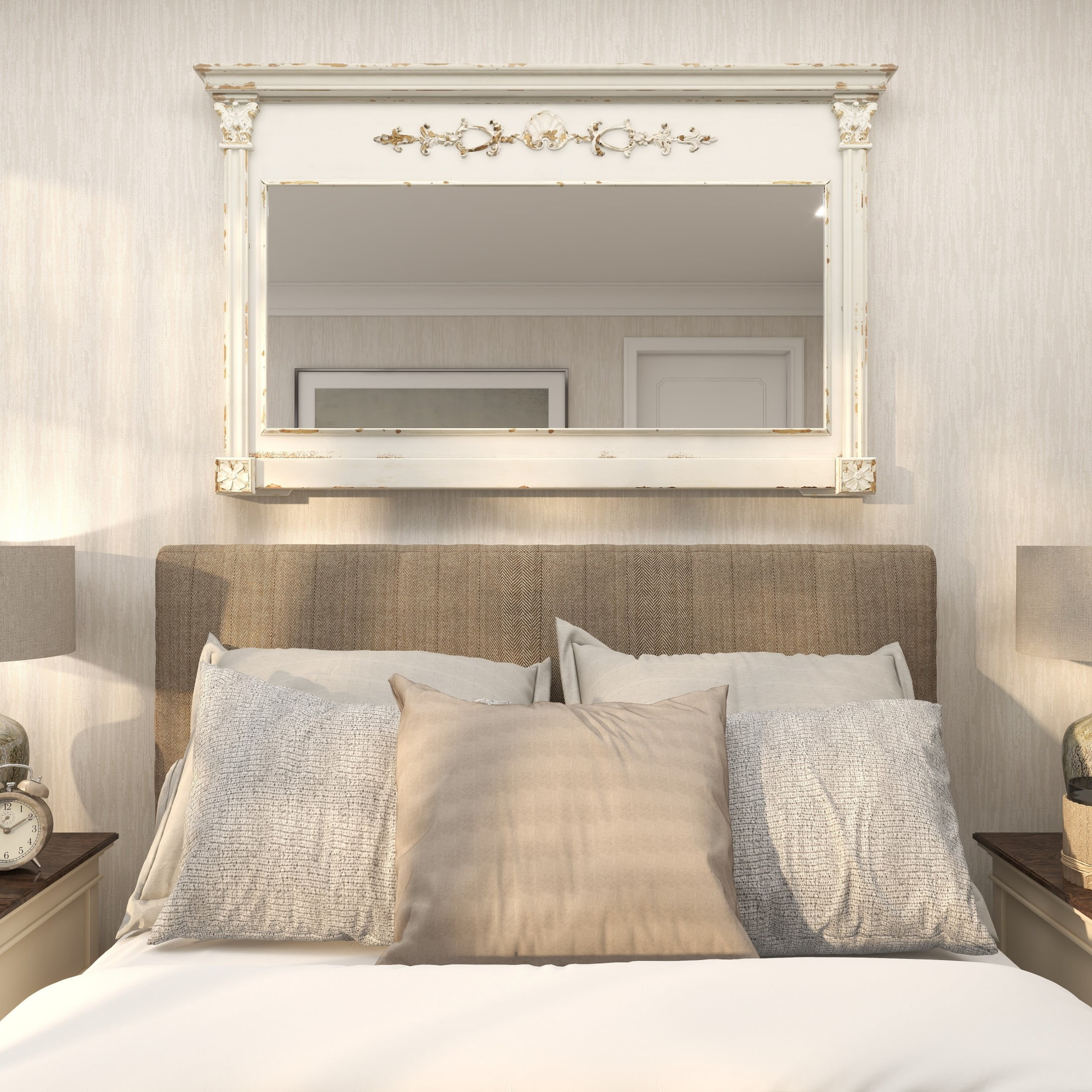 Infuse your home with romantic nostalgia and timeless grace, where ornate and antique details create a sanctuary of charm and warmth in the home Crafted from fir wood, MDF, and glass, this cream room wall mirror exudes an old-world charm that’s hard to ignore This rectangular hanging wall mirror displays a distressed light brown and cream finish, offering a vintage look to enhance any room The fir wall mirror features intricate scrollwork and boasts a vintage mantel mirror shape in a distressed white finish The cream wood wall mirror measures 59L x 4W x 36H inches, and weighs 41.80 lbs Highlighting its unique design, the distressed cream mirror for wall emphasizes a rectangular wooden frame adorned with textural carvings Wipe clean with a dry cloth This vintage accent wall mirror is constructed from wood for the frame with a carved wood design and MDF for the glass backing Vintage style DecMode 59″ x 36″ Cream Carved Floral Wall Mirror with Distressing makes a perfect addition to any home