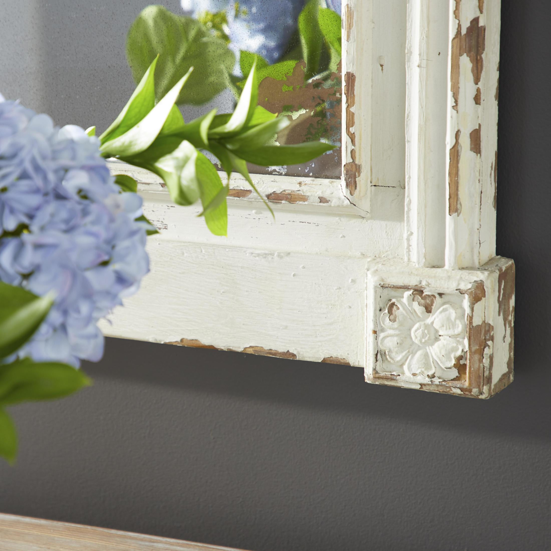 DecMode 59″ x 36″ Cream Carved Floral Wall Mirror with Distressing is a unique addition to your stylish home. Apart from decorating your home, the purpose of this wall mirror is to bounce back outdoor light to a small room to make it look bigger. Pair this decorative wall mirror with house plants or other wall decor accent pieces to blend everything together perfectly. Ideal for homes with farmhouse, vintage, or traditional styles, this floral entryway mirror will add character to your living room, bedroom, or any other indoor only setting. This item ships in 1 carton. Can be hung horizontally using the d-rings; nails and screws not included. Suitable for indoor use only. This item ships fully assembled in one piece. Made in India. This is a single cream colored entryway mirror. Vintage style.