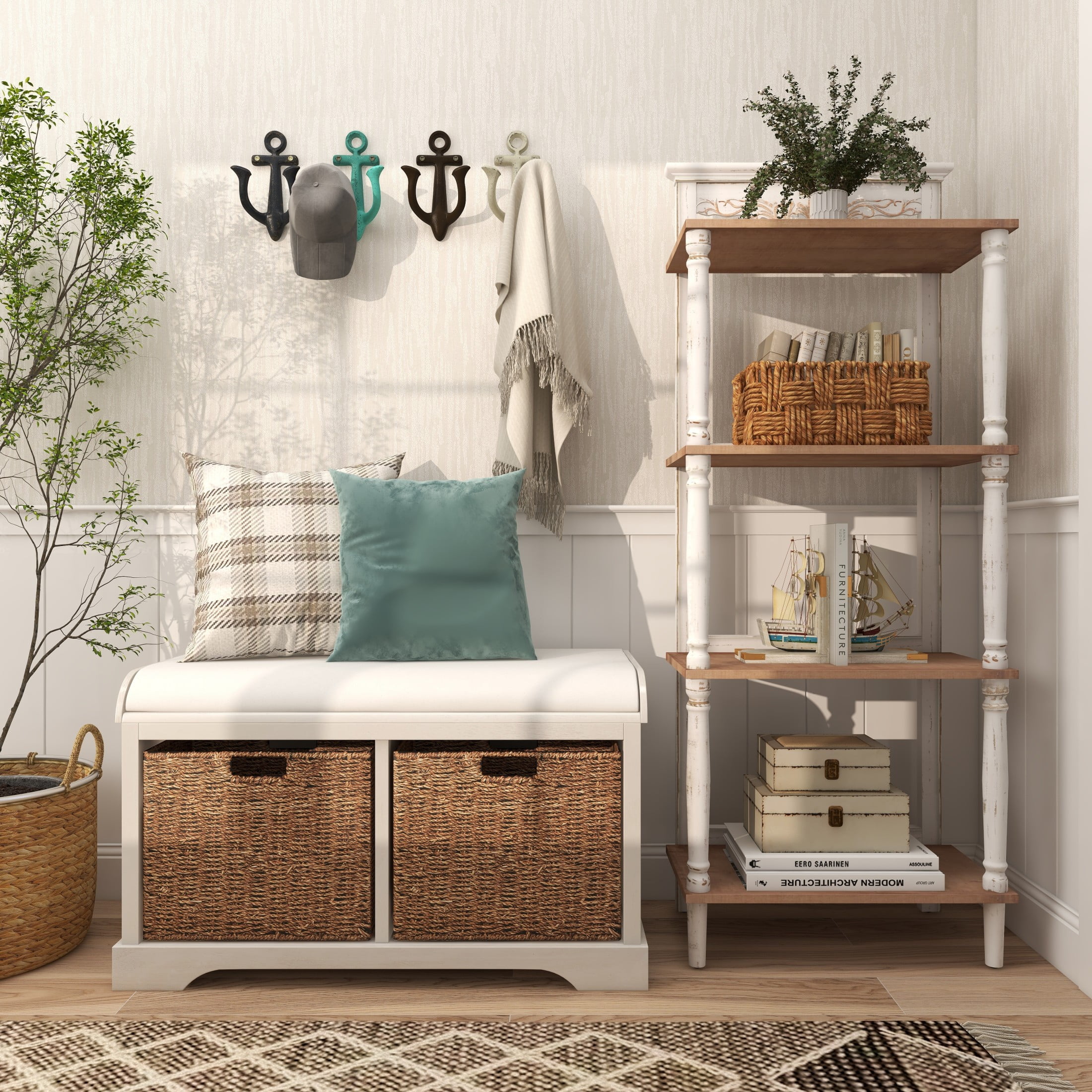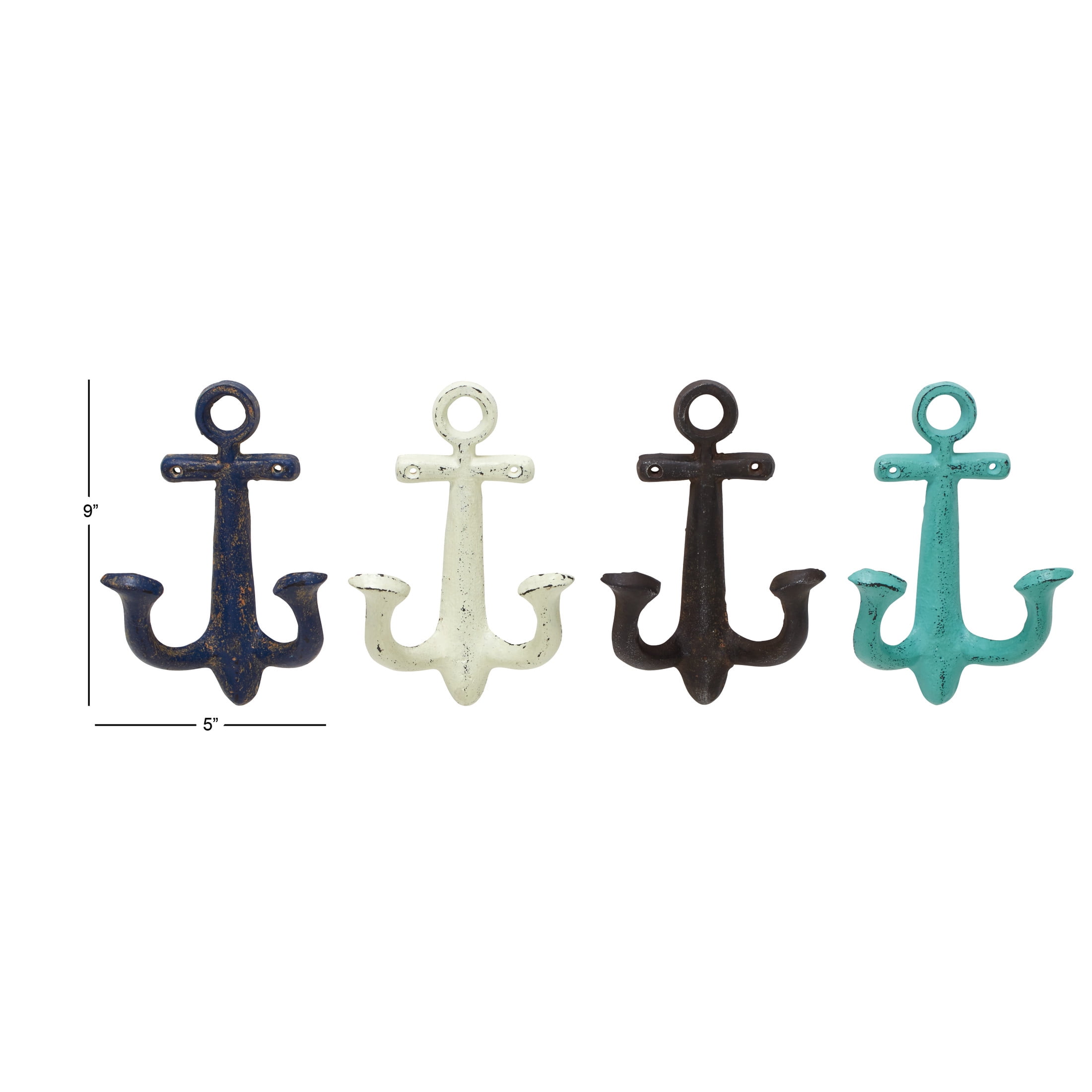 Inspired by blissful serenity and the allure of the sea, where soothing hues and natural textures bring effortless charm to the home The multicolored home wall hook set is crafted from solid iron, ensuring durability and strength This asymmetrical hooks for wall set features a distressed multicolored finish with navy blue, sky blue, white, and brown colors for a captivating display The iron set of 4 wall hooks features a multicolored anchor design that mounts securely to hold coats, keys, hats, and scarves Each multi colored metal wall hook measures 5L x 3.50W x 9H , 5L x 3.50W x 9H, 5L x 3.50W x 9H, 5L x 3.50W x 9H inches, and collectively weighs 7.14 lbs The distressed multicolored wall-mounted hooks showcase anchor shapes complete with circular ring details for a captivating display Wipe clean with a dry cloth The coastal set of 4 wall hooks for hanging is forged from iron to form anchor shapes with protruding hook sections and given a distressed multicolored finish Coastal style DecMode 5″W, 9″H Multi Colored Metal Single Hanger Anchor Wall Hook, 4-Pieces makes a perfect addition to any home