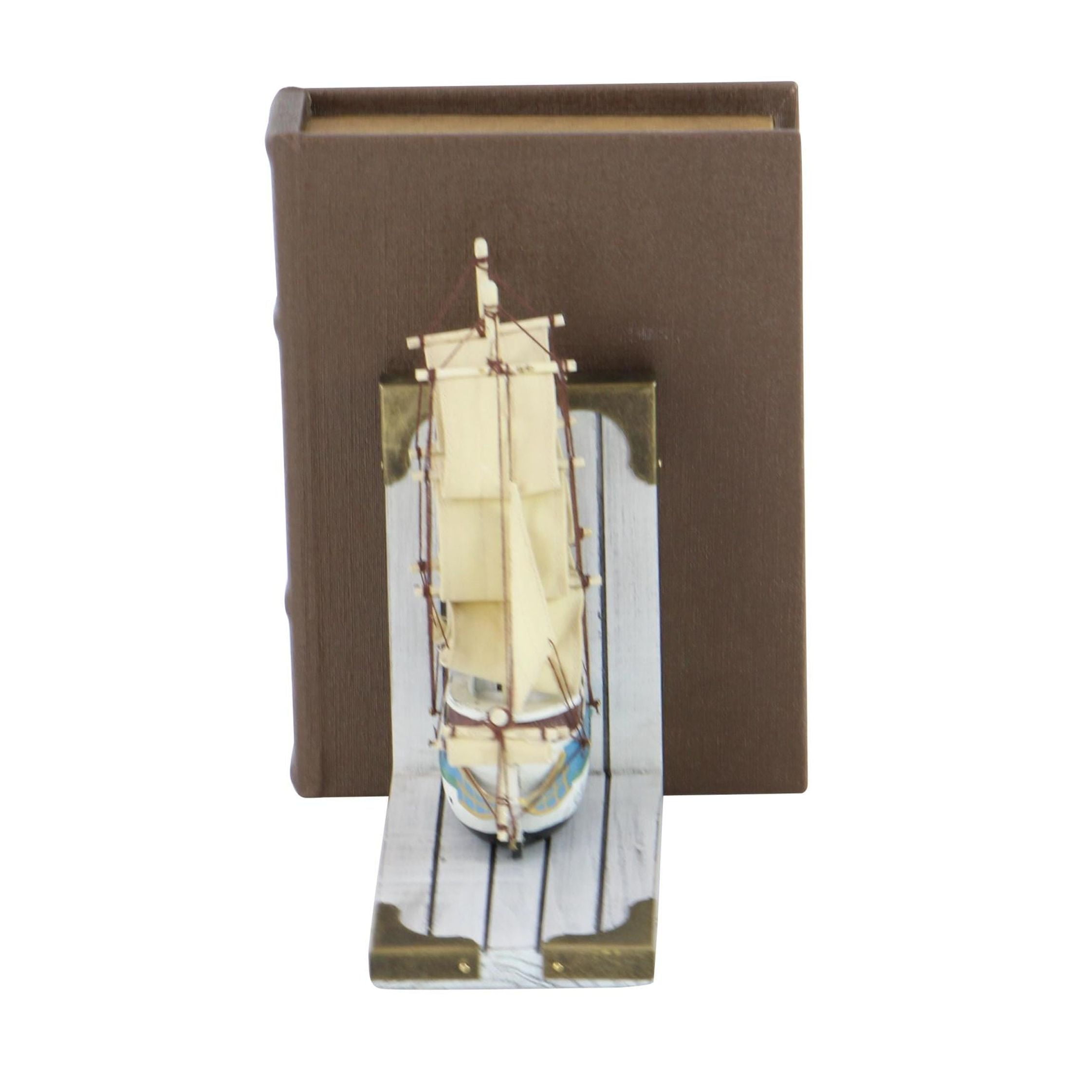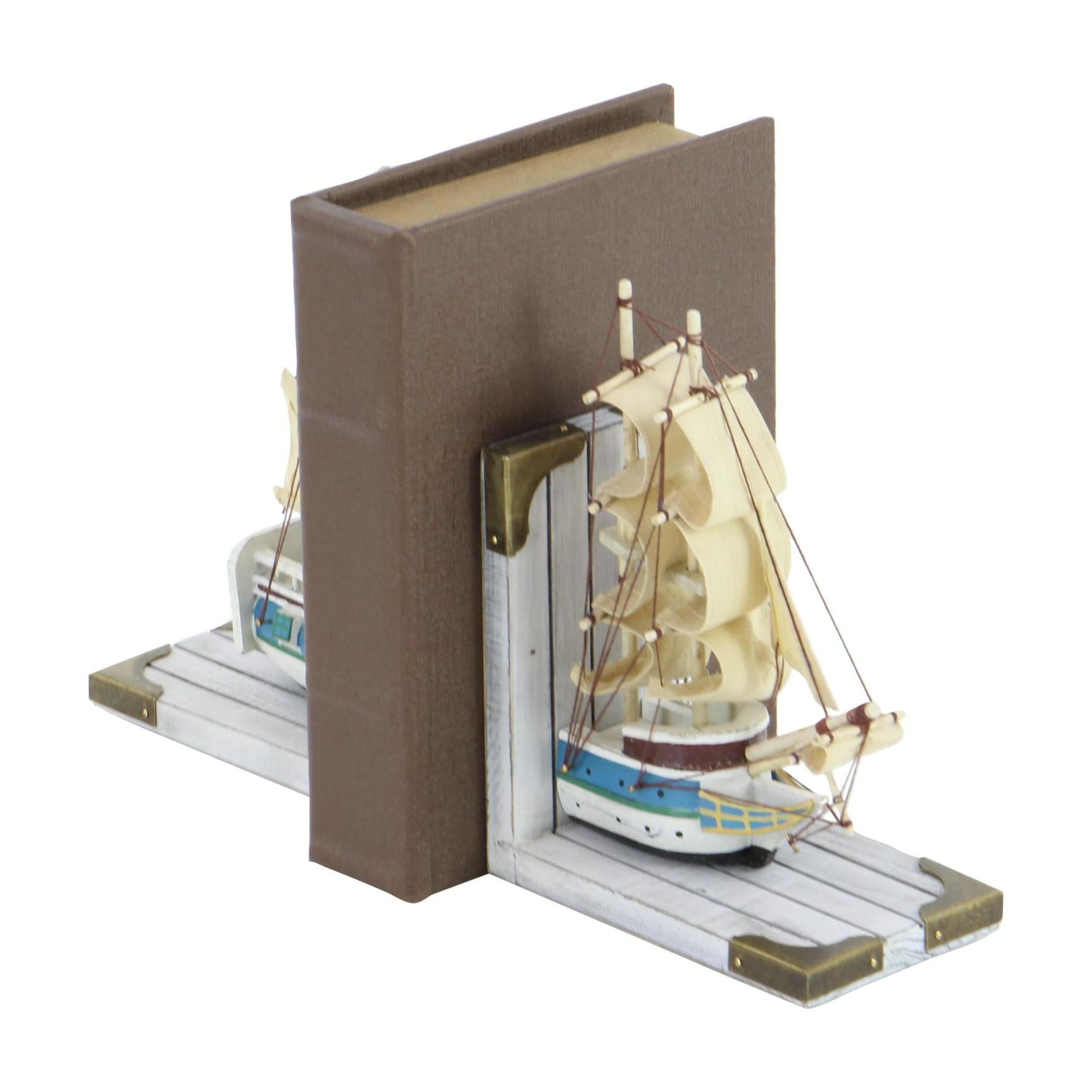 Inspired by blissful serenity and the allure of the sea, where soothing hues and natural textures bring effortless charm to the home White decorative bookends set is made of natural pine wood material and canvas Rectangular book stopper set features a distressed white finish with beige accents on the base, adorned with red, blue, green, and black detailing on the sailboat Wood set of 2 bookends boasts ship sculptures cut at the midsection, placed on L-shaped wood platforms for secure display, adding a nautical touch to any space Each white wood bookend measures 6L x 4W x 9H , 6L x 4W x 9H inches, and collectively weighs 1.98 lbs Distressed white book organizer showcases realistic boat details attached to the rectangular-shaped base Wipe clean with a dry cloth Crafted from wood, this coastal set of 2 book display stand is meticulously assembled using intricate miniature parts to form a ship-inspired silhouette Coastal style DecMode 6″ Sail Boat White Wood Bookends with Real Boat Rigging and Gold Corners (Set of 2) makes a perfect addition to any home