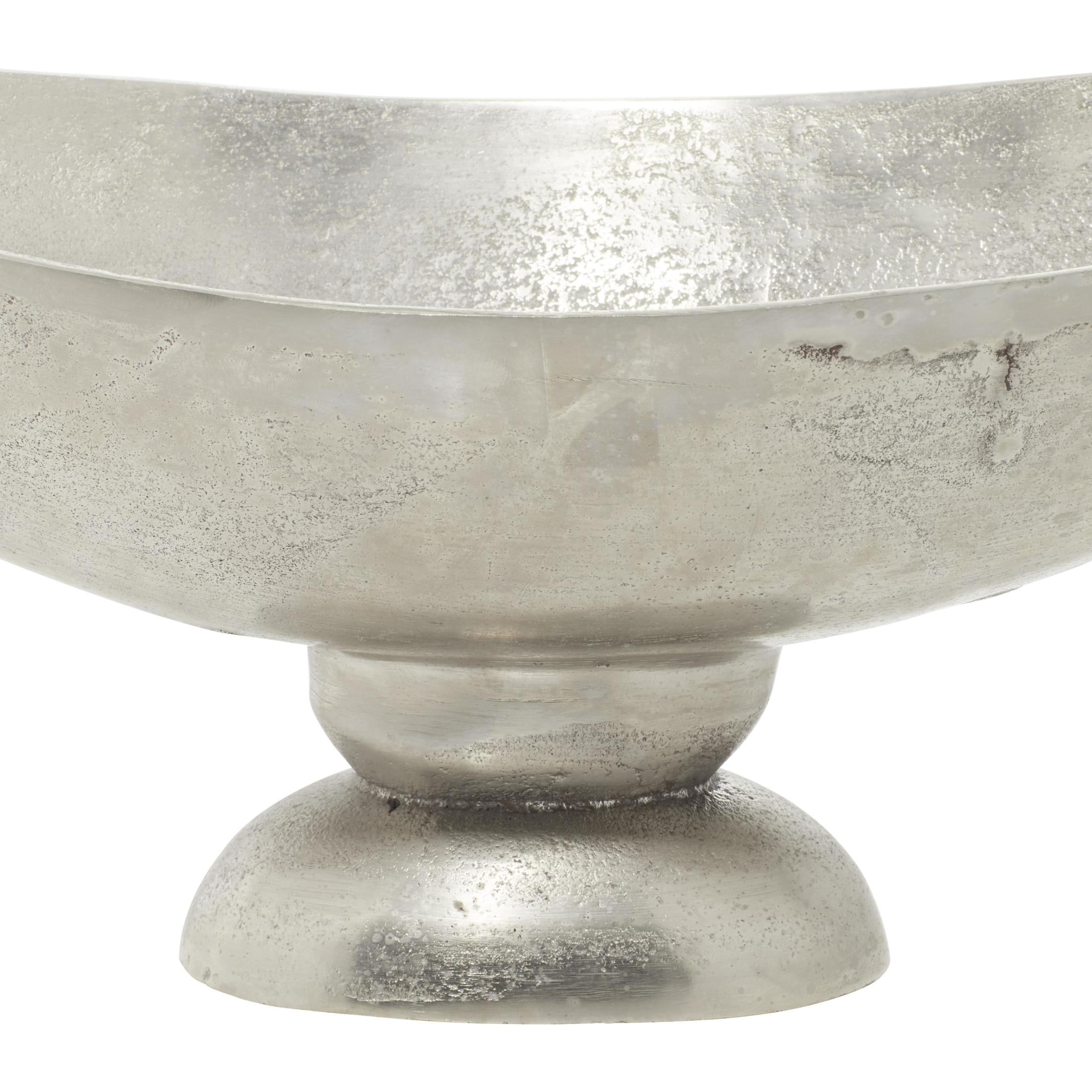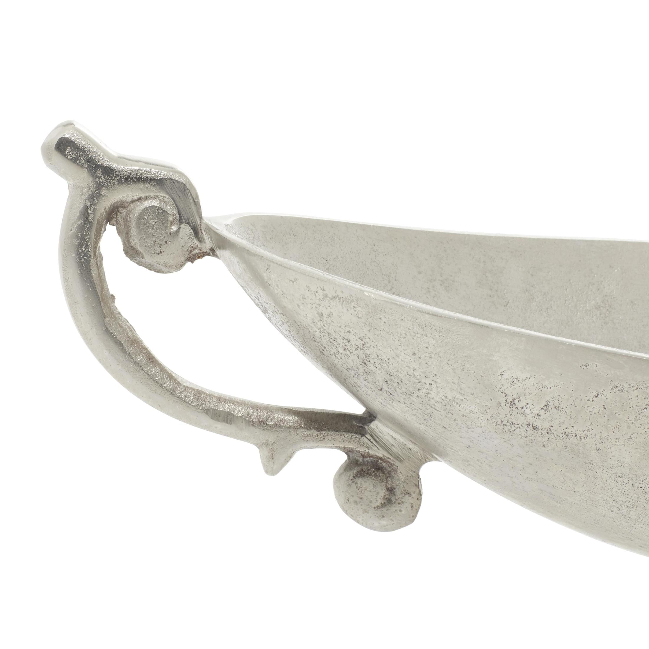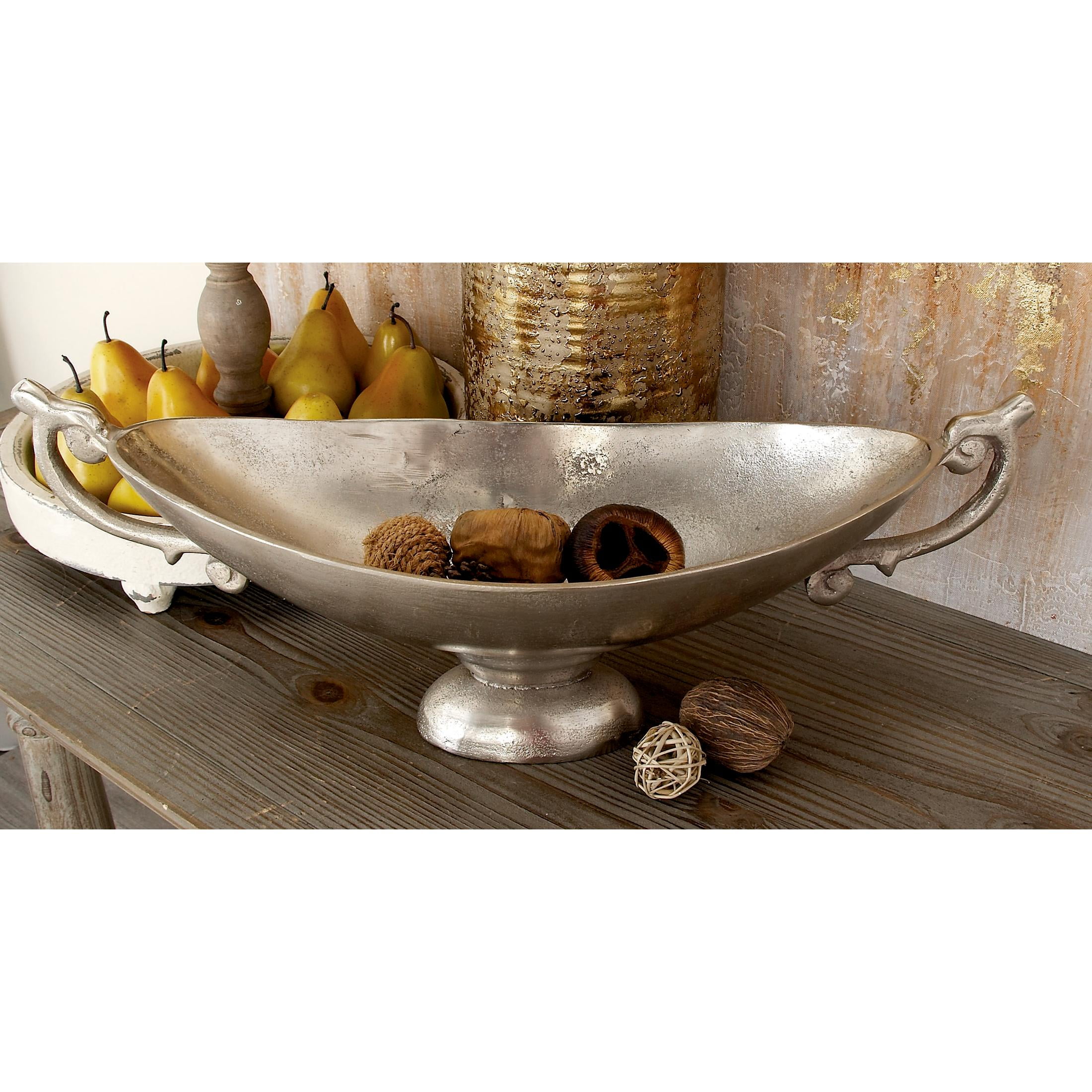 Designed with timeless sophistication, rich old-world textures and warm hues come together for a refined classic taste of luxury Silver large decorative bowl is crafted from aluminum materials, ensuring durability and timeless appeal Oval fruit bowl for kitchen counter comes in a satin silver finish, showcasing a refined and elegant look Designed with ornate, cut-out scroll handles, the aluminum dining table centerpiece features a deep setting and wide opening The silver aluminum metal decorative bowl measures 22L x 8W x 9H inches, and weighs 4.13 lbs Satin silver decorative bowl for kitchen counter displays and oval shape with elaborate scrolled handles and a minimalist curved base Wipe clean with a dry cloth Traditional kitchen decor is expertly welded from aluminum to form a seamless structure Traditional style DecMode 8″ Oval Silver Aluminum Metal Decorative Bowl with Handles makes a perfect addition to any home