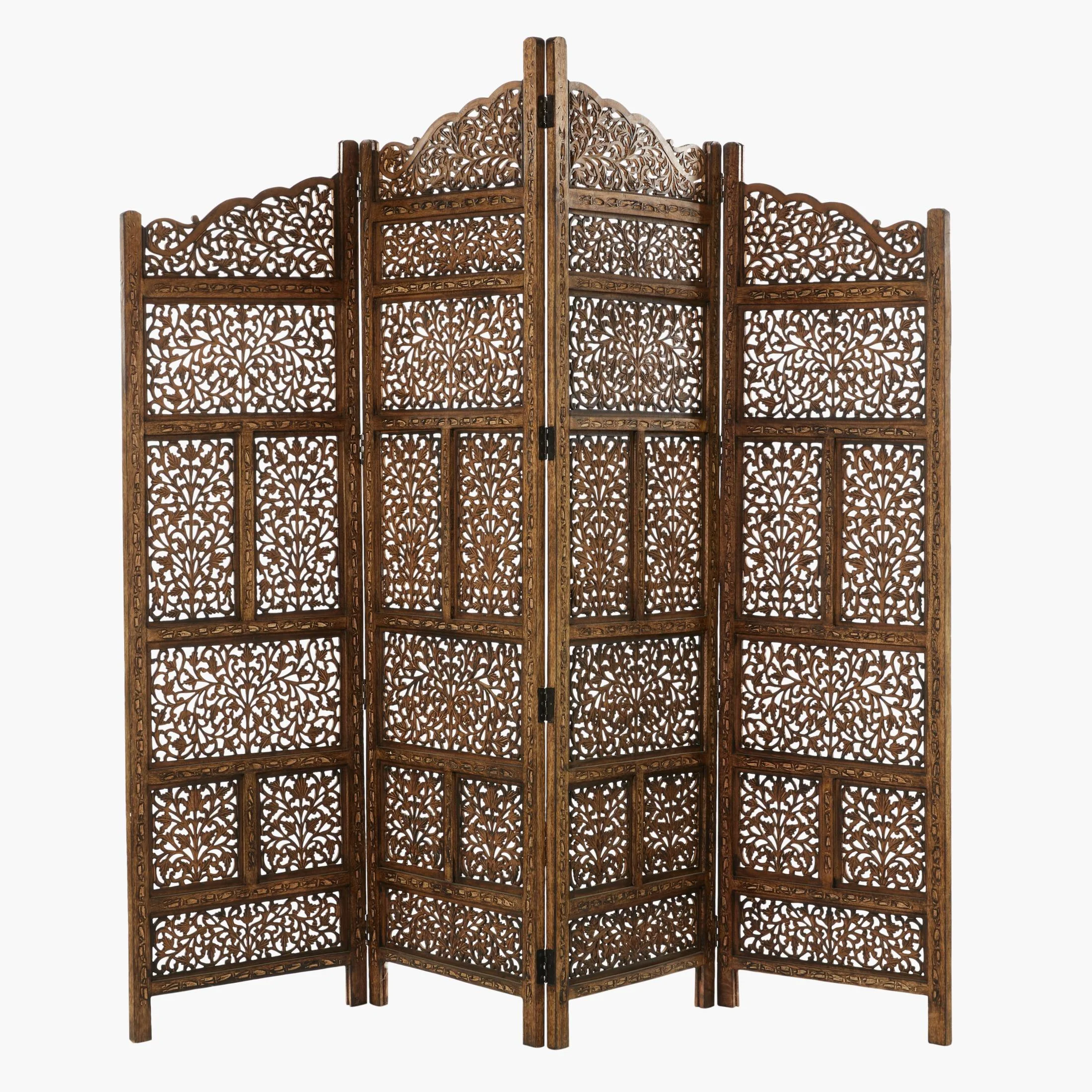 Designed with timeless sophistication, rich old-world textures and warm hues come together for a refined classic taste of luxury This brown partition room divider screen is expertly crafted from mango wood and MDF, ensuring a durable design that withstands the test of time Arched room divider and folding privacy screen showcases an oiled brown finish, complemented by intricate carving patterns that add a touch of traditional elegance Wood room divider screen features four large panels with floral cut-out designs and bar partitions in each panel, all structured in an elegant arch for refined style The brown wooden room divider screen measures 80L x 1W x 72H inches, and weighs 49.30 lbs Oiled brown room divider panel accentuates a rectangular standing form adorned with beautifully carved floral patterns, adding both functionality and aesthetic appeal to any space Wipe clean with a dry cloth Each panel of this traditional partition room divider has been carved and hinged together, demonstrating the artisan’s commitment to quality craftsmanship Traditional style DecMode 80″ x 72″ Brown Wooden Floral Handmade Foldable Partition 4 Panel Room Divider Screen with Carved Designs, 1-Piece makes a perfect addition to any home