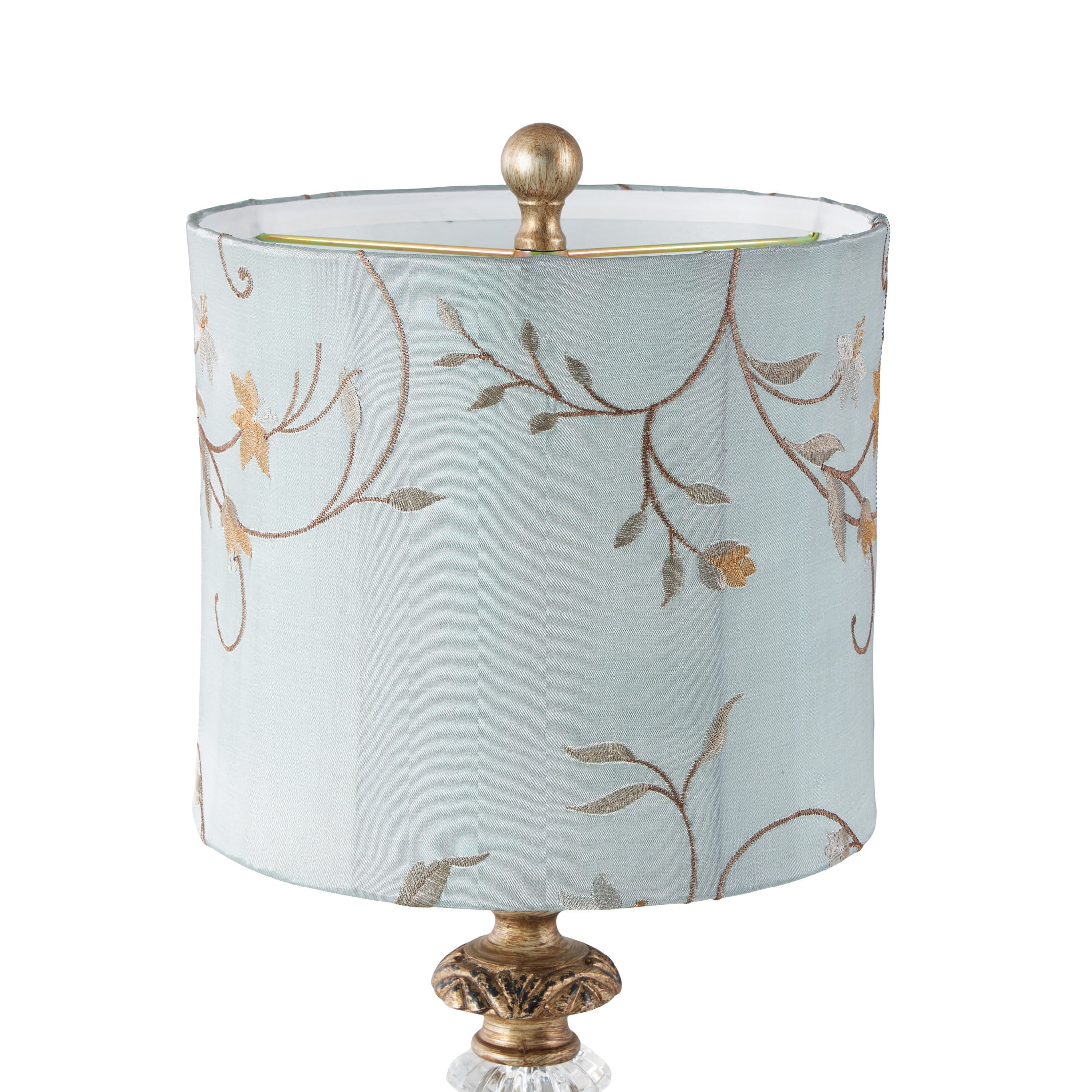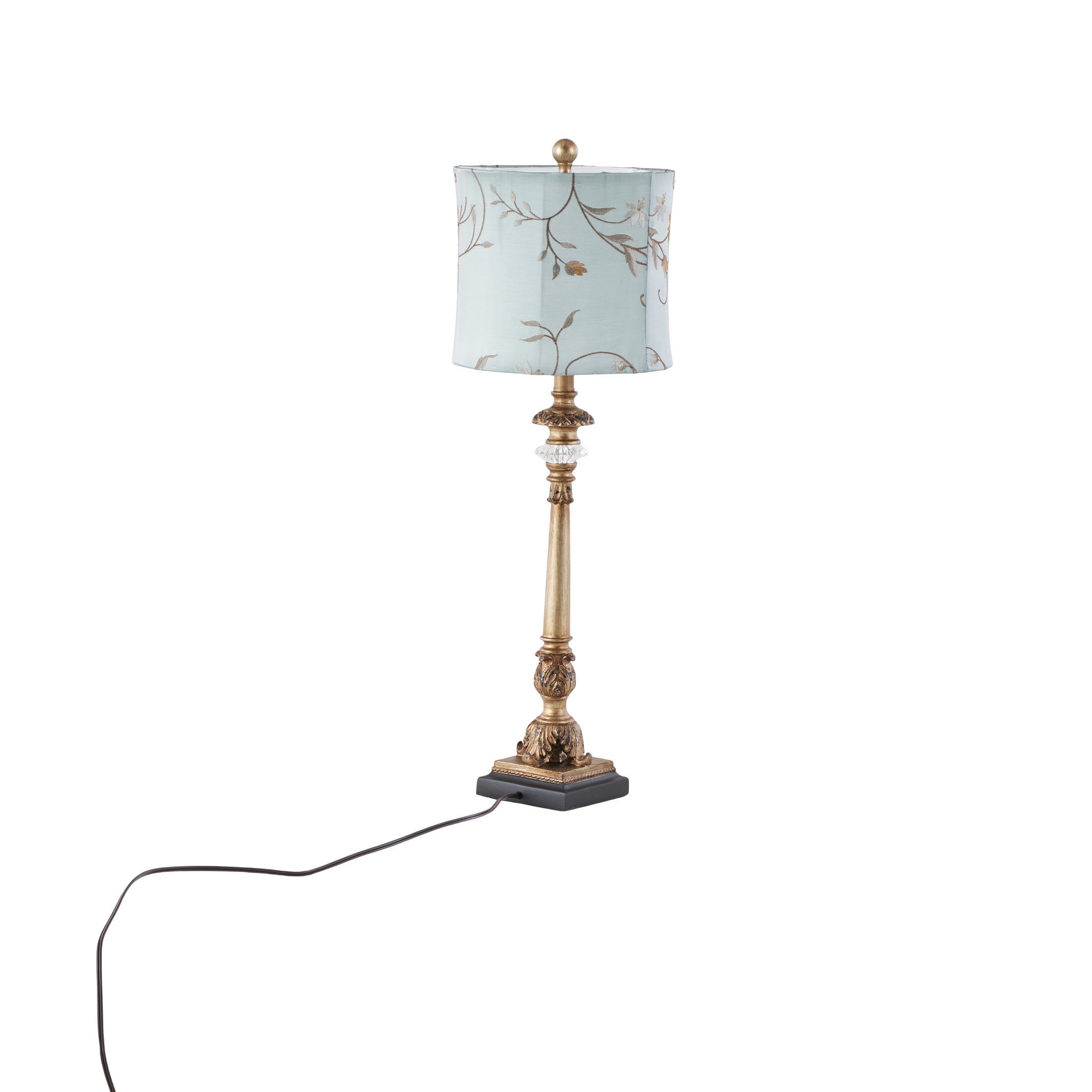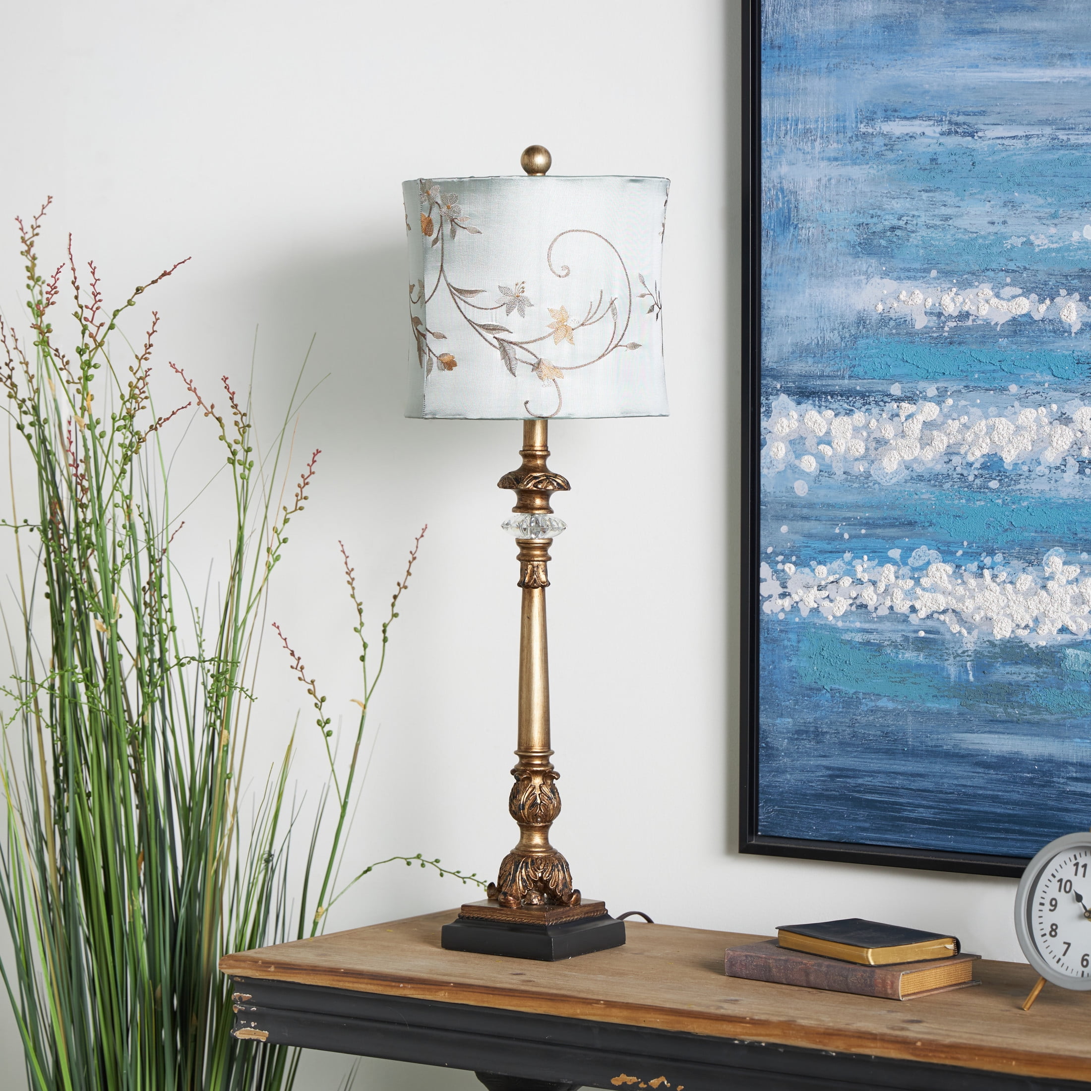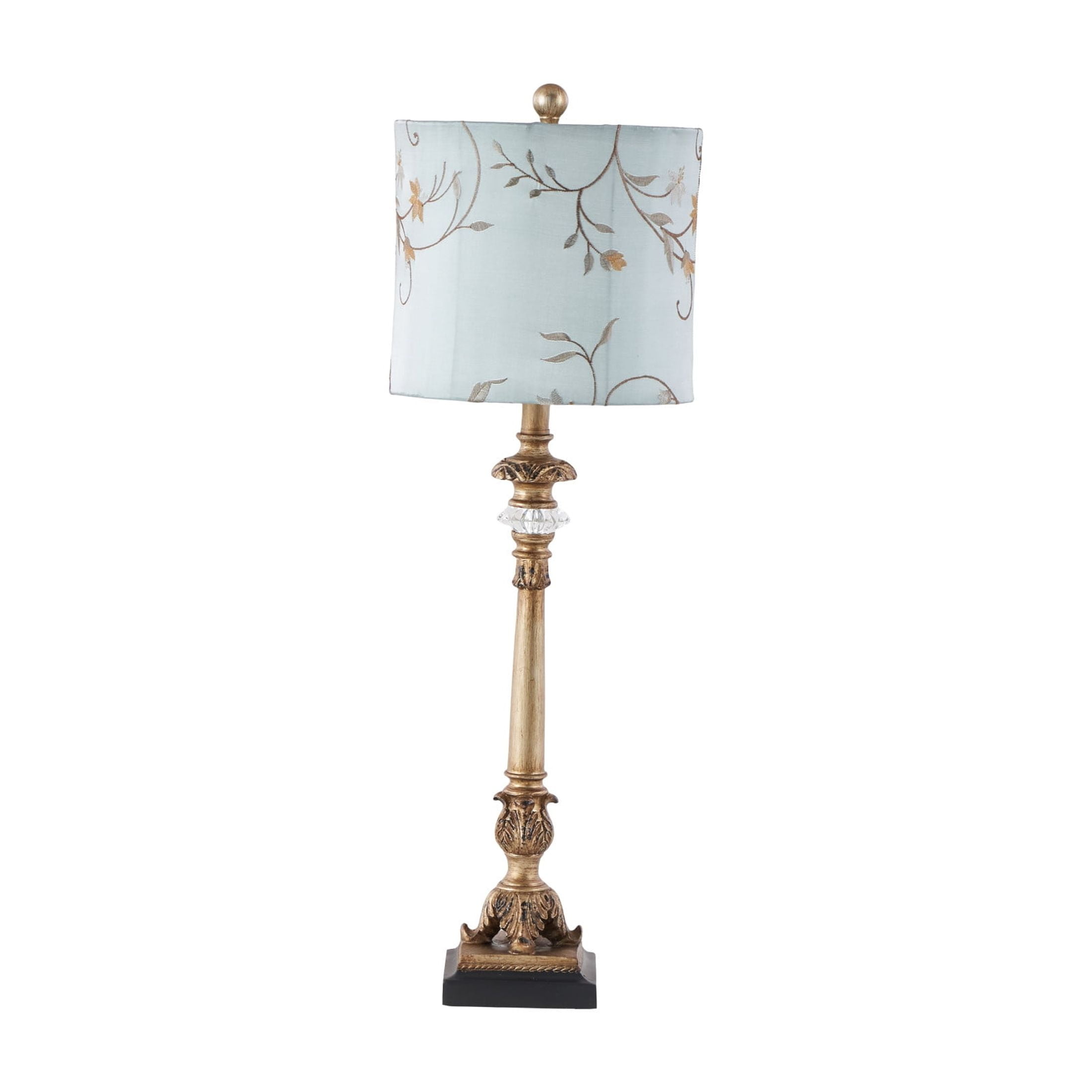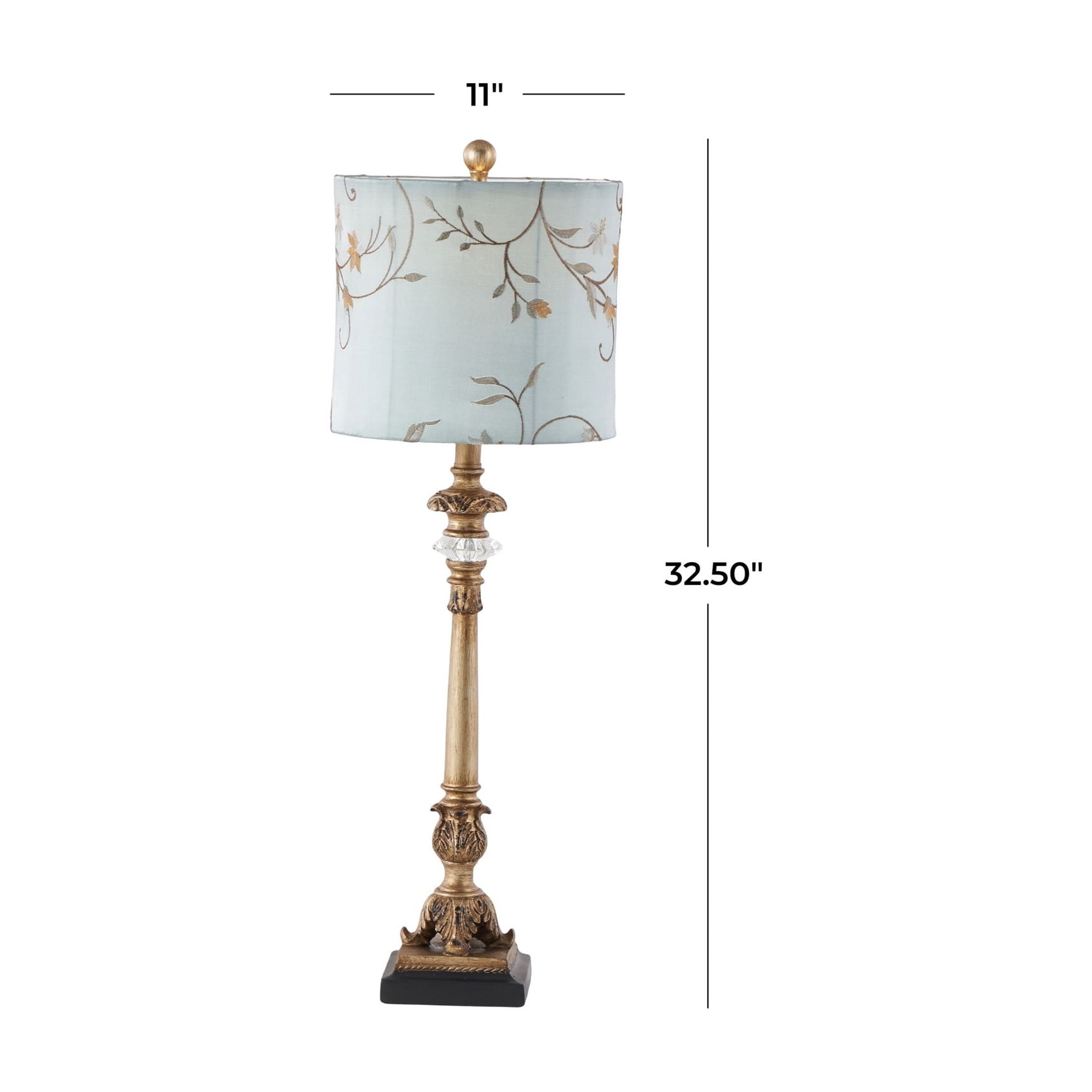 Immerse yourself in the harmony and beauty of pieces that unite natural textures with ornate details to create that Old World charm Crafted from iron, polystone, and linen, this gold room buffet lamp set exudes quality and durability The round buffet lamp for living room set showcases a satin gold and copper stand with a black base, complemented by a light blue shade with yellow and mauve patterns, and a clear crystal accent The iron set of 2 buffet lamps feature a unique and intricately detailed lamp post and a vintage inspired lamp shade with floral embroidery Each gold metal buffet lamp measures 11L x 11W x 32.50H inches, and weighs 4.27 lbs The satin gold buffet table lamp features intricate scroll details along the stand, a square base, and a hexagon lampshade with swirl floral patterns Wipe clean with a dry cloth The traditional living room table lamp is made from satin gold metal, attached to a carved polystone base, with an embroidered lampshade top Tuscan style DecMode Antique Style Floral Gold Buffet Lamp with Blue Fabric Shade (2 Count) makes a perfect addition to any home