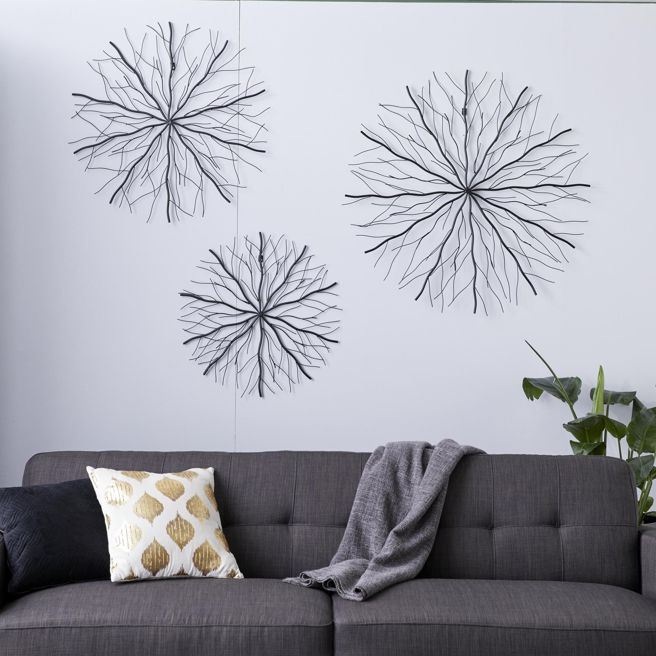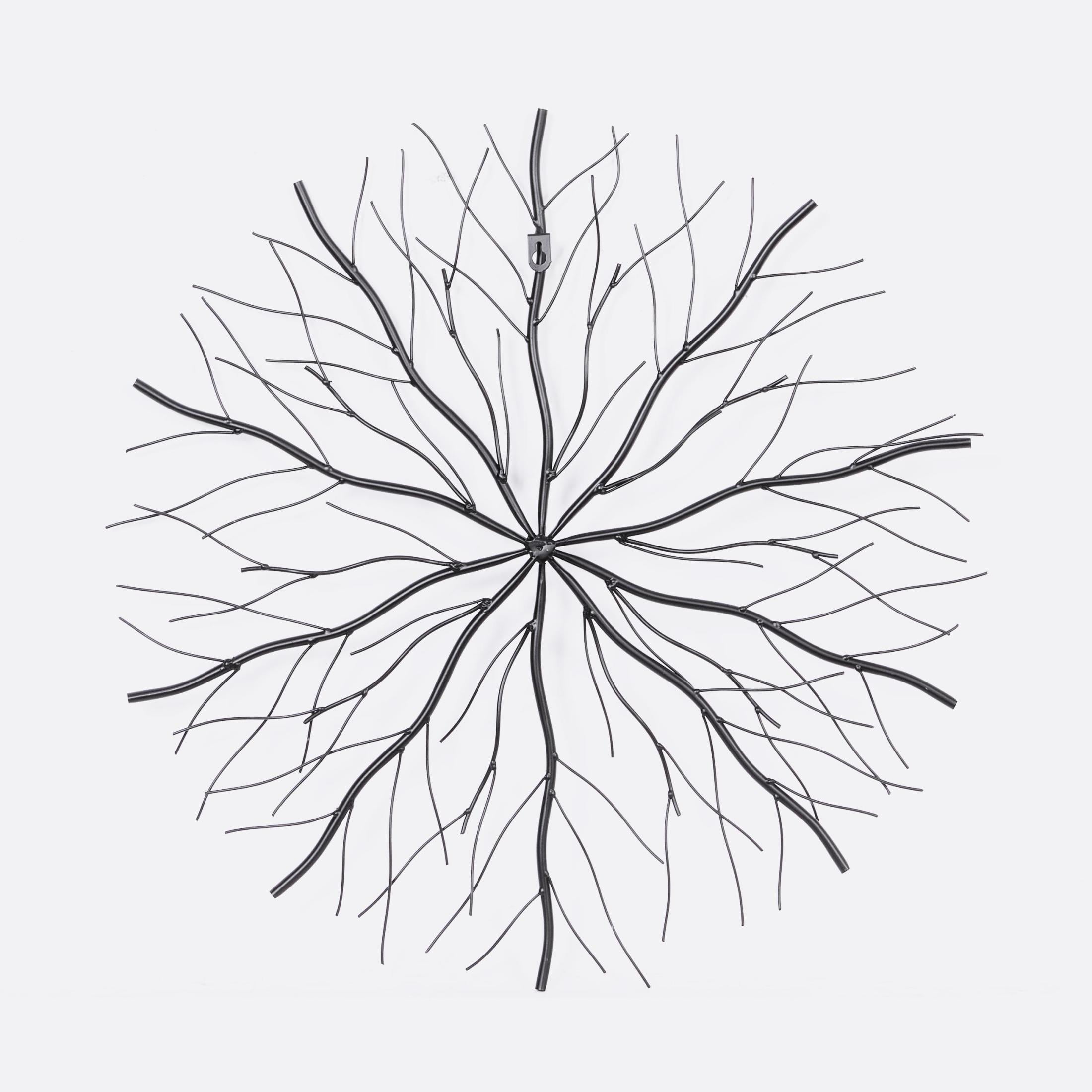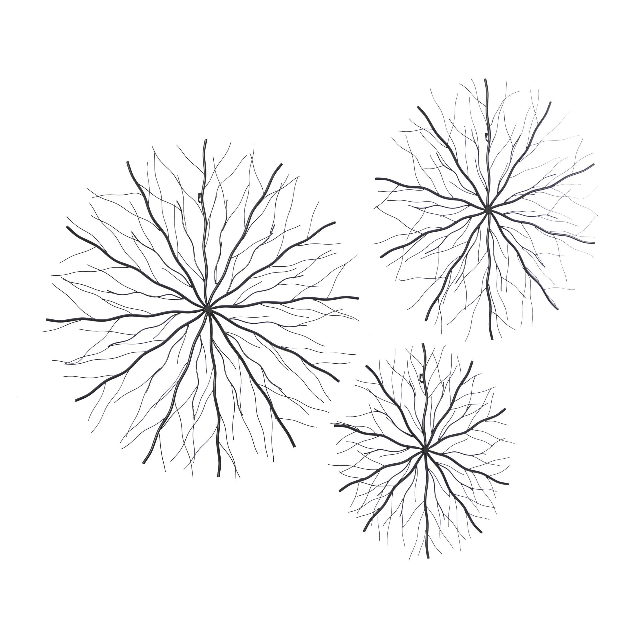 DecMode Black Metal Starburst Wall Decor with Branch Inspired Design (3 Count) is a unique addition to your stylish home. This starburst set of 3 wall sculptures can be added to your bedroom, living room, or entryway for an instant style upgrade. This item ships in 1 carton. Iron rods meet at the tips to create a 2D figure. Can be hung vertically using the keyholes; nails and screws not included. Suitable for indoor use only. This item ships fully assembled in one piece. This black colored iron wall sculptures comes as a set of 3. Contemporary style.
