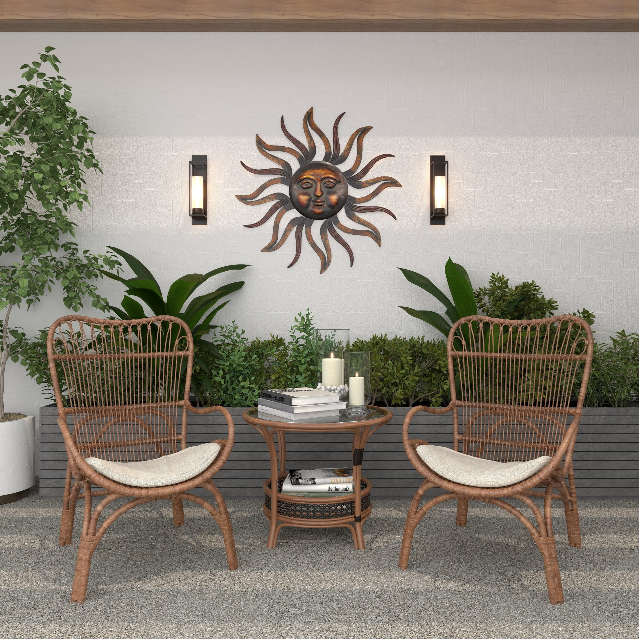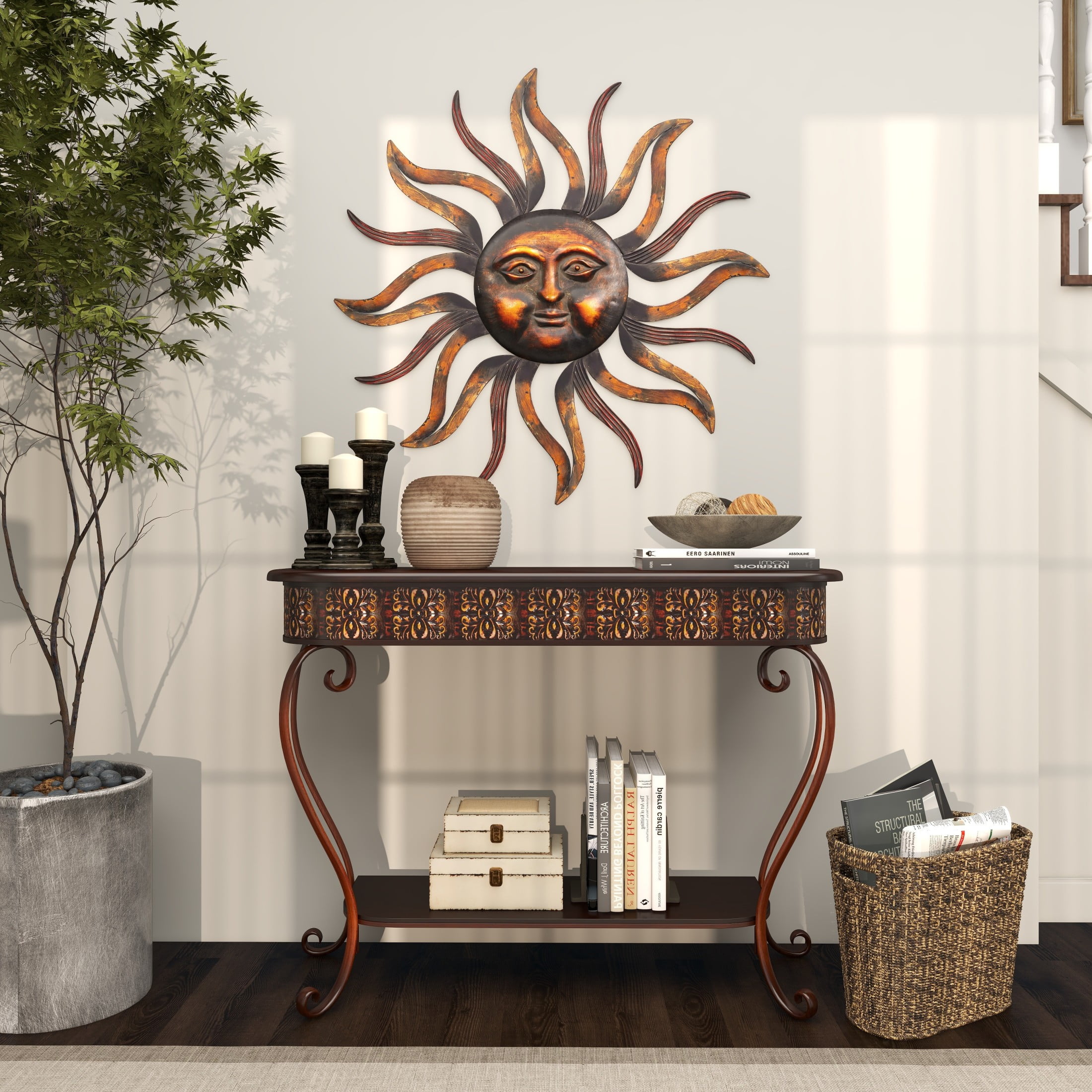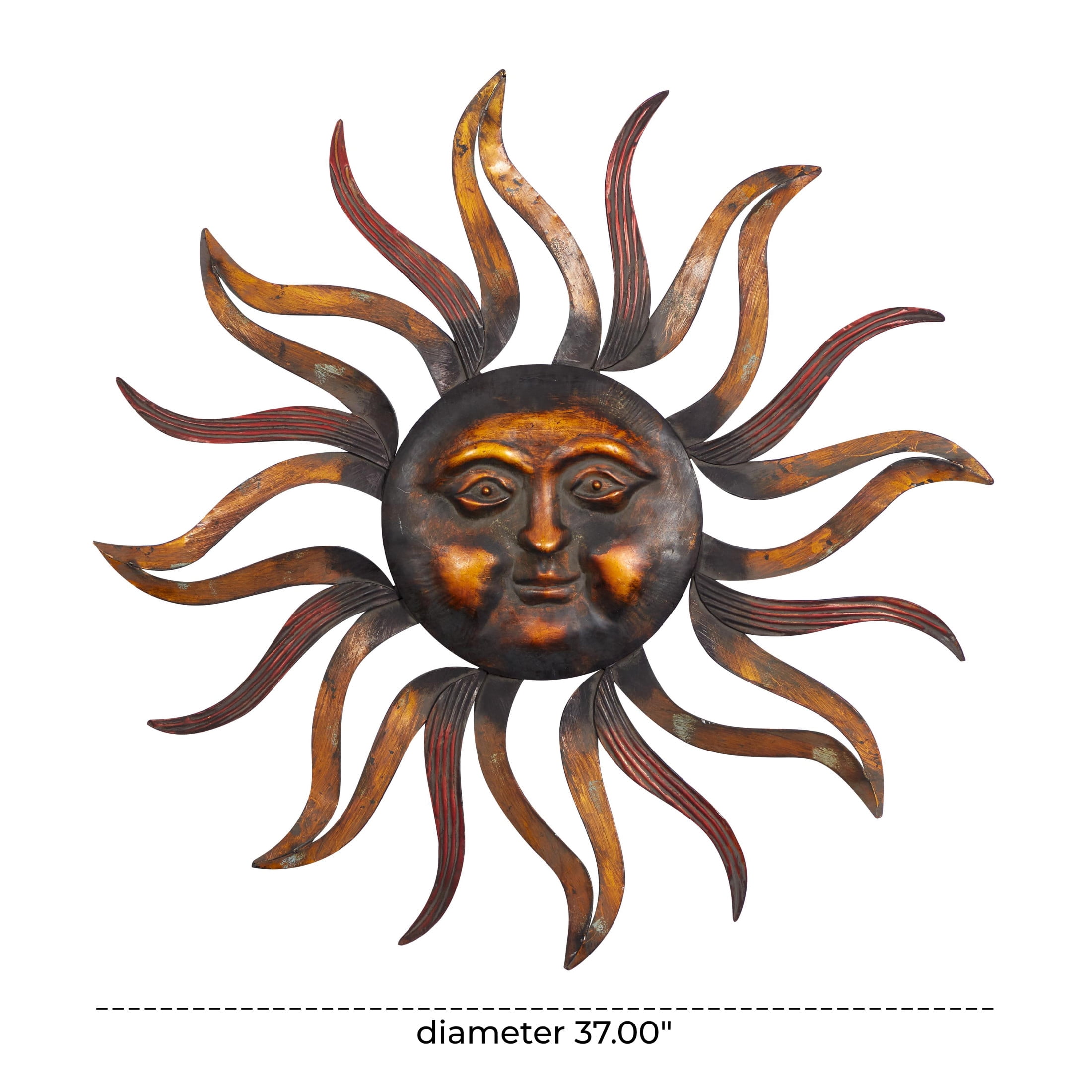 Designed with rugged beauty and an earthy charm, where natural simplicity, warmth, and organic materials create a wholesome atmosphere This brass home wall decor is made of iron, ensuring a solid and sturdy structure that can stand the test of time Round decor for wall showcases a rich, weathered metal finish in brass and is beautifully highlighted with copper As an iron wall decor, it features facial detailing and cut-out rays that create a unique focal point on any blank wall space The brass metal wall decor measures 37L x 1W x 37H inches, and weighs 4.51 lbs Weathered brass wall art for living room offers raised cut-out sun rays with embossed facial detailing and corrugated patterns, adding depth to its overall shape Wipe clean with a dry cloth This rustic room wall decor is crafted, with each metal material intricately carved to create a detailed sun face Rustic style DecMode Brass Metal Sun Wall Decor with Distressed Copper Like Finish makes a perfect addition to any home