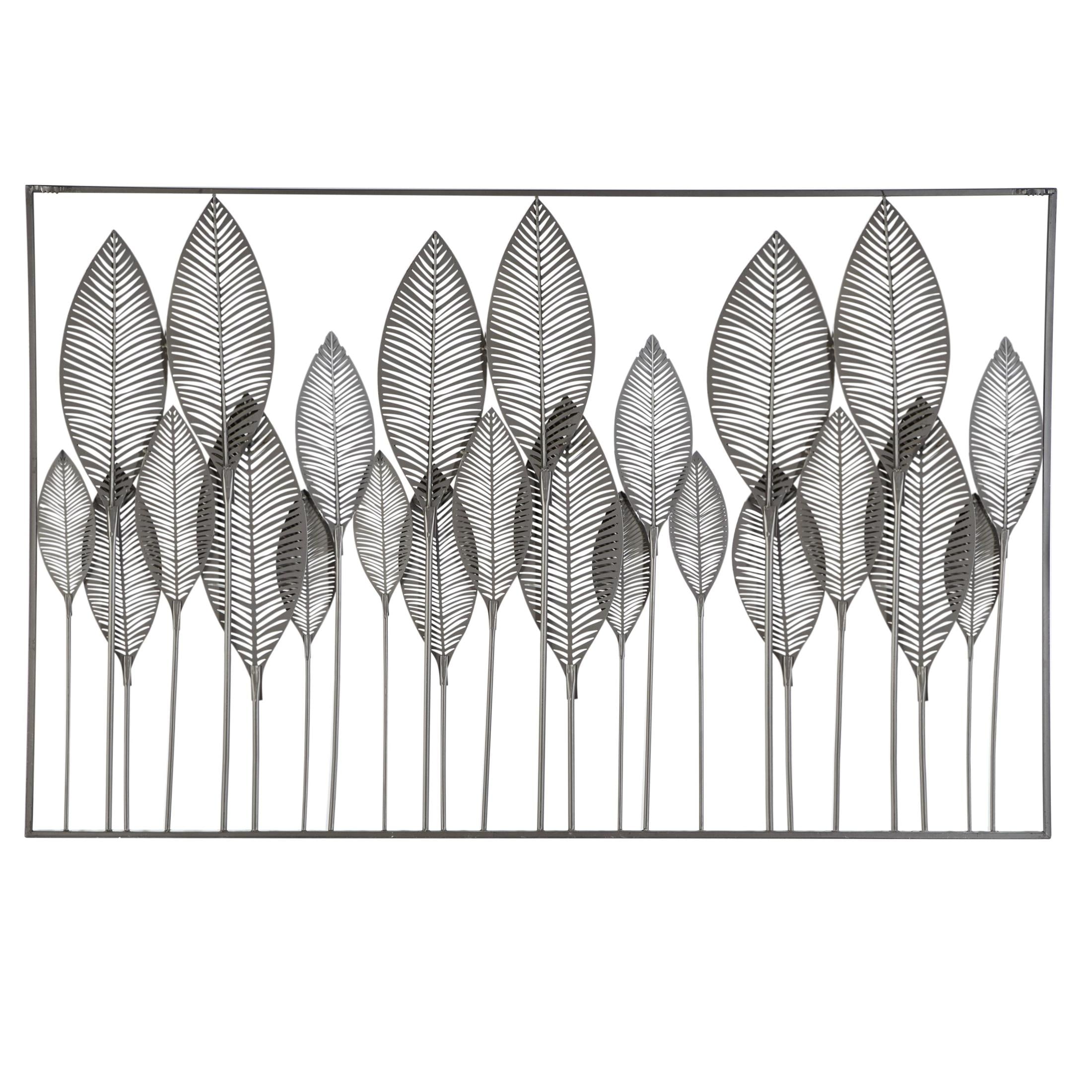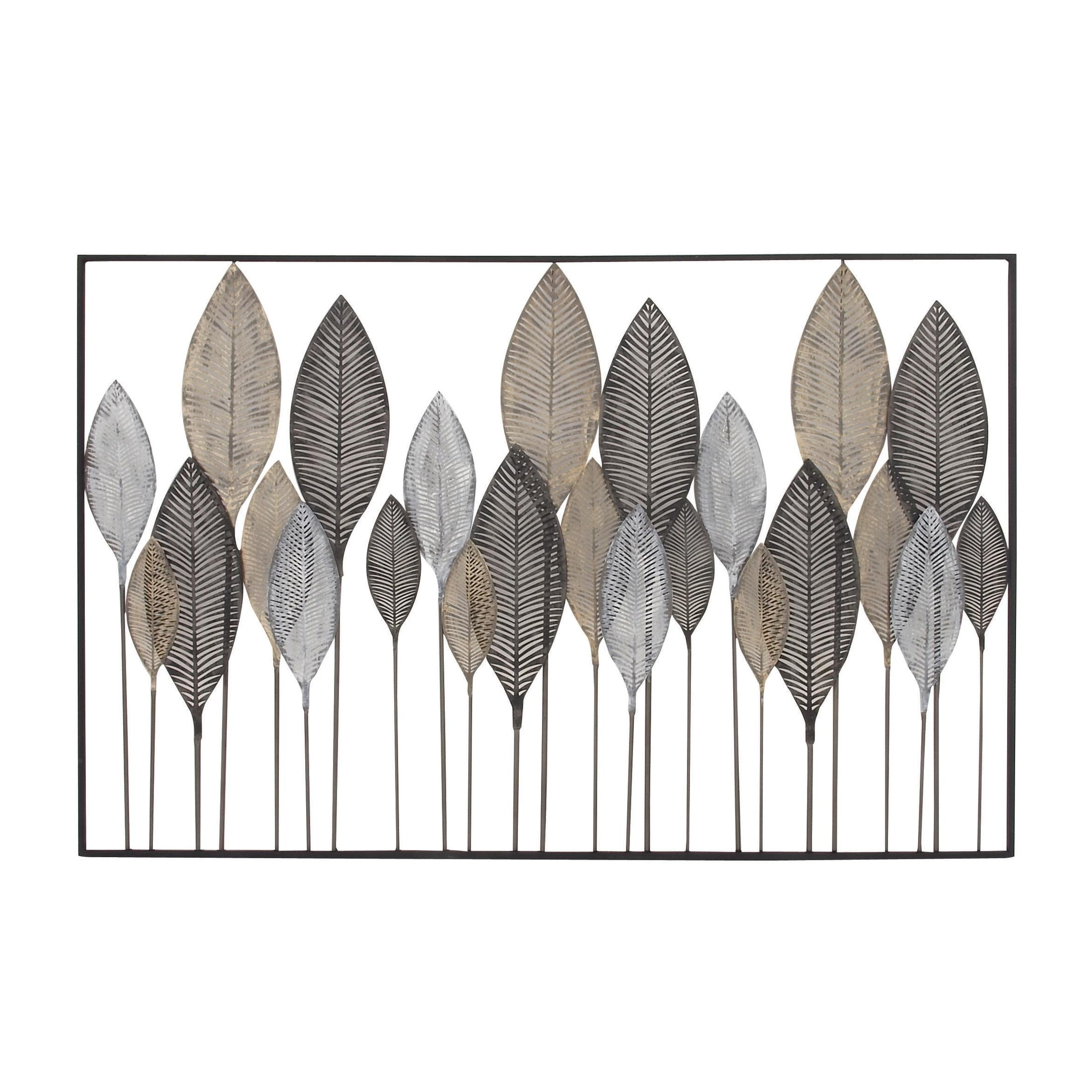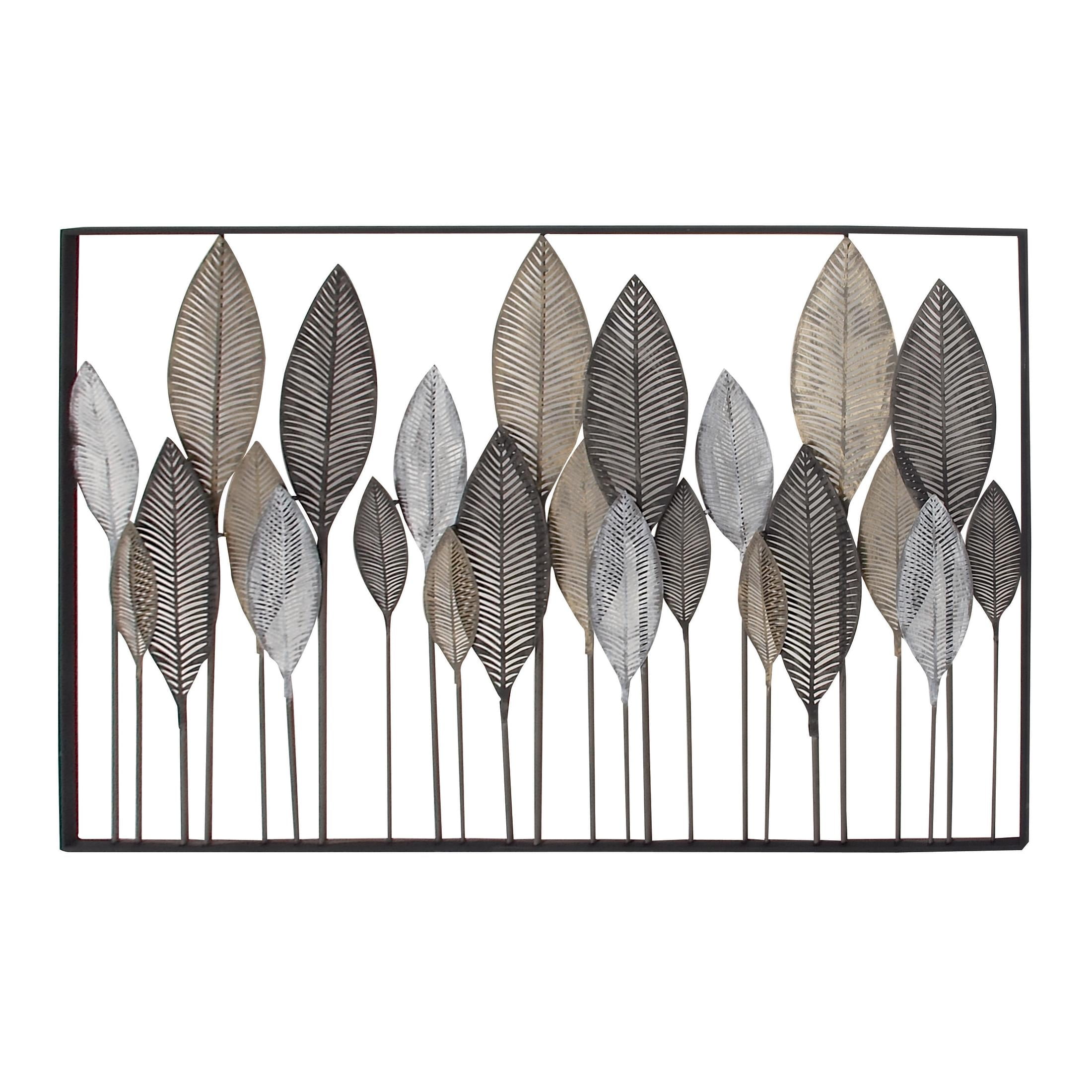 Infuse your home with cozy charm, where weathered textures, rustic finishes, and warm earthy tones create a wholesome atmosphere Crafted from solid iron, this bronze home wall decor exudes durability while also adding an industrial touch to your space Rectangle decor for wall is a contemporary piece finished in matte bronze, with leaf designs in distressed black, adding a touch of sophistication to any room Iron wall decor features 24 leaves framed within it, their intricate details perfectly complementing the galvanized finish and lending a farmhouse-themed charm The bronze metal wall decor measures 59L x 1W x 37H inches, and weighs 13.50 lbs Matte bronze wall art for living room adopts a rectangular shape with vertically oriented leaves in solid black, gold and white finishes making it an eye-catching centerpiece Wipe clean with a dry cloth Each element of this farmhouse room wall decor has been meticulously crafted with textured, pointed metal leaves are layered over each other on metal poles, all welded into a rectangular frame Farmhouse style DecMode Bronze Metal Tall Cut-Out Leaf Wall Decor with Intricate Laser Cut Designs makes a perfect addition to any home