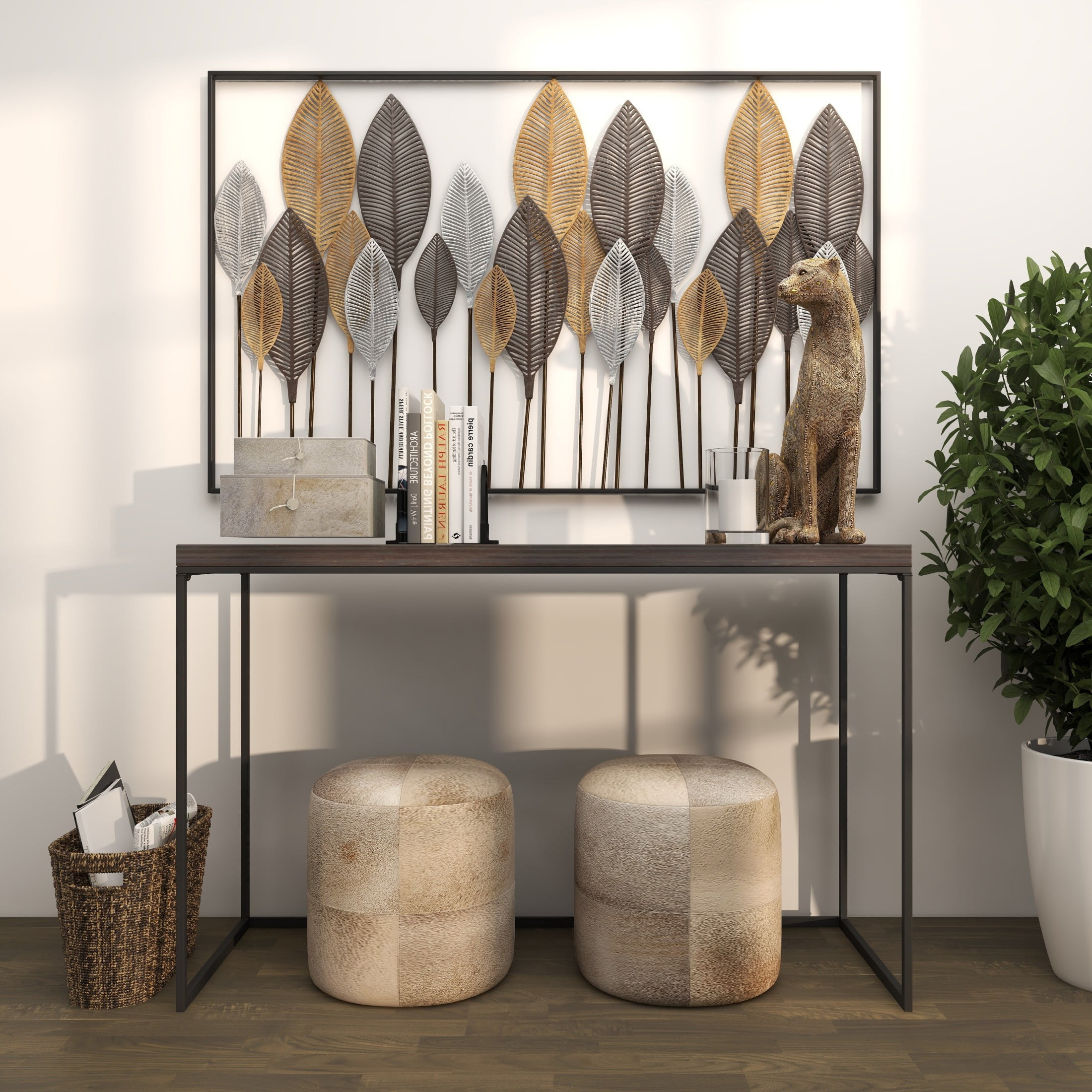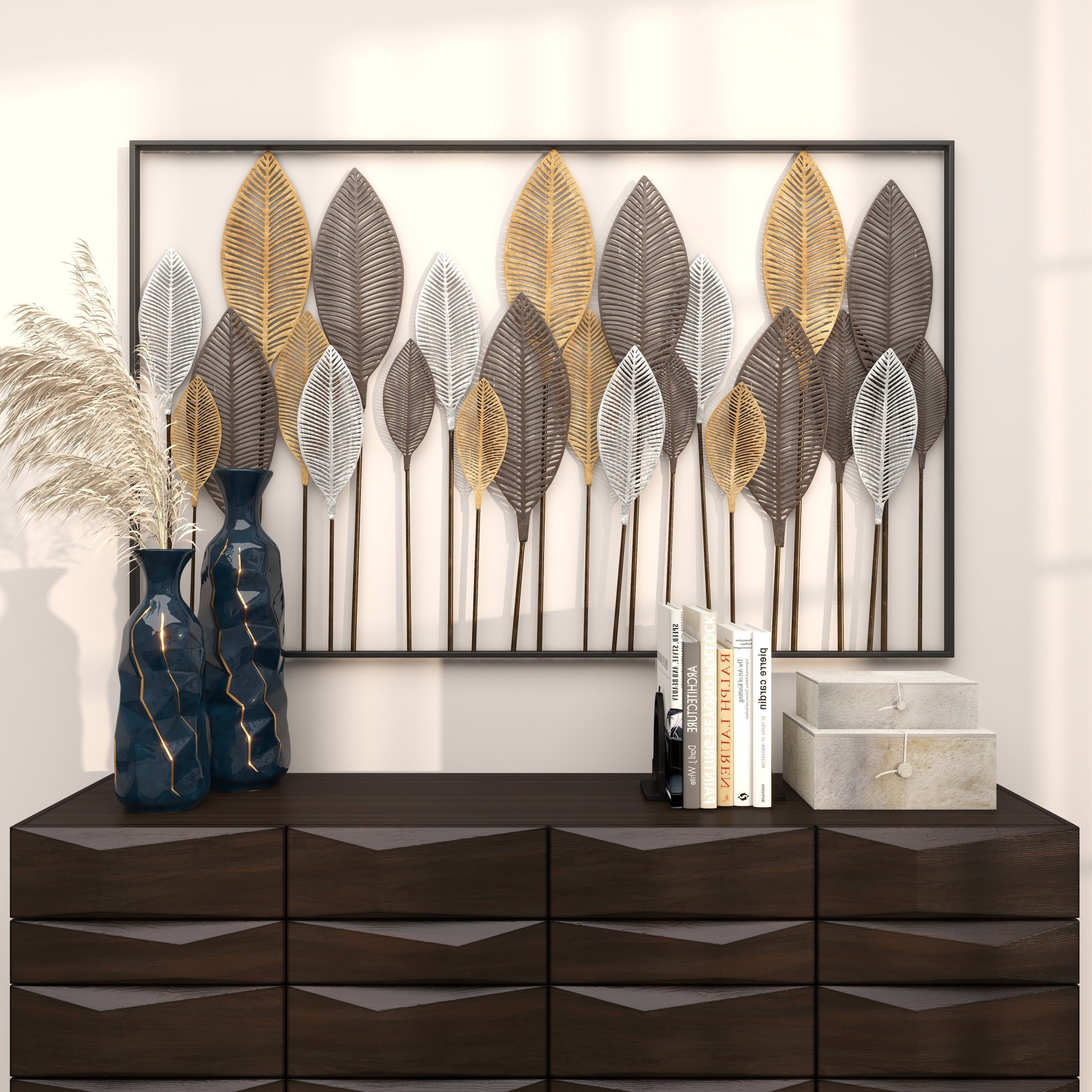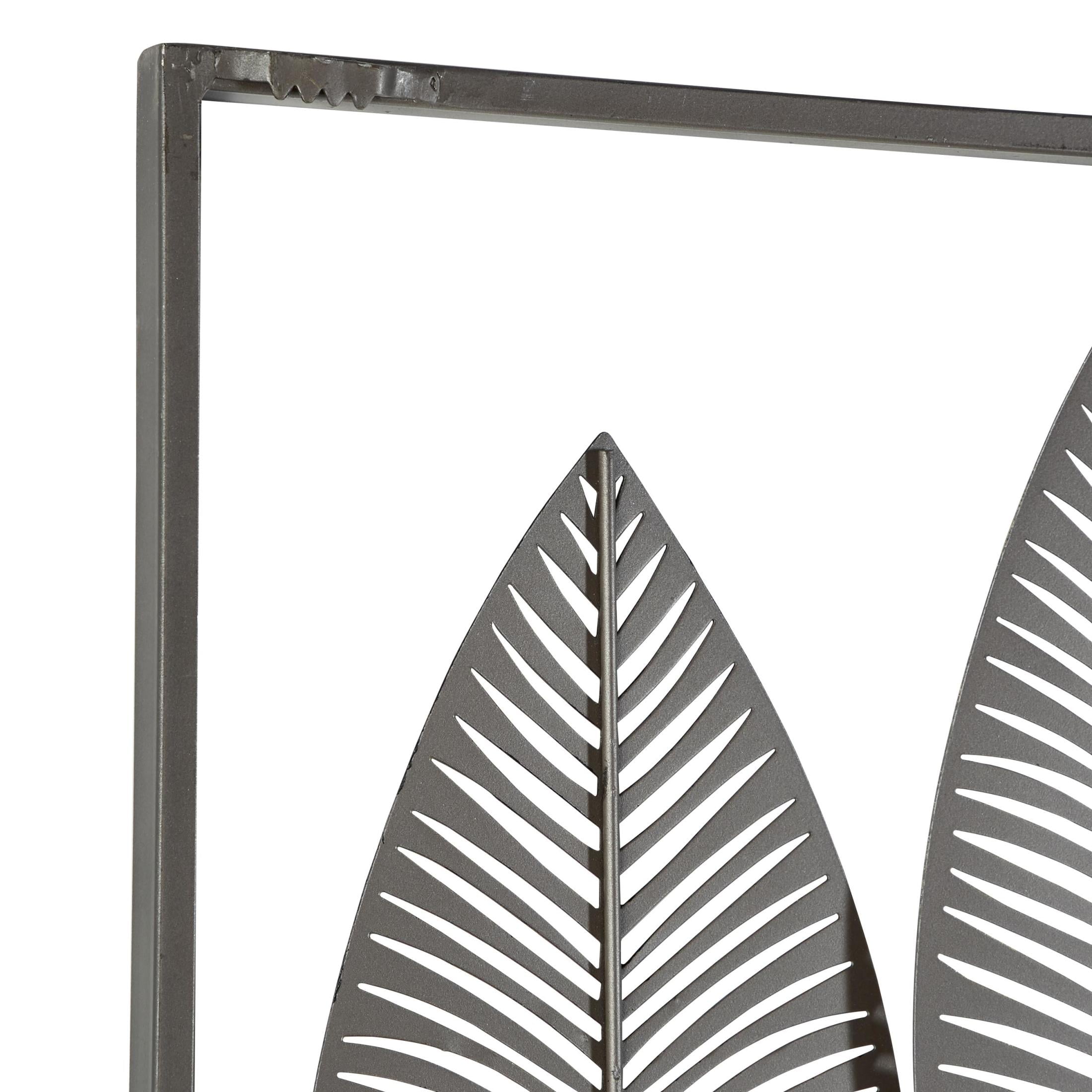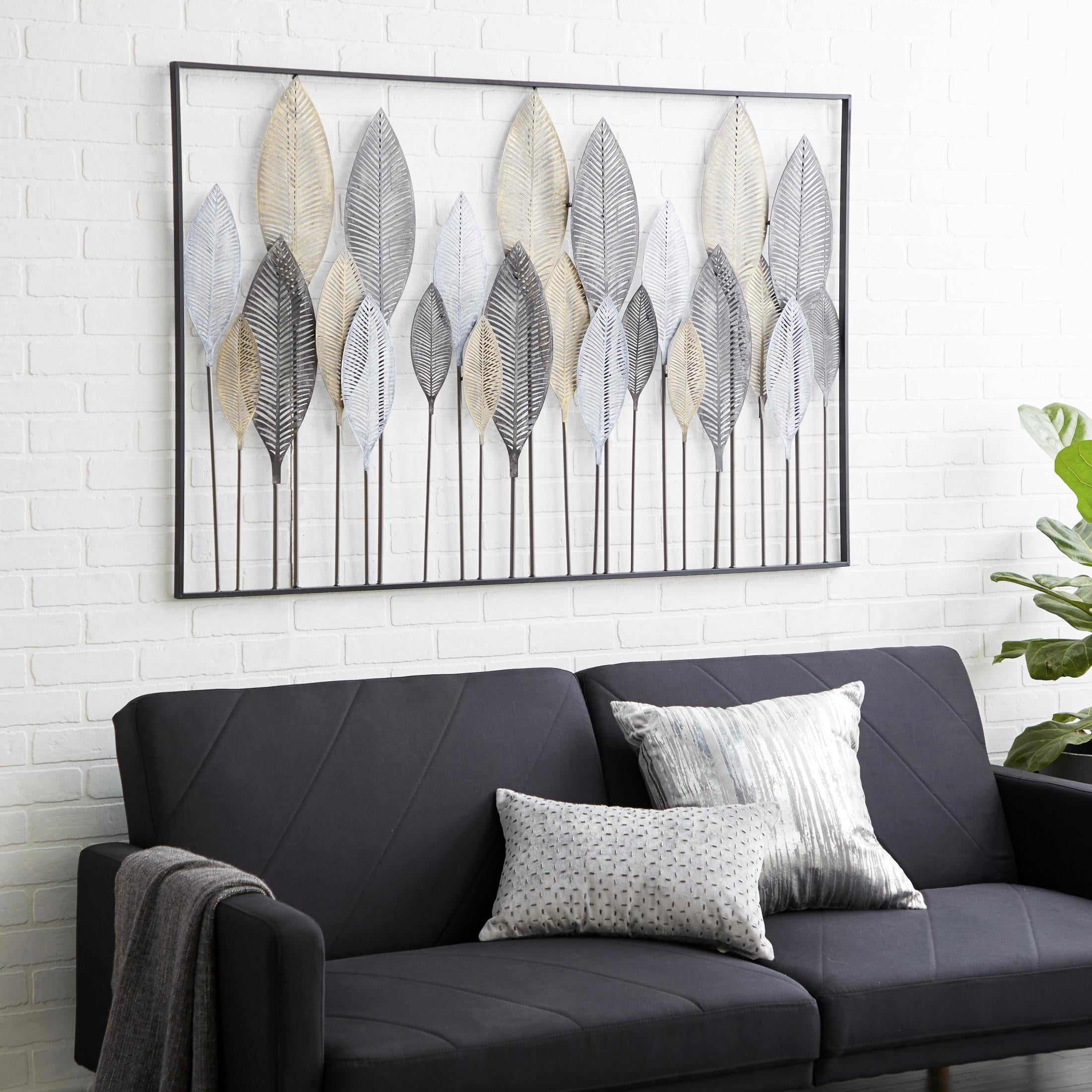 Infuse your home with cozy charm, where weathered textures, rustic finishes, and warm earthy tones create a wholesome atmosphere Crafted from solid iron, this bronze home wall decor exudes durability while also adding an industrial touch to your space Rectangle decor for wall is a contemporary piece finished in matte bronze, with leaf designs in distressed black, adding a touch of sophistication to any room Iron wall decor features 24 leaves framed within it, their intricate details perfectly complementing the galvanized finish and lending a farmhouse-themed charm The bronze metal wall decor measures 59L x 1W x 37H inches, and weighs 13.50 lbs Matte bronze wall art for living room adopts a rectangular shape with vertically oriented leaves in solid black, gold and white finishes making it an eye-catching centerpiece Wipe clean with a dry cloth Each element of this farmhouse room wall decor has been meticulously crafted with textured, pointed metal leaves are layered over each other on metal poles, all welded into a rectangular frame Farmhouse style DecMode Bronze Metal Tall Cut-Out Leaf Wall Decor with Intricate Laser Cut Designs makes a perfect addition to any home