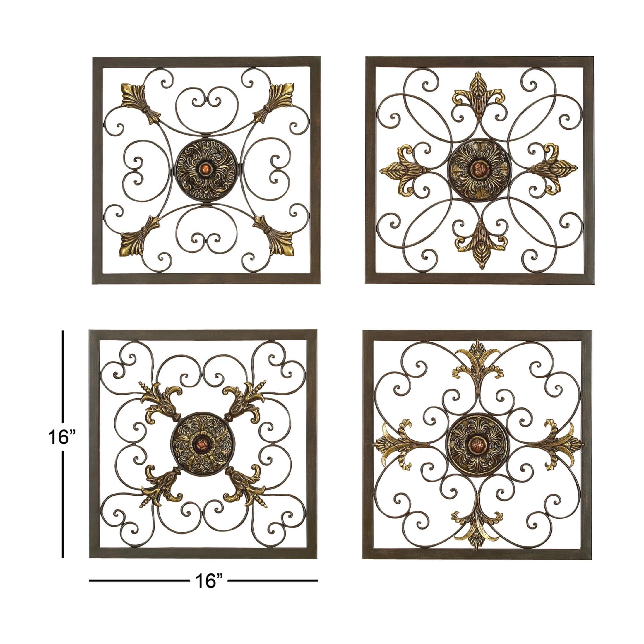 DecMode Brown Metal Fleur De Lis Wire Scroll Home Wall Decor with Gold Accents, Set of 4 16″W, 16″H