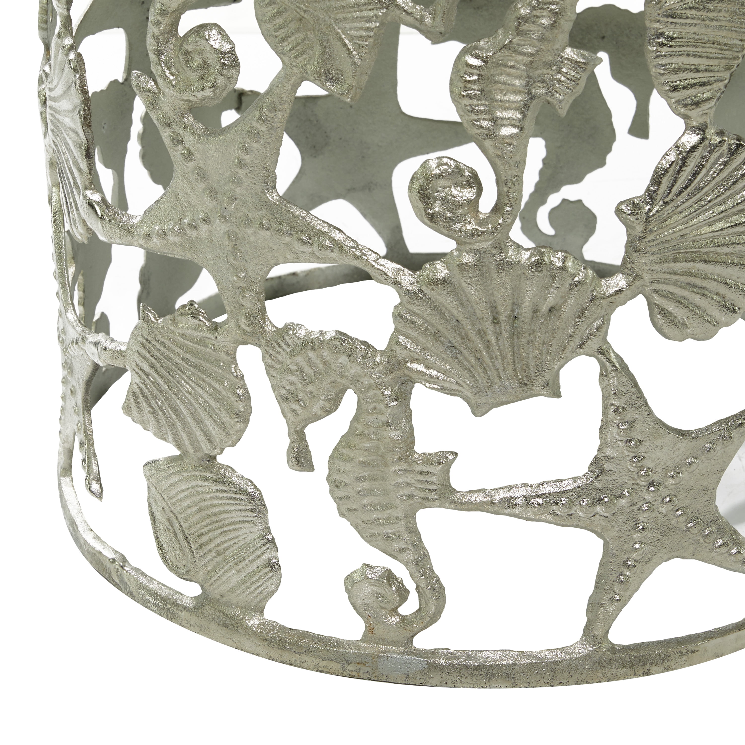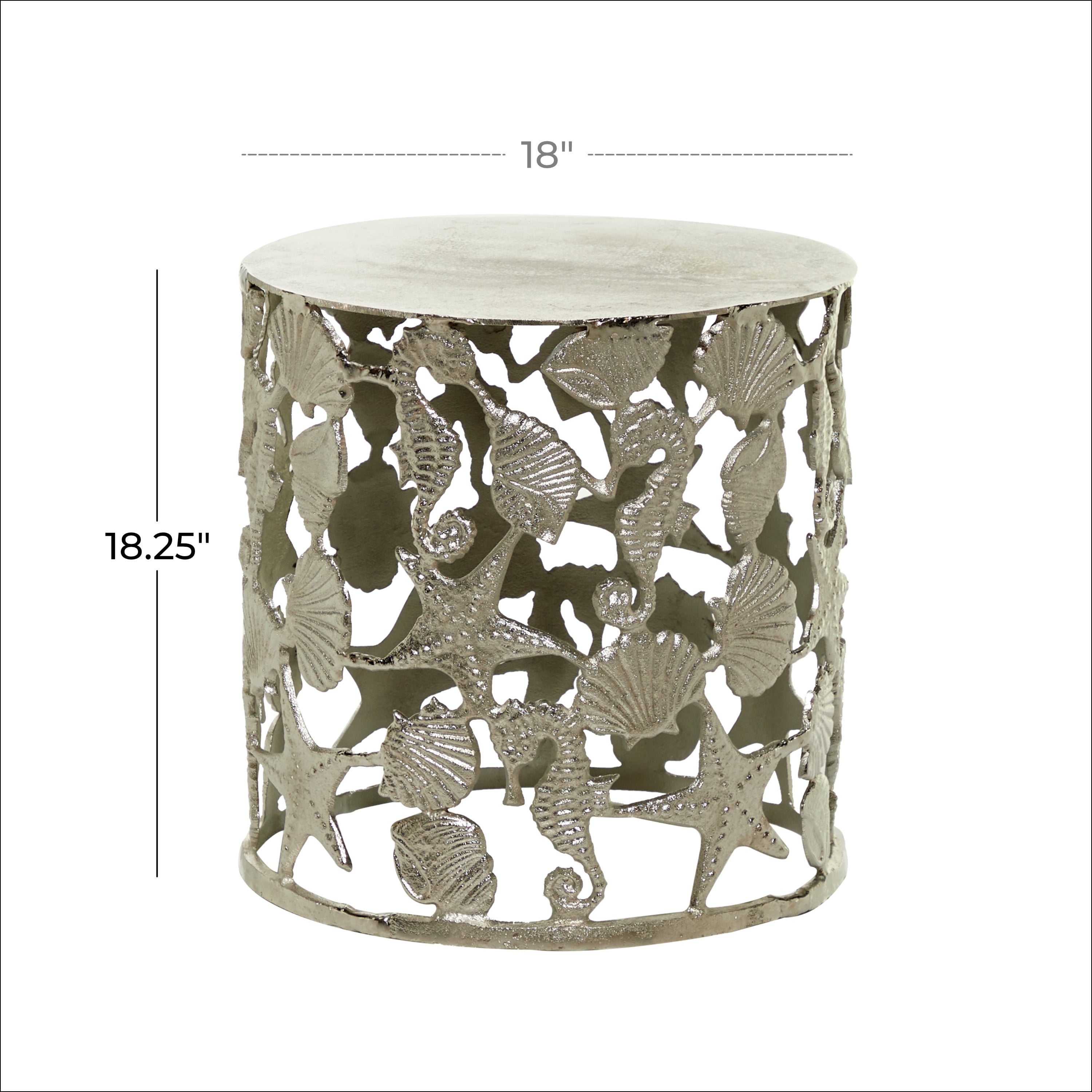 DecMode Coastal Silver Aluminum Accent Table with Sculpted Seahorse, Shells and Starfish Cutouts, 18″W x 18″H